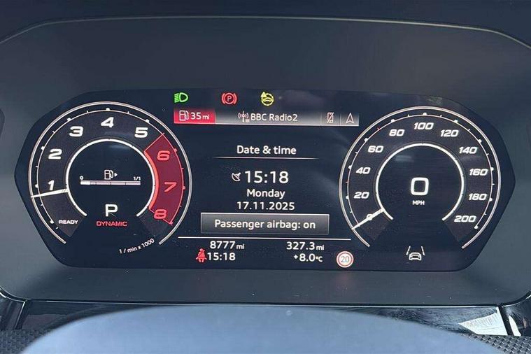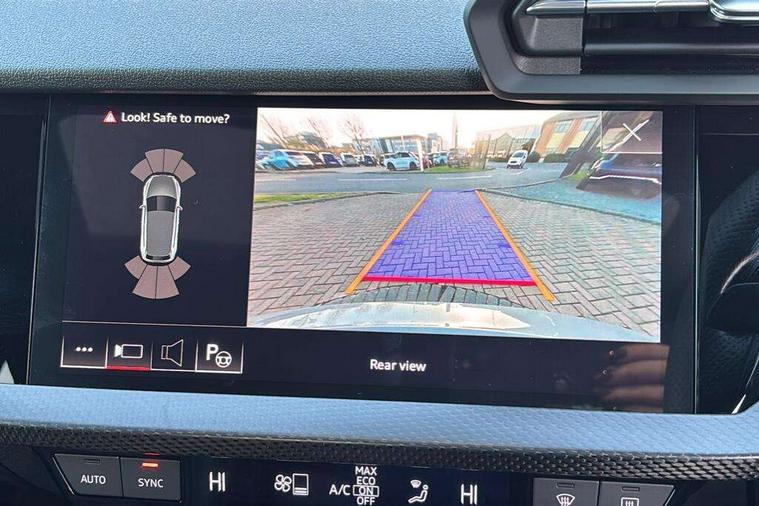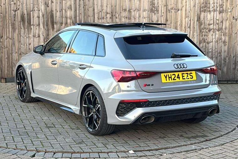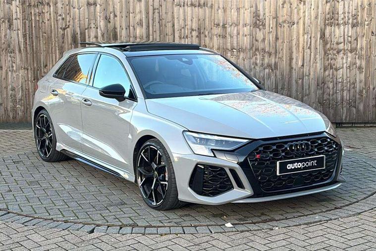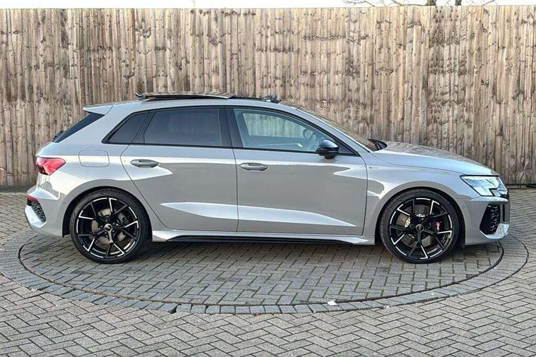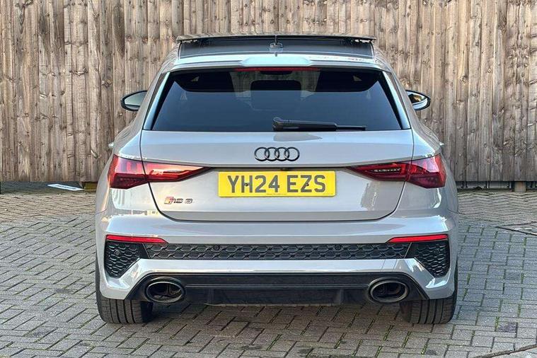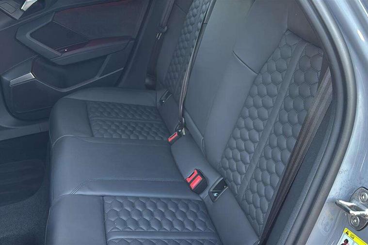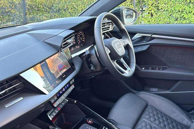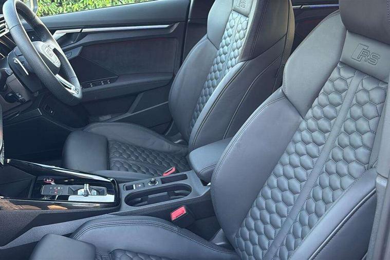 Adaptive cruise assist, Adaptive cruise control, Audi smartphone interface, Audi virtual cockpit with RS specific display 12.3" full colour digital instrument cluster, Automatic start/stop system with recuperation, Bluetooth interface, Camera based traffic sign recognition, Collision avoidance assistant, Emergency e-call, Head up Display, Lane departure warning system, Legal emergency call, Parking assist with parking system plus, Power operated tailgate - Luggage compartment lid opens electrically, Progressive power assisted steering, Reversing camera, Quattro permanent four wheel drive, Rear suspension, DAB Digital radio, 3rd brake light, Acoustic glass windscreen, Audi beam uses LEDs to project the Audi sport logo onto the ground as you exit your RS 3, Audi matrix LED headlights, LED rear lights, dynamic front and rear indicators and headlight cleaning system, Auto dimming rear view mirror, Black side skirts, Body colour roof, Carbon exterior door mirror, Carbon fibre engine cover, Daytime running lights, Electric adj heated/folding + auto dimming exterior mirrors with memory + LED indicator + auto kerb side function for passenger side exterior mirror, Front spoiler in high gloss black, Heat insulating glass windscreen, Light and rain sensors, Panoramic glass sunroof, Privacy glass - dark tinted rear and rear side windows from B-pillar backwards, Rear side wing doors, Rear window wiper and washer system, RS exterior features in gloss black, RS sports exhaust system, 3 seat bench in 2nd row, 3 spoke leather multifunction steering wheel with gear shift paddles, 4 way lumbar support for front seats, 40/20/40 split folding rear seat bench, Black cloth headlining, Dual zone electronic climate control, Electrically adjustable front seats with memory function for driver's side, Front and rear headrests, Front centre armrest, Front sports seats RS embossed logo, Front/rear floor mats, Heated front seats, Honeycomb stitching and RS embossing, Illuminated door sill trims inlays in aluminium with RS 3 logo, Illuminated vanity mirror, RS emblems, Single front passenger seat, Stainless steel pedals and front footrest in black, Aluminium interior elements pack - RS3, Ambient lighting pack - RS3, Comfort and sound pack - RS3, Driver assistance pack with 3 spoke leather multi function steering wheel - RS3, MMI navigation plus with MMI touch - RS3, RS bodystyling - RS3, Storage Pack - RS3, 3x3 point rear seat belts, ABS/EBD, ASR, Audi pre sense front, Driver/Front Passenger airbags, EDL, ESC - Electronic Stability Control + traction control, Front passenger airbag deactivation, Front side airbags with head airbags and interaction airbag, Hill hold assist, Seat belt reminder with passenger presence detection in rear, Tyre pressure loss indicator, Warning triangle and first aid kit, Anti theft alarm, Anti-theft wheel bolts, Electronically operated child lock, Remote control central locking, Full decorative carbon trim, 19" 5 Y spoke black with graphic print alloy wheels, Tool kit, Tyre repair kit,