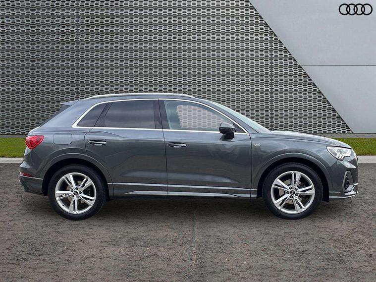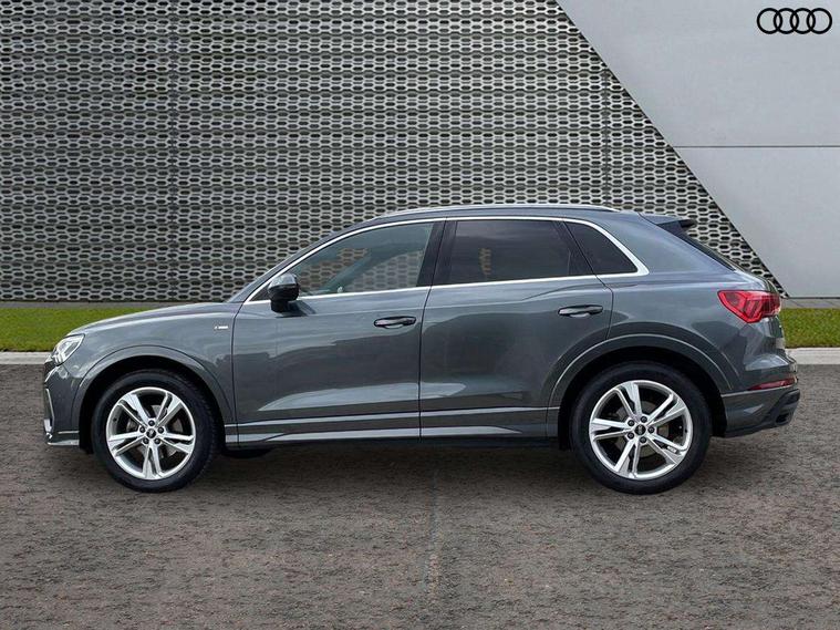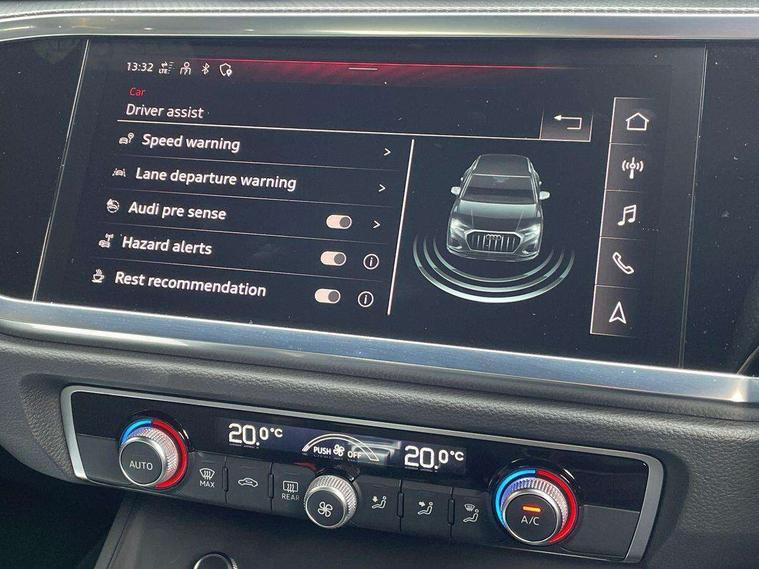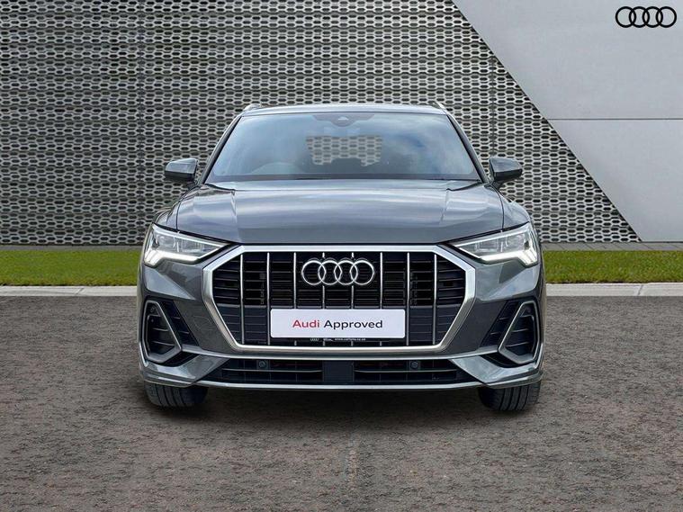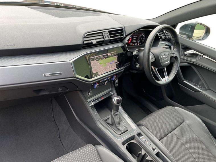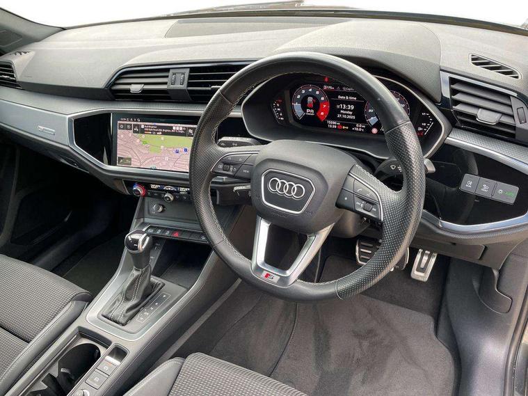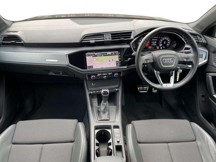 Amazon alexa Integration, Audi drive select, Audi lane departure warning, Audi smartphone interface includes wireless Apple carplay/Android Auto, Audi Virtual Cockpit - 10.25" display, Bluetooth interface, Camera based traffic sign recognition, Legal emergency call, MMI Navigation Plus with high resolution 10.1 inch touchscreen colour display, Power operated tailgate, Progressive steering, Service interval indicator, Start stop system with recuperation, Voice control system with natural language interaction, Sports suspension, 2 USB-C ports with charge and data functions, 6 passive loudspeakers, DAB digital radio module, Acoustic windscreen, Aluminium roof rails, Aluminium window trim, Anthracite black radiator grille, Auto dimming frameless rear view mirror, Body colour front spoiler blade, Body coloured bumpers, Electrically folding, adjustable and heated door mirrors with integrated LED side indicators and kerb view function for passenger side, Front and rear electric windows, Front fog lights, Front side air inlets in matt platinum grey, Grille vertical bars in aluminium silver/Matt, High gloss black finish B and C pillars, LED Dynamic rear indicators, LED headlights with LED daytime running lights, LED rear lights, LED third brake light, Privacy glass dark tinted rear and rear-side windows (from B-pillar backwards), Rain and light sensors, Rear diffuser grille in grained matt black, Rear diffuser strip in matt anthracite black, Rear side wing doors, Rear wiper, S line badges on front wings, S Line front and rear bumpers, Side skirt insert in matt Platinium grey, Variable front intermittent wipers, 12V socket in rear centre console, 3 seat bench in 2nd row, 3 spoke leather multifunction steering wheel features S badging and grips in perforated leather with contrast stitching, 40:20:40 folding with manual adjustment for 60:40 forwards/backwards position and backrest angle, Adjustable rear seat bench/backrest with centre armrest and cupholder, Black cloth headlining, Dual zone electronic climate control, Front and rear black floor mats with contrast stitching in rock grey, Front and rear headrests, Front and rear roof module including reading lights, Front centre armrest, Glove compartment lighting, Height and reach adjustable steering wheel, Illuminated door sill trims with S logo, ISOFIX child seat mounting for front passenger with airbag deactivation and outer rear seat including top tether attachment point for outer rear seats, Luggage compartment light, Manual front seats with height adjustment, Perforated leather gearknob, Single front passenger seat, Stainless steel luggage compartment sill finisher, Stainless steel pedals, Ambient lighting pack - Q3, Non smoking pack - Q3, 3x3 point rear seatbelts, 6 airbags - Driver, front passenger, curtain and side windows, Audi pre-sense front with pedestrain and cyclist recognition, Electrically operated child locks on rear doors, Electromechanical parking brake, Electronic stabilisation control including ABS, ASR and EDL, Front seatbelt reminder, Hill descent control, Hill hold assist, Pre sense basic, Seatbelt monitoring, Tyre pressure warning, Warning triangle and first aid kit, Anti theft alarm, Anti theft wheel bolts, Immobiliser, Remote central locking, Aluminium look interior elements, Dark matt brushed aluminium inlay, Detail dashboard around MMI touch colour display in glass look, black with surround in aluminium look, Leatherette door armrest,