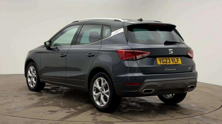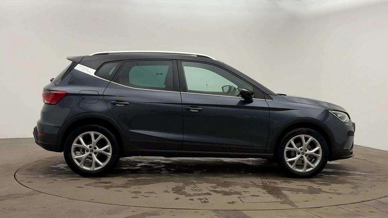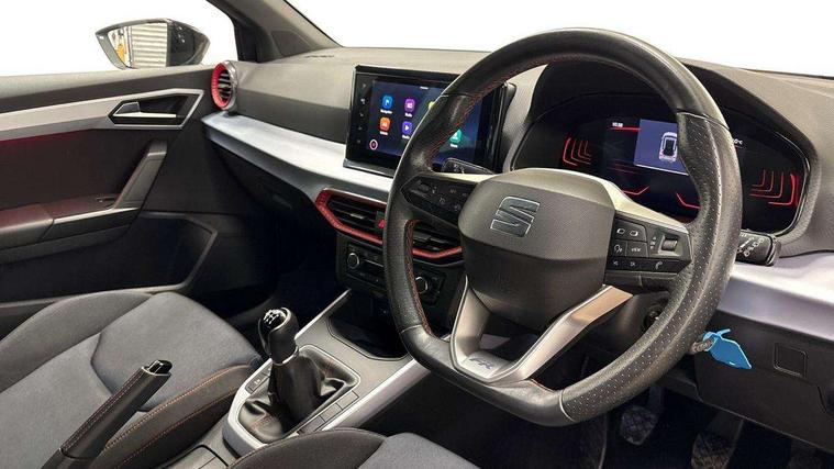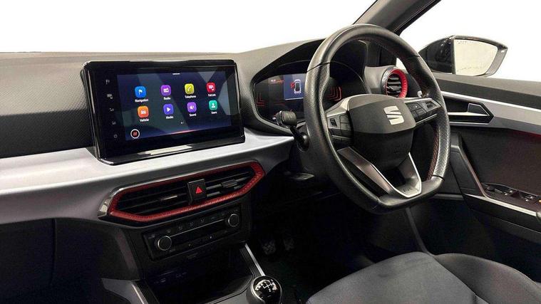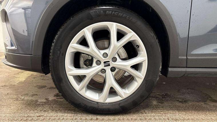 'Lights On' Reminder warning buzzer, 8" Digital cockpit, Digital clock, E-call, Electric speed sensitive power steering, Full Link Smartphone Integration with Mirror Link, Apple Car Play, Google Android Auto with USB Type C cable for Apple and Android compatibility, Lane keeping system, Low fuel warning light, Outside temperature display, Rear parking sensor, RPM counter, Seat connect with safety, service, remote and online, SEAT Drive profile - Four different models normal-sport-eco-individual, steering response, throttle response, Trip computer, Wireless phone charger, 9.2" colour touchscreen with navigation system, voice control and USB port (type c), Bluetooth interface for hands free and audio streaming, DAB digital radio and AM/FM radio, Steering wheel mounted audio controls, Anti theft roof antenna, Auto dimming interior rear view mirror, Automatic activation of hazard warning lights, Body coloured bumpers, Body coloured door handle inserts, Chrome roof rails and window surrounds, Dark tinted rear windows, Electric front/rear windows, Electrically adjustable, heated and folding door mirrors, Front fog lights with cornering function and rear fog light, FULL LED automatic headlights with dynamic headlight range control, coming and leaving home, LED daytime running lights, LED rear tail lights and licence plate lights, Protective side mouldings, Rain sensing wipers, Rear side wing doors, Rear spoiler, Rear window wash/wipe, Roof colour door mirrors, Third brake light, Twin exhaust pipe styling hidden exhaust pipe, Visible VIN plate, Windshield wiper with intermittent control and potentiometer, 2 cupholders, 3 seat bench in 2nd row, 60/40 split folding rear seat, Aircare filter, Black interior roof, Cloth upholstery, Double boot floor, Driver sunvisor with covered mirror + card holder, Dual zone climate control, Front courtesy light with 2x front and 2x rear reading lights, Front sport seats, Gear shift indicator, Height adjustable front seats, Height/reach adjustable steering column, Illuminated boot, Instrument lighting with brightness control, Interior ambient lighting, Interior light in footwell, central console and door panel, ISOFIX points in outer rear seats with top tether anchorage points, Passenger sunvisor with vanity mirror, Perforated flat bottomed leather steering wheel/gear knob/handbrake with red stitching and FR logo, Single front passenger seat, Two front and three rear height adjustable headrests, Interior chrome pack - Arona, 3 point seatbelts on all rear seats, ABS, Active front headrests, Child locks on rear doors, Driver and front passenger airbags with front passenger airbag de activation, front side and curtain airbags, Electronic stability control, Emergency Brake Assist (EBA) and front assist, Front and rear seatbelt reminder, Hill hold control, Multi-Collision braking, Tiredness recognition system, Traction control, Tyre pressure monitoring system, Alarm with back-up horn, Electronic engine immobiliser, Locking wheel bolts, Remote central locking + deadlocks, Tow away protection, Titan black dashboard, 17" Dynamic alloy wheels,