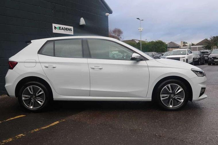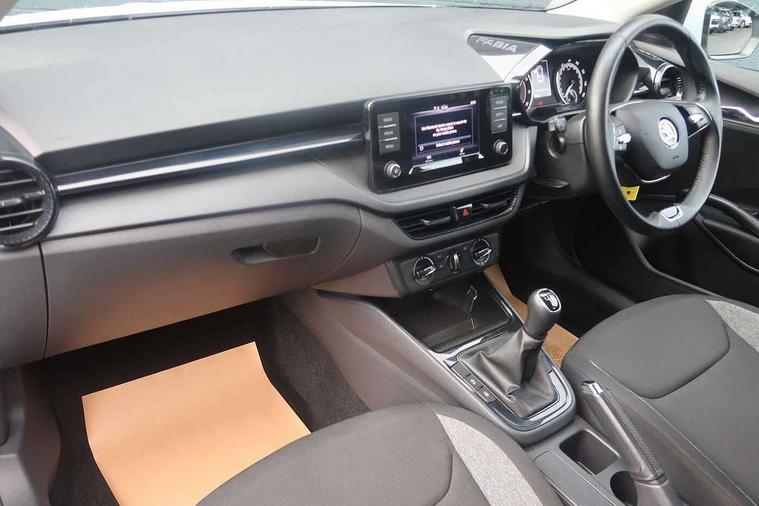 Bluetooth connection, Driver alert system - DAS, Electromechanical power steering, Exterior temperature gauge, Lane assist including road edge detection, Multifunction trip computer in black and white, Service interval indicator, Speed limiter, 2x USB-C in the front (for data transmission and charging), 4 speakers in front, Auxiliary socket for external MP3 player, DAB digital radio reception, Radio Swing with 6.5" colour display, Basic LED Headlights, Basic rear lights, Body colour door mirrors, Body coloured bumpers, Dimming rear view mirror with black frame, Door mirror integrated indicators, Electrically adjustable and heated door mirrors, Electrically adjustable front windows with function auto up/down, Front fog lights, Front window wiper intermittent control, Headlight range control - Automatic, Ice scraper in fuel cap, LED daytime running lights with coming and leaving home feature, Mechanical adjustable rear windows, Rain sensor, Rear LED fog light, Rear side wing doors, Rear window wiper with washing nozzles, Roof mounted spoiler, SKODA tailgate lettering in chrome, Third brake light, 2 reading lights in front and 2 reading lights in rear, 2 spoke leather multifunction steering wheel, 3 rear headrests, Backrest split and folding, Central console with fixed cup holder and storage box, Chrome handbrake release button, Fabric upholstery, Gearshift knob/handle in leather, Grain satin black interior door handles, Hand brake lever handle in leather, Height adjustable front headrests, Height adjustable front seats, Height adjustable steering wheel, ISOFIX and TopTether anchorage points to the outer rear seats, ISOFIX and TopTether on the front passenger seat, Luggage compartment lighting, Manual air conditioning, Manually adjustable lumbar support in front seats, Pollen filter, Rear seat bench unsplit, Single front passenger seat, Storm grey headlining, Sun visors with mirror and airbag label on passenger side, Ticket holder, 3-point height adjustable front seats belts with pretensioner and force limiter, Automatic warning lights in case of crash, Driver and passengers airbag with switch off function, e-Call+, ESC including ABS, MSR, ASR, EDS, HBA and XDS, Front and rear seat belt warning, FRONT ASSIST (AEB City and AEB Inter Urban), Front side airbags, Head airbags, One tone horn, Pedestrian protection, Three rear 3-points safety seat belts with pretensioner and force limiter including stop function for outer rear seat belts, Tyre pressure monitoring system, Anti-theft alarm system including immobiliser, interior monitoring, backup horn, and towing protection, Central locking with radio remote control, interior controls, SAFE function and 2 foldable keys, Black painted air vents, Glossy black decorative trim, Grain satin black central console cover, Grain satin black lower decorative trim, Satin black door and side trim panel in front, Anti-theft wheel bolts protection, Super-low rolling resistance tyres,