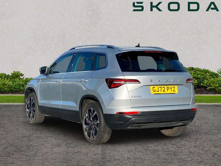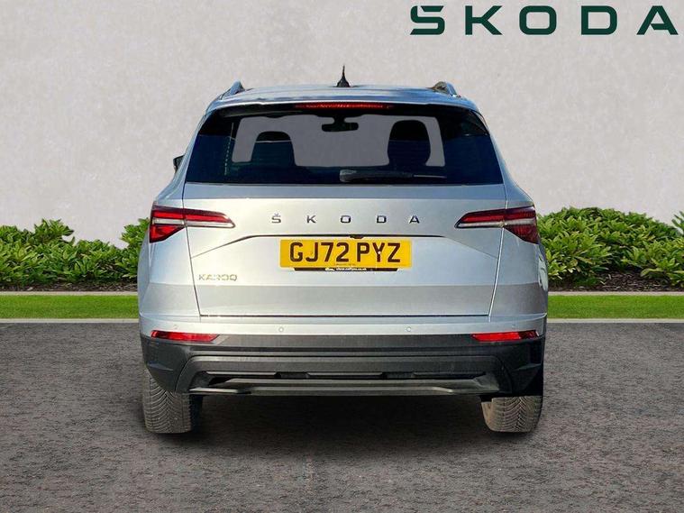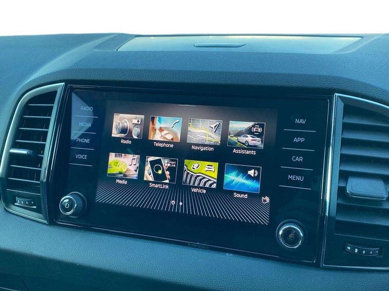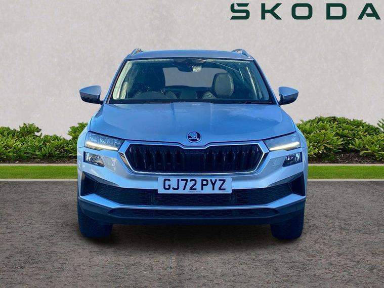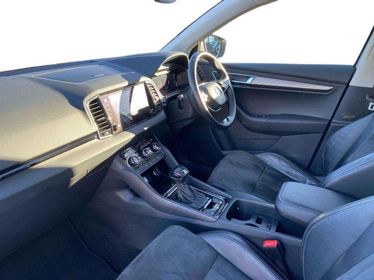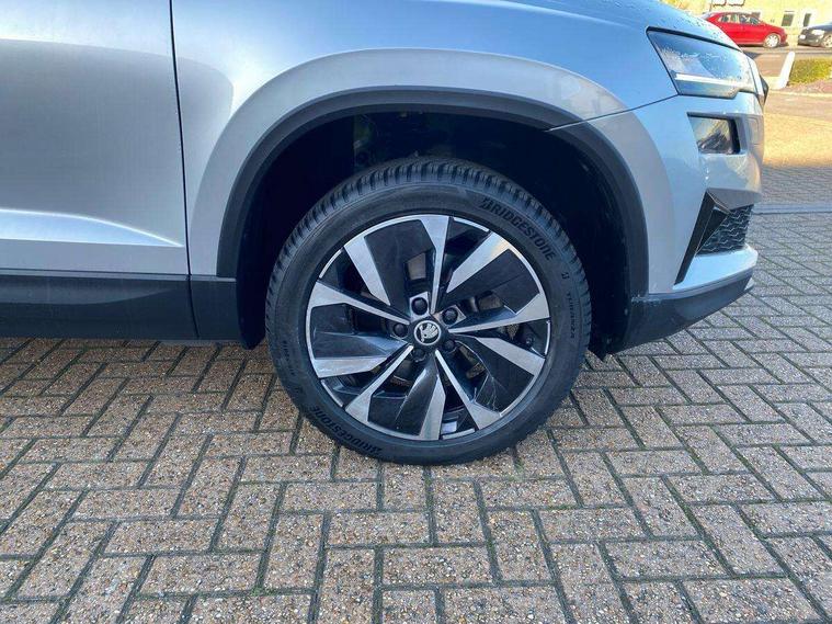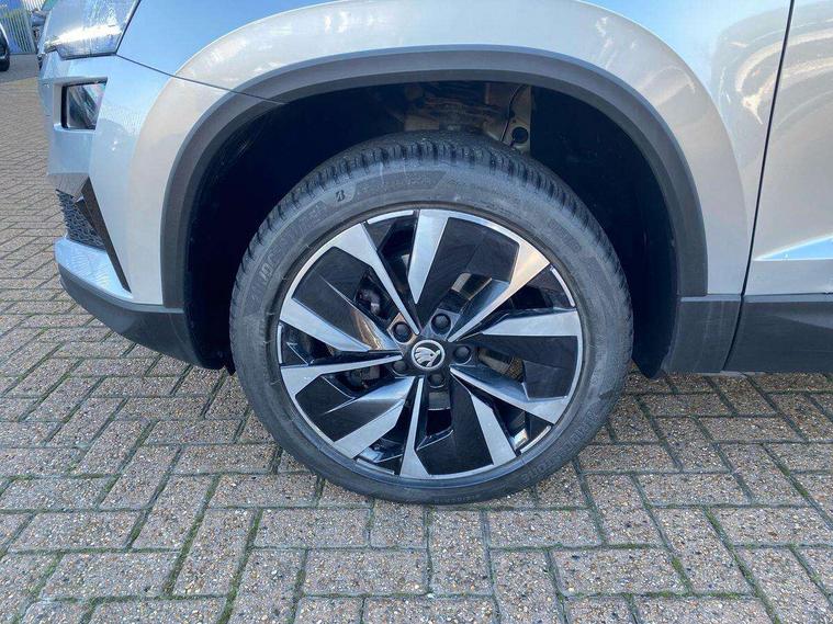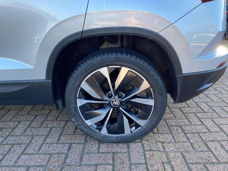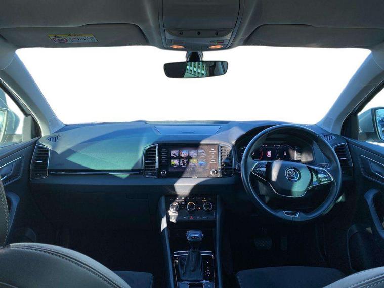 8" Digital display, Care connect, Colour multifunction trip computer, Driver fatigue sensor, Emergency services call system, Outside temperature gauge, Service interval indicator, SmartLink wireless for Apple and wired for Android, Start/stop system with regenerative braking, USB C Port x 2 in front centre console, 8 Speakers, DAB radio with Bluetooth, USB connection, Acoustic glass, Aero front windscreen wipers with intermittent function, Auto dimming rear view mirror with light and rain sensors, Automatic headlight control system, Black electric window control buttons, Body colour door mirrors and handles, Electric front and rear windows with child proof lock, Heated rear windscreen, LED daytime running lights, LED rear lights with high functionality welcome effect and dynamic indicators, Light assistant (coming/leaving home/tunnel light), Plastic scuff plates, Privacy glass, Rear side wing doors, Rear spoiler, Rear window wiper with washer system and intermittent control, Safety reflectors on front doors, 1.5 litre bottle holders in driver and front passenger door panels, 12V socket in boot, 12v socket in front centre armrest with storage compartment and rear air vents, 2 Folding hooks and nets in boot, 2 spoke leather heated multifunction steering wheel with DSG paddles, 2 x Tablet holder, 3 rear height adjustable headrests, 3 seat bench in 2nd row, 4 foldable roof handles with rear coat hooks, Black floor carpet, Chrome inner door handles, Decorative door sills with KAROQ badging, Double sided boot floor, Foldable hooks in the boot, Front head restraints, Height adjustable front three point seats belts with tensioners, Height/reach adjust steering wheel, Ice scraper, Illuminated glovebox, Illuminated luggage compartment, Isofix child seat preparation for front passenger seat, Isofix child seat preparation outer rear, Manual lumbar support for front seats, Pen holder, Pollen filter, Rear boot cover, Rear reading lights, Rubbish bin door, Safety vest holder, Single front passenger seat, Storage box in upper central dashboard closed, Sunvisors with illuminated vanity mirrors, Textile floor mats, Ticket holder, VarioFlex seats with standard rear seat release, Chrome roof rails + chrome pack - Karoq, Parking pack - Karoq, Automatic door unlocking in case of crash, Automatic fuel cut off in case of crash, Child locks on rear doors, Driver airbag, Electronic parking brake with auto hold function, Emergency rear braking signal, ESC including ABS, MSR, ASR, EDS, HBA, DSR, RBS, MKB and traction control, Front side airbags, Hill hold control, Knee airbags, Passenger airbag with switch-off function, Pedestrian monitor, Seatbelt reminder signalisation and pretensioner for all seats, Three point seatbelts rear, Two tone horn, Tyre pressure display, Tyre pressure monitor, Alarm with interior monitoring, back up horn and tilt sensor with safe function, Electronic engine immobiliser, Keyless entry and start/stop, Remote central locking with 2 remote folding keys, Chrome framed air vents, Anti-theft wheel bolts protection, Storage on wheel cover, Tool kit,