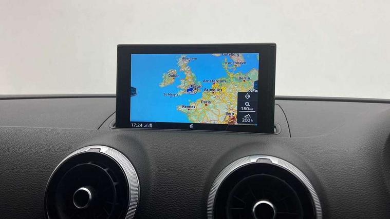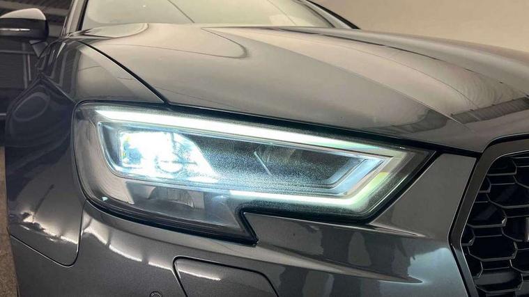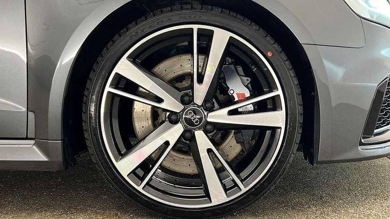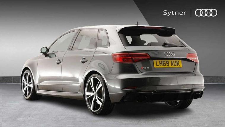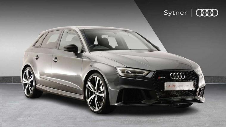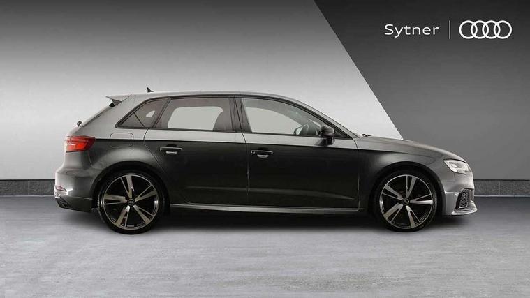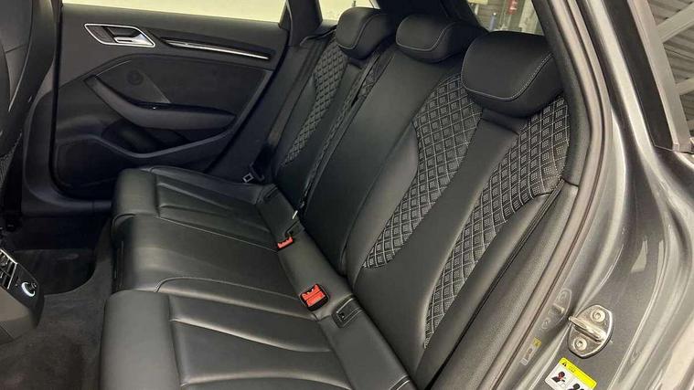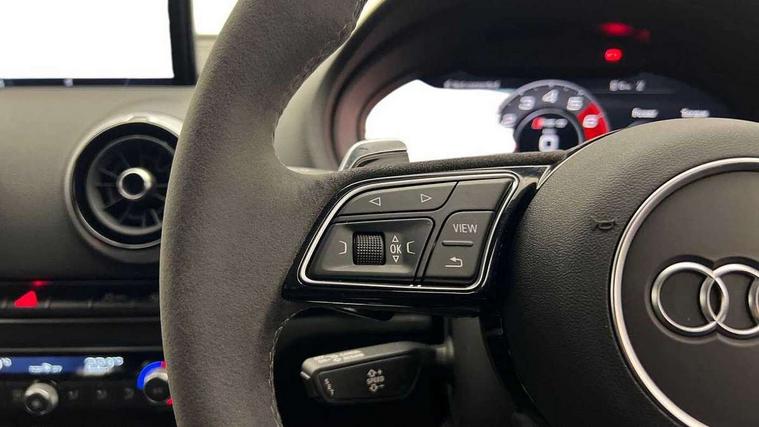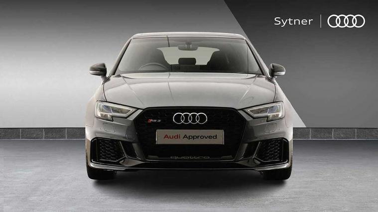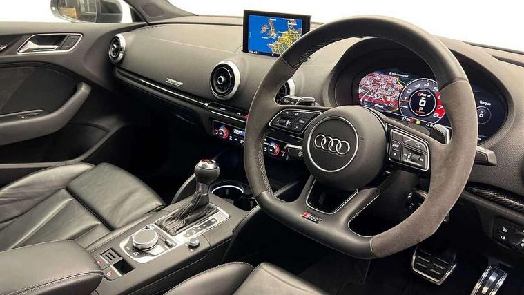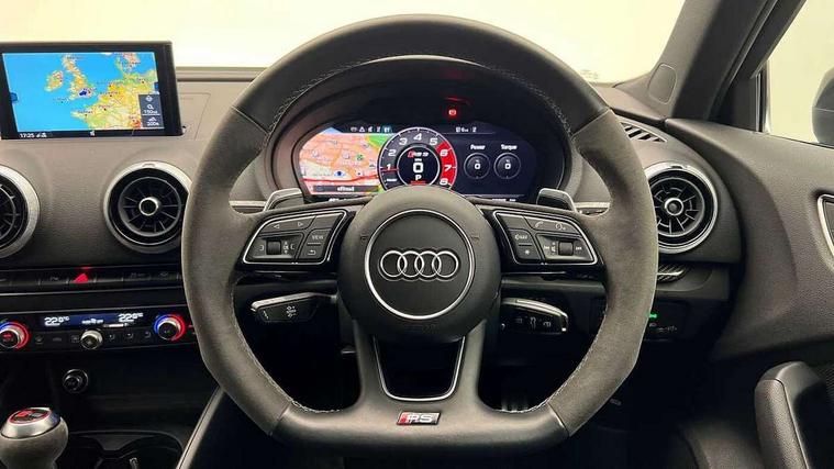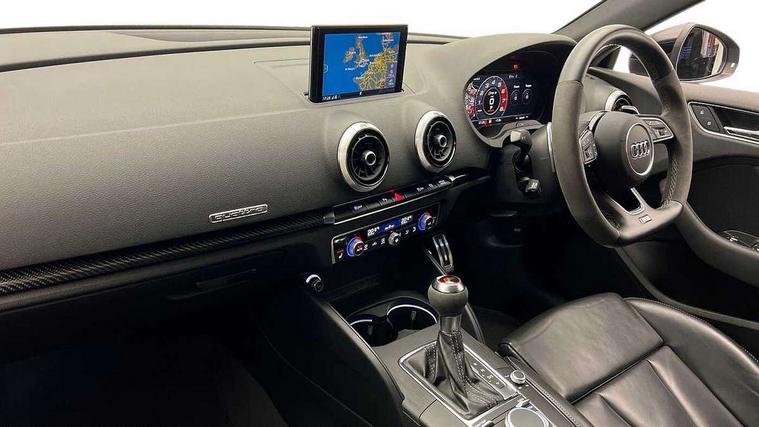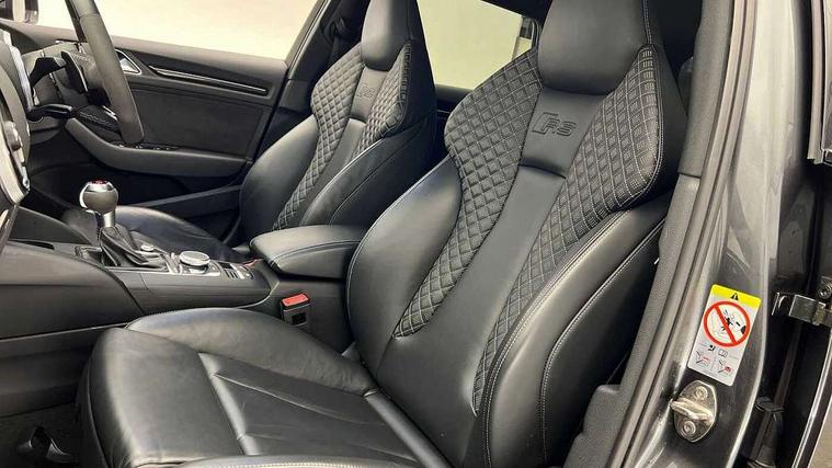 Audi connect, Audi phone box with wireless charging, Audi smartphone interface, Audi virtual cockpit with RS specific display, Automatic start/stop system, Colour driver's information system display, MMI navigation plus with MMI touch, Mobile telephone preparation - bluetooth interface, Progressive power assisted steering, Service interval indicator, Speed limit display, Voice control system, Voice recognition for navigation system, 10 GB hard disk, 2 USB interfaces and Aux-In jack, 2 x SDXC card reader, Audi music interface, CD/DVD player, DAB Digital radio, MMI radio plus with 7" colour MMI screen and MMI controller, Online entertainment, Audi beam with Sport logo, Auto dimming interior rear view mirror, Body coloured side sills extension, Electric front windows, Electric panoramic glass sunroof with sunblind and auto-closure function, Electric rear windows, Electrically adjustable and heated door mirrors with integrated LED side indicators, Flared front wheel arches, Headlight washers, Heated windscreen washer jets, LED daytime running lights, Light and rain sensors, Matt aluminium radiator grille frame including matt black quattro logo, Privacy glass - dark tinted rear and rear side windows from B-pillar backwards, Rear wiper, RS front bumper with large air inlets in gloss black and horizontal blade painted in body colour, RS roof edge spoiler painted in body colour with side aerodynamic inserts in high gloss black, RS3 badge on grille and luggage compartment lid, 3 adjustable rear headrests, 3 Spoke flat bottomed leather/alcantara multi-function sport steering wheel + gear shift paddles in aluminium look, contrast stitching and RS badging, 4 lashing points to secure luggage, 4 way lumbar support, 60/40 split folding rear seat, Adjustable front centre armrest, Dual zone electronic climate control, Fine Nappa leather upholstery with front super sports seats RS embossed logo, Front and rear interior lights with delay, Front/rear floor mats, Glovebox light, Heated front seats, Height and reach adjustable steering wheel, Illuminated door sill trims inlays in aluminium with RS 3 logo, Isofix child seat preparation for front passenger/outer rear seats inc passenger airbag deactivation, RS gear lever knob in alcantara/leather gaiter with contrast stitching, Stainless steel pedals, Storage compartments in doors side trims, centre console and under front drivers seat, Black Styling pack - RS3, LED interior light pack - A3/RS3, Non smoking pack - A3, Storage and luggage pack - A3/RS3, 3 point seatbelts on all seats, ABS/EBD, Active bonnet, Active front headrests, Airbags - front driver/passenger, front & rear side, curtain, drivers knee, ASR, Black painted brake calipers with RS logo at the front, EDL, Electromechanical parking brake, ESC - Electronic Stability Control + traction control, Front passenger airbag deactivation, Hill hold assist, Manual rear child locks, Multi-Collision braking, RS brake system, Seatbelt warning, Warning triangle and first aid kit, Anti theft alarm, Anti-theft wheel bolts, Remote control central locking, Thatcham category 1 alarm + immobiliser, Aluminium air vent surrounds, Aluminium trim elements, Carbon inlays, Carbon twill inserts, 19" 5 arm blade style audi sport design alloy wheels in glossy anthracite black look with diamond cut finish, Tool kit, Tyre repair kit,