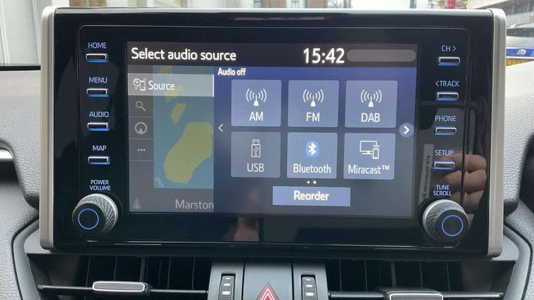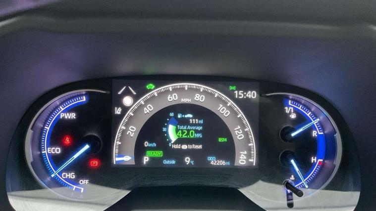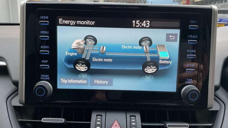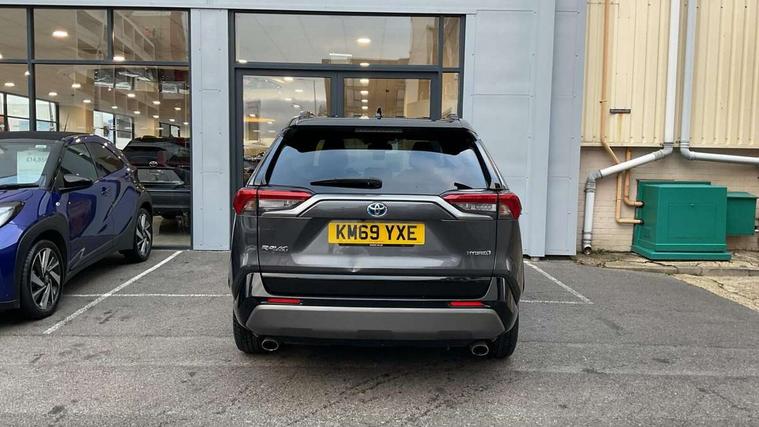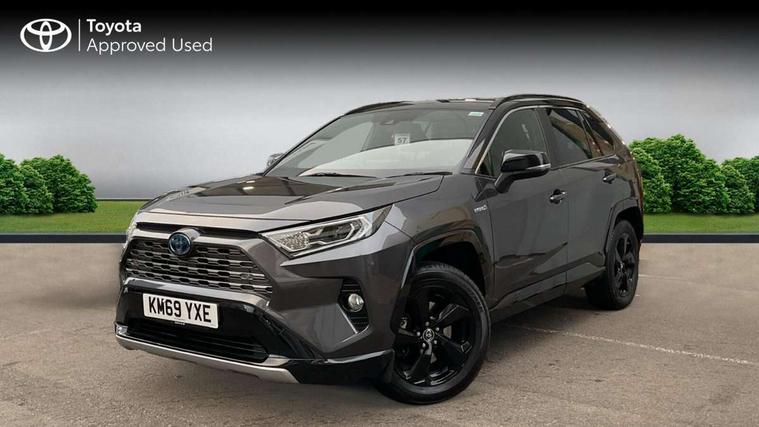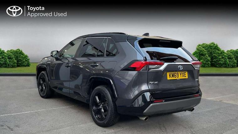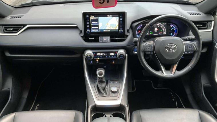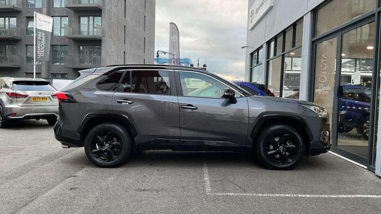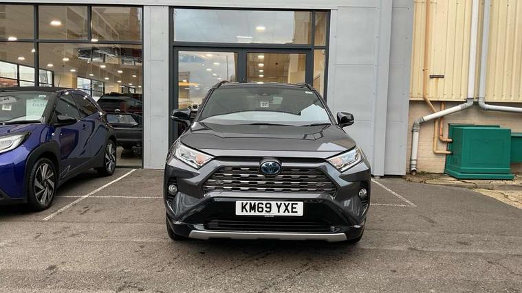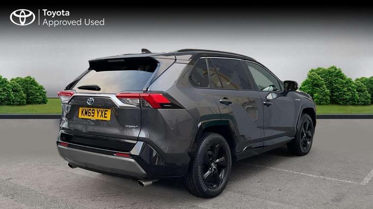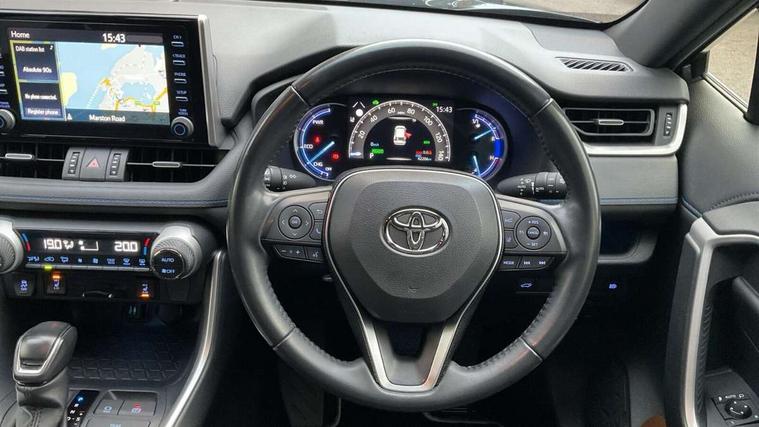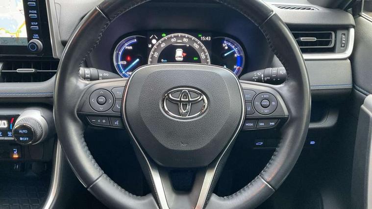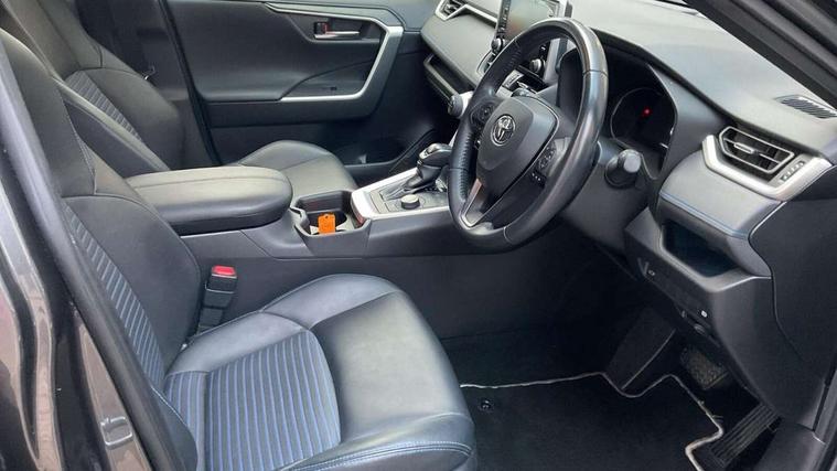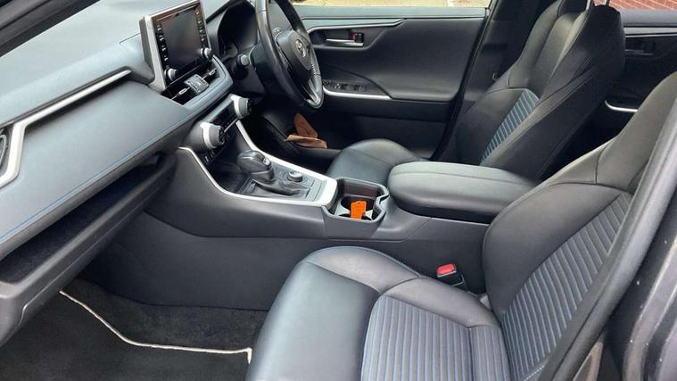 7" colour TFT display, Adaptive cruise control with lane trace assist, Adjustable speed limiter, Blind spot monitoring with rear cross traffic alert, Bluetooth system, Cyclist Detection, Drive mode selector, eCall emergency call system, ECO-driving indicator, Electric power steering, Hybrid system indicator, Lane departure warning system, Lights on warning, Night Time Pedestrian Detection, Pedestrial detection, Power boot opening and closing, Rear parking camera, Rear parking sensors, Remote boot door release in cabin, Tachometer, Touch 2 Go navigation system including 3D maps and voice control, Traffic sign recognition, Trip computer, Voice control system, Vehicle Stability Control (VSC), 6 speakers, 8" Multimedia display touch screen, Auxiliary socket for external MP3 player, DAB audio, Steering wheel mounted audio controls, Toyota touch media system, USB connection, Auto dimming interior mirror, Auto high beam, Automatic headlamp levelling, Automatic headlights, Automatically retractable door mirrors, Bi-tone black roof, Black door mirrors, Black rear spoiler, Black roof rails, Black Shark-fin antenna, Body colour door handles, Body coloured bumpers, Door mirror puddle lights, Electric adjustable door mirrors, Emergency brake-light signal (EBS), Follow me home headlights, Front fog lights, Gloss black front bumper insert, Gloss black rear bumper insert, Headlight cleaners, Heated door mirrors, LED daytime running lights, LED High mounted stop lamp, LED rear lights, Meshed upper front grille, Power front windows, Power rear windows, Privacy glass, Projector LED headlights, Rear screen wiper - intermittent, Rear windscreen defogger, Silver front under-run, Silver rear under-run, Trailer Sway Control, Turning signal integrated indicators in door mirrors, 3 rear headrests, 60/40 split fold rear seat back, Black roof lining, Boot light, Clean air filter, Driver and front passenger personal light, Driver and front passenger Whiplash Injury Lessening seats, Driver and passenger sunvisors with illuminated vanity mirrors, Dual sided deck board in boot, Dual zone automatic air conditioning, Floor mats, Folding rear centre armrest, Front and rear bottle holders, Front centre armrest, Front footwell lights, Front headrests, Front seat and rear pockets, Front sport seats, Front/rear roof mounted assist grips, Heated driver and front passenger seats, Isofix child seat preparation, Leather gear shift with chrome surround, Light blue ambient lighting on front cupholders and open tray, Manual telescopic and tilt 3-spoke leather steering wheel with Chrome insert, Manually reclining and sliding front passenger seat, Pollen filter, Power height-adjustable sliding reclining and lumbar support for driver seat, Rear coat hooks, Rear door armrests, Rear passenger air vents, Reclining rear seats, Satin chrome interior door handles, Sunglasses holder, Synthetic leather upholstery, Parking pack - Rav4, 3x3 point rear seatbelts, ABS/EBD, Adjustable front driver and passenger seat belt extender, Brake assist function, Child proof door locks, Collision mitigation braking system, Driver/Front Passenger airbags, Driver/front passenger side airbags, Drivers knee airbag, Electronic parking brake, Electronic Stability Programme (ESP), Emergency brake light system (EBS), Front and rear curtain airbags, Front and rear seatbelt reminder, Hill start assist, Passenger airbag cut-off device, Seatbelt pretensioners with load limiters, Traction control, Tyre pressure warning, Alarm/immobiliser, Glass-breaking alarm sensors, Light - on and Key in reminder, Remote central locking, Smart entry + Smart start, Speed sensitive auto door locking, Tilt detection sensors, Piano black centre console with silver insert, Soft-touch black lower dashboard, Soft-touch black upper dashboard with silver insert, Full size spare wheel,