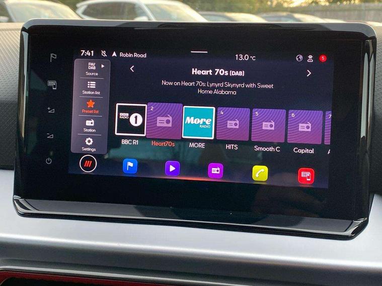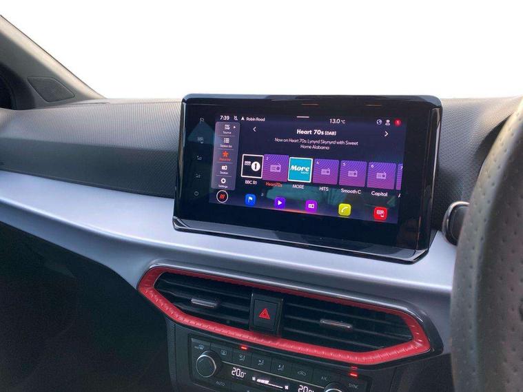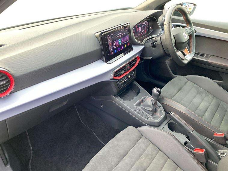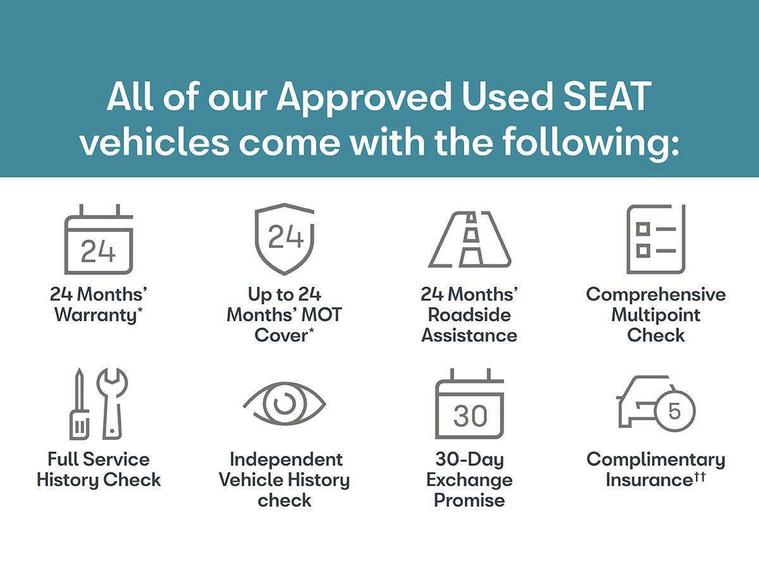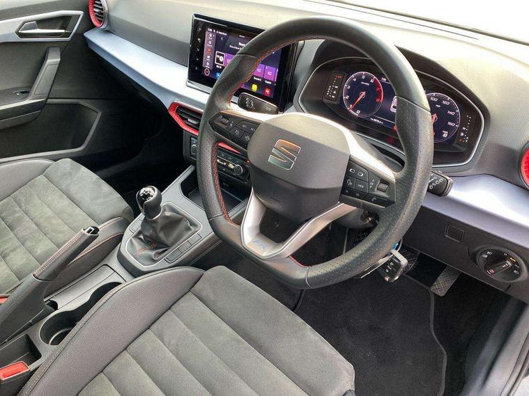 'Lights On' Reminder warning buzzer, 10" Digital cockpit, 9.2" touchscreen navigation system with type C USB socket, Voice control and DAB/AM/FM radio, Auto start and stop system, Bluetooth audio streaming with handsfree system, Cruise control, Digital clock, E-call, Full link smartphone integration with mirror link, wireless apple carplay, Google android auto + USB Type C cable for apple and android devices, Lane assist, Low fuel warning light, Outside temperature gauge, Power Steering, Seat connect with safety, service, remote and online, SEAT logo boot release, Speed limiter, Trip computer, Sports suspension, Auxiliary input socket, Radio/MP3 player, SD card slot, Steering wheel mounted controls, Anti theft roof antenna, Auto dimming rear view mirror, Automatic rain sensing wipers, Black door mirrors, Body colour bumpers, Body colour door handles, Brilliant black window surrounds, Dark tinted rear windows, Electric adjustable/heated/folding door mirrors, Electric front windows, Electric headlight adjustment, Electric rear windows, Front/rear fog lights, FULL LED automatic headlights with dynamic headlight range control, coming and leaving home, LED daytime running lights, LED tail lights, Rear roof spoiler with FR twin exhausts, Rear side wing doors, Rear wiper, Third brake light, 3 seat bench in 2nd row, 60/40 split folding rear seat, Ambient interior lighting, Chrome detailing and black headlining, Comfort seats, Dual zone climate control with combination filter, Front courtesy lights, Front cupholders x 2, Front reading lights, Gear shift indicator, Glovebox, Height adjustable front and rear headrests (five), Height adjustable front seats, Height/reach adjust steering wheel, Illuminated air vent surrounds, Illuminated boot, Instrument lighting with brightness control, Isofix, Leather multifunction flat bottomed sports steering wheel, Microsuede cloth upholstery, Passenger sunvisor, Single front passenger seat, Storage pockets on back of front seats, Sunvisors with mirror and driver side card holder, 3 point seatbelts on all 3 rear seats, ABS, Active front headrests, Child locks on rear doors, Electronic stability control, Energy recovery system, Front assist forward collision warning and autonomous emergency braking, Front driver and passenger side airbags with curtain airbag and front passenger airbag deactivation, Hill hold control, Multi-Collision braking, Seat belt reminder for front and rear seats, Tiredness recognition system, Tyre pressure monitoring system, Electronic engine immobiliser, Locking wheel bolts, Perimeter alarm and interior monitoring with backup horn and tow away protection, Remote central locking + deadlocks, 18" Performance machined alloy wheels in black and grey, Emergency tyre repair kit,