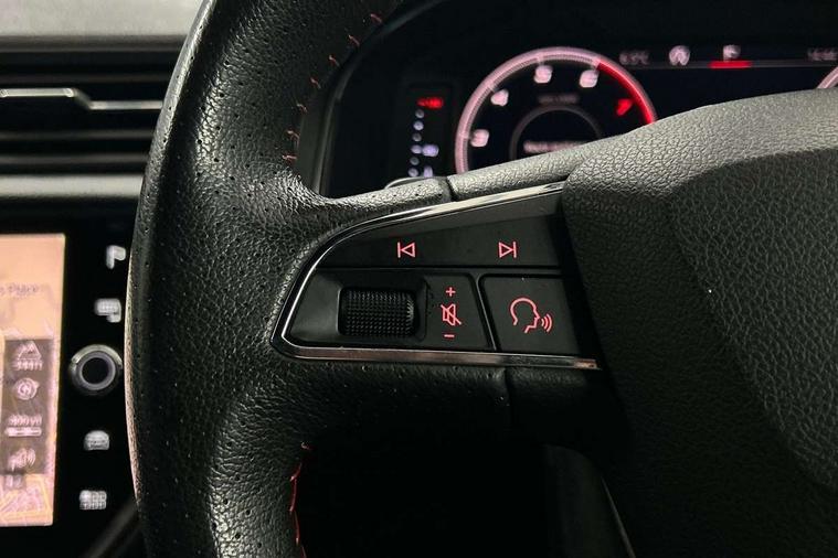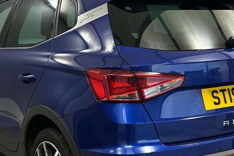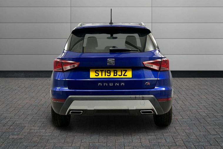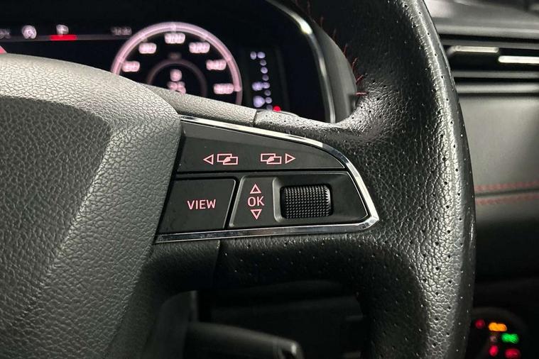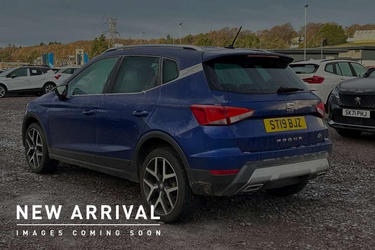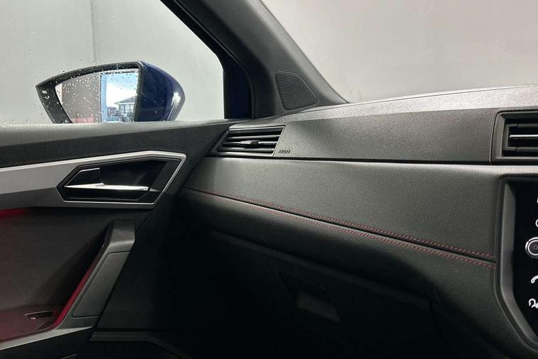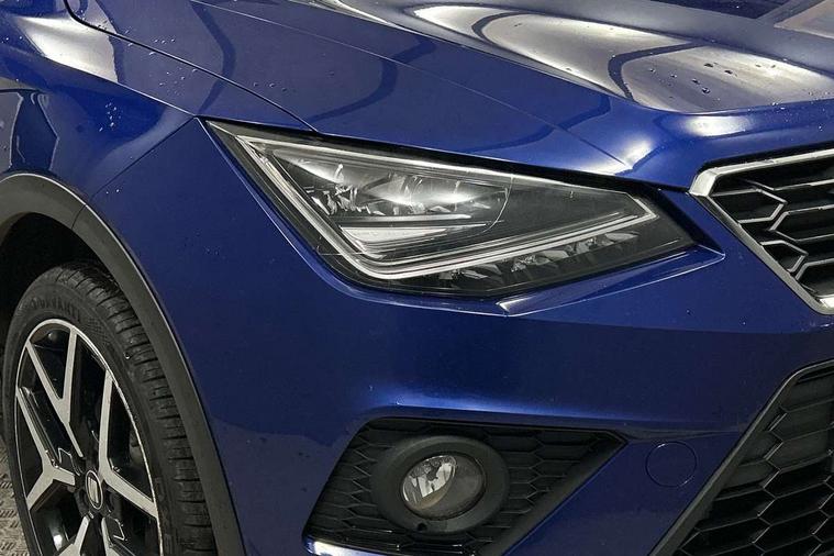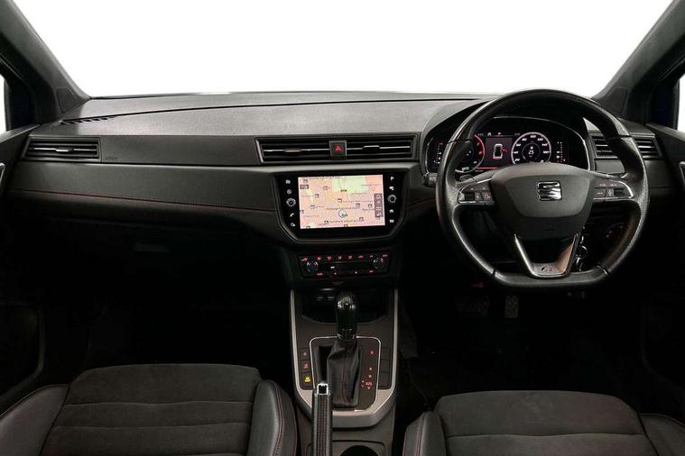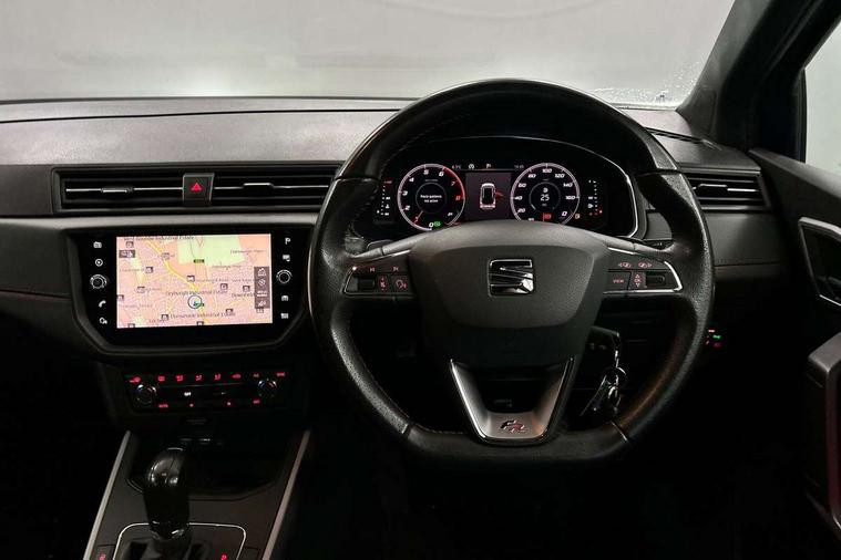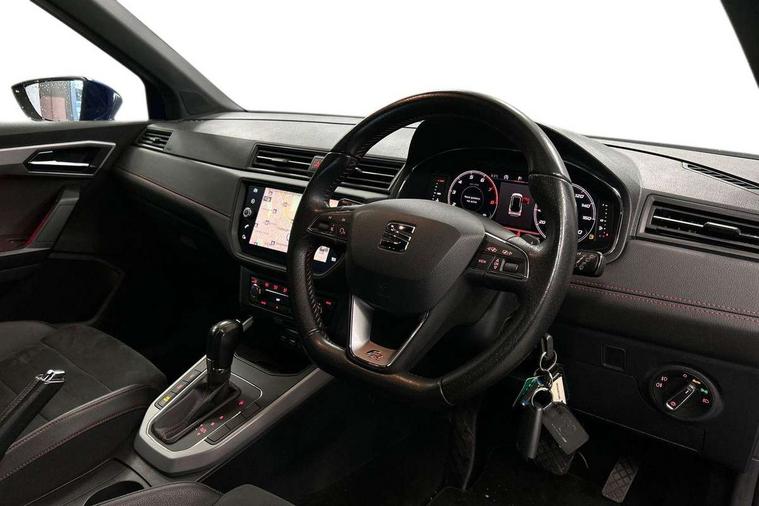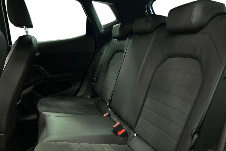 'Lights On' Reminder warning buzzer, Cruise control, Digital clock, Digital cockpit, Electric speed sensitive power steering, Front assistant collision mitigation, Full Link Smartphone Integration with Mirror Link, Apple Car Play, Google Android Auto, Low fuel warning light, Outside temperature display, Rear parking sensor, RPM counter, SEAT Drive profile, Trip computer, Dynamic chassis control, Sports suspension, 6 speakers, Bluetooth interface for hands free and audio streaming, DAB Digital radio, SEAT USB media cable, Steering wheel mounted audio controls, Anti theft roof antenna, Auto dimming interior rear view mirror, Automatic activation of hazard warning lights, Automatic headlights, Body coloured bumpers, Body coloured door handle inserts, Chrome grille surround, Chrome roof rails, Chrome window surround, Coming/leaving home lighting function, Dark tinted rear windows, Electric front/rear windows with one touch/auto up/down, Electrically adjustable and heated door mirrors, Electrically folding wing mirrors, Front fog lights, Full LED headlights, Ice metal door side panels, LED daytime running lights, LED licence plate lighting, LED tail lights, Rain sensor windscreen wipers, Rear fog lights, Rear window wash/wipe, Roof colour door mirrors, Twin exhaust pipes, Visible VIN plate, Windshield wiper with intermittent control and potentiometer, 2 cupholders, 3 rear height adjustable headrests, 60/40 split folding rear seat, Active head restraints, Ambient interior lighting, Card holder, Double boot floor, Driver and passenger sunvisors, Driver/front passenger seat height adjustment, Dual zone climate control, Dust/pollen filter, Flat bottomed steering wheel, Footwell ambient lighting, Front courtesy lights, Front reading light, Gear shift indicator, Gearshift paddles on steering wheel, Height/reach adjustable steering column, Illuminated boot, Instrument lighting with brightness control, Isofix attachments on outer rear seats, Leather handbrake, Leather steering wheel and gear knob, Microsuede cloth upholstery, Multi-colour ambient interior lighting, Sports seats, Connectivity pack plus - Arona, Winter pack - Arona, 3 point seatbelts on all rear seats, ABS+EBA, Child locks on rear doors, Driver/Front Passenger airbags, Electronic stability control, Front and rear seatbelt reminder, Front side/curtain airbags, Height adjustable active front headrests, Hill hold control + Tyre Pressure monitor, Multi-Collision braking, Passenger airbag deactivate switch, Tiredness recognition system, Traction control, 2 folding remote keys with window open/close function, Alarm with back-up horn, Immobiliser, Locking wheel bolts, Remote central locking + deadlocks, Tow away protection, Interior chrome line trim, 18" Performance alloy wheels,