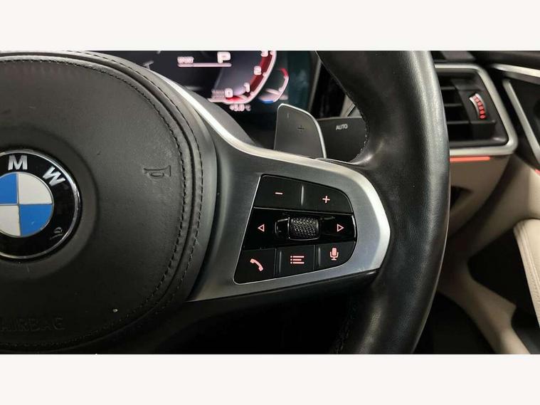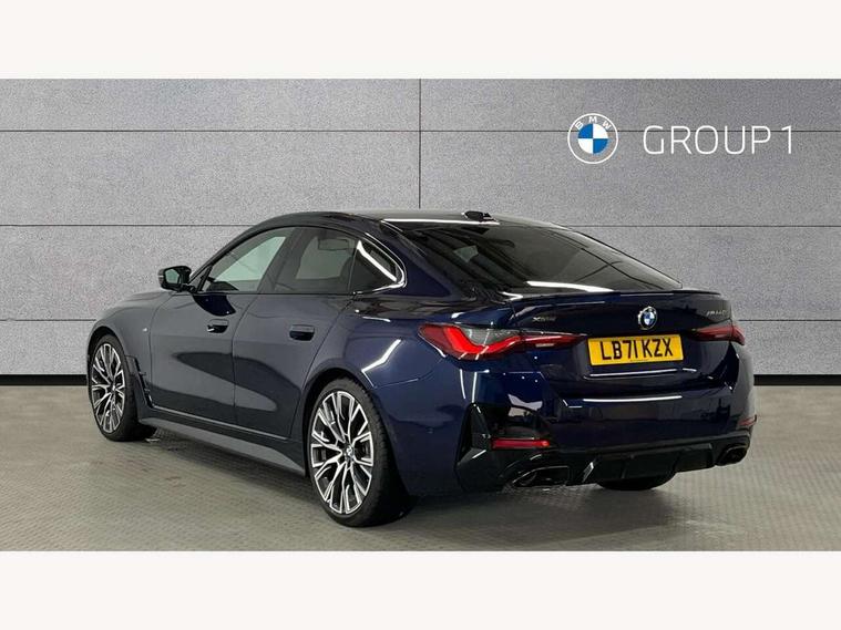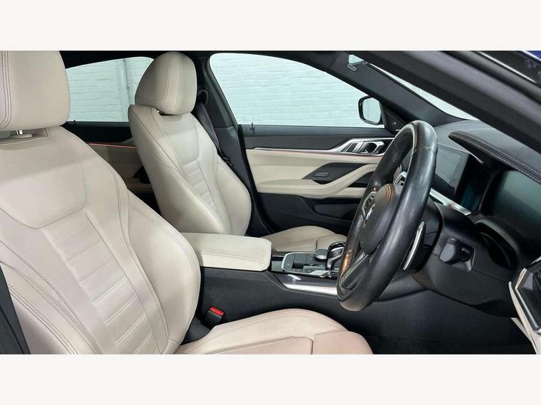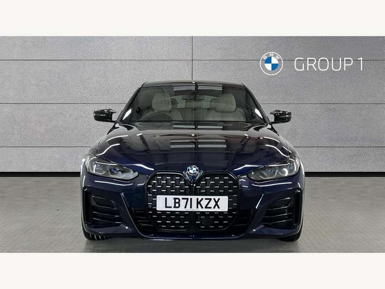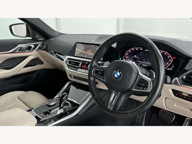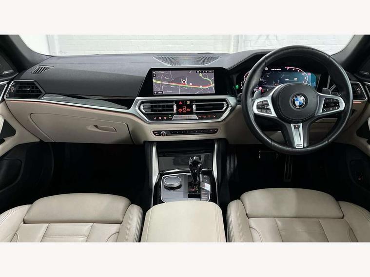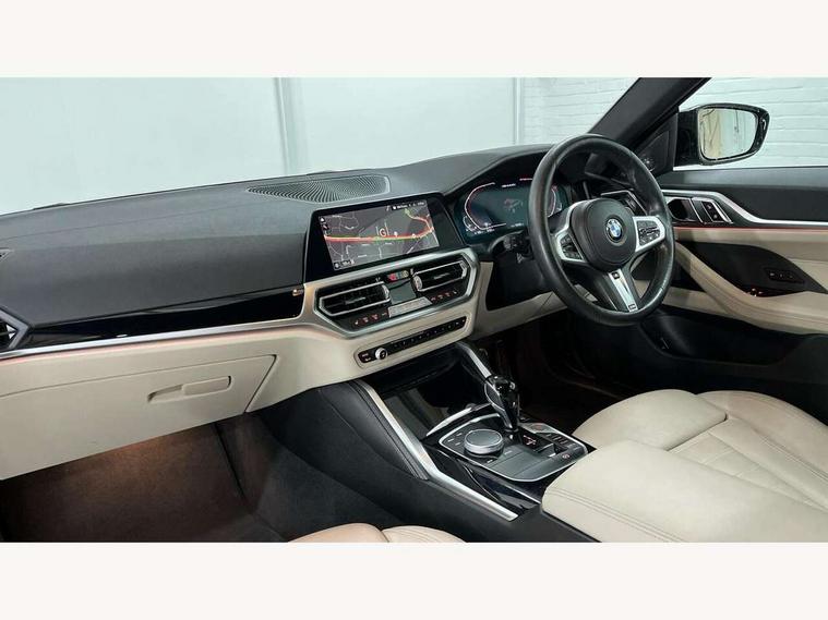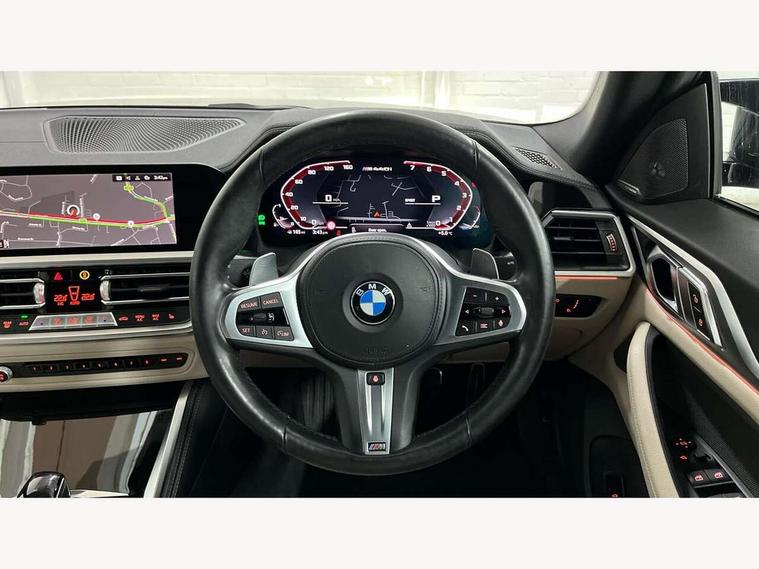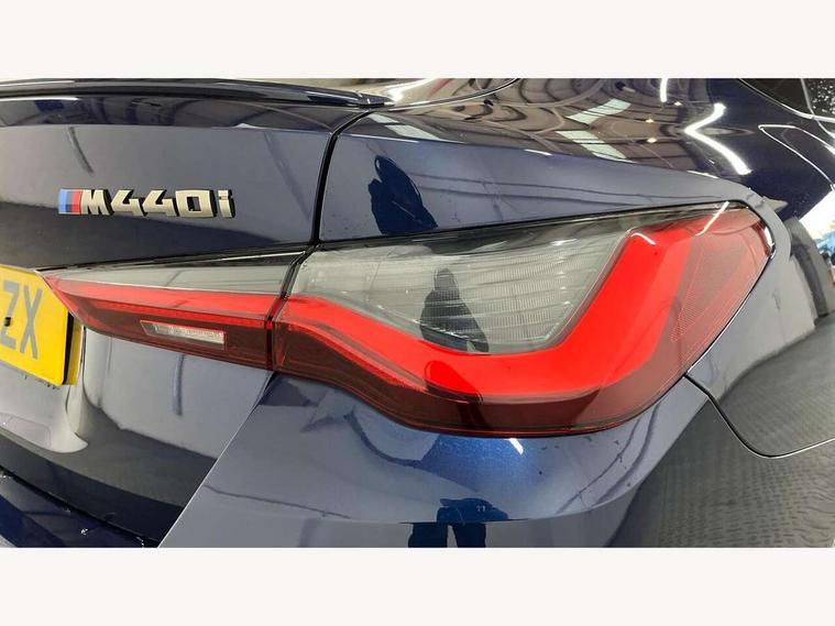 Active guard plus, Attentiveness assist, Auto start-stop, Bluetooth hands free facility with USB audio interface with audio streaming, BMW ConnectedDrive online services, BMW iDrive controller on centre console, BMW Live Cockpit Professional Nav with 12.3" instrument display + 10.25" display, Intelligent Voice Assist, BMW OS 7, HDD, 2USB, 4G LTE connect, BMW service history, BMW Teleservices, Brake pad wear indicator in front and rear, Check Control warning system for monitoring of lights and door/luggage compartment open warning, Condition based service, Electric bootlid, Electric power steering with Servotronic steering optimised at all speed ranges, Gearshift time display in manual mode, Instrument cluster with speedometer with mph readout, tachometer, fuel gauge and oil temperature gauge, Integrated owners handbook, Oil sensor for level and grade, warning by check control system, On board computer - average speed, fuel consumption, outside temp display with acoustic warning, clock/date, service interval, odometer/trip meter, Optimum shift indicator, Tailgate, Variable sport steering, 48V Mild hybrid technology, 8 speed automatic steptronic transmission with gearshift paddles, Adaptive M suspension, Driving experience modes - Comfort, ECO PRO, Sport and Sport+ mode, Low centre of gravity, M Sport differential, Petrol Particulate Filter, Stroke dependent dampers, xDrive system permanent all-wheel drive variable torque distribution, DAB tuner, Electronic service booklet, Acoustic glazing, Automatic headlight beam throw control with load dependent regulating reaction, dynamic compensation of braking dive and acceleration squat, Automatic windscreen wipers and automatic headlight, Automatically dimming electrochromatic rear view mirror, BMW emblem on engine compartment lid and tailgate, Body colour fuel filler flap, Body colour roof fin, Brushed aluminium inserts in the front door sill finishers with BMW designation, Cerium grey finish for mirror caps, kidney grilles, exterior air inlets and model designation, Dynamic brake lights, Electric windows - front and rear, with open/close fingertip control, anti trap facility and comfort closing function all round, Exterior mirrors - electrically folding with anti-dazzle, Fading support, Front and rear bumper system, Front apron plastic in body colour, Green tinted heat protection glazing, Illuminated bow type door handles in body colour drivers side with door lock, Interior rear view electrochromatic mirror with automatic anti dazzle function, Licence plate panel integrated into front bumper and tailgate, Lightweight engineering, M designation on front side panels, left and right, M rear boot spoiler, One piece front bumper cover including towing eye cover in body colour, Preparation for high beam assistant, Side frame decorative moulding black matt, Sun protection glass, Twin exhaust tailpipes x2, Two part LED tailights in L-shape with components in smoked glass, brake light, LED turn indicator and rear fog light, Visible VIN plate, Welcome lights in interior and door handle area, Widened track and increased camber values for max transverse dynamics, agility and steering precision, Window recess cover black high gloss, Windscreen wipers with integrated washing jets, xDrive designation on left tailgate, 12V power socket in front centre console, 2 front cupholder in centre console with clamping elements and matt black inlay, 3 rear headrests, 3 spoke M sport leather multifunction steering wheel, 3 zone automatic air conditioning, 4 pieces lashing eyelets in luggage compartment, 40:20:40 split folding rear seat and rear centre armrest with two cupholders, Ambient lighting with welcome carpet light, Anthracite headlining, Armrest integrated in front and rear door trim + front centre console armrest, Four grab handles integrated in roof lining, Front and rear door exit lighting (left / right), Front and rear door pockets, Front and rear footwell lights, Front and rear reading lights, Front headrests, Heated driver and front passenger seats, Height adjustable mechanically and infinitely variable steering column, Illuminated armrest storage compartment, Illuminated glove compartment with separate small compartment, Luggage compartment light, Make-up mirror lights, Storage compartment in rear centre console, Sunvisors with vanity mirrors and ticket pocket, Toolkit located in luggage compartment, Velour front floor mats, Vernasca leather upholstery, Connected professional package - 4 Series, M sport exterior styling pack - 4 Series M440i, 3 point seatbelts on all seats, Battery safety cut-off, BMW emergency call, Brake energy regeneration, Braking pre-tensioning, Child proof locking system in rear door, Child seat ISOFIX attachment for the two outer rear seats, Coasting in idle in ECO PRO mode, Cornering brake control (CBC), Crash sensor activating of airbags, Unlocking doors, hazard warning lights, interior light, safety battery terminal, Driver and front passenger side airbags, integrated in the door side seat backrest bolsters for all seat variants, Driver/Front Passenger airbags, Dry braking, Dynamic brake control, Dynamic stability control + (DSC+) - Anti-lock Braking System (ABS) with brake assist and cornering brake control + Automatic Stability Control (ASC), Dynamic Traction Control - DTC, Electric parking brake including automatic hold function and automatic release of the parking brake when driving off, Electronic differential lock control (EDLC), Front and rear ventilated brake disc, Front passenger manual airbag deactivation, Head airbags for all 4 outer seats, Hill start assistant, M Sport seatbelts, Seat belt security check for driver and front passenger, Seat belt with belt stopper, pyrotechnic belt tensioners and belt force limiters, Side impact protection, Tyre pressure monitoring with three level warning strategy, Warning triangle and first aid kit, Alarm system (Thatcham 1) with remote control and electronic engine immobiliser, Cent