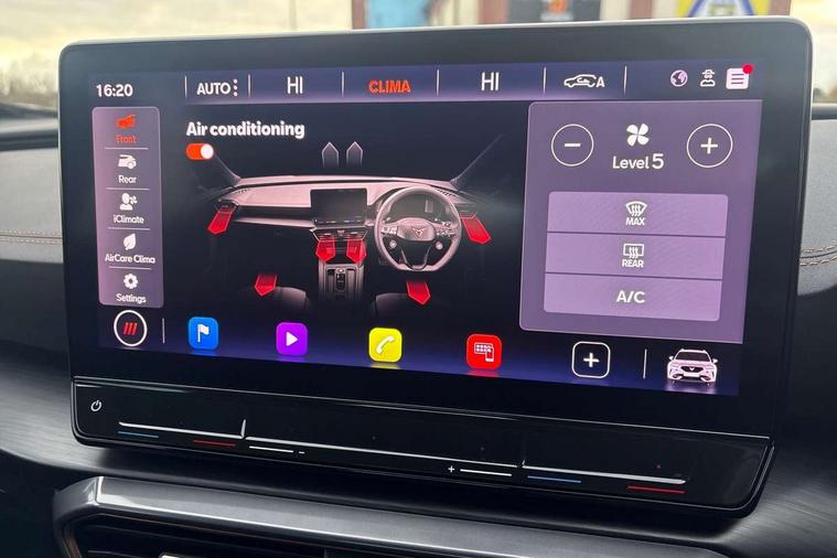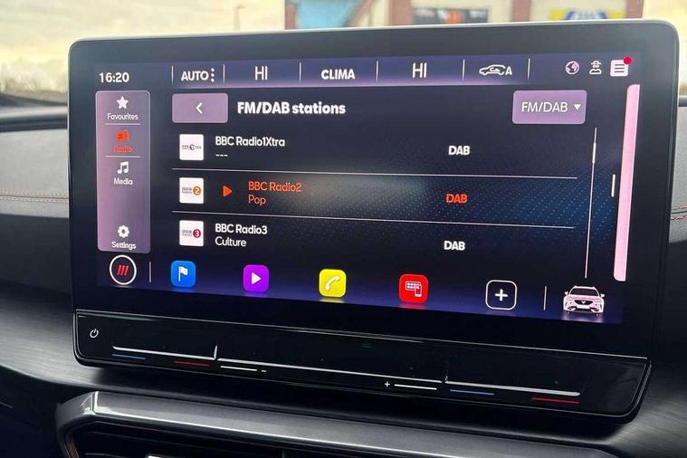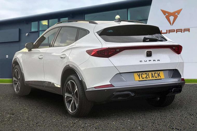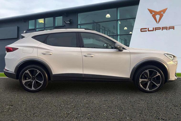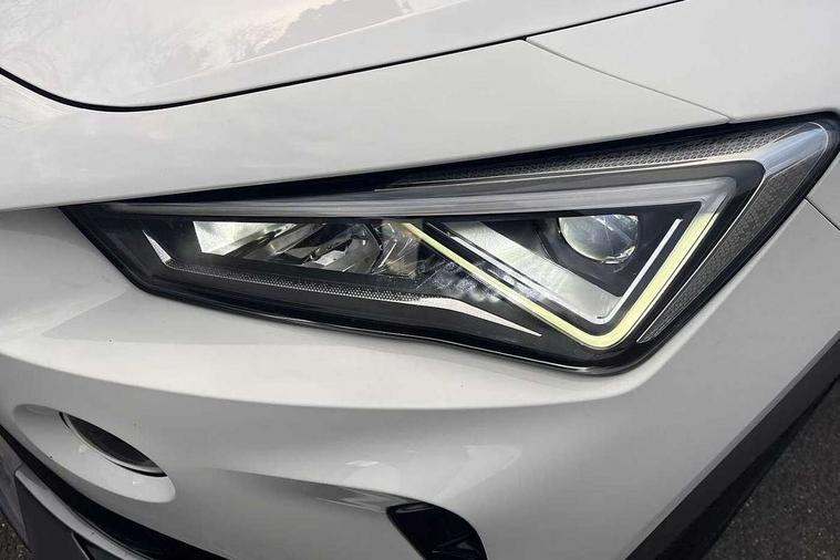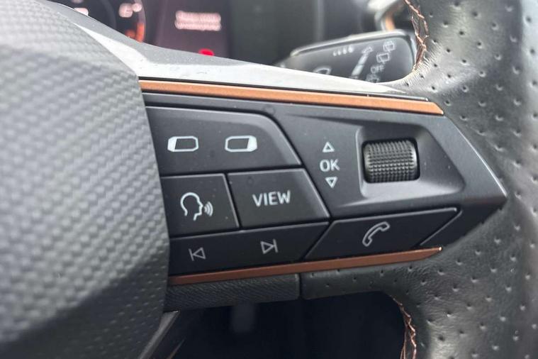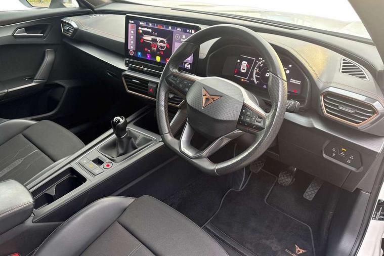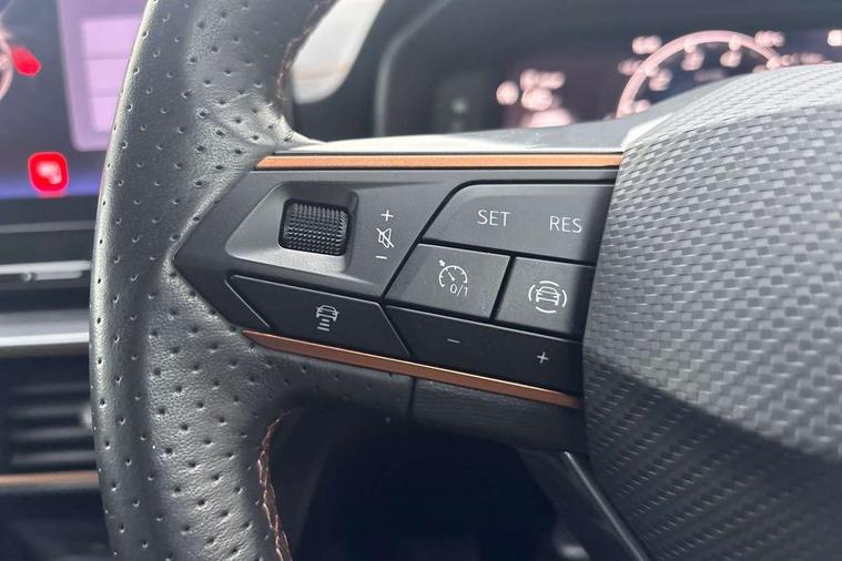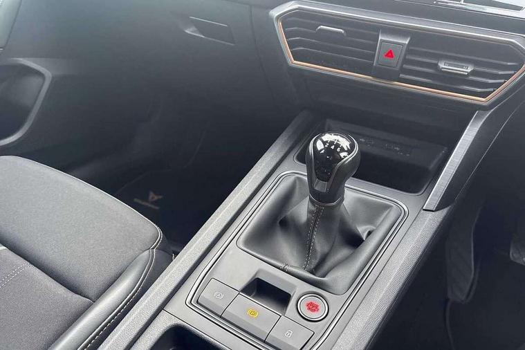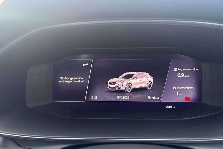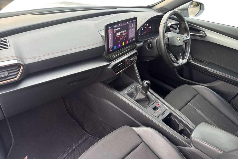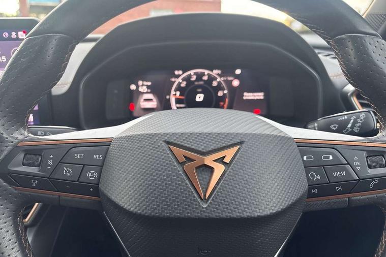 Digital cockpit and configurable dashboard, Driver alert system, Driving profile selection, Forward collision warning with automatic braking, Lane assist, PAS, Predictive adaptive cruise control with speed limiter, Rear parking sensors, RPM, trip computer, outside temp gauge, instrument light brightness, low fuel warning light, lights on reminder, gearshift indicator, Service interval indicator, Start/stop system with regenerative braking, Wireless apple carplay, Wireless phone charger, Electronic locking differential and dynamic traction support, Standard suspension, 2 front and 2 rear USB type C sockets, Auxiliary input socket, DAB radio, Auto dimming rear view mirror, Body colour door handles, Body coloured bumpers, Dark grey wing mirror, Daytime running light with automatic headlight control and coming home feature, Dynamic headlight range control, Electric front/rear windows, Electrically adjustable, heated and folding door mirrors, Front fog lamps with cornering function, Gloss black roof rails and window surrounds, LED Headlights, LED Taillights with dynamic indicator, Rain sensing wipers, Rear diffuser with black simulated exhaust pipes, Rear wash/wipe, Tinted rear windows, Welcome lights, 12v power supply in centre console, 12V socket, 12v socket in loadspace, 2 front and 2 rear reading lights, 230V socket, 60/40 split rear bench seat with armrest and mechanical seat release, Dust/pollen filter, Front and rear head restraints, Front centre armrest, Height/reach adjust steering wheel, Illuminated interior front door sills, Illuminated sunvisor with mirror, Interior ambient lighting, Isofix, Leather multi function steering wheel, Luggage tie-down hooks, Manually adjustable height and lumbar support for front seats, PVC/Cloth upholstery with copper stitching + Sport seats, Three zone climate control with control panel in rear, Variable luggage/load compartment floor, Navigation system pack - Formentor, Safety and driving pack (M) - Formentor, 3 point seatbelts on all rear seats, ABS, Brake control system - ESC and brake booster, Child proof door locks, Driver and front passenger airbags with front passenger airbag de-activation, Electronic parking brake, Front and rear disc brakes, Front side curtain airbags, Hill hold control, Seat belt reminder for front and rear seats, Tyre pressure monitoring system, Anti theft alarm system, Keyless entry and start system (KESSY), Locking wheel bolts, Copper and aluminium interior detailing,