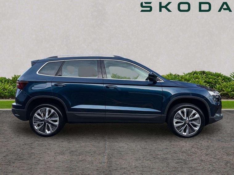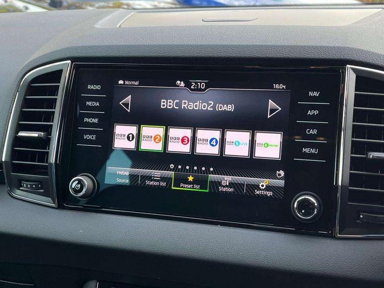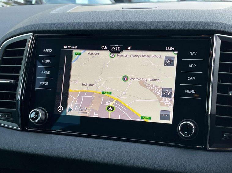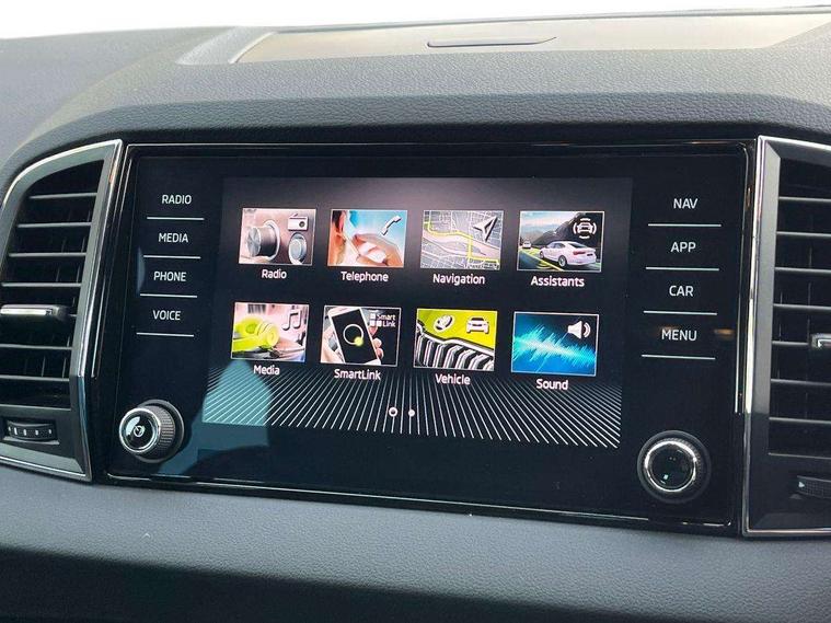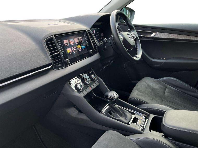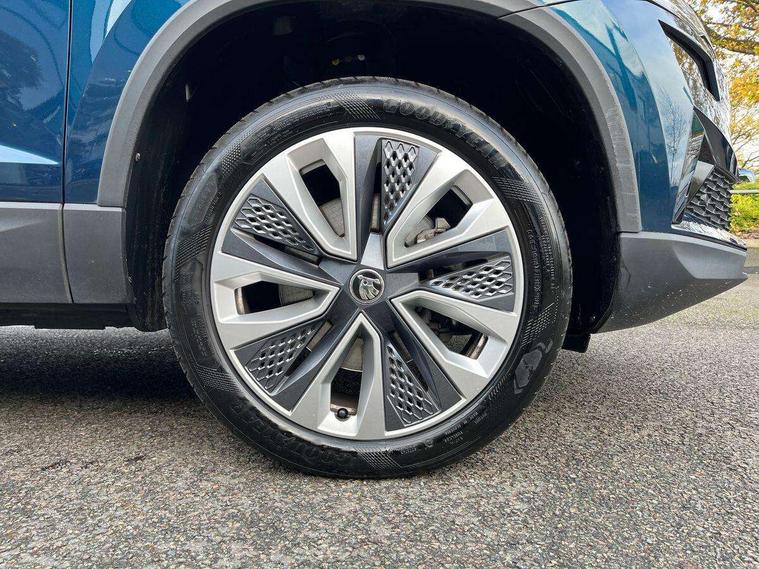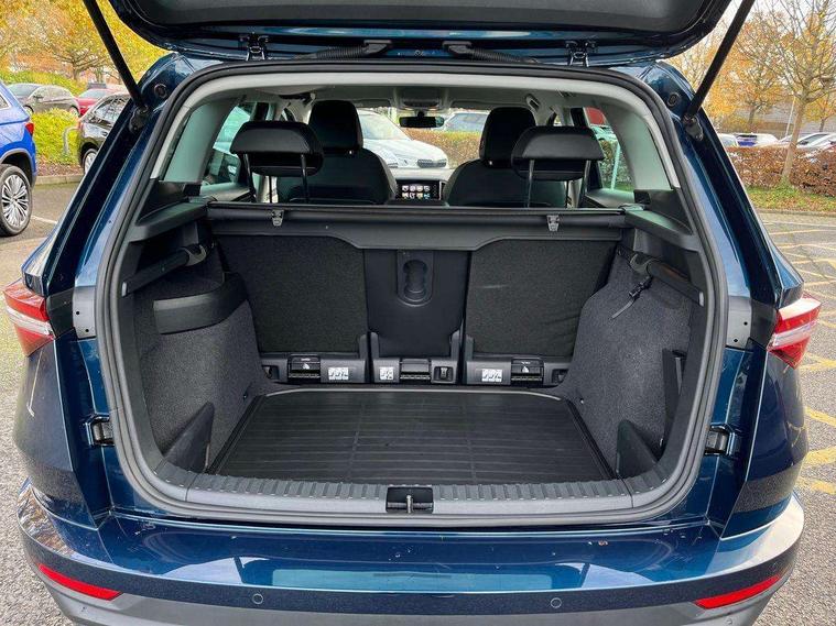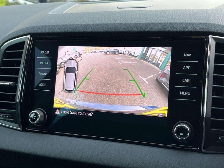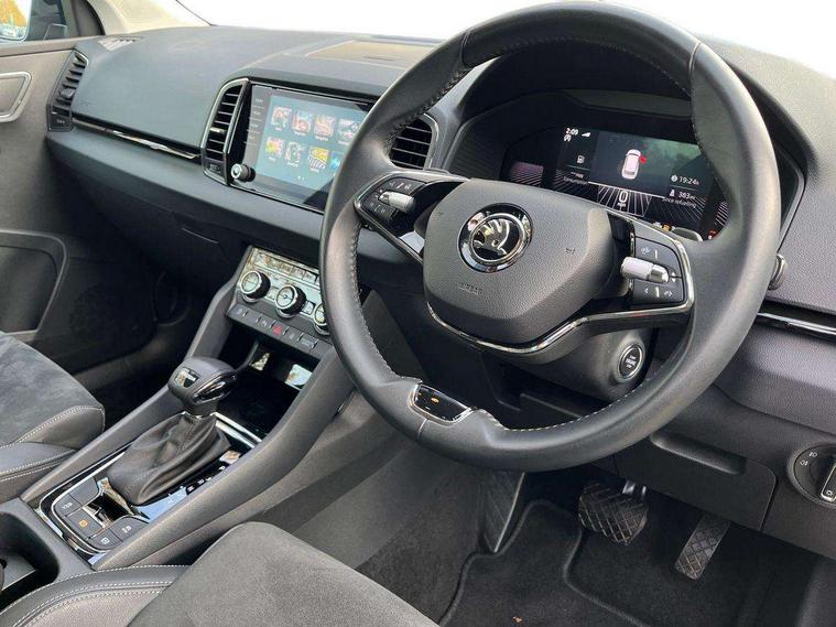8" Digital display, Care connect, Driver fatigue sensor, Emergency services call system, Outside temperature gauge, Service interval indicator, SmartLink wireless for Apple and wired for Android, Start/stop system with regenerative braking, USB C Port x 2 in front centre console, 8 speakers, DAB radio with Bluetooth, USB connection, Acoustic glass, Aero front windscreen wipers with intermittent function, Auto dimming rear view mirror with light and rain sensors, Black electric window control buttons, Body colour door mirrors and handles, Dynamic headlight range control with cornering light function, Electric front and rear windows with child proof lock, Heated rear windscreen, LED daytime running lights, LED rear lights with high functionality welcome effect and dynamic indicators, Light assistant (coming/leaving home/tunnel light), Plastic scuff plates, Privacy glass, Rear side wing doors, Rear spoiler, Rear window wiper with washer system and intermittent control, Safety reflectors on front doors, 1.5 litre bottle holders in driver and front passenger door panels, 12V socket in boot, 12v socket in front centre armrest with storage compartment and rear air vents, 2 spoke leather heated multifunction steering wheel with DSG paddles, 2 x Tablet holder, 3 rear height adjustable headrests, 3 seat bench in 2nd row, 4 foldable roof handles with rear coat hooks, Black floor carpet, Chrome inner door handles, Decorative door sills with KAROQ badging, Double sided boot floor, Foldable hooks in the boot, Front head restraints, Height adjustable front three point seats belts with tensioners, Height/reach adjust steering wheel, Ice scraper, Illuminated glovebox, Illuminated luggage compartment, Isofix child seat preparation for front passenger seat, Isofix child seat preparation outer rear, Manual lumbar support for front seats, Pen holder, Pollen filter, Rear boot cover, Rear reading lights, Rubbish bin door, Safety vest holder, Single front passenger seat, Storage box in upper central dashboard closed, Sunvisors with illuminated vanity mirrors, Textile floor mats, Ticket holder, Tool kit, VarioFlex seats with standard rear seat release, Boot pack - Karoq, Chrome roof rails + chrome pack - Karoq, Parking pack - Karoq, Automatic door unlocking in case of crash, Automatic fuel cut off in case of crash, Child locks on rear doors, Driver airbag, Electronic parking brake with auto hold function, Emergency rear braking signal, ESC including ABS, MSR, ASR, EDS, HBA, DSR, RBS, MKB and traction control, Front side airbags, Hill hold control, Knee airbags, Passenger airbag with switch-off function, Pedestrian monitor, Seatbelt reminder signalisation and pretensioner for all seats, Three point seatbelts rear, Two tone horn, Tyre pressure display, Tyre pressure monitor, Alarm with interior monitoring, back up horn and tilt sensor with safe function, Electronic engine immobiliser, Keyless entry and start/stop, Remote central locking with 2 remote folding keys, Chrome framed air vents, 18" Procyon silver alloy wheels with anthracite aero inserts, Anti-theft wheel bolts protection, Storage on wheel cover,