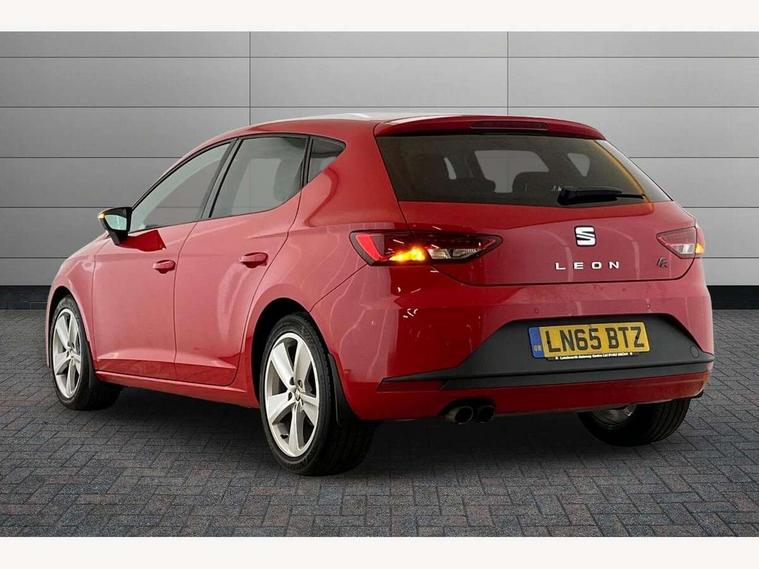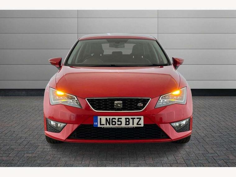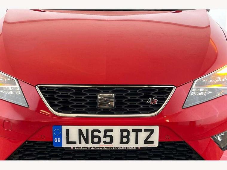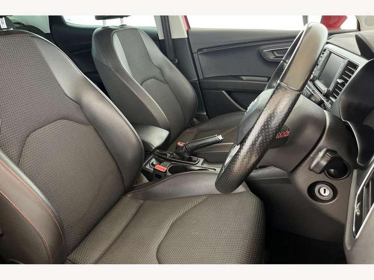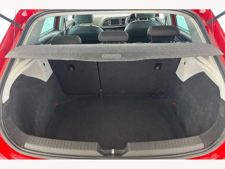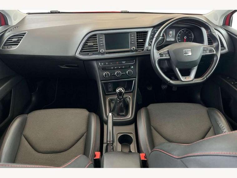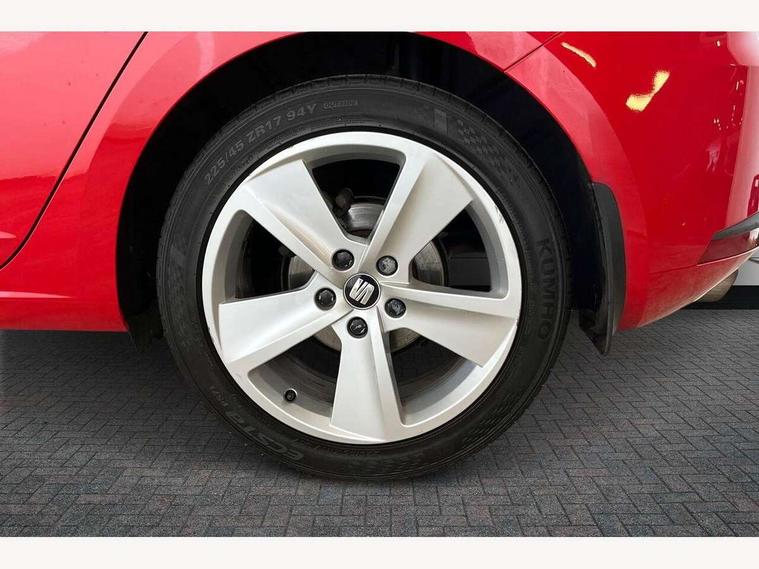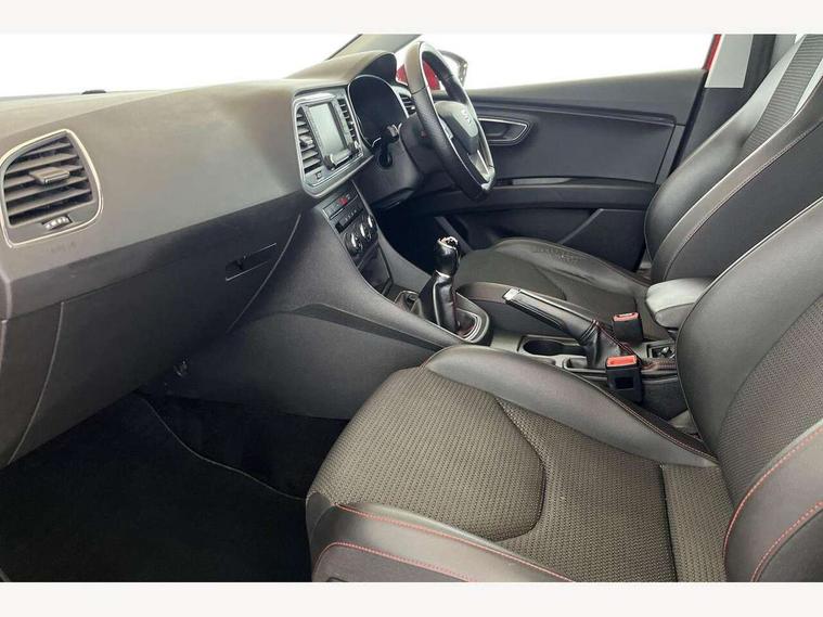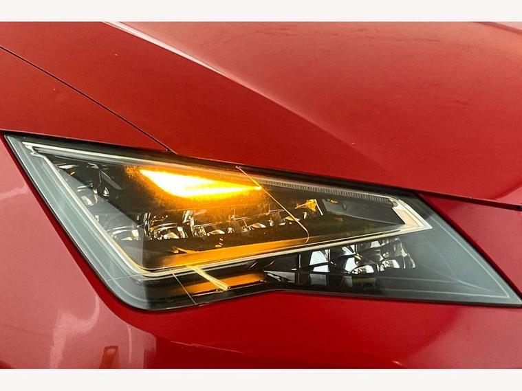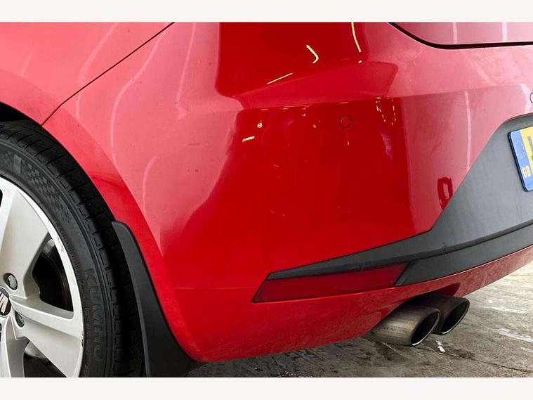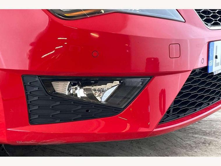 'Lights On' Reminder warning buzzer, 6.5" colour touchscreen with proximity sensor, Bluetooth Handsfree Phone Connection, Digital clock and outside temperature display, Front parking sensor, Low fuel warning light, Multi function display, Rear parking sensor, Remote fuel flap release, SEAT Drive profile, SEAT logo boot release, Service interval indicator, Touch screen display, Trip computer, Voice control system, Sports suspension, XDS electronic differential lock, Auxiliary input socket, Bluetooth audio streaming, DAB Digital radio, iPod connection, Radio/CD + MP3, SD card slot, Steering wheel mounted audio/phone controls, USB port, Aluminium front door sills, Body colour door handles, Body coloured bumpers, Chromed centre radiator grille surround, Coming home headlight function, Dark tinted rear windows, Electric adjustable/heated/folding door mirrors, Electric front/rear windows with one touch/auto up/down, Electric headlamp adjustment, LED indicators in door mirrors, Rear wash/wipe, Reverse activated kerb-view adjustment on passenger's door mirror, Tinted windows, 12v power point in centre console, 3 height adjustable rear headrests, Active head restraints, Additional heating and ventilation outlet in rear of centre console, Ambient lighting, Driver seat height/lumbar adjust, Driver/passenger sunvisors with illuminated vanity mirrors, Dual zone climate control, Dust/pollen filter, Front adjustable head restraints, Front armrest with storage box, Front cupholders x 2, Front map reading lights, Front seat and rear pockets, Front/rear floor mats, Height/reach adjust steering wheel, Illuminated boot, Illuminated glovebox, Leather handbrake, Luggage tie-down hooks, Passenger seat height adjuster, Passenger seat lumbar adjust, Perforated leather steering wheel with red stitching + gear knob, Rear reading lights, Rear top tether child seat ISOFIX attachment, Split folding rear seat, 3 point seatbelts on all rear seats, ABS + traction control, Child proof door locks, Curtain airbags, Driver/Front Passenger airbags, Drivers knee airbag, ESP+EBA, Front seatbelt pretensioners, Front side airbags, Hill hold control, Passenger airbag deactivation system, Seatbelt warning, Tyre pressure monitoring system, Engine immobiliser, Locking wheel bolts, Remote central locking + deadlocks, Second remote key, Volumetric alarm with back up horn, Chrome interior trim,