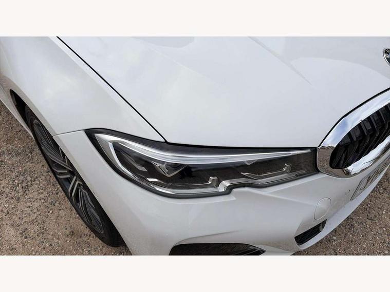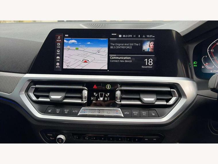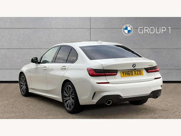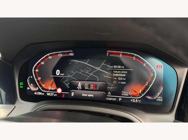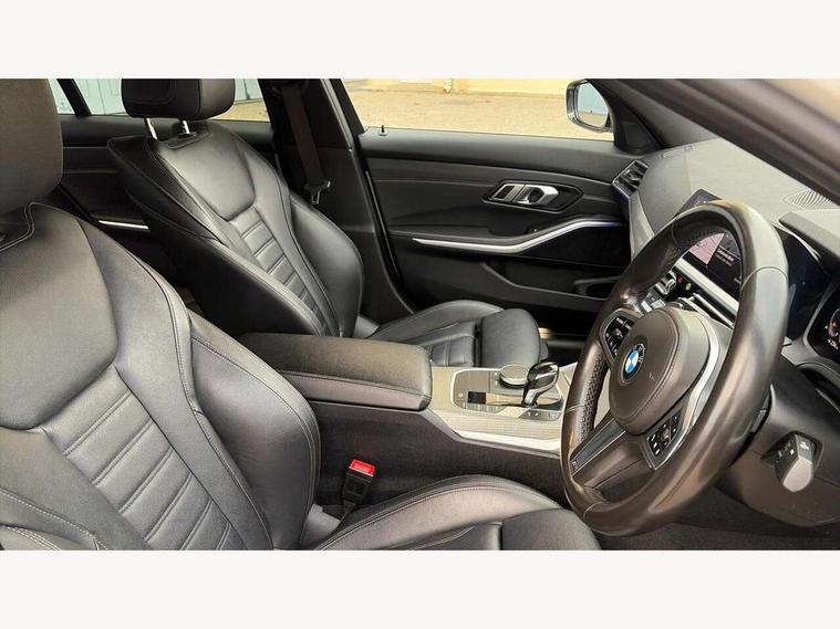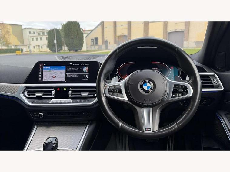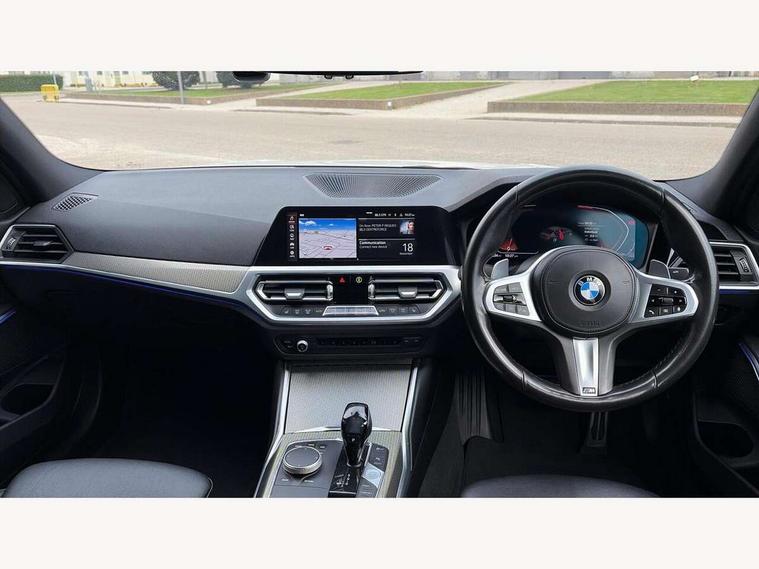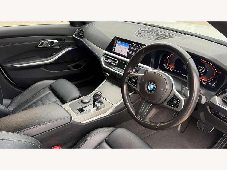 Active guard plus, Attentiveness assist, Auto start-stop, BMW iDrive controller on centre console, BMW Live Cockpit Professional sat nav system including 10.25" high resolution display and Intelligent Voice Assistant, BMW Online services, BMW Teleservices, Brake pad wear indicator in front and rear, Check Control warning system for monitoring of lights and door/luggage compartment open warning, Condition based service, Instrument cluster with speedometer with mph readout, tachometer, fuel gauge and oil temperature gauge, Oil sensor for level and grade, On board computer - average speed+fuel consumption, service interval, clock/date, odometer/trip meter, outside temperature display and ice warning, Optimum shift indicator, Personal Profile, Variable sport steering, Battery cut-out switch, Double VANOS, Drive performance control with ECO PRO comfort and Sport+ mode, Electronic differential lock, High precision injection, Larger capacity fuel tank, M sport suspension, Petrol Particulate Filter, Sport automatic transmission with steering-wheel mounted gearshift paddles and launch control, Stroke dependent dampers, DAB tuner, Acoustic glazing, Active airstream chrome frame kidney grille with 8 high gloss black vertical slats, Automatic headlight beam throw control with load dependent regulating reaction, dynamic compensation of braking dive and acceleration squat, Black roof mouldings, Body colour - fuel filler flap, front and rear bumpers, door handles and mirror caps with integrated turn indicator + bottom segment in matt black, Dynamic brake lights, Extended LED headlights, Exterior mirrors - electrically folding with anti-dazzle, Front and rear bumper system with replaceable deformation elements, Front and rear electric windows with open and close fingertip control, anti trap facility and comfort closing, Front black door sill finishers with BMW designation, Green tinted heat protection glazing, High gloss shadow line exterior trim, Interior rear view electrochromatic mirror with automatic anti dazzle function, LED front fog lights, Left and right split exhaust tailpipes, Lightweight engineering, M aerodynamic body styling, M designation on left and right front side panels, M designation side badges, Matt black exterior B pillar, Model designation on right side of tailgate, Rain sensor with automatic headlight activation, Shark fin antenna, Two part LED tailights in L-shape with components in smoked glass, brake light, LED turn indicator and rear fog light, Visible VIN plate, Welcome lights in interior and door handle area, Windscreen wipers with integrated washing jets, 12V power socket in front storage compartment, 2 front cupholder in centre console with clamping elements and matt black inlay, 3 rear seats with non folding headrests with 3 point seat belts, 3 spoke M leather steering wheel, 4 pieces lashing eyelets in luggage compartment, 40:20:40 split folding rear bench seat, Ambient lighting, Anthracite headlining, Armrest integrated in front and rear door trim + front centre console armrest, Centred top Luggage compartment lights, Four grab handles integrated in roof lining, Front and rear door pockets, Front and rear velour floor mats, Front head restraints, Front sport seats, Heated driver and front passenger seats, Height adjustable mechanically and infinitely variable steering column, Illuminated glove compartment with separate small compartment, Interior lighting - front centre over interior mirror with soft light, rear centre and front and rear footwell lighting, Rear centre armrest with 2 cupholders, Rear centre console with storage compartment and ventilation grille, Steering column length adjustment lever, Sunvisors with vanity mirrors and ticket pocket, Three zone automatic air conditioning, Through loading system with 40/20/40 split folding rear seat, Toolkit located in luggage compartment, Connected pack professional - 3 Series Saloon/Touring, M Aerodynamics pack - 3 Series Saloon/Touring, 2 tone horn, ABS, Automatic Stability Control (ASC), BMW emergency call, Brake assist function, Brake drying, Brake energy regeneration, Braking pre-tensioning, Child proof locking system in rear door, Child seat ISOFIX attachment rear outer seats, Cornering brake control (CBC), Crash sensor activating of airbags, Unlocking doors, hazard warning lights, interior light, safety battery terminal, Driver and front passenger side airbags, integrated in the door side seat backrest bolsters for all seat variants, Driver/Front Passenger airbags, Dynamic brake control, Dynamic Traction Control - DTC, Electromechanical parking brake with automatic drive away release and auto hold function, Front passenger manual airbag deactivation, Head airbags for all 4 outer seats, Hill start assist, M Sport braking system, Seat belt security check for driver and front passenger, Side impact protection, Three 3 point seat belts on all seats including front belt stopper, pyrotechnic belt tensioners and belt force limiters, Tyre pressure monitoring with three level warning strategy, Ventilated front and rear disc brakes, Warning triangle and first aid kit, Alarm system (Thatcham 1) with remote control and electronic engine immobiliser, Central locking switch for all doors, fuel filler cap and luggage compartment, Remote control with integrated key one button open/close vehicle and windows, sole opening of the luggage compartment lid and panic mode, Selectable automatic lock when driving away, Start/stop button with Comfort Go keyless engine start and auto Start/stop deactivation button, Vehicle key with M specific designation, Reduced rolling resistance tyres,