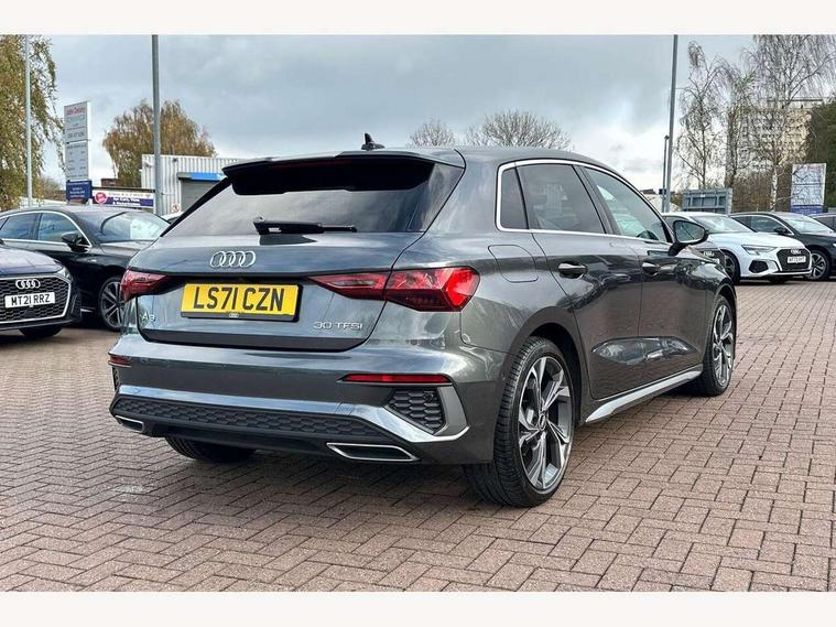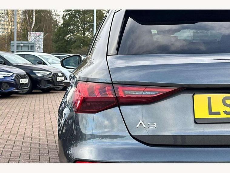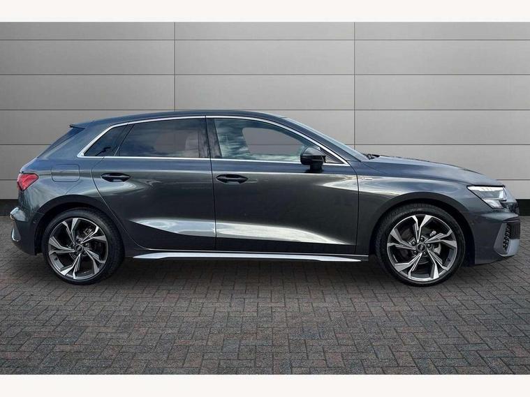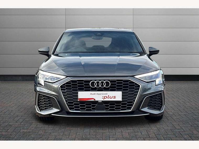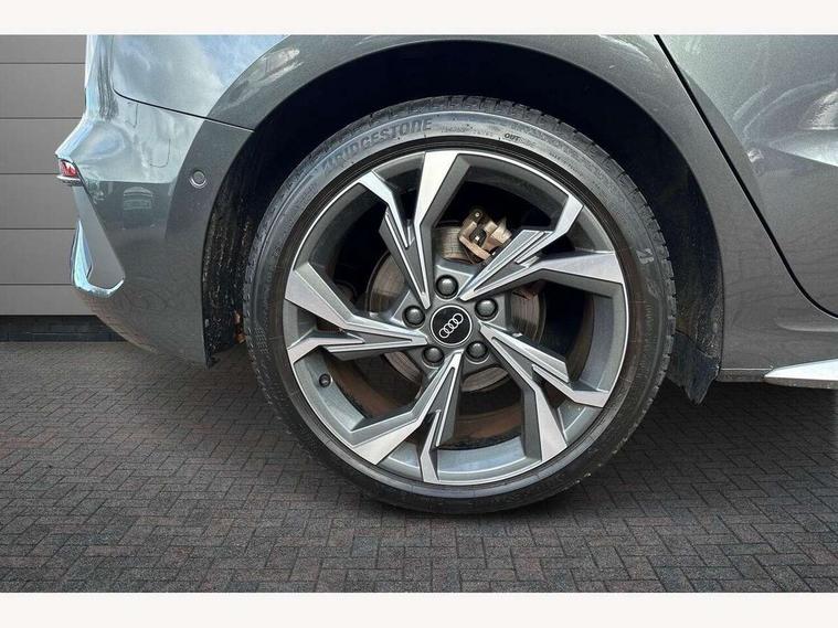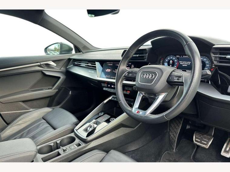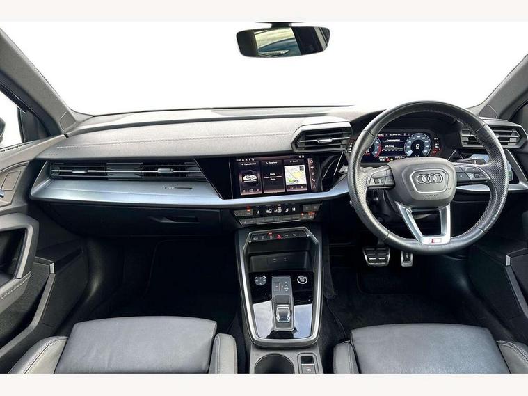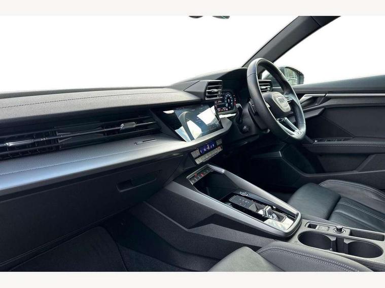Audi connect emergency call and service, Audi drive select (Auto, Comfort, Dynamic and Individual), Audi smartphone interface, Audi Virtual Cockpit - 10.25" digital and colour instrument cluster, Automatic start/stop system with recuperation, Bluetooth interface, Collision avoidance assistant, Electromechanical power speed sensitive steering, Lane departure warning system, MMI Navigation Plus with high resolution 10.1" colour touch screen display, Service indicator, Trip computer, Voice control system with natural language interaction, 2xUSB-C connection with data and charging functions, 6 passive loudspeakers, DAB Digital radio, 3rd brake light, Acoustic glass windscreen, Aluminium window trim, Auto dimming frameless rear view mirror, Electrically adjustable/heated/folding/auto dimming door mirrors with integrated LED indications + kerb view function for passenger side, Front electric windows, Illuminated aluminium inserts front door sills with S logo, LED daytime running lights, LED headlights with LED rear lights and dynamic rear indicators, Light and rain sensors, Privacy glass - dark tinted rear window, rear door and side windows, Rear electric windows, Rear side air outlets in grained matt black, Rear wiper, S line bumpers, S roof spoiler, 12V socket and storage compartment in front centre console, 40/20/40 split folding rear seat bench with cupholder, Black cloth headlining, Dual zone electronic climate control, Front and rear centre armrest in leather, Front and rear headrests, Front/rear floor mats, Height and reach adjustable steering wheel, Interior lighting - glove compartment light and right hand side, Luggage compartment floor covering, Manual boot compartment lid, Manually adjustable front seats, Seat side bolsters, Stainless steel pedals and front footrest, Twin leather upholstery with front sports seats S embossed logo, Aluminium interior elements pack - A3 Sportback, S line styling pack - A3 Sportback, 3x3 point rear seat belts, Driver and front passenger airbag with passenger airbag deactivation, Electronic Stabilisation Control (ESC) including ABS, ASR and EDL, First aid kit with warning triangle and 2 safety vests, Front side airbags with head airbags and interaction airbag, Hill hold assist, Pre-sense front with pedestrian and cyclist detection, Seatbelt monitoring, Tyre pressure loss indicator, Anti theft alarm, Anti-theft wheel bolts, Electronically operated child lock, Immobiliser, Remote control central locking, Accent surfaces in the dashboard and centre console in platinum grey silk effect paint finish, Dark spectrum aluminium inlays,