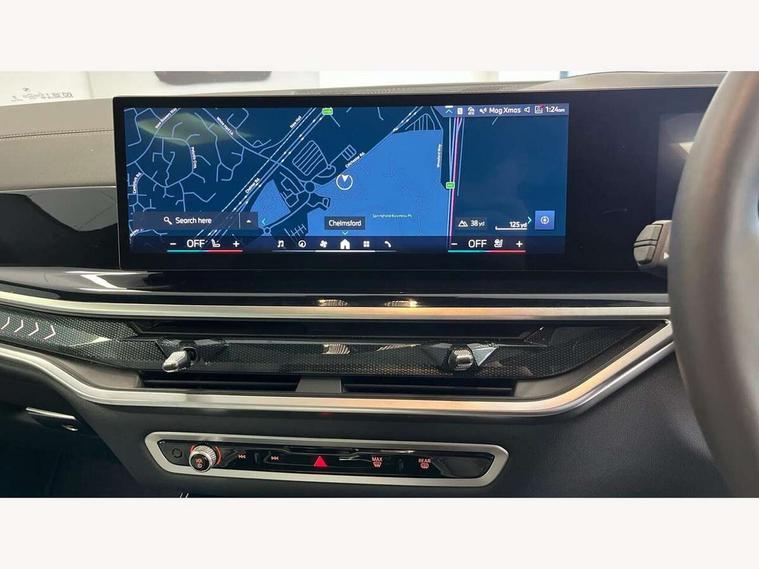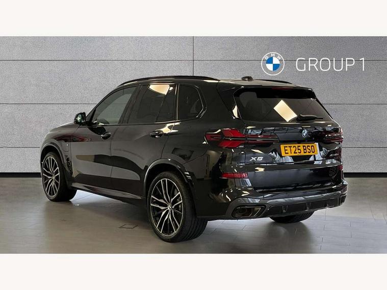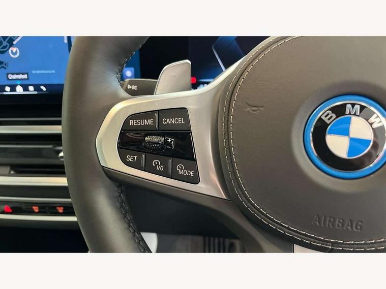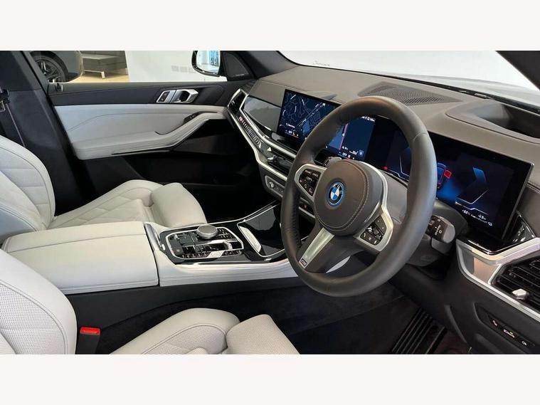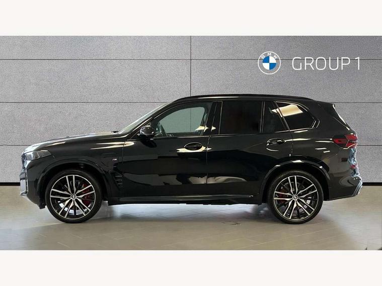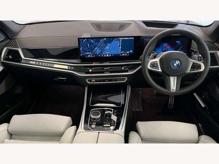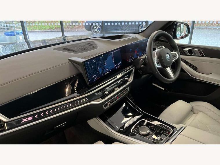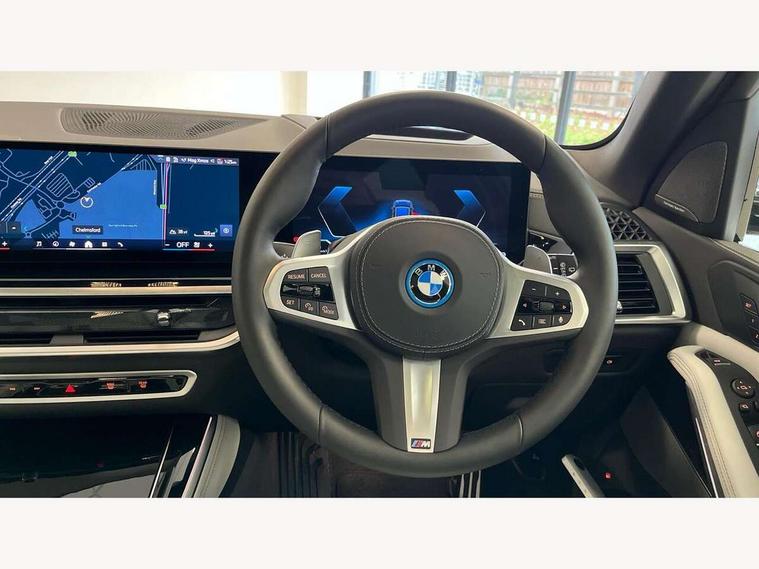 Attentiveness assist, Automatic tailgate operation, BMW ConnectedDrive online services, BMW live cockpit + with curved 12.3 instrument cluster/14.9 central display, nav/Tuner with diversity reception, RDS/4GLTE/remote software upgrade, BMW Teleservices, Condition based service, Cruise control with brake assist, eCall emergency call system, Enhanced bluetooth with wireless charging, Integrated owner's handbook, PAS, Speed limiter, Wi-Fi hotspot, AC Fast charging preparation (Maximum charging power 11kW), Adaptive 2-axle Front and rear air suspension, Drive performance control with ECO PRO comfort + sport mode, Eight speed steptronic sport automatic transmission and gearshift paddles on the steering wheel, Adaptive LED Headlights, Front and rear electric windows, High beam assistant, High gloss black shadow line roof rails, LED daytime running lights, Rain sensor, Rear side wing doors, Third brake light in rear spoiler, Variable intermittent rear wash/wipe, 12V - Power sockets with 2x centre console and 1x luggage compartment, 3 seat bench in 2nd row, Foldable rear centre armrest with 2 cupholders and storage compartment, Front and rear side armrest integrated into door trim, Headrests for all seats, Luggage compartment separating net, Lumbar support with height and depth adjustment in backrest, Single front passenger seat, Three spoke sport M leather steering wheel, Velour floormats, Ambient light interior pack - X5, Driving assistant pack with radar based driver assistance system - X5, Expanded exterior mirror pack - X5/X5 M, M aerodynamics pack - X5, Parking assistant pack - X5, 3 rear seatbelts, Acoustic protection for pedestrians, Active protection, Airbags - driver/front passenger, rear and side, first and second row seats head airbags, front passenger seat airbag deactivation + knee airbag, Anti-lock braking system (ABS), Automatic Stability Control (ASC), Brake energy regeneration, Cornering brake control (CBC), Crash sensor activating central locking release, hazard warning lights, fuel cut off, interior lighting + activation of safety battery terminal clamp, DSC - Dynamic Stability Control, Dynamic Traction Control - DTC, Electromechanical parking brake with automatic drive away release and auto hold function, Electronic brake force distribution, Hill start assistant, M Sport blue painted brake calipers with 'M' designation, Mechanical child proof lock on rear doors, Tyre pressure monitoring system, Tyre pressure sensors, Ventilated front and rear disc brakes, Warning triangle and first aid kit, Alarm system, Closing system with central locking, Comfort access system, Locking wheel bolts,