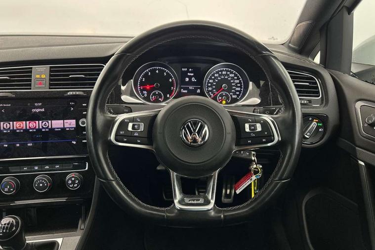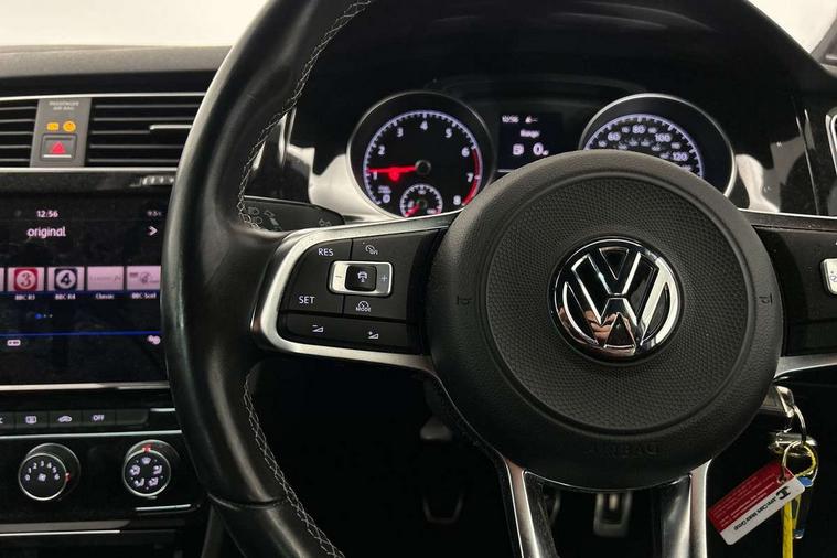'Lights On' Reminder warning buzzer, 8" touch screen, Adaptive Cruise Control with pedestrian detection and speed limiter, App-Connect, Bluetooth hands free telephone connection, Brake pad wear indicator warning light, Driver alert system, Driver profile selection, Exterior temperature gauge, Front assistant collision mitigation, Instrument cluster in white, Multifunction computer, PAS - speed related, Rev counter, Trip and service interval display, Ultrasonic front and rear optical and audible parking sensors, Warning buzzer and light for front seatbelts unfastened, Lowered sports suspension, XDS electronic differential lock, CD/MP3/WMA, USB and SD card reader, aux-in, Composition media system, DAB Digital radio, Auto dimming rear view mirror, Automatic coming/leaving home lighting function, Automatic headlights, Black front air intake and radiator grille with chrome insert, Black sports rear diffuser, Body colour bumpers, Body colour door handles, Body colour door mirrors, Body colour rear roof spoiler, Chrome grille surround, Chrome trapezoidal exhaust, Electric front windows, Electric rear windows, Electrically adjustable and heated door mirrors, Heat insulated tinted glass 65% light absorbing from B pillar back, Heated rear windscreen, LED daytime running lights, LED rear lights, Rain sensor, Rear windscreen washer and wiper with interval delay, Stainless steel door sill protection, 12V socket in luggage compartment, 3 rear headrests, 3 spoke steering wheel, 60/40 split folding rear seat, Bag hook in luggage compartment, Black headlining, Boot lashing points, Cooled glovebox, Courtesy light delay, Cover for storage compartment in centre, Dust/pollen filter, Front + rear carpet mats, Front centre armrest with storage box and rear air vents, Front passenger seat height adjust, Front reading lights, Front seat back storage pockets, Grab handles, Height/reach adjust steering wheel, Illuminated vanity mirrors, Isofix preparation for 2 rear child seats, Leather gear knob and handbrake grip, Load through provision with rear centre armrest and cupholders x2, Luggage compartment cover, Luggage compartment lighting, Multifunction leather steering wheel with grey stitching leather trimmed gear knob including paddle shift, Overhead storage box, Stainless steel pedals, Storage box in luggage compartment, Storage compartments in doors, Sun visors, Variable boot floor, height adjustable and removable, Ambient lighting pack - Golf, Mirror pack - Golf, 3 point height adj front seatbelts + pretensioners, 3 rear 3 point seatbelts, ABS, Automatic post collision braking, Child locks on rear doors, Driver/Front Passenger airbags, Driver/Passenger whiplash optimised head restraints, Drivers knee airbag, Electronic parking brake with auto hold, ESP with EDL + ASR, Front and rear curtain airbags, Front passenger airbag deactivation, Front side airbags, Pre crash system, Tyre pressure monitor, Alarm with interior protection, Electronic engine immobiliser, Remote central locking with 2 remote folding keys, Chrome-plated light switch surround, Dark Diamond decorative inserts in dash and door panels, Piano black centre console with aluminium inlay, Steel space saver spare wheel,