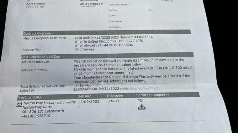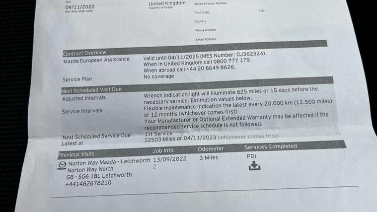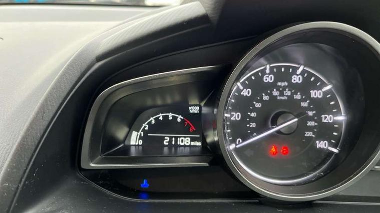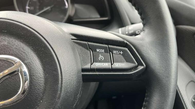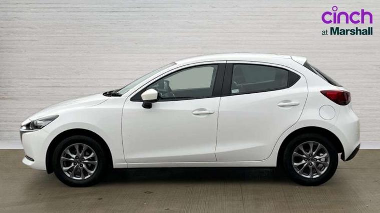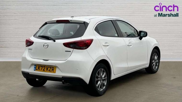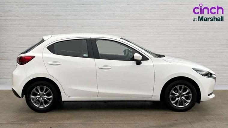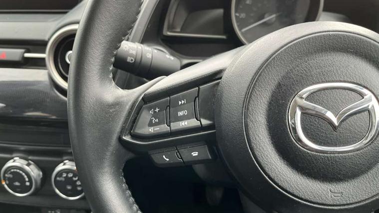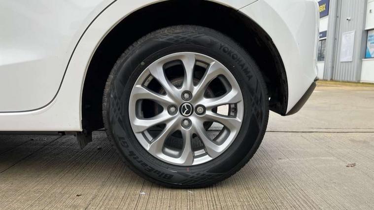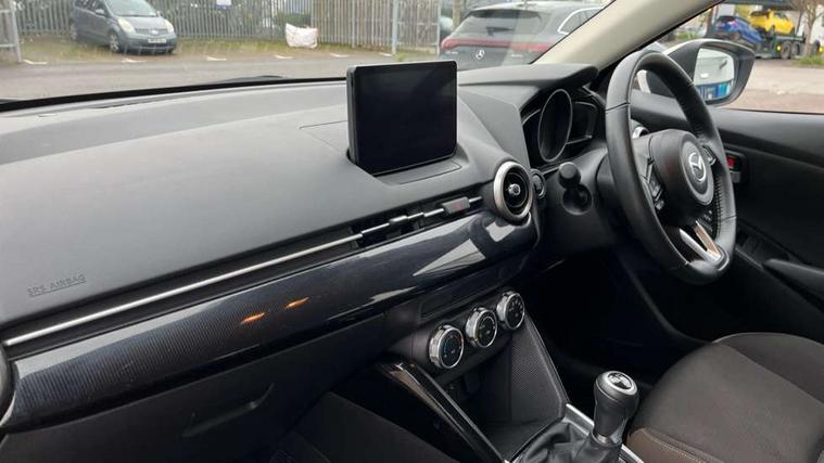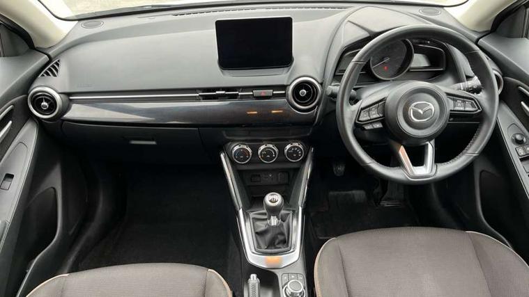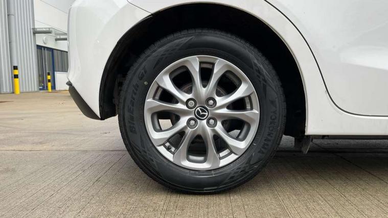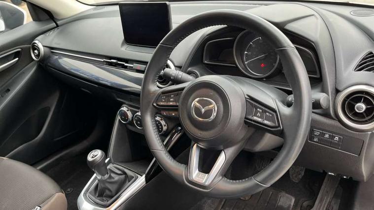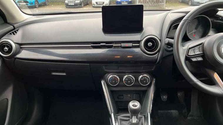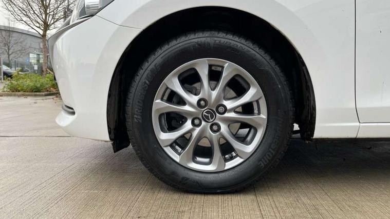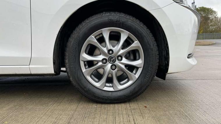 Adjustable speed limiter, Analogue speed display meter, Apple car play/Android Auto, Cruise control, Digital instrument cluster, Digital rev counter, E-call, Emergency stop signalling system, Engine start/stop button, Integrated bluetooth, Lane departure warning system, Lane keep assist, Mazda connect with 8" colour touch screen, Navigation system, PAS, Rear parking sensor, Service indicator, Trip computer, i-stop, AM/FM/DAB radio with 6 speakers with USB and AUX inputs, Multimedia Commander including separate volume dial, Steering wheel mounted audio/bluetooth controls, Auto dimming rear view mirror, Auto headlight levelling, Body colour door mirrors, Body coloured front bumper with black lower bezel, Body coloured rear bumper with black lower mouldings, Chrome finish signature wing on front grille, Coming/leaving home lighting function, Dusk sensing headlights, Electric adjustable/heated/folding door mirrors, Electric front/rear windows with one touch auto up/down for driver's window, Halogen daytime running lights, LED Headlights, LED indicator lights, LED third brake light, Rain sensing front wipers with adjustable sensitivity and speed, Rear side wing doors, Rear wiper, Satin black front grille, 3 seat bench in 2nd row, 60/40 split rear seats, Climate control air conditioning, Cloth upholstery, Driver, Front passenger and two rear grab handles with coathooks, Drivers seat manual slide recline and height adjustment, Drivers/front passengers covered vanity mirrors and drivers ticket holder, Folding rear seats, Front centre storage with two cupholders, Front head restraints, Front passenger and driver door pockets, Front passenger seat manual slide, recline and height adjust, Front passenger seatback pockets, Gear shift indicator, Glovebox, Interior courtesy light with integrated spotlight, ISOFIX child seat anchorage points attached on outer rear seats, Leather handbrake, Leather steering wheel and gear knob, Luggage compartment light, Satin silver dials, Single front passenger seat, Three height adjustable rear head restraints, Tilt/telescopic adjustable steering wheel, 2x3 point front seatbelts with pre-tensioners, 3 point seatbelts on all rear seats, Anti-lock braking system (ABS), Autonomous emergency braking, Collision mitigation braking system, Dynamic stability control + Traction control, ESP, Front and rear curtain airbags, Front driver, passenger and rear seat seatbelt warning, Front dual stage driver and single stage front passenger airbags, Front side airbags, Front smart city brake support, G-Vectoring control plus, Hill launch assist, Manual child lock in rear doors, Passenger airbag cut-off switch, Tyre pressure monitoring system, Deadlocking system, Immobiliser, Power door locks, Remote central locking, Thatcham accredited alarm and immobiliser, Black dashboard, 15" Silver alloy wheels, Emergency tyre repair kit,