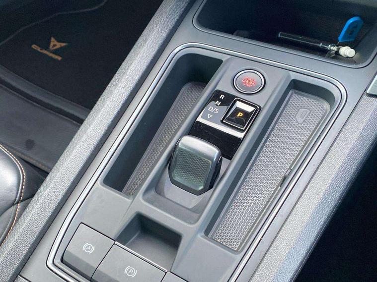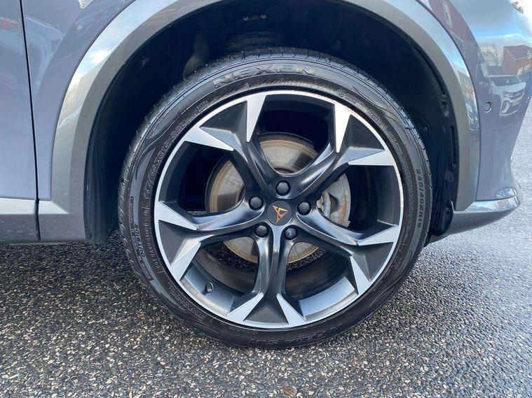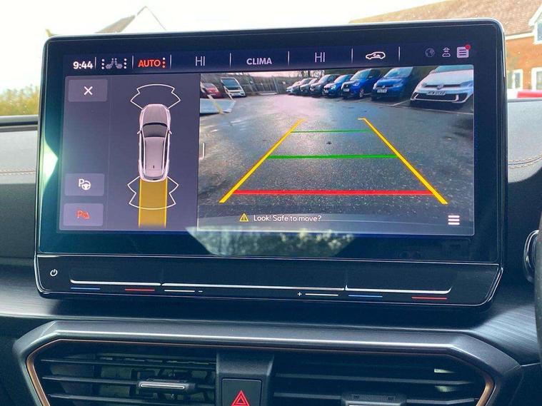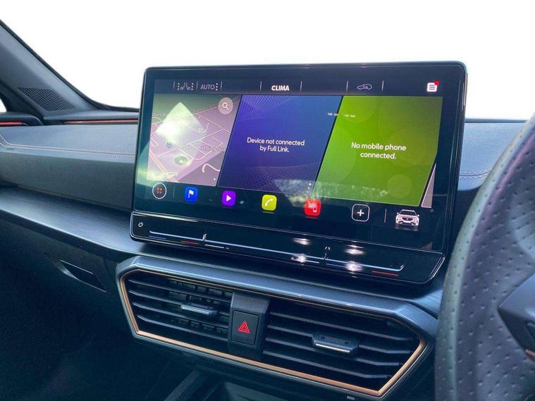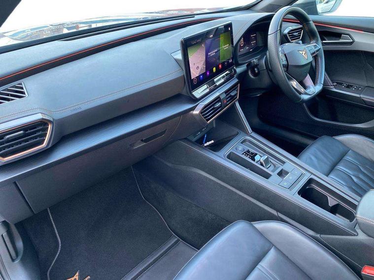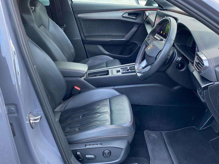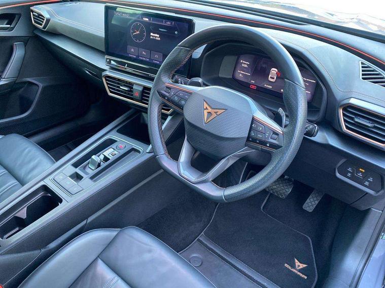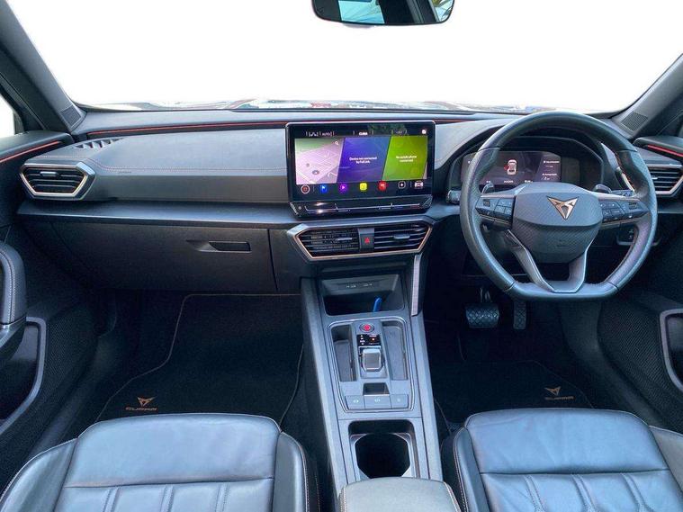 Digital cockpit and configurable dashboard, Driver alert system, Driving profile selection, Forward collision warning with automatic braking, Lane assist, Navigation system with 12'' Touchscreen Display, Park assist (inc front/rear parking sensors), PAS, Predictive adaptive cruise control with speed limiter, Rear view camera, RPM, trip computer, outside temp gauge, instrument light brightness, low fuel warning light, lights on reminder, gearshift indicator, Service interval indicator, Start/stop system with regenerative braking, Voice control system, Wireless apple carplay, Wireless phone charger, Electronic locking differential and dynamic traction support, Standard suspension, 2 front and 2 rear USB type C sockets, Auxiliary input socket, DAB radio, Auto dimming rear view mirror, Body colour door handles, Body coloured bumpers, Dark grey wing mirror, Daytime running light with automatic headlight control and coming home feature, Dynamic headlight range control, Electric front/rear windows, Electrically adjustable heated and folding door mirrors with memory function, Front fog lamps with cornering function, Gloss black roof rails and window surrounds, LED Headlights, LED Taillights with dynamic indicator, Rain sensing wipers, Rear diffuser with black simulated exhaust pipes, Rear side wing doors, Rear wash/wipe, Third brake light, Tinted rear windows, Welcome lights, 12v power supply in centre console, 12V socket, 12v socket in loadspace, 2 front and 2 rear reading lights, 230V socket, 3 seat bench in 2nd row, 60/40 split rear bench seat with armrest and mechanical seat release, Black headlining, Dust/pollen filter, Front and rear head restraints, Front centre armrest, Height/reach adjust steering wheel, Illuminated interior front door sills, Illuminated sunvisor with mirror, Isofix, Leather multi function heated steering wheel with gear shift paddles, Luggage tie-down hooks, Single front passenger seat, Three zone climate control with control panel in rear, Variable luggage/load compartment floor, Wraparound lighting, Genuine Nappa leather Pack - Cupra, 3 point seatbelts on all rear seats, ABS, Brake control system - ESC and brake booster, Child proof door locks, Driver and front passenger airbags with front passenger airbag de-activation, Electronic parking brake, Front and rear disc brakes, Front side curtain airbags, Hill hold control, Public e-call, Seat belt reminder for front and rear seats, Tyre pressure monitoring system, Anti theft alarm system, Keyless entry and start system (KESSY), Locking wheel bolts, Copper and aluminium interior detailing, 19" 'Exclusive' machined sport matte black and silver alloy wheels,