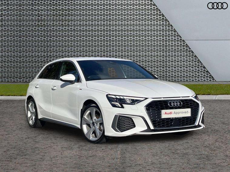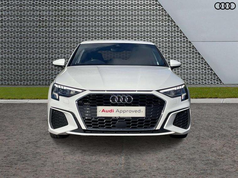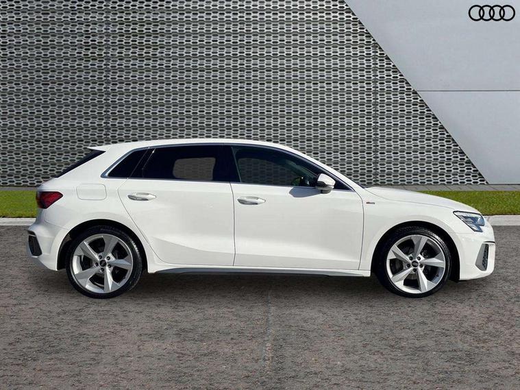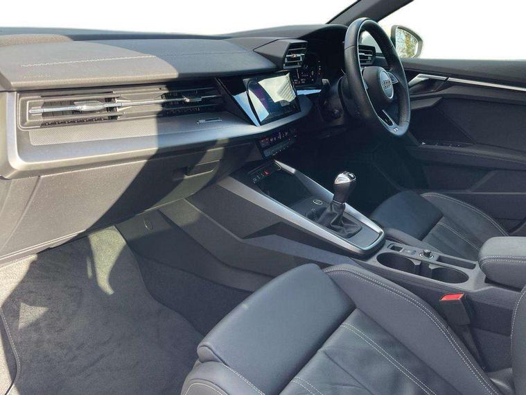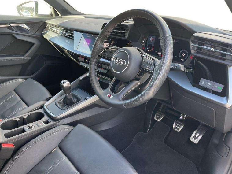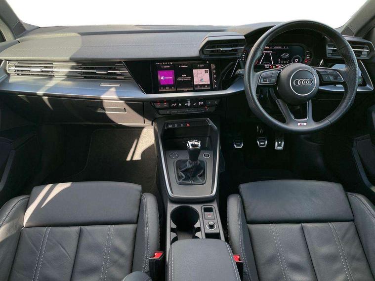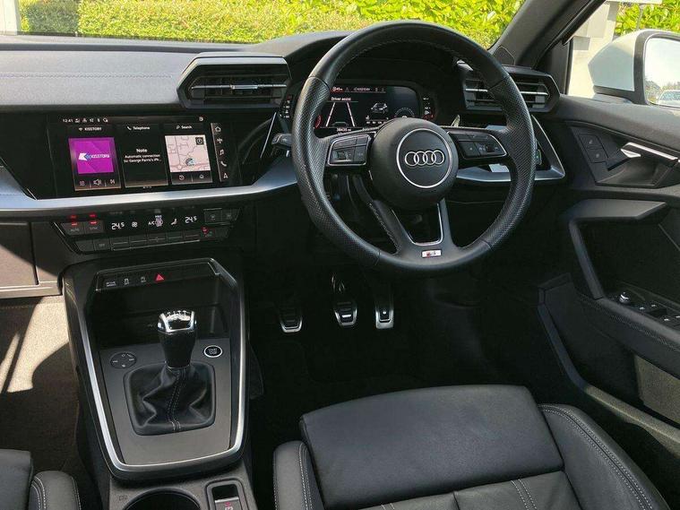 Audi drive select (Auto, Comfort, Dynamic, Efficiency and Individual), Audi smartphone interface, Audi Virtual Cockpit - 10.25" digital and colour instrument cluster, Automatic start/stop system with recuperation, Bluetooth interface, Collision avoidance assistant, Cruise control, e-Call (emergency call), Electromechanical power speed sensitive steering, Lane departure warning system, MMI Navigation Plus with high resolution 10.1" colour touch screen display, Rear parking sensors, Service indicator, Trip computer, Voice control system with natural language interaction, 2xUSB-C connection with data and charging functions, 6 passive loudspeakers, DAB Digital radio, 3rd brake light, Acoustic glass windscreen, Aluminium window trim, Auto dimming frameless rear view mirror, Electrically adjustable/heated/folding/auto dimming door mirrors with integrated LED indications + kerb view function for passenger side, Front electric windows, Illuminated aluminium inserts front door sills with S logo, LED daytime running lights, LED headlights with LED rear lights and dynamic rear indicators, Light and rain sensors, Privacy glass - dark tinted rear window, rear door and side windows, Rear electric windows, Rear side air outlets in grained matt black, Rear side wing doors, Rear wiper, S line bumpers, S roof spoiler, 12V socket and storage compartment in front centre console, 3 seat bench in 2nd row, 40/20/40 split folding rear seat bench with cupholder, Black cloth headlining, Dual zone electronic climate control, Front and rear centre armrest in leather, Front and rear headrests, Front/rear floor mats, Height and reach adjustable steering wheel, Illuminated vanity mirror, Interior lighting - glove compartment light and right hand side, Luggage compartment floor covering, Manual boot compartment lid, Manually adjustable front seats, Seat side bolsters, Single front passenger seat, Stainless steel pedals and front footrest in black, Twin leather upholstery with front sports seats S embossed logo, Aluminium interior elements pack - A3 Sportback, S line styling pack - A3 Sportback, 3x3 point rear seat belts, Audi pre sense front, Driver and front passenger airbag with passenger airbag deactivation, Electronic Stabilisation Control (ESC) including ABS, ASR and EDL, First aid kit with warning triangle and 2 safety vests, Front side airbags with head airbags and interaction airbag, Pre-sense front with pedestrian and cyclist detection, Seatbelt monitoring, Tyre pressure loss indicator, Anti theft alarm, Anti-theft wheel bolts, Immobiliser, Manual child locks, Remote control central locking, Accent surfaces in the dashboard and centre console in platinum grey silk effect paint finish, Dark spectrum aluminium inlays,