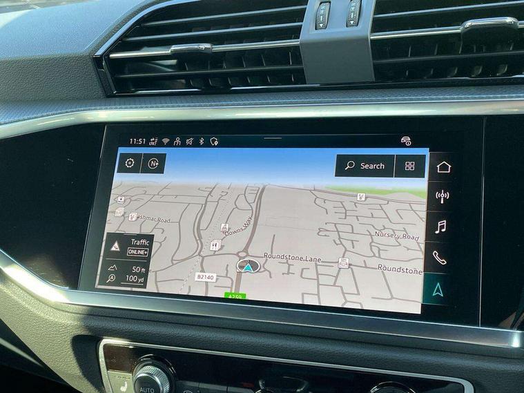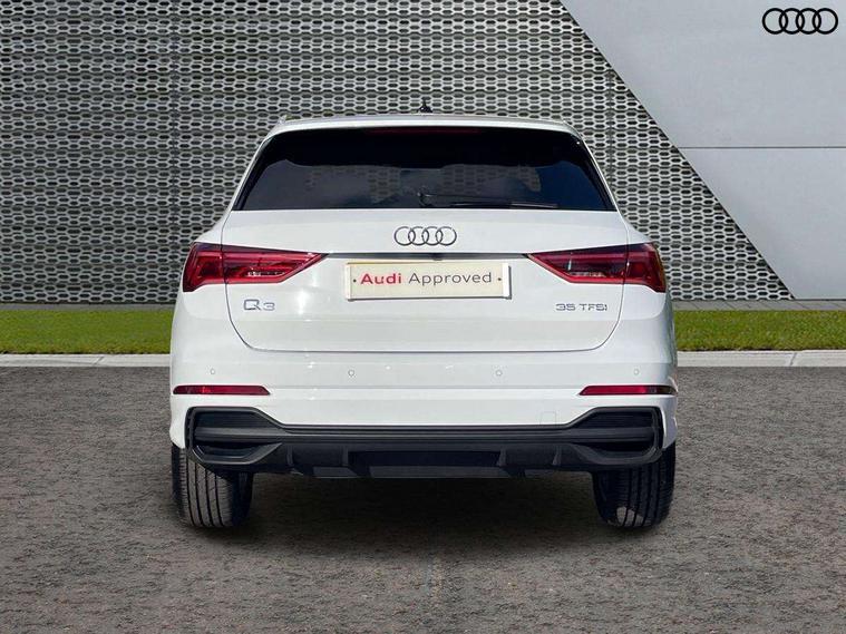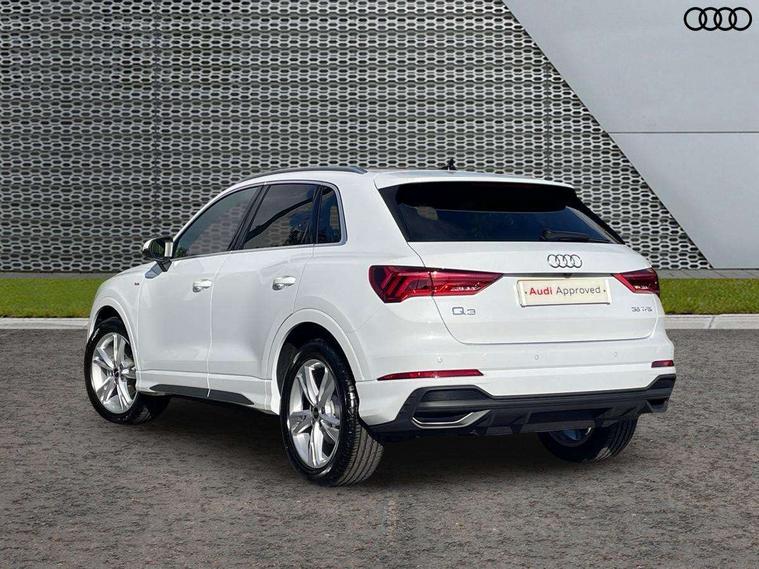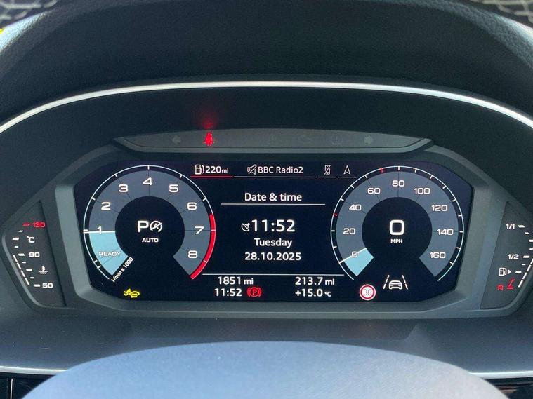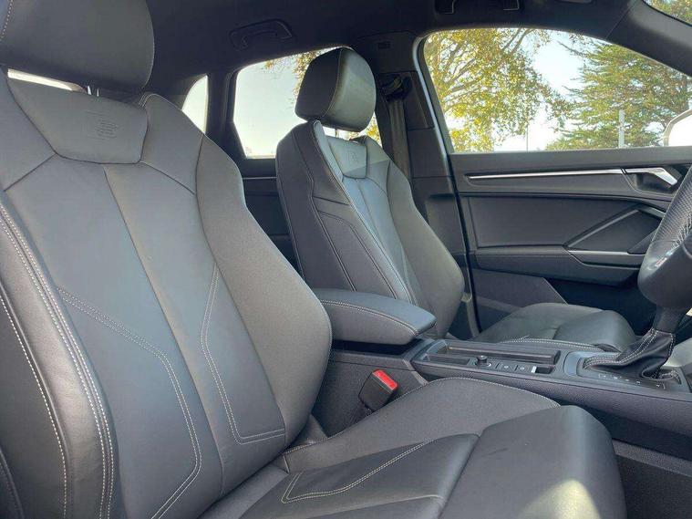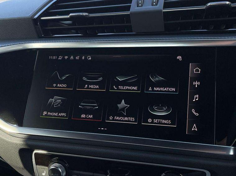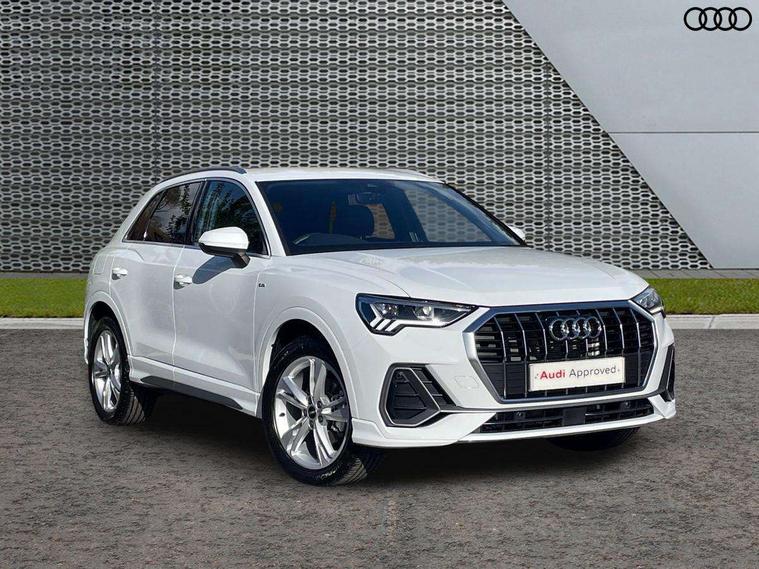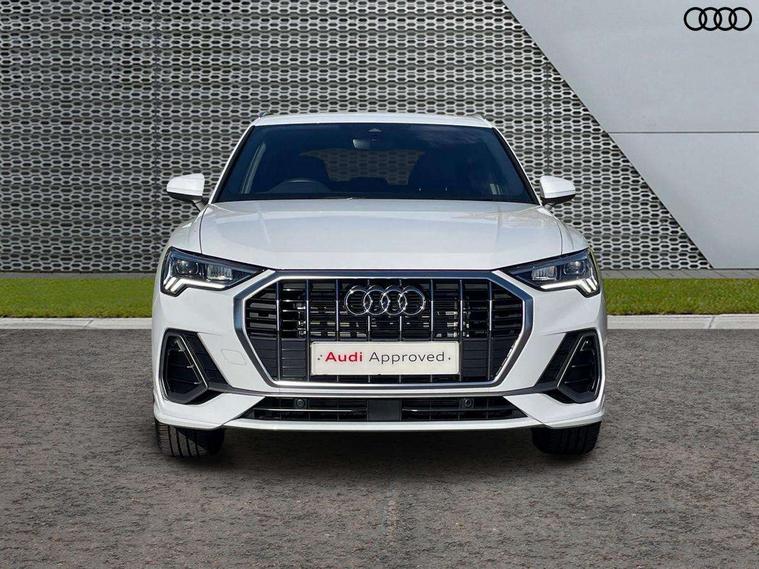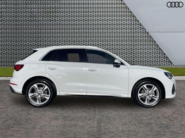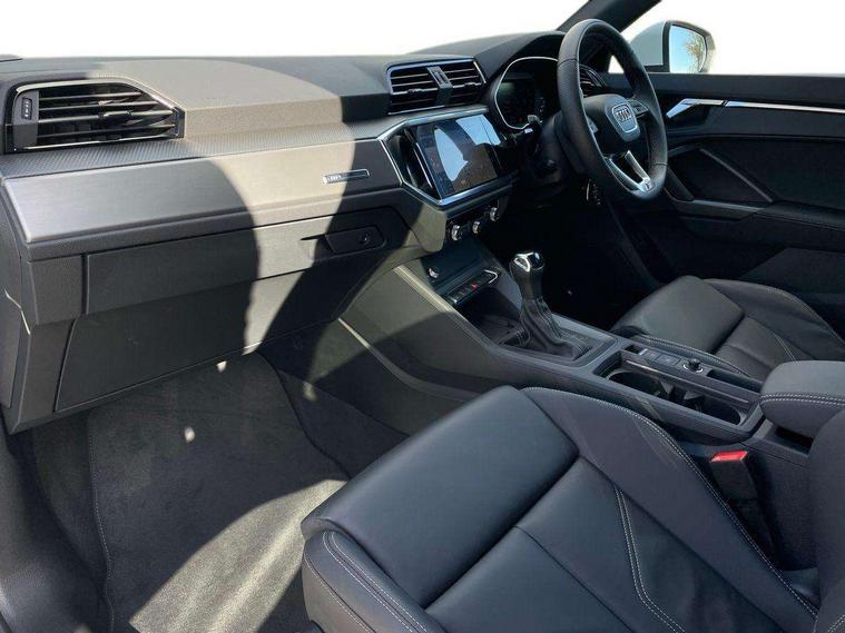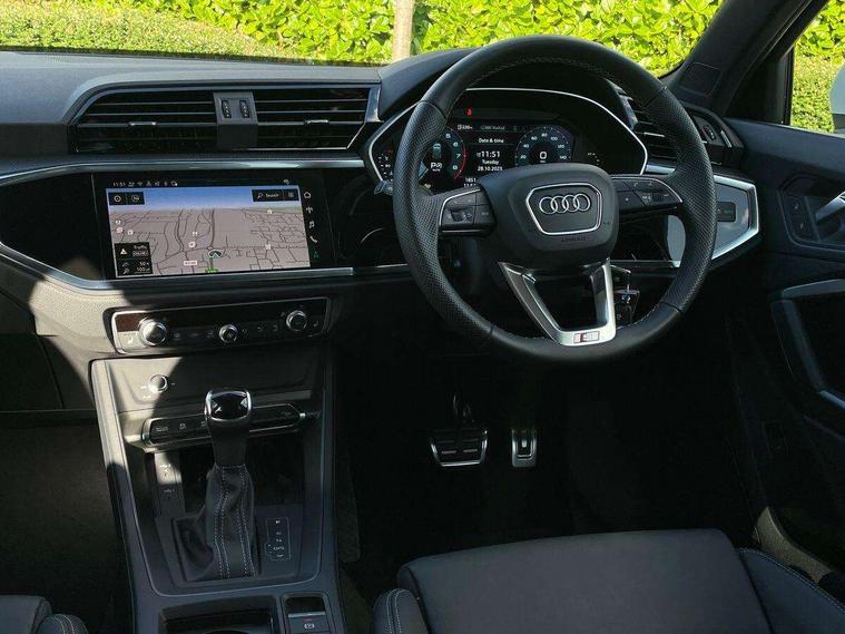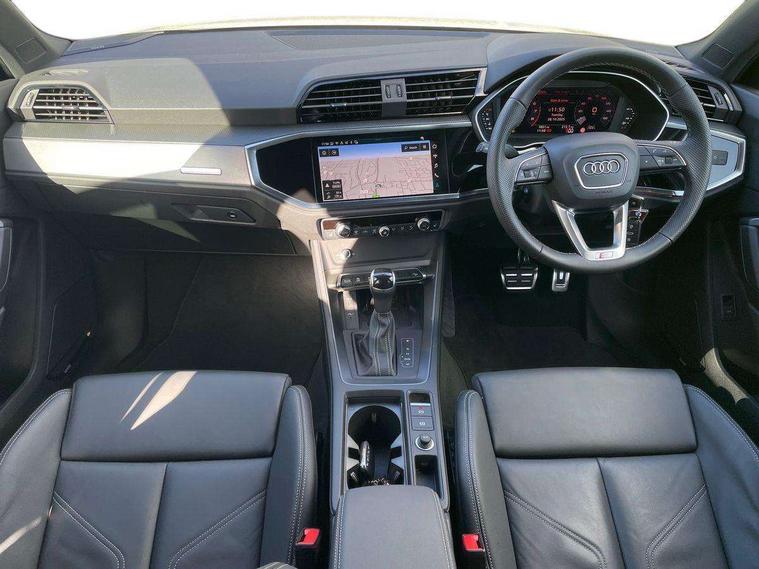 Amazon alexa Integration, Audi connect safety and service, Audi drive select, Audi lane departure warning, Audi Virtual Cockpit - 10.25" display, Bluetooth interface, Camera based traffic sign recognition, Distraction and Fatigue warning, Legal emergency call, MMI Navigation Plus with high resolution 10.1 inch touchscreen colour display, Power operated tailgate, Progressive steering, Service interval indicator, Smartphone interface includes wireless Apple carplay/Android Auto, Start stop system with recuperation, Voice control system with natural language interaction, Sports suspension, 2 USB-C ports with charge and data functions, 6 passive loudspeakers, DAB digital radio module, Acoustic windscreen, Aluminium roof rails, Aluminium window trim, Anthracite black radiator grille, Auto dimming door mirrors, Auto dimming frameless rear view mirror, Body colour front spoiler blade, Electrically folding, adjustable and heated door mirrors with integrated LED side indicators and kerb view function for passenger side, Front and rear electric windows, Front fog lights, Front side air inlets in matt platinum grey, Grille vertical bars in aluminium silver/Matt, High gloss black finish B and C pillars, LED Dynamic rear indicators, LED headlights with LED daytime running lights, LED rear lights, LED third brake light, Privacy glass dark tinted rear and rear-side windows (from B-pillar backwards), Rain and light sensors, Rear diffuser grille in grained matt black, Rear diffuser strip in matt anthracite black, Rear side wing doors, Rear wiper, S line badges on front wings, S Line front and rear bumpers and side skirts, Side skirt insert in matt Platinium grey, Variable front intermittent wipers, 12V socket in rear centre console, 3 seat bench in 2nd row, 3 spoke leather multifunction steering wheel features S badging and grips in perforated leather with contrast stitching, 40:20:40 folding with manual adjustment for 60:40 forwards/backwards position and backrest angle, Adjustable rear seat bench/backrest with centre armrest and cupholder, Black carpet mats, Black cloth headlining, Dual zone electronic climate control, Electric lumbar support, Front and rear black floor mats with contrast stitching in rock grey, Front and rear headrests, Front centre armrest, Height and reach adjustable steering wheel, Horizontal trim strip in matt platinum grey, Illuminated door sill trims with S logo, ISOFIX child seat mounting for front passenger with airbag deactivation and outer rear seat including top tether attachment point for outer rear seats, Luggage compartment sill protection in stainless steel, Manual front seats with height adjustment, Perforated leather gearknob, Single front passenger seat, Stainless steel pedals, Twin leather upholstery with front sport seats + S embossing, Non smoking pack - Q3, 3x3 point rear seatbelts, 6 airbags - Driver, front passenger, curtain and side windows, Audi pre-sense front with pedestrain and cyclist recognition, Electrically operated child locks on rear doors, Electromechanical parking brake, Electronic stabilisation control including ABS, ASR and EDL, Front seatbelt reminder, Hill descent control, Hill hold assist, Pre sense basic, Seatbelt monitoring, Tyre pressure warning, Warning triangle and first aid kit, Anti theft wheel bolts, Immobiliser, Remote central locking, Thatcham approved category 1 anti theft alarm, Aluminium look interior elements, Dark matt brushed aluminium inlay, Detail dashboard around MMI touch colour display in glass look, black with surround in aluminium look, Leatherette door armrest,