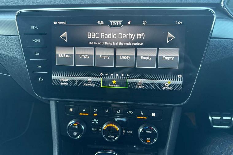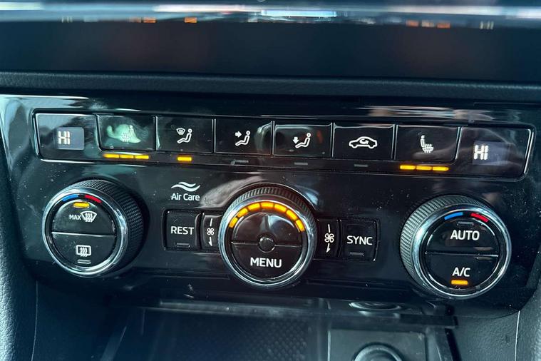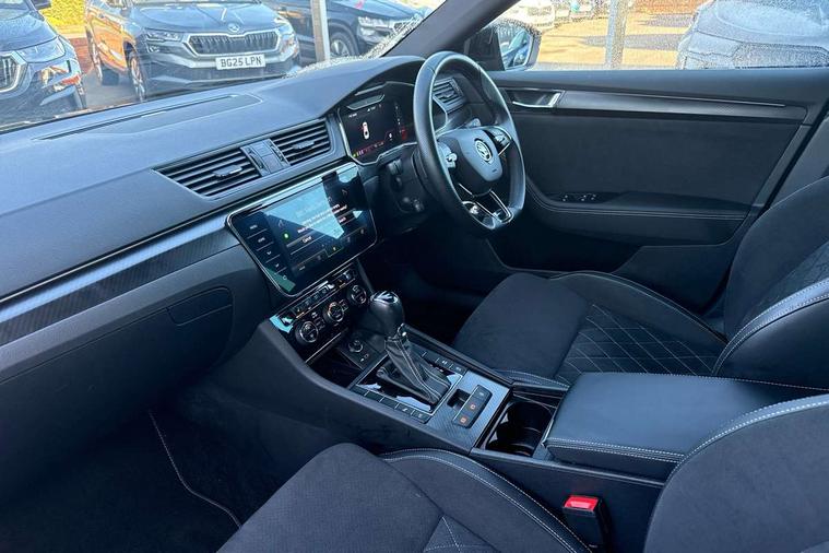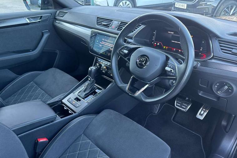 Bluetooth system, CareConnect and Emergency Call, Columbus HDD satellite 3D map navigation with 9.2" colour touch screen, web radio, integrated Wi-Fi, Driver fatigue sensor, Front assist with pedestrian protection, Progressive dynamic steering, Stop/start engine system and energy recovery, Virtual cockpit, Voice control system, Wireless smartlink apple carplay, SmartLink+ android auto, XDS+, 2 USB ports, Bolero radio with 8" touchscreen display, DAB Digital radio, 3rd brake light, Aero front windscreen wipers with intermittent function, Auto dimming rear view mirror, Black rear badge, Body colour door handles, Cornering front fog lights, Electrically adjustable heated and folding door mirrors with memory function, Front and rear electric windows, Full matrix LED headlights with AFS LED DRL integrated with headlight washer LED rear lights(High function), dynamic indicators and lighting animation, Gloss black exterior door mirrors with sports styling including front grill, side strip and window surrounds, Gloss black grille surround with gloss black rib elements, Gloss black rear spoiler (roof), Gloss black strip between rear lights, Light assistant (coming/leaving home/tunnel light), Privacy glass, Rain sensor, Rear exhaust diffuser styling elements, Rear side wing doors, Sportline badging, 12v power point in centre console, 3 seat bench in 2nd row, Black roof headlining, Black textile floor mats, Carbon optic interior elements, Electric auxiliary air heater, Front and rear footwell illumination, Front armrest with storage box, Height adjustable front and rear head restraints, Ice scraper, Illuminated and cooled glovebox, Interior lights with control switches, Isofix child seat fittings on outer rear seats, LED front and rear reading lights, Microsuede/leather upholstery with silver diamond stitching sports seats, One umbrella compartments in driver door with one umbrella in drivers door, Overhead glasses storage compartment, Rear centre armrest with cupholders, Removable parcel shelf, Single front passenger seat, Split folding rear seats, Storage compartment with cover in luggage compartment side panels, Ticket holder on A Pillar, LED package plus - Superb, 3 rear seatbelts, 7 airbags - Front, front side, curtain, driver's knee airbag with front passenger deactivation switch, Driver and passenger seatbelts with warning light, Electronic parking brake, ESC including ABS, EBV, MSR, ASR, EDS, HBA, DSR, RBS, CBC, multi-collision brake (MKB) and Auto hold, Hill start assist, Power operated child lock in rear doors, Tyre pressure monitor, Alarm with interior monitoring tilt sensor and back up horn, Electronic engine immobiliser, Keyless entry and start/stop, Remote central locking with SAFE system, Third remote key,