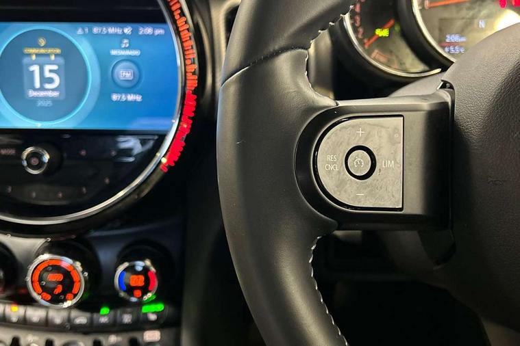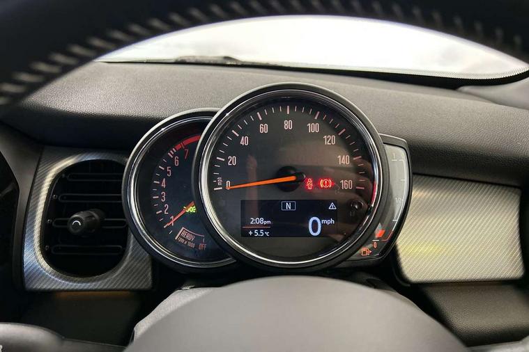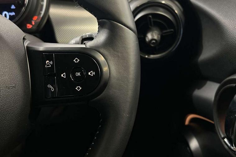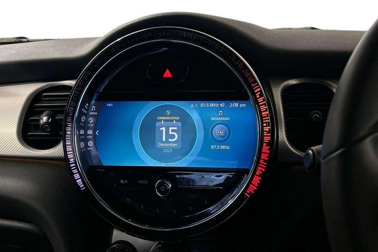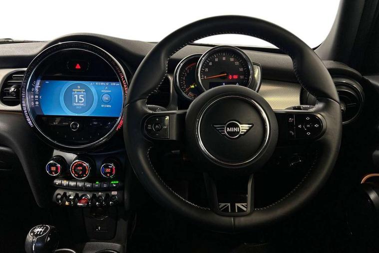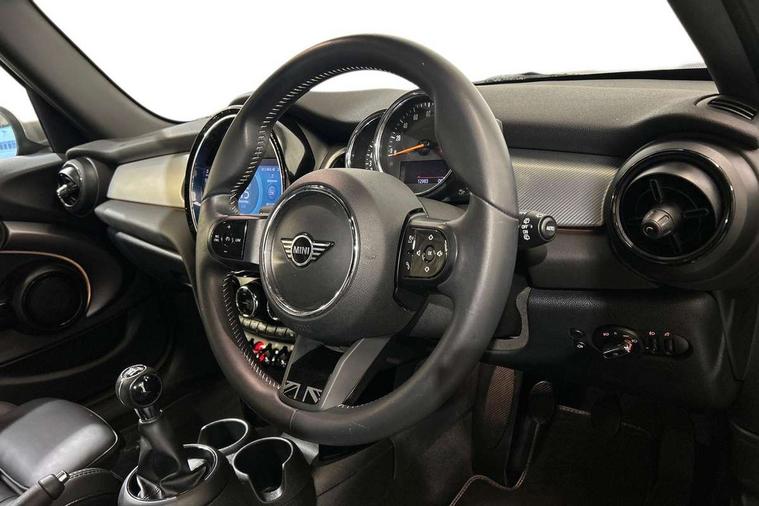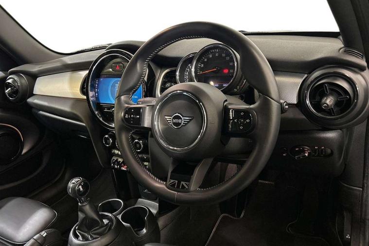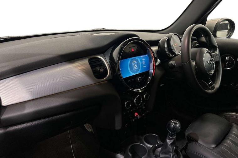 Automatic start/stop function with brake energy recuperation, Compatible mobile phone bluetooth with audio streaming, Cruise control with brake assist, Electro-mechanical speed dependant steering assistance, Flexible car sharing preparation, Instrument cluster, MINI Driving Modes - centre toggle switch to control driving setting (sport, mid and green), Mini E-call, MINI TeleServices, On board computer, Rear park distance control, Service interval indicator, 6 Speed manual transmission including gear change indicator display, Double Vanos system, Fully variable valve control, High precision injection, Performance Control, 6 speakers in front door trims and underneath front seats, 8.8" touchscreen with LED ring, FM tuner and DAB digital radio, Automatic headlight activation switch, Body colour fuel filler cap, Chrome line exterior - radiator grille bars, tailgate handle, lower front grille grating and rear central fog-light, Dynamic brake lights, Electric front+rear windows, Heated rear window, Heated windscreen washer jets, LED headlight with closed ring and daytime driving lights, Metal door sill strips with MINI imprint, Model logo Cooper on right of tailgate, Rain sensor window wipers, Rear fog lights, Rear LED lights with union jack design, Rear window wiper, Side scuttle panel with integrated indicator, Sun/heat protection glass, White indicator lenses, 12V Accessory socket in centre console, 4 lashing eyes in luggage compartment, 60/40 split folding rear seat, Anthracite headliner including grab handles and clothes hooks, Carbon black colour line - Knee roll and door armrest, Chrome interior highlights, Chrome line interior - air vents, gear lever base, door handles and speakers in doors, Cupholders, Front and rear head restraints, Front and rear isofix with front passenger airbag deactivation, Glove compartment, Height and length steering column adjustment, Interior lighting with 12 different colours across the dashboard, underneath door bezel with illuminated laser-engraved design on central display, Leatherette gearshift lever and handbrake gaiters, LED reading lights, vanity mirror lights, front foot well light and spotlight on front seats, Manual air conditioning, Mechanical seat adjustment - forward/back & backrest for front seats and driver seat height adjust, MINI yours badge on exterior pillar, Multifunction steering wheel, Storage compartments in doors, Sunvisors with vanity mirrors, Velour floor mats, Walknappa leather steering wheel with grey seam and MINI Yours badge on Piano Black lower steering wheel spoke, 3 point seatbelts on all five seats, 6 Airbags - front, side, head and seat belt tensioners, Anti-lock braking system (ABS), DSC - Dynamic Stability Control, Front and rear disc brakes, Hill start assist, Single tone fanfare horn, Tyre pressure monitoring system, Alarm system with tilt sensor, monitoring doors, bonnet interior and tailgate, Electronic vehicle immobiliser, Start/stop toggle with keyless go, Tool kit,