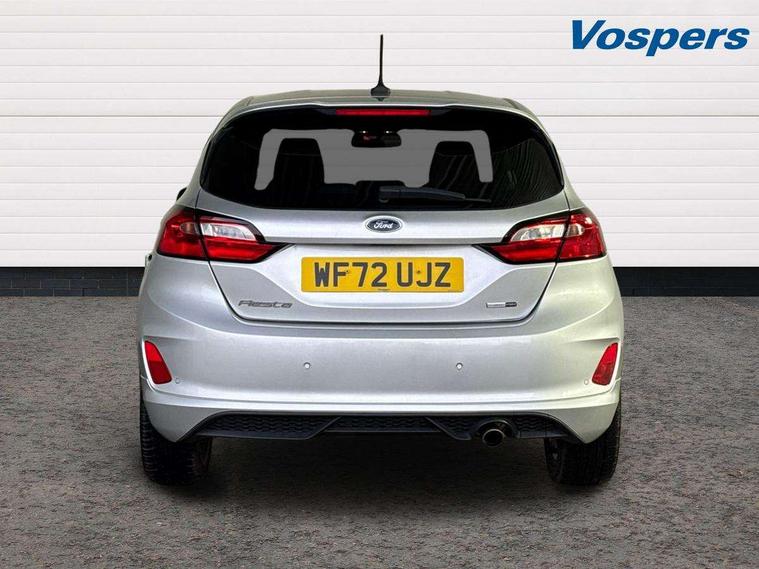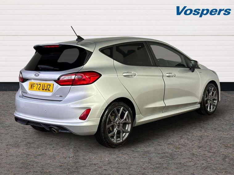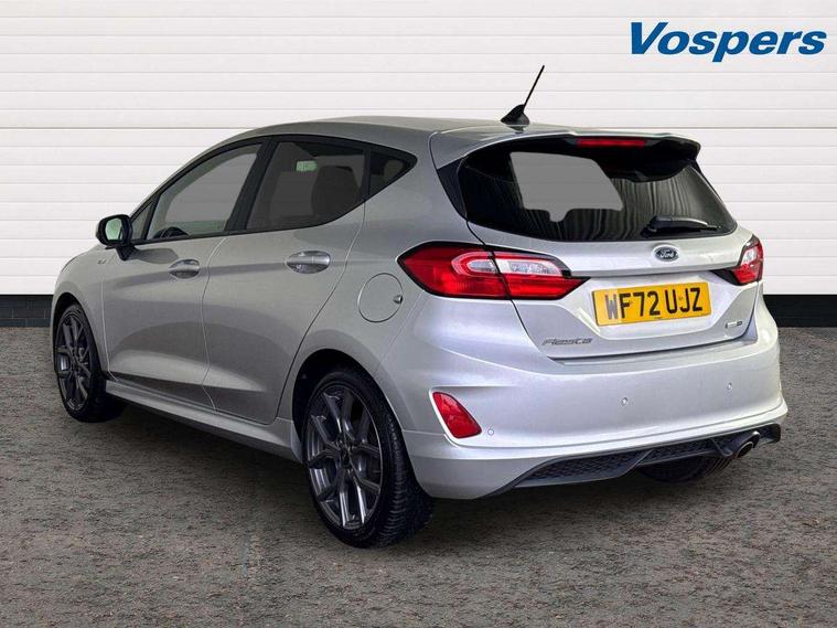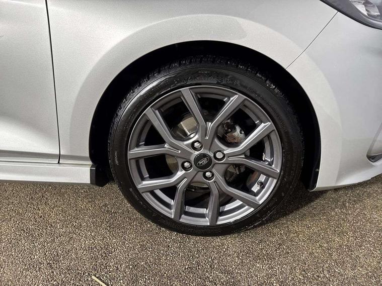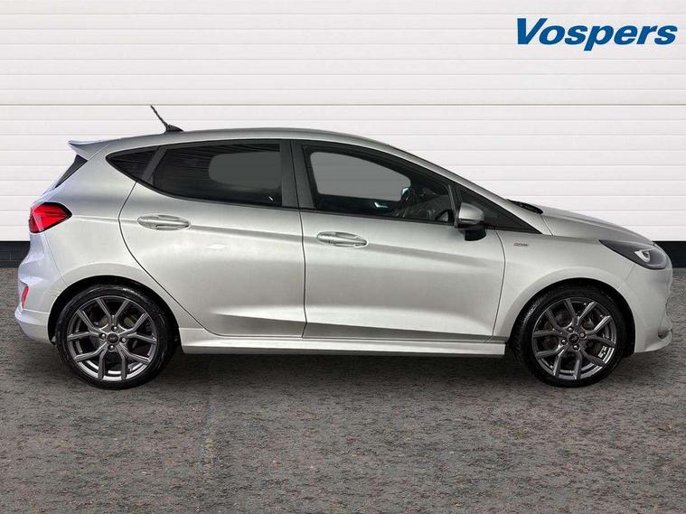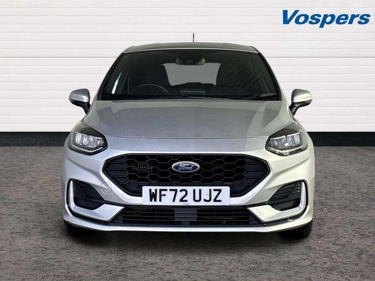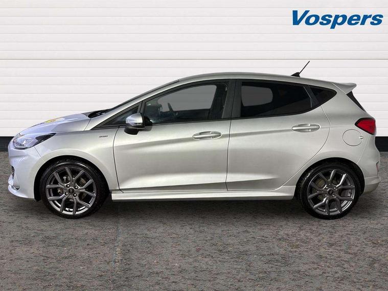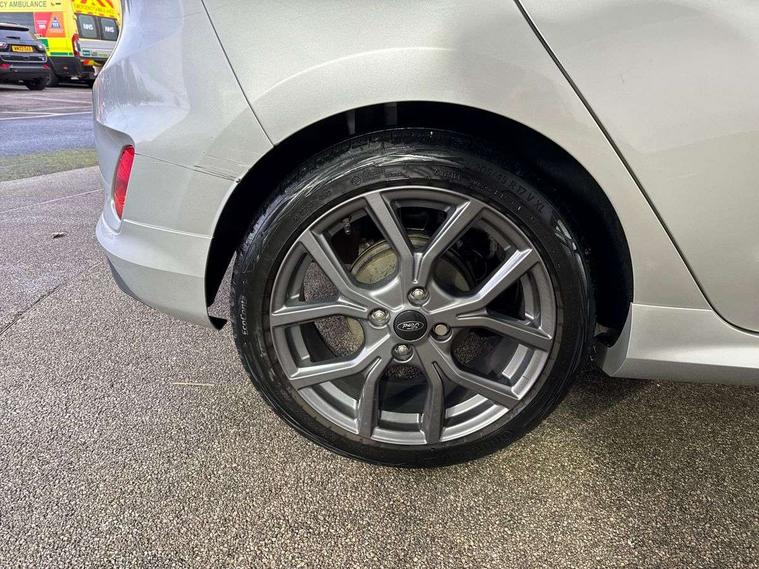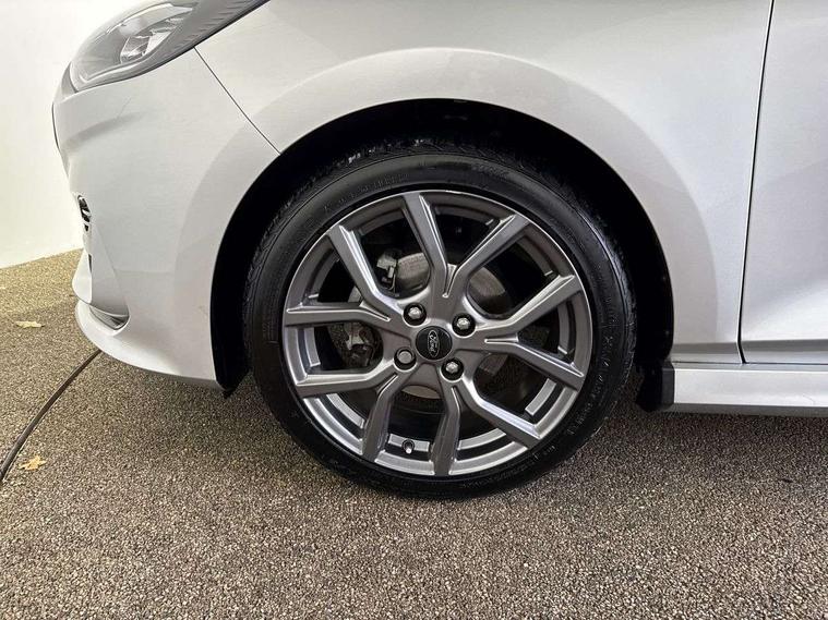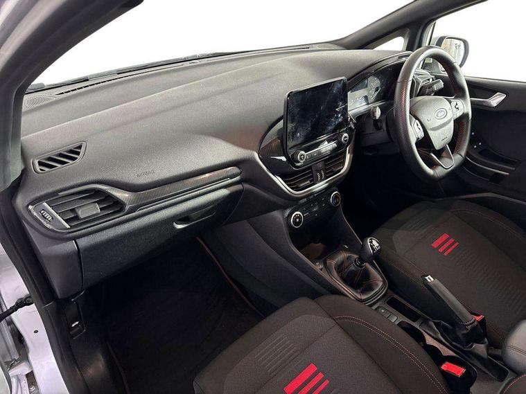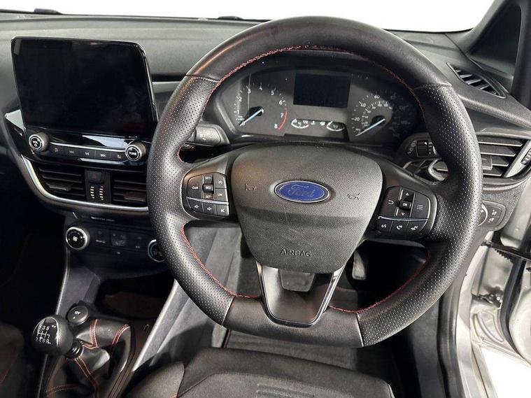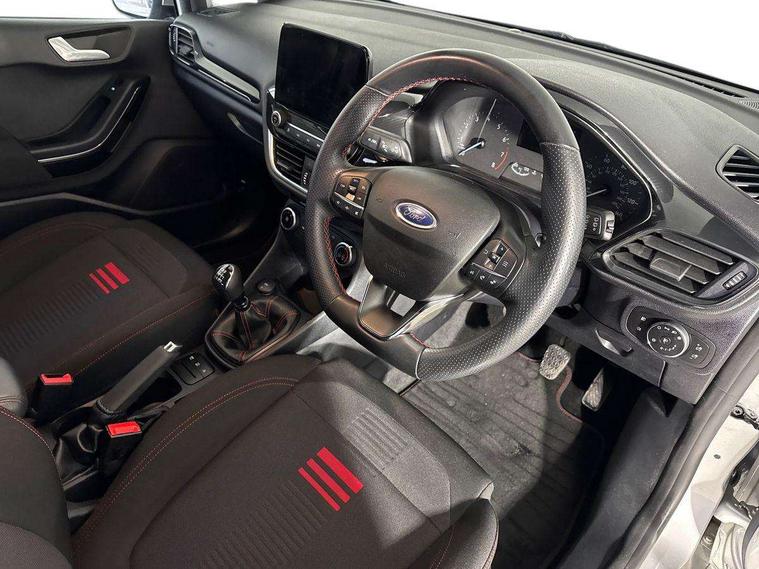 Bluetooth system, Electric power steering, Ford easy fuel, Ford SYNC 3 Navigation system incl 8" touchscreen, 7 speakers, FordPass connect, Apple carplay, android auto, voice control and emergency assistance, Rear parking distance sensors, Selectable drive modes (Normal, Sport, Track), Trip computer, Sports suspension, 2 USB ports, Auxiliary input socket, DAB Digital radio, Steering wheel mounted controls, Body colour bumpers, Body colour door handles, Body colour large rear spoiler, Body coloured electrically operated and heated door mirrors with side indicators, Cornering front fog lights, Electric front windows/one touch facility, Electric rear windows, LED Night signature to rear lights, Quickclear heated windscreen, Rain sensing wipers and auto dimming rear view mirror, Rear privacy glass, Rear wiper, Unique ST-Line upper grille & full bodystyling kit with ST-Line wing badges, 3 spoke flat bottomed leather steering wheel, 60/40 split folding rear seat, Adjustable head restraints, Black headlining, Boot carpet, Centre console with opening armrest, 2x cupholders, 12v and USB, Chrome inner door handles, Cloth upholstery, Footwell illumination, Front floor mats in velour, Front map reading lights, Front seat and rear pockets, Illuminated glovebox, Leather gaiter, Load area light, Manual 2 way passenger seat adjust, Manual 4-way driver seat adjust, Manual air conditioning, Overhead console with sunglasses holder, Pollen filter, Rake/reach adjustable steering wheel, Sensico wrapped steering wheel, Sports front seats, NCAP Pack - Fiesta, 3 point seatbelts on all rear seats, ABS+EBA, Curtain airbags, Driver and passenger airbags, Drivers knee airbag, Electronic stability control with hill start assist, Front passenger airbag deactivation, Front side airbags, Seatbelt warning, Two tone horn, Tyre pressure monitoring system, Keyless start with 'Ford Power' starter button, MyKey system, Remote central locking & engine immobiliser, Thatcham Cat.1 alarm, 17" 5 spoke alloy wheels with rock metallic finish,