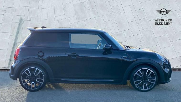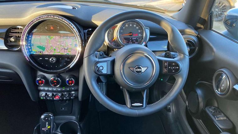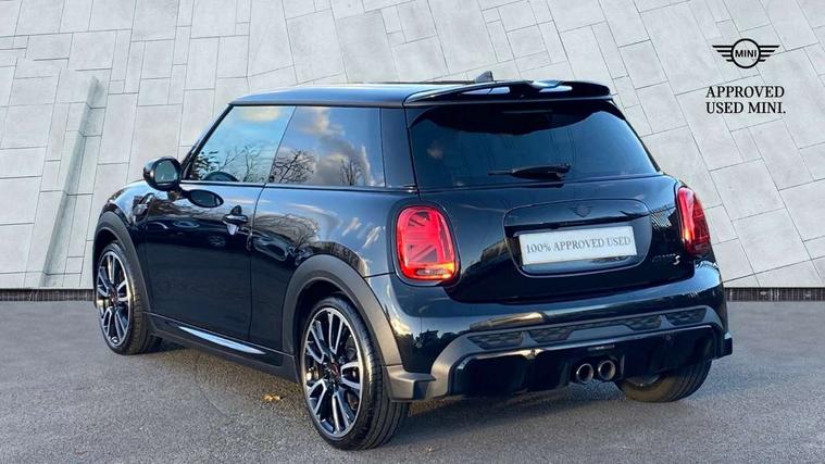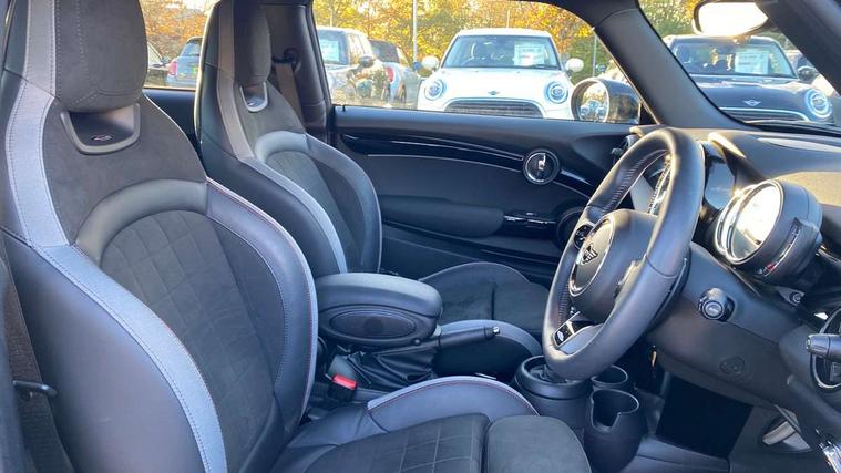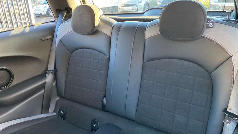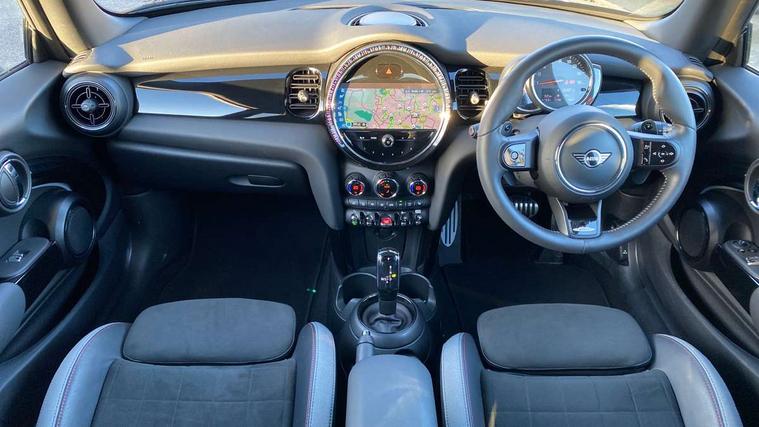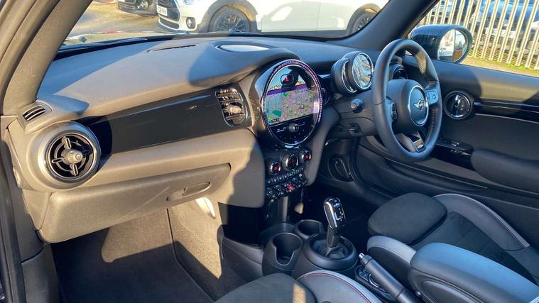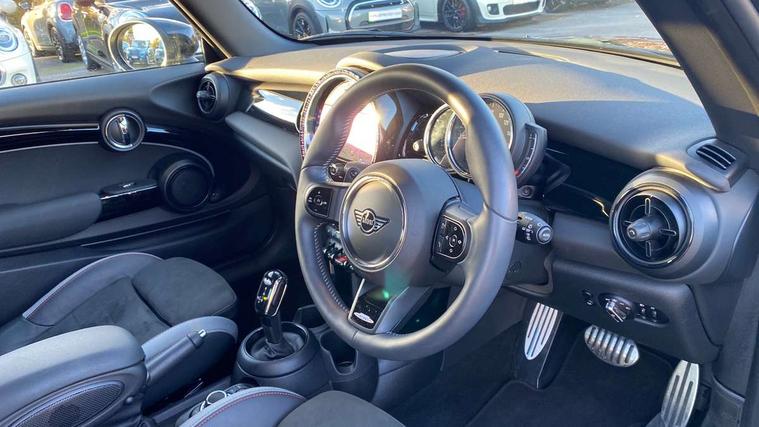 Apple CarPlay, Automatic start/stop function with brake energy recuperation, Compatible mobile phone bluetooth with audio streaming, Cruise control with brake assist, Electro-mechanical speed dependant steering assistance, Flexible car sharing preparation, Instrument cluster, MINI Driving Modes - centre toggle switch to control driving setting (sport, mid and green), Mini E-call, MINI TeleServices, On board computer, Rear park distance control, Service interval indicator, Double Vanos system, Fully variable valve control, High precision injection, Intelligent adaptive suspension, Performance Control, Steptronic sport transmission with double clutch and steering wheel paddles, 8.8" touchscreen with LED ring, FM tuner and DAB digital radio, 3rd brake light, Automatic headlight activation switch, Bonnet scoop, Dynamic brake lights, Electric front windows, Heated rear window, Heated windscreen washer jets, JCW Aerodynamic kit - Front and rear bumpers with sporty JCW styling and part-painted side sills with MINI John Cooper Works door sill finishers, John Cooper Works rear spoiler, LED headlight with closed ring and daytime driving lights, Metal door sill strips with Cooper S, Model logo Cooper S on right of tailgate, Radiator grille chrome border with honeycomb structure including S Badge, Rain sensor window wipers, Rear fog lights, Rear LED lights with union jack design, Rear window wiper, Side scuttle panel with integrated indicator, Sun/heat protection glass, Two central exhaust tailpipes with chrome finisher, White indicator lenses, 12V Accessory socket in centre console, 2 seat bench in 2nd row, 4 lashing eyes in luggage compartment, 60/40 split folding rear seat, Anthracite headliner including grab handles and clothes hooks, Carbon black colour line - Knee roll and door armrest, Chrome interior highlights, Cupholders, Front and rear isofix with front passenger airbag deactivation, Front floor mats in velour, Glove compartment, Height and length steering column adjustment, Interior lighting with 12 different colours across the dashboard, underneath door bezel with illuminated laser-engraved design on central display, JCW Sport seats with integrated headrests, adjustable thigh support and John Cooper Works logo, Leatherette gearshift lever and handbrake gaiters, LED reading lights, vanity mirror lights, front foot well light and spotlight on front seats, Manual air conditioning, Mechanical seat adjustment - forward/back & backrest for front seats and driver seat height adjust, Multifunction steering wheel, Passenger seat height adjuster, Single front passenger seat, Storage compartments in doors, Storage pocket on back of front seats, Sunvisors with vanity mirrors, Tool kit, Walknappa leather steering wheel with grey seam and John Cooper Works badge on Piano Black lower steering wheel spoke, Piano black exterior pack - Mini Hatchback Cooper S, 3 point seatbelts on all four seats, 6 Airbags - front, side, head and seat belt tensioners, Anti-lock braking system (ABS), DSC - Dynamic Stability Control, Front and rear disc brakes, Two tone horn, Tyre pressure monitoring system, Alarm system with tilt sensor, monitoring doors, bonnet interior and tailgate, Electronic vehicle immobiliser, Start/stop toggle with keyless go, Piano black interior trim,