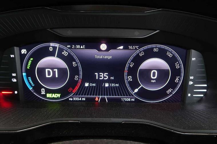 Bluetooth system, CareConnect and Emergency Call, Columbus HDD satellite 3D map navigation with 9.2" colour touch screen, web radio, integrated Wi-Fi, SmartLink+ with Apple CarPlay and Android Auto, Driver fatigue sensor, E mode button for electric/hybrid drive, Electromechanical power steering, Front assist with pedestrian protection, Stop/start engine system and energy recovery, Voice control system, Dynamic chassis control, E-noise generator for electric drive with noise emitted upto speed of 50km/h, Two charging cables 16amp for wallbox/chargepoints (mode 3) and 10amp mains charge cable (mode 2), XDS+, 2 USB ports, Bolero radio with 8" touchscreen display, Canton sound system - 610W 10 channel digital amp with 12 speakers, 200W subwoofer, noise cancellation, digital equaliser and 3D surround sound, DAB Digital radio, In-car voice enhancement, Aero front windscreen wipers with intermittent function, Auto dimming rear view mirror, Body colour door mirrors and handles, Chrome rear diffuser, Chrome strip between rear lights and lower strip on side doors, Chrome window surround, Cornering front fog lights, Electrically adjustable heated and folding door mirrors with memory function, Front and rear electric windows, Full matrix LED headlights with AFS LED DRL integrated with headlight washer LED rear lights(High function), dynamic indicators and lighting animation, Heated windscreen, Light assistant (coming/leaving home/tunnel light), Privacy glass, Rain sensor, Unique front grille with chrome-plated elements and charging socket cover, Unique iV badge on tailgate, 12v power point in centre console, Electrically adjustable front memory seats including lumbar support, Front armrest with storage box, Heated front and rear seats Includes digital clock, Height adjustable front and rear head restraints, Ice scraper, Illuminated and cooled glovebox, Interior lights with control switches, Isofix child seat fittings on outer rear seats, One umbrella compartments in driver door with one umbrella in drivers door, Overhead glasses storage compartment, Perforated leather upholstery, Rear centre armrest with cupholders, Removable parcel shelf, Split folding rear seats, Sport button for hybrid drive delivering maximum system performance, Storage compartment for charging cables under the luggage compartment mat, Storage compartment with cover in luggage compartment side panels, Textile floor mat set, Ticket holder on A Pillar, Tri zone climate control, Ventilated front seats, Virtual pedal for boot opening, LED package plus - Superb, 3 rear seatbelts, 7 airbags - Front, front side, curtain, driver's knee airbag with front passenger deactivation switch, Driver and passenger seatbelts with warning light, Electronic parking brake, ESC including ABS, EBV, MSR, ASR, EDS, HBA, DSR, RBS, CBC, multi-collision brake (MKB) and Auto hold, Tyre pressure monitor, Alarm with interior monitoring tilt sensor and back up horn, Electronic engine immobiliser, Keyless entry and start/stop, Remote central locking with SAFE system, Third remote key, Piano black inserts, Unique decorative door sills front and rear, Tyre repair kit,
