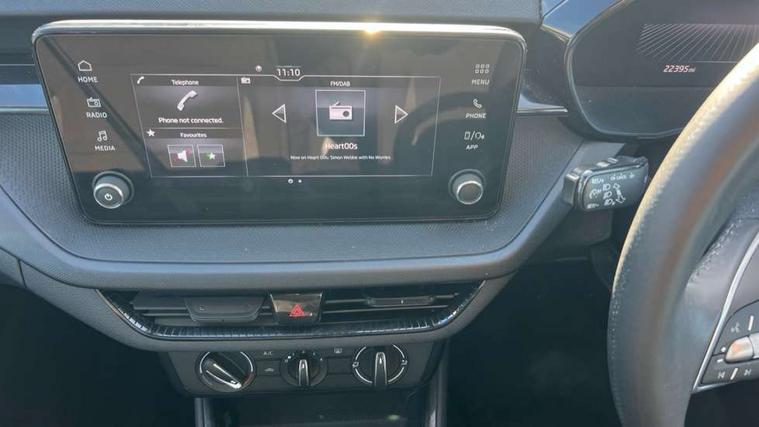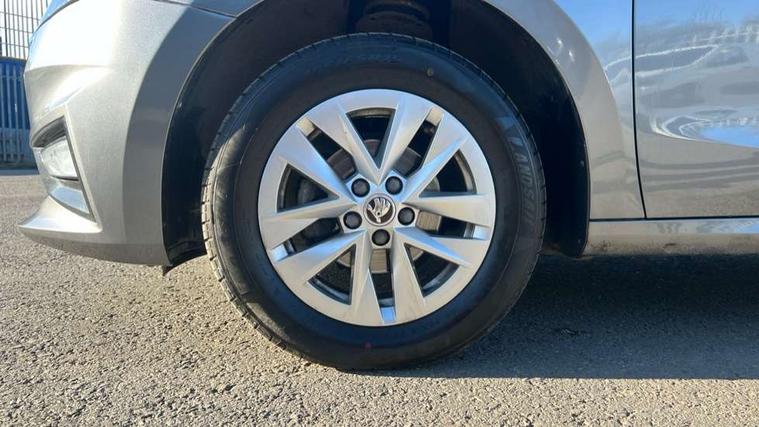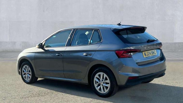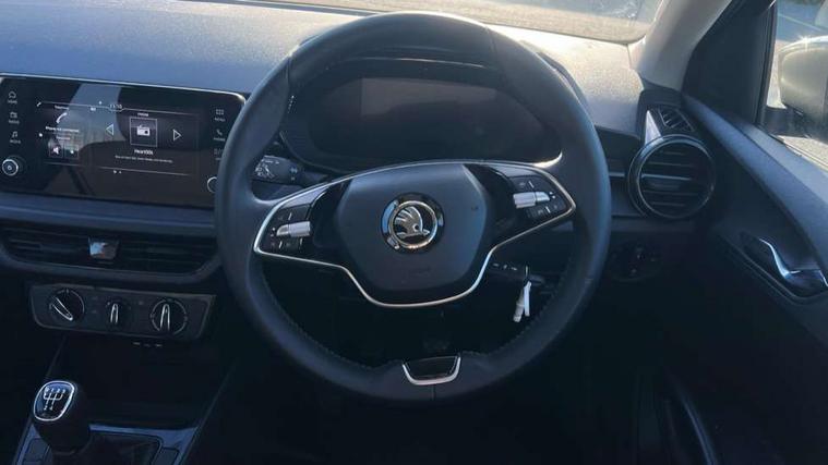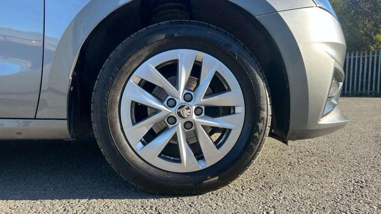 8" Digital instrument display, Advanced driver attention and drowsiness monitor, Bluetooth connection, Electromechanical power steering, Exterior temperature gauge, Lane assist including road edge detection, Rear parking sensors, Service interval indicator, Speed limiter, Traffic sign recognition, Wireless SmartLink for Apple CarPlay and Android Auto, 2x USB-C in the front (for data transmission and charging), 6 speakers (4 speakers/2 tweeters), 8.25" Skoda infotainment touchscreen display, Auxiliary socket for external MP3 player, DAB digital radio reception, Basic LED Headlights, Basic rear lights, Body colour door mirrors, Body coloured bumpers, Dimming rear view mirror with black frame, Door mirror integrated indicators, Electrically adjustable and heated door mirrors, Electrically adjustable front windows with function auto up/down, Front fog lights, Front window wiper intermittent control, Headlight range control - Automatic, Ice scraper in fuel cap, LED daytime running lights with coming and leaving home feature, Mechanical adjustable rear windows, Rain sensor, Rear LED fog light, Rear side wing doors, Rear window wiper with washing nozzles, Roof mounted spoiler, SKODA tailgate lettering in chrome, Third brake light, 2 reading lights in front and 2 reading lights in rear, 2 spoke leather multifunction steering wheel, 3 rear headrests, Backrest split and folding, Central console with removable cup holder and storage box, Chrome handbrake release button, Fabric upholstery, Front centre armrest, Gearshift knob/handle in leather, Grain satin black interior door handles, Hand brake lever handle in leather, Height adjustable driver seat, Height adjustable front headrests, Height adjustable steering wheel, ISOFIX and TopTether anchorage points to the outer rear seats, ISOFIX and TopTether on the front passenger seat, Luggage compartment lighting, Manual air conditioning, Pollen filter, Rear seat bench unsplit, Single front passenger seat, Storm grey headlining, Sun visors with mirror and airbag label on passenger side, Textile floor mats, Ticket holder, 3-point height adjustable front seats belts with pretensioner and force limiter, Automatic warning lights in case of crash, Driver and passengers airbag with switch off function, e-Call+, ESC including ABS, MSR, ASR, EDS, HBA and XDS, Front and rear seat belt warning, FRONT ASSIST (AEB City and AEB Inter Urban), Front side airbags, Head airbags, One tone horn, Pedestrian protection, Three rear 3-points safety seat belts with pretensioner and force limiter including stop function for outer rear seat belts, Tyre pressure monitoring system, Anti-theft alarm system including immobiliser, interior monitoring, backup horn, and towing protection, Central locking with radio remote control, interior controls, SAFE function and 2 foldable keys, Black painted air vents, Glossy black decorative trim, Grain satin black central console cover, Grain satin black lower decorative trim, Satin black door and side trim panel in front, Anti-theft wheel bolts protection, Super-low rolling resistance tyres,
