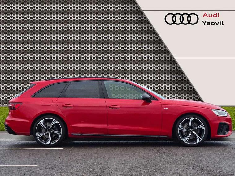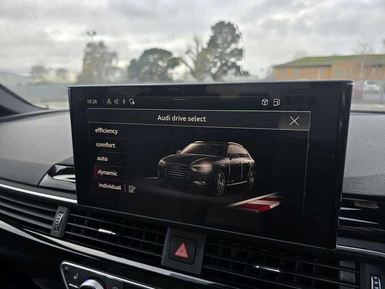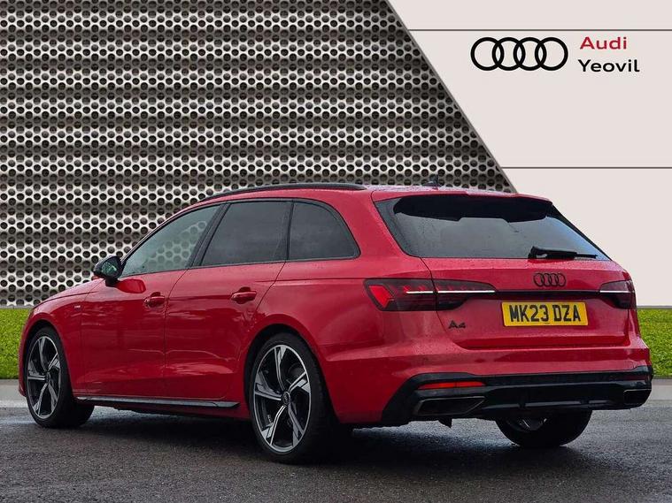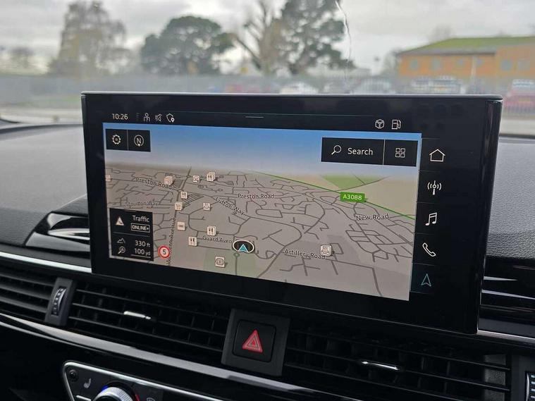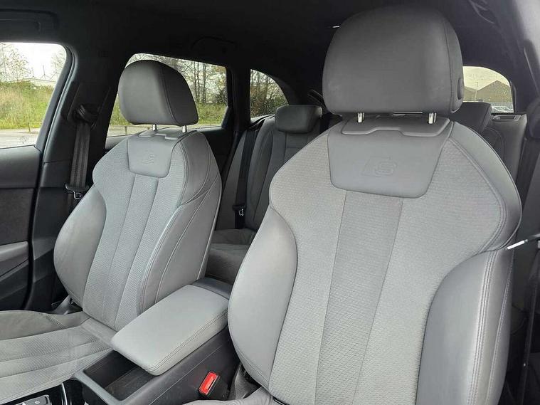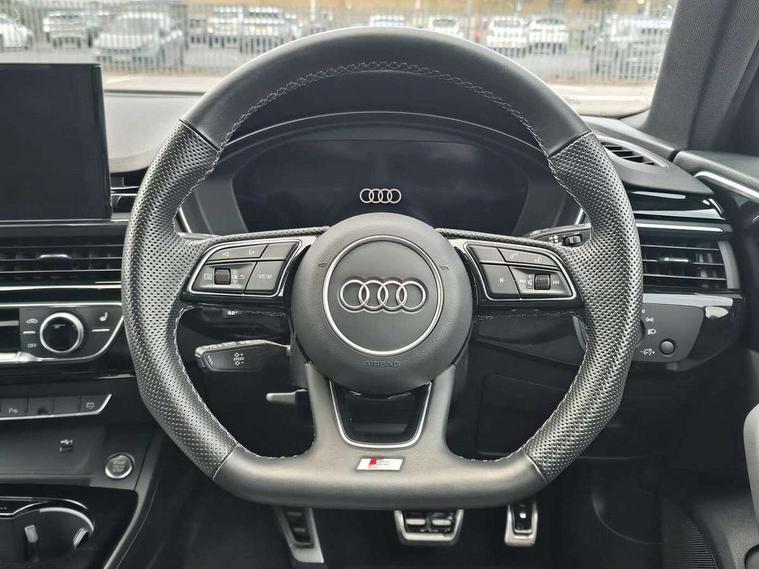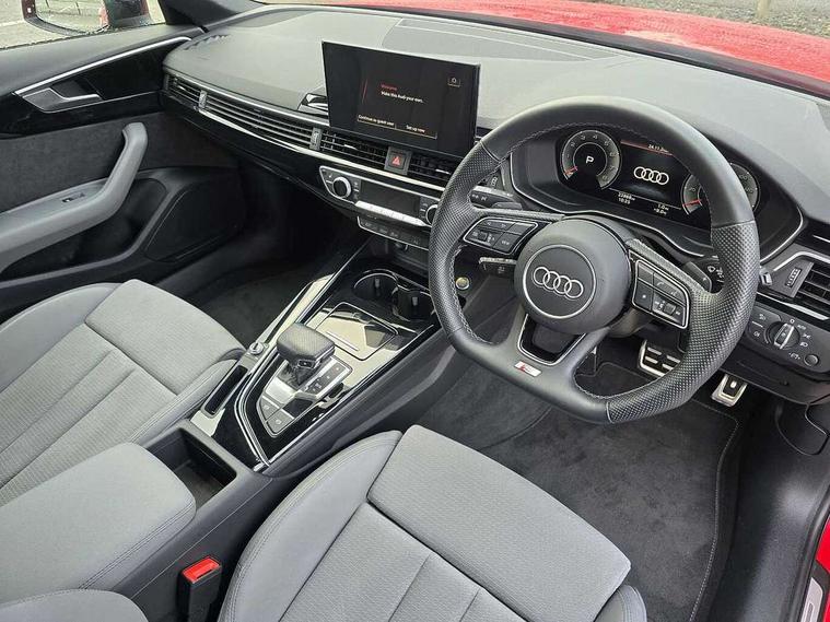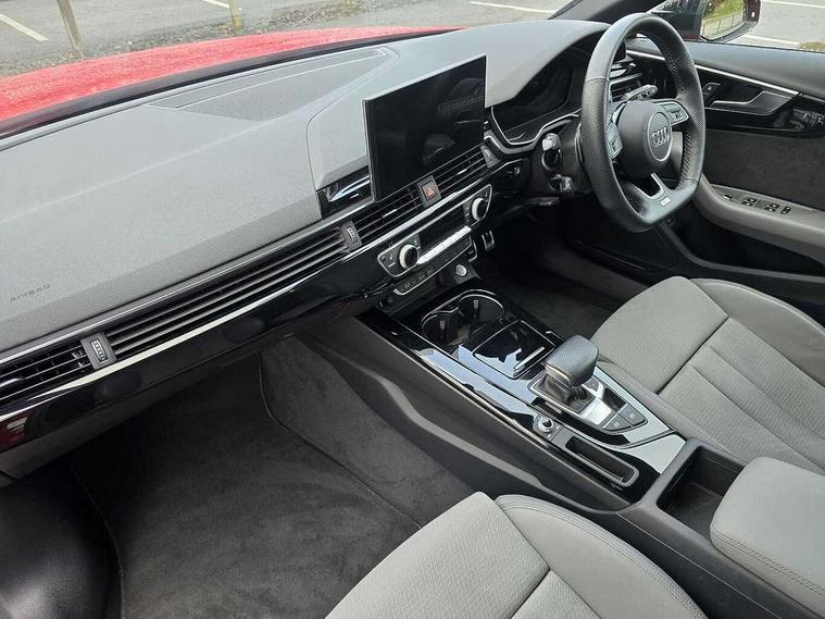 Audi connect safety and service (e-call), Audi connect with Amazon Alexa Integration, Audi drive select, Audi smartphone interface, Audi virtual cockpit, Automatic start-stop system with coasting functionality and efficiency programme, Bluetooth interface, Electromechanical power steering, Email, calendar and text messages displayed via MMI, MMI Navigation plus with MMI touch includes 10.1" high resolution colour MMI display, 3D map, Power operated tailgate, Voice control system, 54 litre fuel tank, Sports suspension lowered by 23mm, 2 USB charging ports, 8 passive loudspeakers, DAB digital radio reception, Audi beam uses LEDs to project the audi logo onto the ground as you exit your A4, Auto dimming rear view mirror, Black Audi rings and black badging (model name in black badging, no engine badging), Body colour door handles, Body colour front spoiler lip, Body colour side sill trim, Electrically folding auto dimming/adjustable/heated door mirrors with LED side indicators and kerb view function for passenger side, Exhaust tailpipes in high dark chrome, Front and rear bumpers with side skirts, Grained matt black side air inlets with matt aluminium silver inlay, High beam assistant, High gloss black B pillar trims and triangular rear door trim, LED headlights with LED rear lights + dynamic rear indicators + headlight adjustment and high beam, turning light + LED daytime running lights, LED third brake light, Privacy glass, Rain and light sensors, Rear diffuser in matt black with trim strip in matt aluminium silver, Rear side wing doors, Rear wiper, RS4 rear spoiler in body colour, S Line badges on the front wings, S Line roof edge spoiler, Variable intermittent front wash/wipe, Windscreen with acoustic glazing, 4 way electric lumbar support for driver and front passenger, 40/20/40 split folding 3 rear seat bench in 3 parts with rear centre armrest, Black cloth headlining, Black perforated leather gearknob, Contrast stitching on seats, steering wheel and gear lever gaiter, Deluxe 3 zone electronic climate control, Door sill trims with aluminium inlay, Electric load area cover, Front and rear head restraints, Front centre armrest, Heated front seats, Illuminated door sill trims with S logo, ISOFIX child seat mounting and top tether, Manual seat adjustment, Single front passenger seat, Stainless steel pedals and foot rest, Black styling pack - A4 Avant, LED Interior light pack - A4/S4, 3 rear seatbelts, 6 airbags - Driver, front passenger, curtain and side windows, Electronic Stabilisation Control (ESC) including ABS, ASR and EDL, Hill hold assist, Multi collision brake assist, Pop-up bonnet for pedestrian protection, Pre sense city, Rear door child safety locks, Seatbelt monitoring, Warning triangle and first aid kit, Anti theft alarm, Anti theft wheel bolts, Central locking, Keyless Go, Piano black finish inlay, 19" 5 arm flag design Audi sport diamond cut alloy wheels in gloss anthracite black, Tool kit, Tyre repair kit,