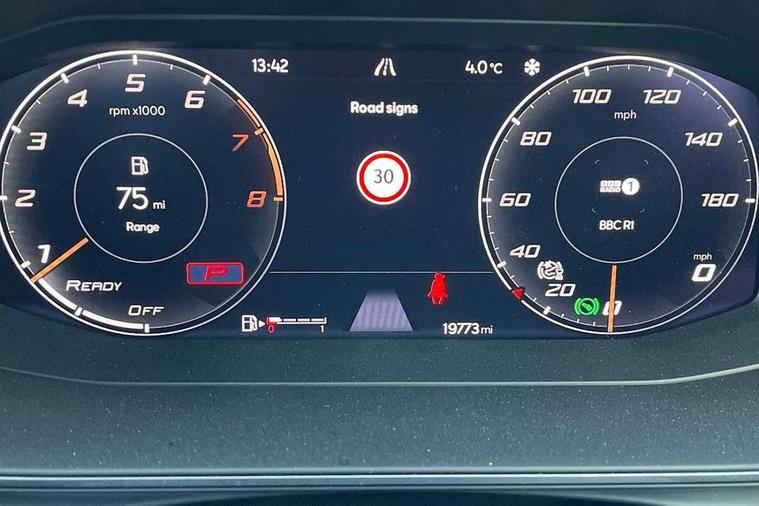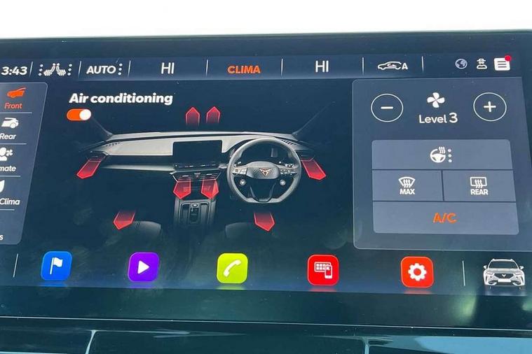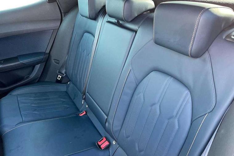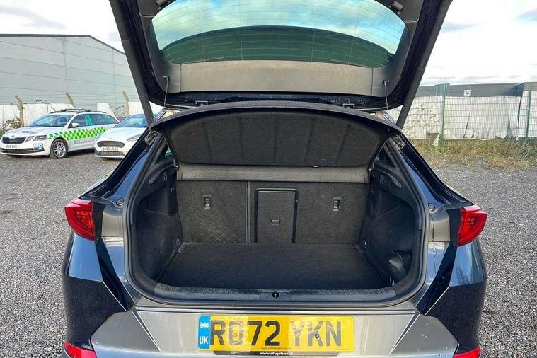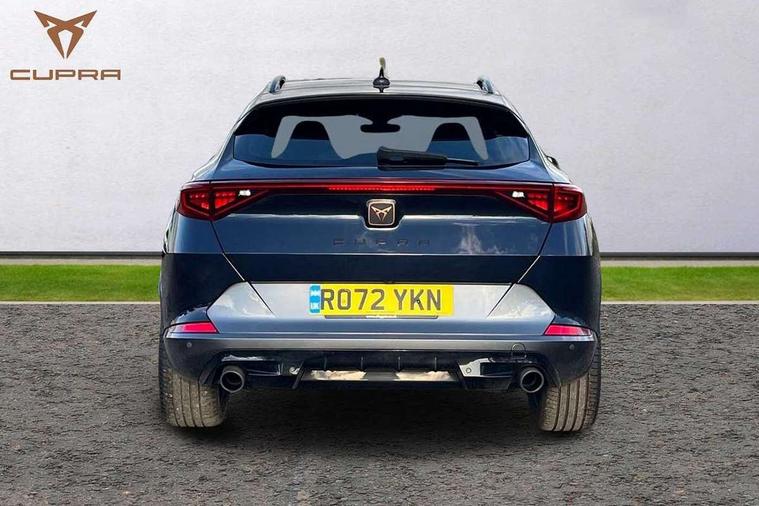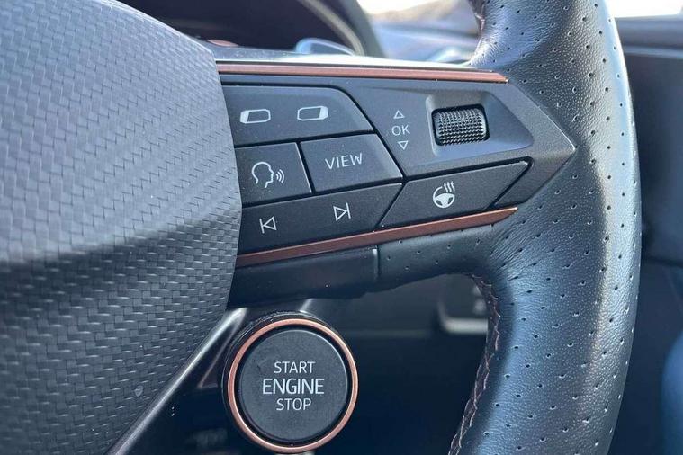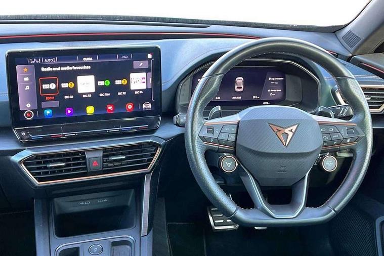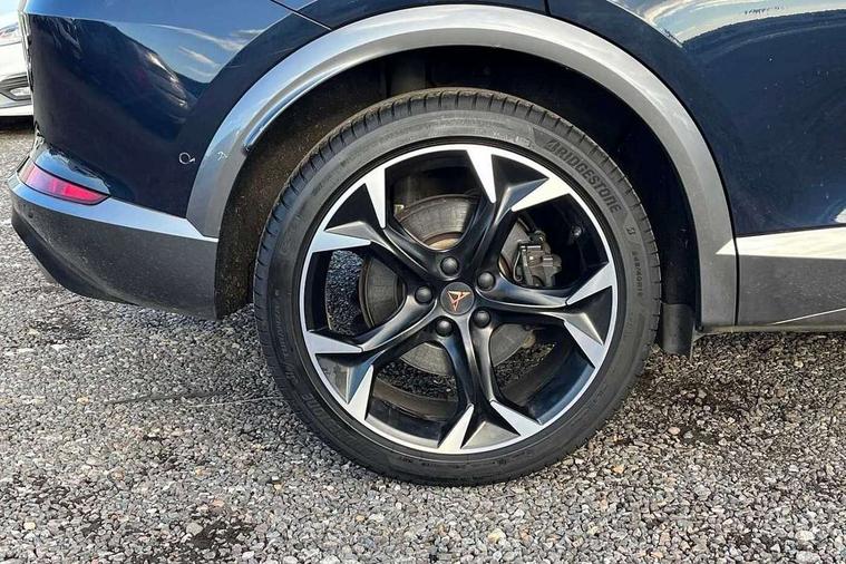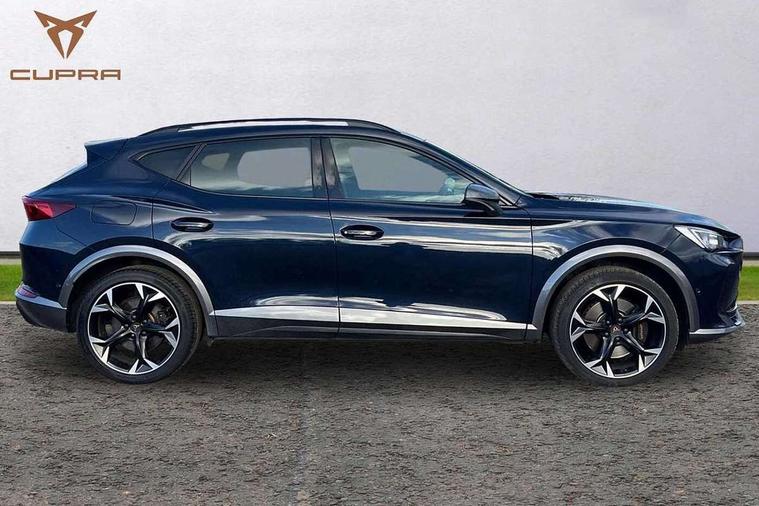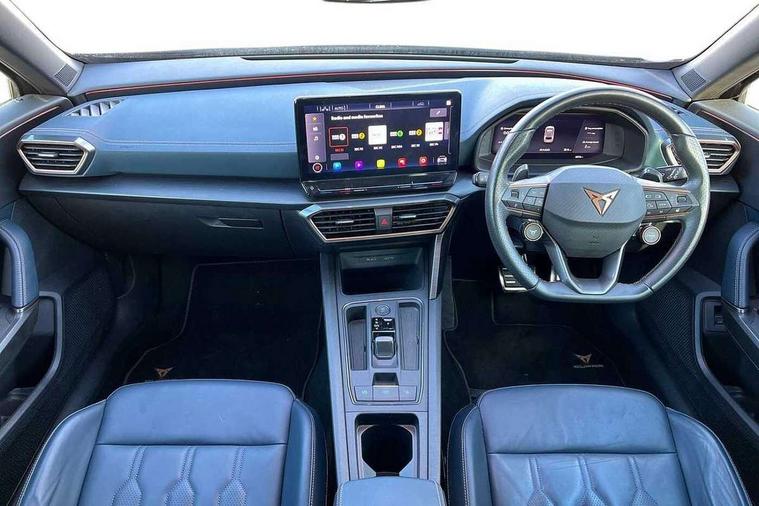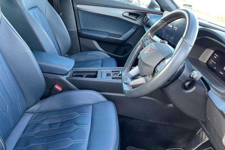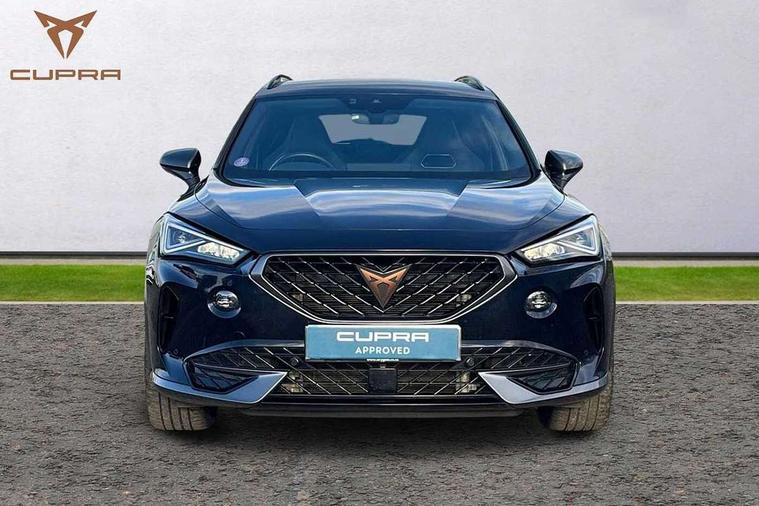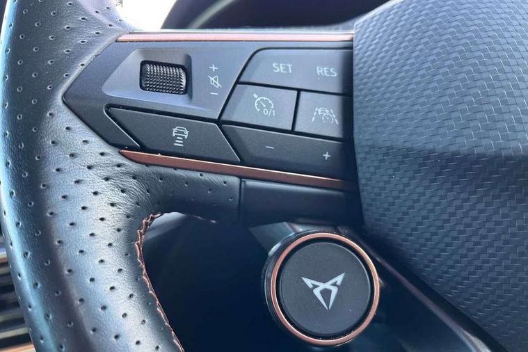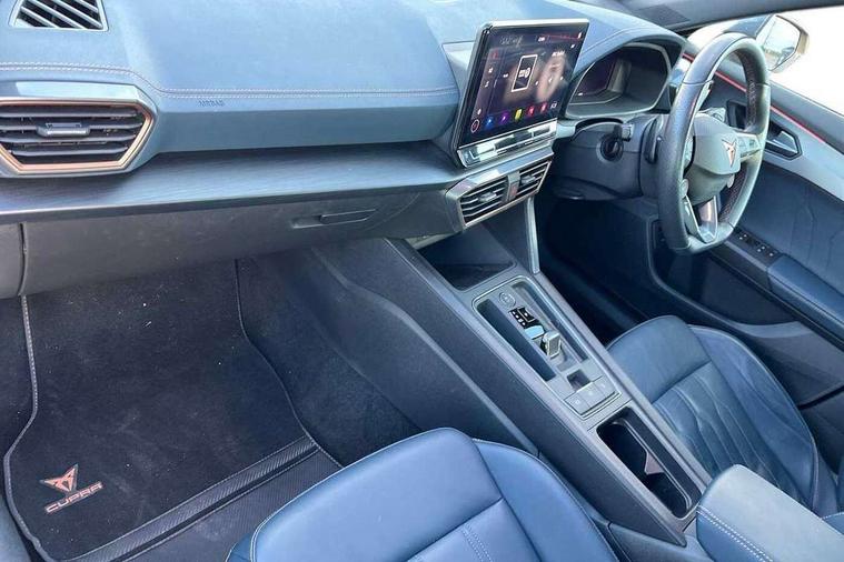 Digital cockpit and configurable dashboard, Driver alert system, Dynamic chassis control with driving profile selection (Comfort, Sport, CUPRA, Individual), E-call, Forward collision warning with automatic braking, Lane assist, Navigation system with 12'' Touchscreen Display, Park assist (inc front/rear parking sensors), Predictive adaptive cruise control with speed limiter, Rear view camera, RPM, trip computer, outside temp gauge, instrument light brightness, low fuel warning light, lights on reminder, gearshift indicator, Service interval indicator, Speed sensitive power steering, Start/stop system with regenerative braking, Virtual pedal and electric tailgate, Voice control system, Wireless apple carplay, Wireless phone charger, Electronic locking differential and dynamic traction support, Sports suspension with front shock absoption, 2 front and 2 rear USB type C sockets, Auxiliary input socket, DAB radio, Auto dimming rear view mirror, Body colour door handles, Body coloured bumpers, Dark grey wing mirror, Daytime running light with automatic headlight control and coming home feature, Dynamic headlight range control, Electric front/rear windows, Electrically adjustable heated and folding door mirrors with memory function, Front fog lamps with cornering function, Gloss black roof rails and window surrounds, LED Headlights, LED Taillights with dynamic indicator, Rain sensing wipers, Rear diffuser with twin exhaust pipe on each side, Rear side wing doors, Rear wash/wipe, Sports bumpers, Third brake light, Tinted rear windows, VZ logo rear badging, Welcome lights, 12v power supply in centre console, 12V socket, 12v socket in loadspace, 2 front and 2 rear reading lights, 230V socket, 3 seat bench in 2nd row, 60/40 split rear bench seat with armrest and mechanical seat release, Black headlining, Cupra sports pedals, Dust/pollen filter, Front and rear head restraints, Front centre armrest, Height/reach adjust steering wheel, Illuminated interior front door sills, Illuminated sunvisor with mirror, Isofix, Leather heated multi-function sports steering wheel with start stop, CUPRA mode button and gear shift paddles, Luggage tie-down hooks, Single front passenger seat, Three zone climate control with control panel in rear, Variable luggage/load compartment floor, Wraparound lighting, Genuine Nappa leather Pack - Cupra, Safety and driving pack (XL) - Formentor, 3 point seatbelts on all rear seats, ABS, Brake control system - ESC and brake booster, Child proof door locks, Driver and front passenger airbags with front passenger airbag de-activation, Electronic parking brake, Front and rear disc brakes, Front side curtain airbags, Hill hold control, Seat belt reminder for front and rear seats, Tyre pressure monitoring system, Anti theft alarm system, Keyless entry and start system (KESSY), Locking wheel bolts, Copper and aluminium interior detailing, 19" 'Exclusive' machined sport matte black and silver alloy wheels, Space saver spare wheel,