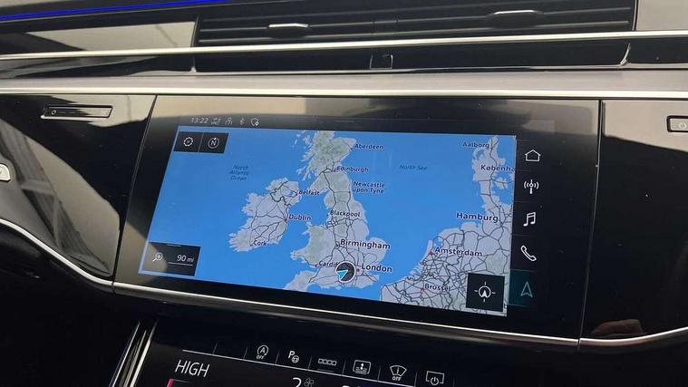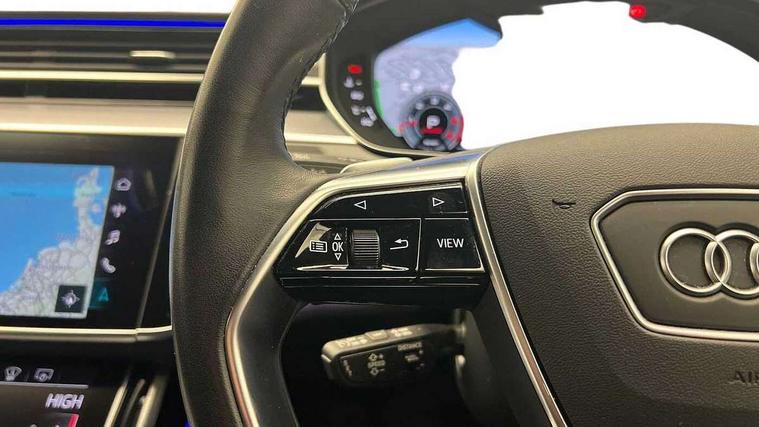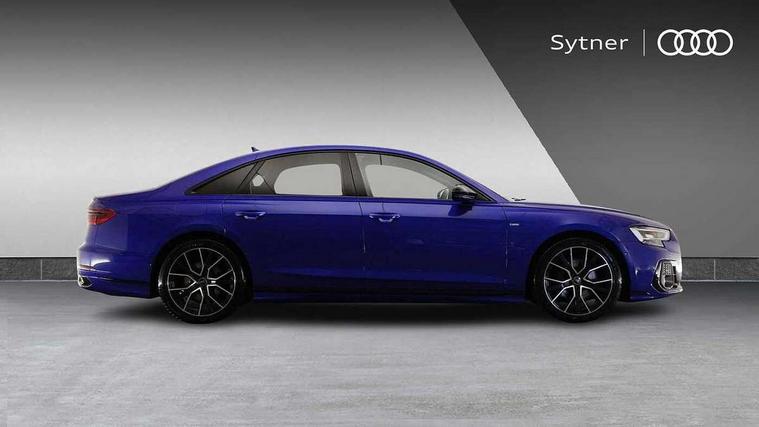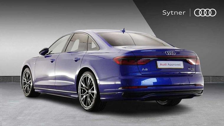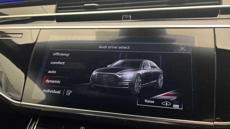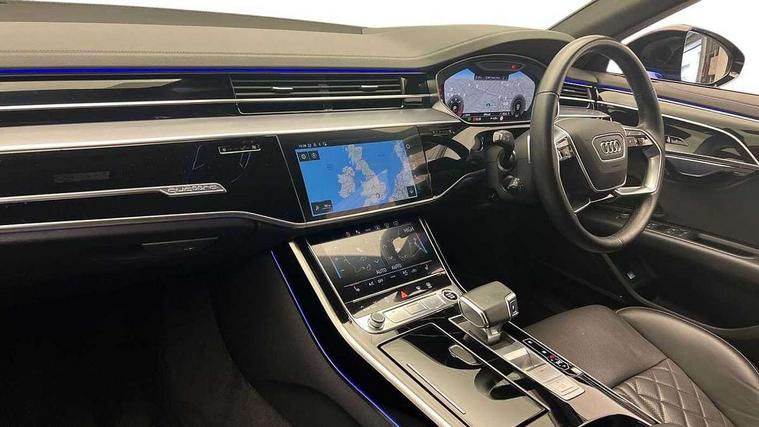 'Lights On' Reminder warning buzzer, Adaptive cruise control with cruise assist, emergency assist, efficiency assist, swerve assist, turn assist and speed limiter, Audi connect safety and service (e-call), Audi drive select, Audi parking system plus with front and rear sensors, Audi phone box with wireless charging, Audi virtual cockpit, Audi wireless smartphone interface, Bluetooth interface, Camera based traffic sign recognition, Convenience key, Electro - mechanical power assisted steering, Head up Display, MMI navigation plus with MMI touch + Twin touch screens with haptic feedback, Operating buttons in black, glass look with haptic feedback including extended aluminium look, Power door closure, Power operated tailgate, Rear view camera, Remote fuel filler release, Service interval indicator, 24 litre AdBlue tank, 48V Mild hybrid technology, 8 speed transmission with hill hold assist, 82 litre fuel tank, Adaptive air suspension, Diesel particulate filter, Quattro all wheel drive with self locking centre differential, Audi music interface, Audi sound system, DAB digital radio module, DVD System, MMI radio plus, USB connection, Acoustic double glazing, Audi space frame, Auto dimming rear view mirror, Body colour bumpers, Body colour door handles, Body colour side protection with aluminium trim strips, Electric front windows, Electric rear windows with isolation switch, Electrically adjustable heated folding + automatically dimming exterior mirrors with memory function and integrated LED indicators, Headlight cleaning system, Heat insulating glass in side and rear windows, Heat insulating glass windscreen, Heated rear window, Heated windscreen washer jets, High beam assist, LED brake lights, LED daytime running lights, OLED rear lights with changeable rear light signature, Privacy glass, Rear boot, Rear side wing doors, Side skirts, Third brake light, 12V socket, 2 zone automatic air conditioning, 3 seat rear bench with centre armrest in 2nd row, 4 way electric lumbar support for driver and front passenger, Black cloth headlining, Centre console with cupholders, Comfort centre armrest, Door pockets with bottle holder, Driver and front passenger side sunvisors with illuminated vanity mirrors, Dust/pollen filters, Electric front seats with memory function, Electric sunblinds for rear window and rear door windows, Front floor mats, Glove compartment cooling, Heated front seats, Height/reach electric steering column with easy exit function, Isofix child seat mounting points on outer rear seats, Leather gearknob, Passenger footwell storage net, Reading lights, Rear floor mats, Rear headrests, Roof mounted sunglasses holder, Single front passenger seat, Valcona leather upholstery with front sports seats in diamond quilted, Black exterior styling pack - A8 Black Edition, Chrome exterior pack - A8, LED interior lighting pack - A8, 3 point seatbelts on all rear seats, ABS/EBD, Active front headrest system, ASR traction control, Audi pre sense basic, Audi pre sense front, Black brake calipers, Driver/Front Passenger airbags, EDL traction control, Electromechanical parking brake, ESP, Extended pedestrian protection measures, Front and rear disc brakes, Front and rear side airbags with head airbag system, Front passenger airbag deactivation, Rear child proof door locks, Seatbelt reminder + electric contact in buckle + advanced safety equipment, Tyre pressure loss indicator, Warning triangle and first aid kit, Anti theft alarm tow away protection, Anti-theft wheel bolts and wheel loosening detection, Remote central locking, Dark matt brushed aluminium lower inlays,