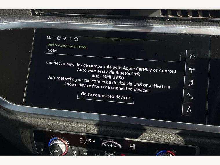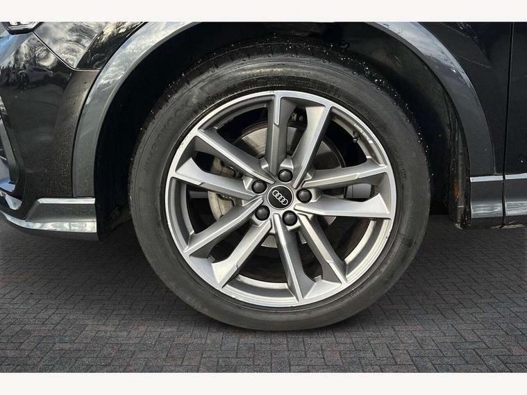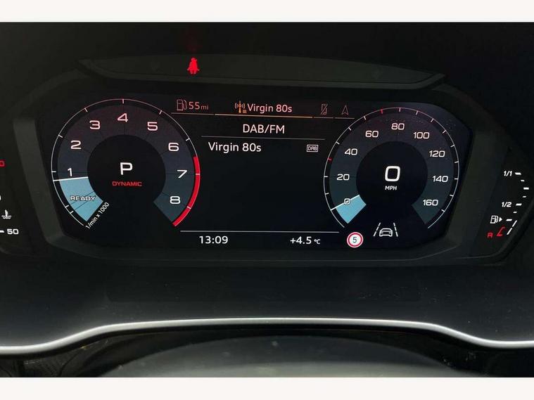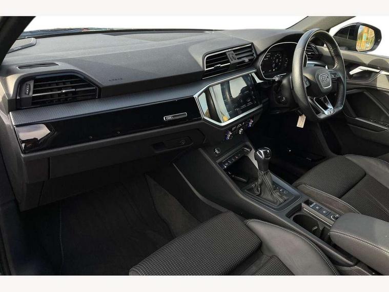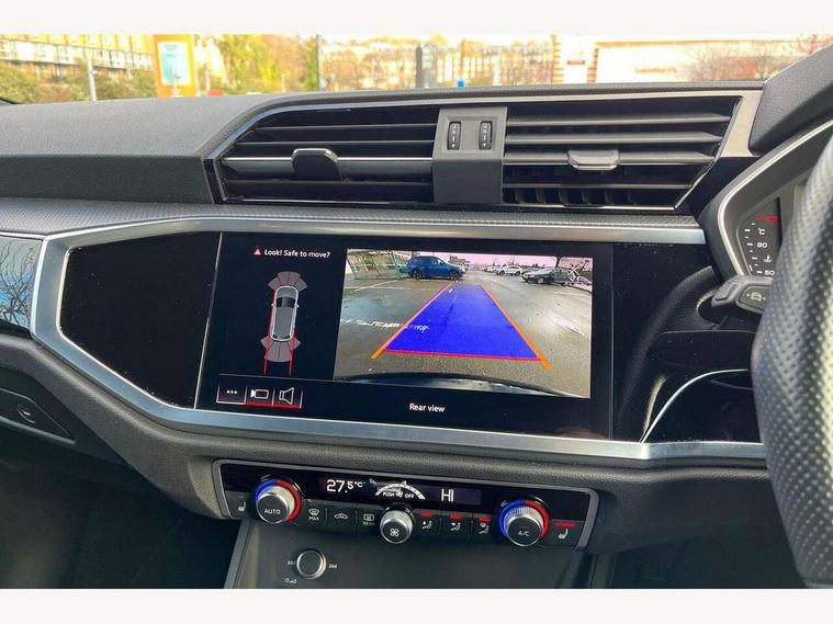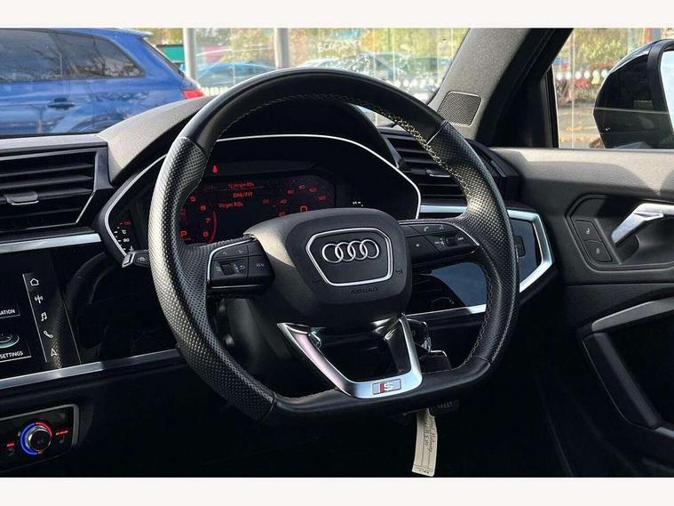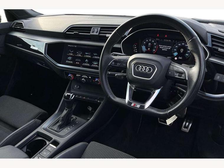 Amazon alexa Integration, Audi connect safety and service (e-call), Audi drive select, Audi lane departure warning, Audi Virtual Cockpit - 10.25" display, Bluetooth interface, Camera based traffic sign recognition, Cruise control + speed limiter, MMI Navigation Plus with high resolution 10.1 inch touchscreen colour display, Power operated tailgate, Progressive steering, Rear parking sensors, Service interval indicator, Smartphone interface includes wireless Apple carplay/Android Auto, Start stop system with recuperation, Voice control system with natural language interaction, 48V Mild hybrid technology, Sports suspension, 2 USB-C ports with charge and data functions, 6 passive loudspeakers, DAB digital radio module, Acoustic windscreen, Auto dimming frameless rear view mirror, Black roof rails, Electrically folding, adjustable and heated door mirrors with integrated LED side indicators and kerb view function for passenger side, Front and rear electric windows, Front fog lights, Grille vertical bars in aluminium silver/Matt, High gloss black finish B and C pillars, LED headlights with LED daytime running lights and dynamic rear indicator, LED rear lights, Privacy glass dark tinted rear and rear-side windows (from B-pillar backwards), Rain and light sensors, Rear diffuser strip in matt titanium black, S line bumpers in contrasting Manhattan grey, 12V socket in rear centre console, 3 spoke flat bottomed high multi-function leather sport steering wheel with gearshift paddles, 40:20:40 folding with manual adjustment for 60:40 forwards/backwards position and backrest angle, Adjustable rear seat bench/backrest with centre armrest and cupholder, Black cloth headlining, Dual zone electronic climate control, Front and rear black floor mats with contrast stitching in rock grey, Front and rear headrests, Front and rear roof module including reading lights, Front centre armrest, Glove compartment lighting, Height and reach adjustable steering wheel, Illuminated door sill trims with S logo, ISOFIX child seat mounting for front passenger with airbag deactivation and outer rear seat including top tether attachment point for outer rear seats, Luggage compartment light, Manual front seats with height adjustment, Perforated leather gearknob, Stainless steel luggage compartment sill finisher, Stainless steel pedals, Black styling pack - Q3, Non smoking pack - Q3, 3x3 point rear seatbelts, 6 airbags - Driver, front passenger, curtain and side windows, Audi pre-sense front with pedestrain and cyclist recognition, Electrically operated child locks on rear doors, Electromechanical parking brake, Electronic stabilisation control including ABS, ASR and EDL, Hill descent control, Hill hold assist, Pre sense basic, Seatbelt monitoring, Tyre pressure warning, Warning triangle and first aid kit, Anti theft alarm, Anti theft wheel bolts, Remote central locking, Detail dashboard around MMI touch colour display in glass look, black with surround in aluminium look, Leatherette door armrest, Piano black inlay, Tool kit, Tyre repair kit,