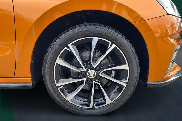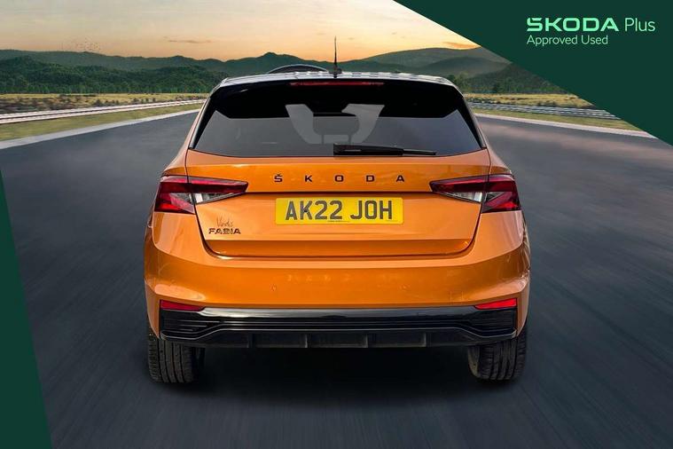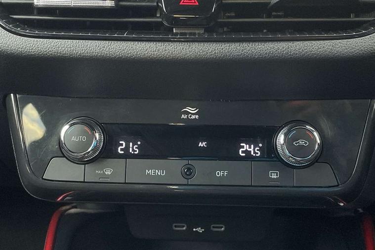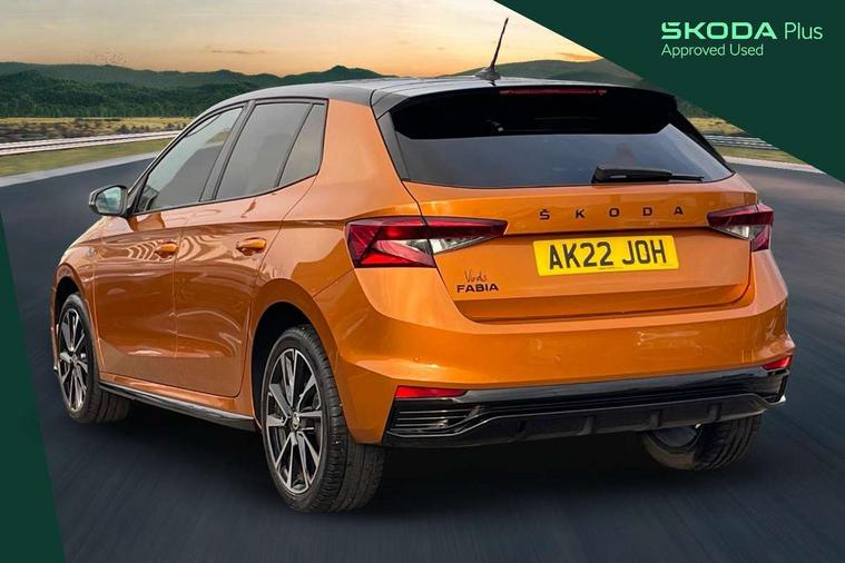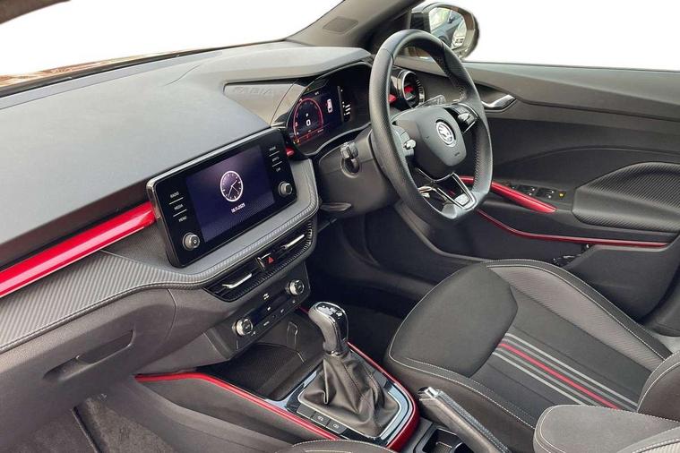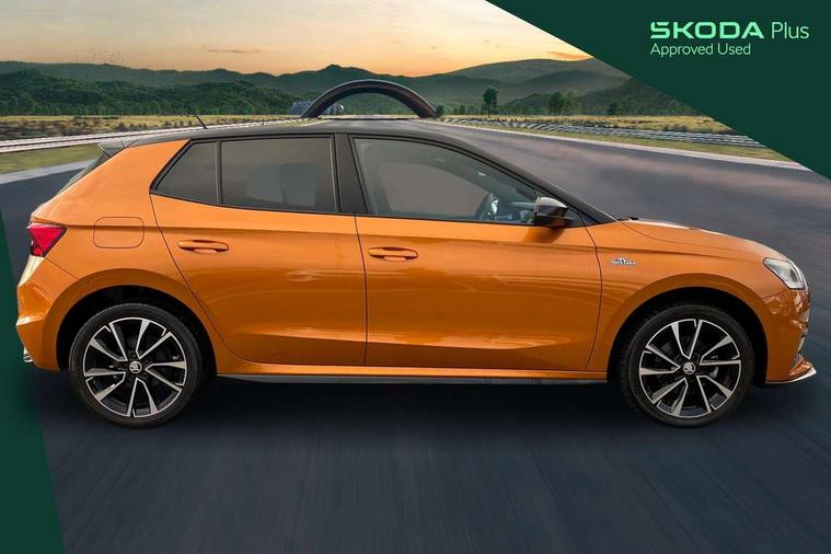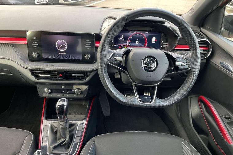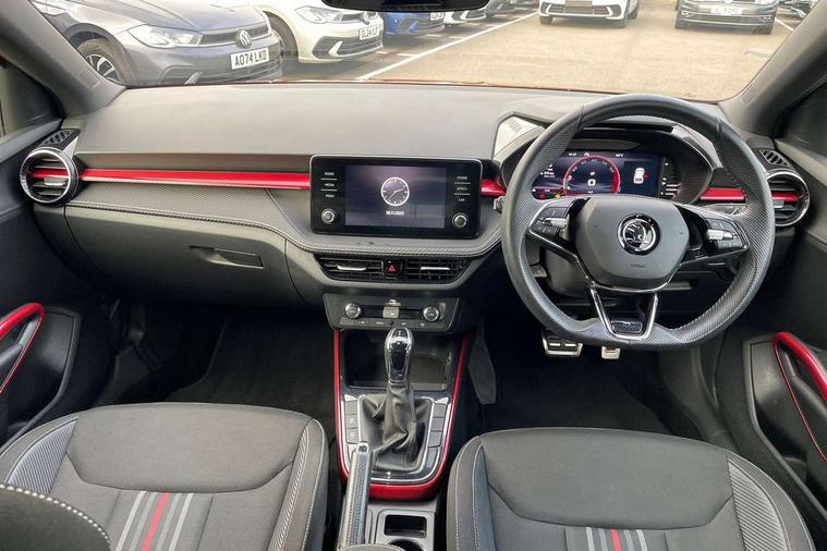 Bluetooth connection, Driver alert system - DAS, Electromechanical power steering, Exterior temperature gauge, Service interval indicator, 2x USB-C in the front (for data transmission and charging), 6 Speakers (4 in front and 2 in rear), Auxiliary socket for external MP3 player, Bolero radio with 8" colour display, DAB digital radio reception, Auto dimming rear view mirror, Basic rear lights, Black radiator grille, Body coloured bumpers, Door mirror integrated indicators, Electrically adjustable and heated door mirrors, Front and rear electric windows, Front window wiper intermittent control, Headlight range control - Automatic, Ice scraper in fuel cap, LED daytime running lights with coming and leaving home feature, Monte Carlo badging, Privacy glass, Rear LED fog light, Rear side wing doors, Rear window wiper with washing nozzles, Roof mounted spoiler, SKODA tailgate lettering in black, Sports bumpers, Third brake light, 3 rear headrests, Aluminium pedals, Backrest split and folding, Black headlining, Central console with removable cup holder and storage box, Chrome handbrake release button, Fabric/artificial leather upholstery, Front sports seats, Gearshift knob/handle in leather, Hand brake lever handle in leather, Height adjustable front headrests, Height adjustable steering wheel, ISOFIX and TopTether anchorage points to the outer rear seats, ISOFIX and TopTether on the front passenger seat, Luggage compartment lighting, Metallic painted red central console cover, Metallic red interior door handles, Monte Carlo door sills, Pollen filter, Rear seat bench unsplit, Single front passenger seat, Sun visors with mirror and airbag label on passenger side, Textile floor mats, Ticket holder, Umbrella in drivers door, Ambient lighting pack 2 - Fabia Hatchback, 3-point height adjustable front seats belts with pretensioner and force limiter, Automatic warning lights in case of crash, Driver and passengers airbag with switch off function, e-Call+, ESC including ABS, MSR, ASR, EDS, HBA and XDS, Front and rear seat belt warning, FRONT ASSIST (AEB City and AEB Inter Urban), Front side airbags, Head airbags, Hill hold assist, One tone horn, Pedestrian protection, Three rear 3-points safety seat belts with pretensioner and force limiter including stop function for outer rear seat belts, Tyre pressure monitoring system, Anti-theft alarm system including immobiliser, interior monitoring, backup horn, and towing protection, Carbon effect door and side trim panels, Carbon effect lower decorative trim with white stitching, Red metallic upper decorative trim, Anti-theft wheel bolts protection, Super-low rolling resistance tyres,