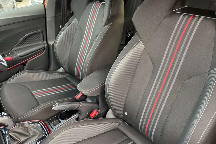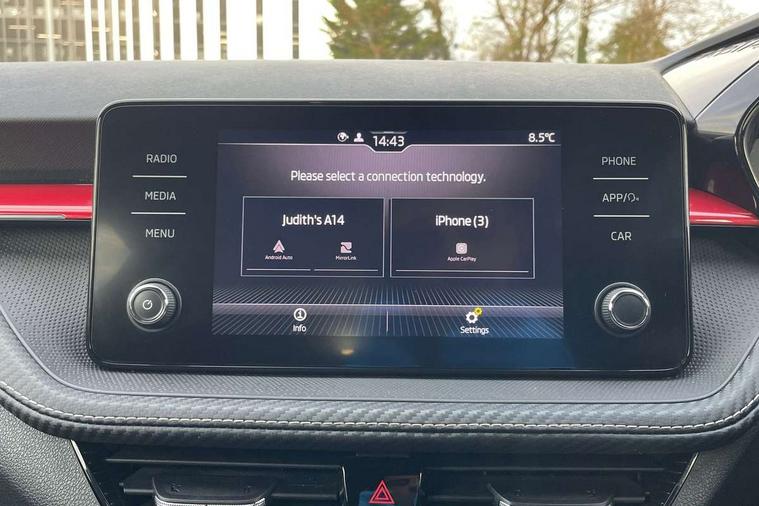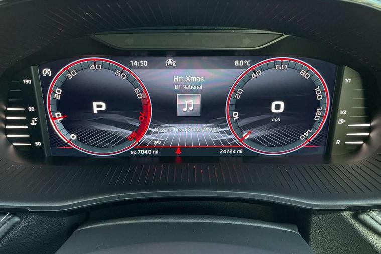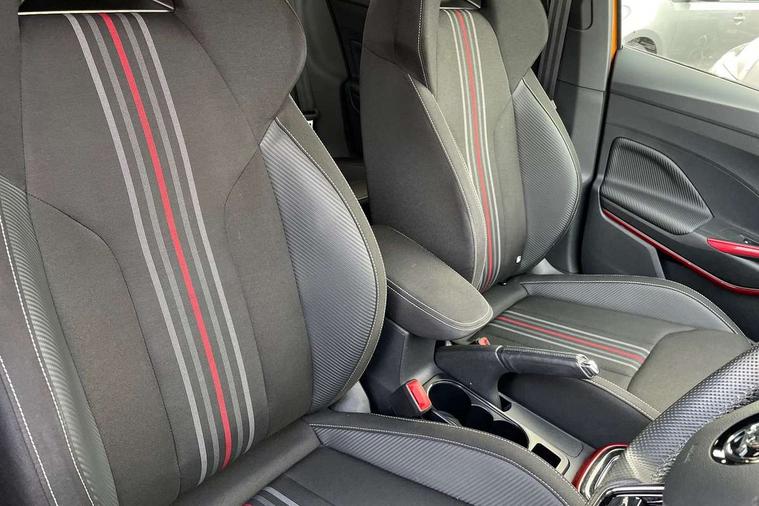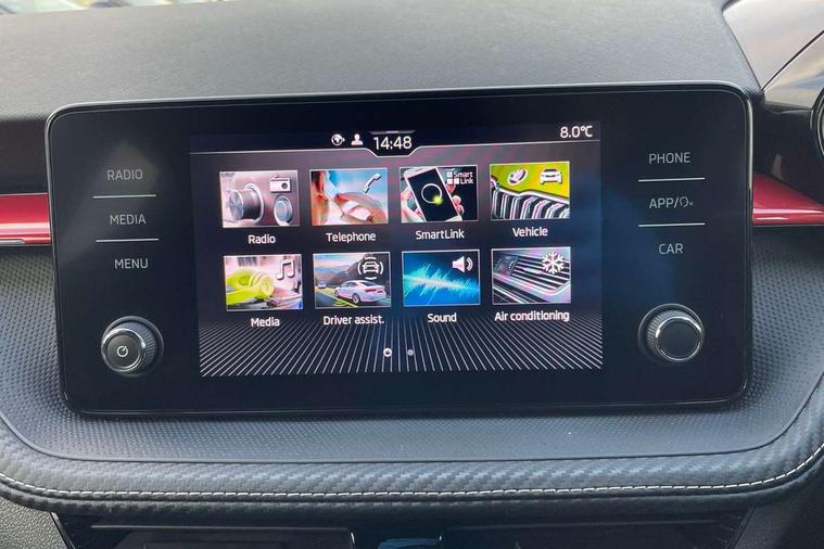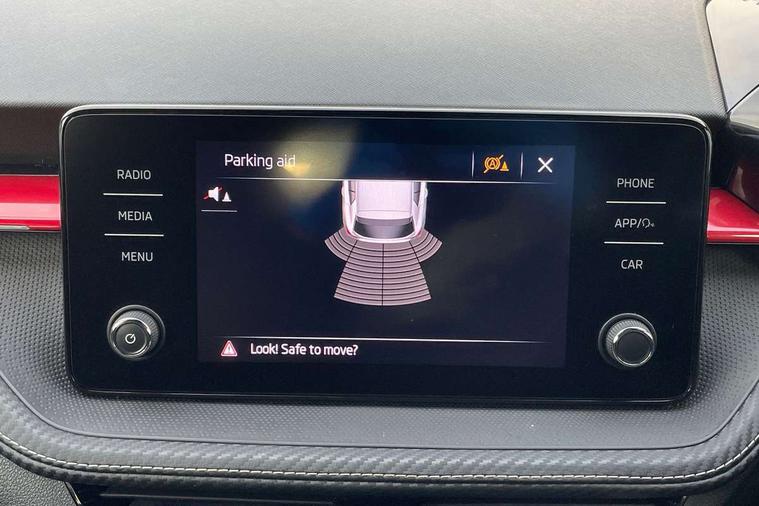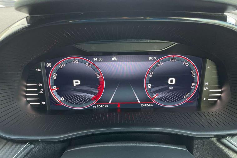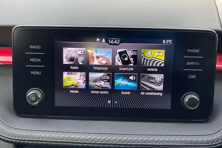 Bluetooth connection, Driver alert system - DAS, Electromechanical power steering, Exterior temperature gauge, Service interval indicator, 2x USB-C in the front (for data transmission and charging), 6 Speakers (4 in front and 2 in rear), Auxiliary socket for external MP3 player, Bolero radio with 8" colour display, DAB digital radio reception, Auto dimming rear view mirror, Basic rear lights, Black radiator grille, Body coloured bumpers, Door mirror integrated indicators, Electrically adjustable and heated door mirrors, Front and rear electric windows, Front window wiper intermittent control, Headlight range control - Automatic, Ice scraper in fuel cap, LED daytime running lights with coming and leaving home feature, Monte Carlo badging, Privacy glass, Rear LED fog light, Rear side wing doors, Rear window wiper with washing nozzles, Roof mounted spoiler, SKODA tailgate lettering in black, Sports bumpers, Third brake light, 3 rear headrests, Aluminium pedals, Backrest split and folding, Black headlining, Central console with removable cup holder and storage box, Chrome handbrake release button, Fabric/artificial leather upholstery, Front sports seats, Gearshift knob/handle in leather, Hand brake lever handle in leather, Height adjustable front headrests, Height adjustable steering wheel, ISOFIX and TopTether anchorage points to the outer rear seats, ISOFIX and TopTether on the front passenger seat, Luggage compartment lighting, Metallic painted red central console cover, Metallic red interior door handles, Monte Carlo door sills, Pollen filter, Rear seat bench unsplit, Single front passenger seat, Sun visors with mirror and airbag label on passenger side, Textile floor mats, Ticket holder, Umbrella in drivers door, Ambient lighting pack 2 - Fabia Hatchback, 3-point height adjustable front seats belts with pretensioner and force limiter, Automatic warning lights in case of crash, Driver and passengers airbag with switch off function, e-Call+, ESC including ABS, MSR, ASR, EDS, HBA and XDS, Front and rear seat belt warning, FRONT ASSIST (AEB City and AEB Inter Urban), Front side airbags, Head airbags, Hill hold assist, One tone horn, Pedestrian protection, Three rear 3-points safety seat belts with pretensioner and force limiter including stop function for outer rear seat belts, Tyre pressure monitoring system, Anti-theft alarm system including immobiliser, interior monitoring, backup horn, and towing protection, Carbon effect door and side trim panels, Carbon effect lower decorative trim with white stitching, Red metallic upper decorative trim, Anti-theft wheel bolts protection, Super-low rolling resistance tyres,