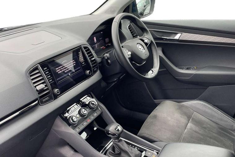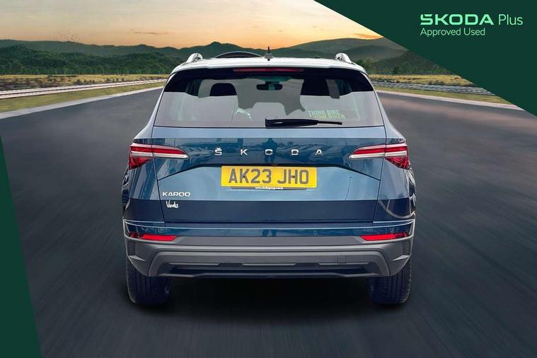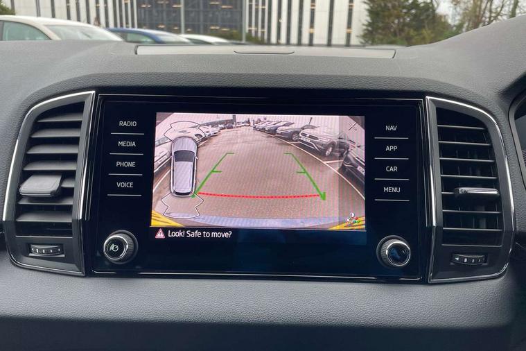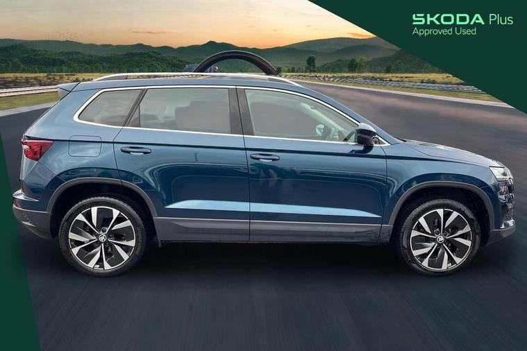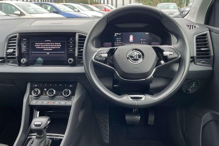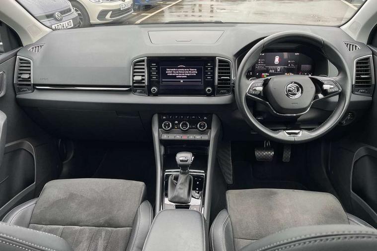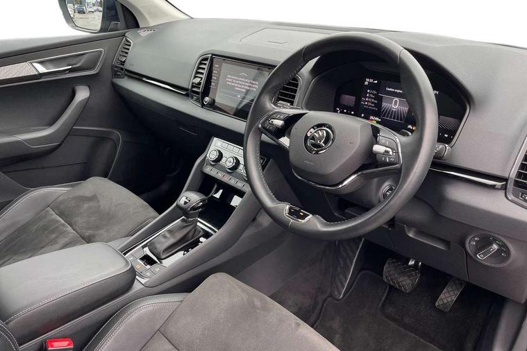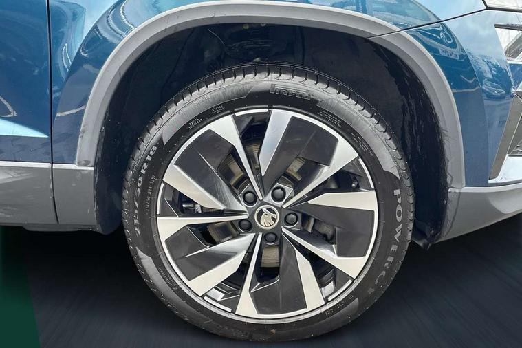 8" Digital display, Care connect, Driver fatigue sensor, Emergency services call system, Outside temperature gauge, Service interval indicator, SmartLink wireless for Apple and wired for Android, Start/stop system with regenerative braking, USB C Port x 2 in front centre console, 8 Speakers, DAB radio with Bluetooth, USB connection, Acoustic glass, Aero front windscreen wipers with intermittent function, Auto dimming rear view mirror with light and rain sensors, Black electric window control buttons, Body colour door mirrors and handles, Dynamic headlight range control with cornering light function, Electric front and rear windows with child proof lock, Heated rear windscreen, LED daytime running lights, LED rear lights with high functionality welcome effect and dynamic indicators, Light assistant (coming/leaving home/tunnel light), Plastic scuff plates, Privacy glass, Rear side wing doors, Rear spoiler, Rear window wiper with washer system and intermittent control, Safety reflectors on front doors, 1.5 litre bottle holders in driver and front passenger door panels, 12V socket in boot, 12v socket in front centre armrest with storage compartment and rear air vents, 2 Folding hooks and nets in boot, 2 spoke leather heated multifunction steering wheel with DSG paddles, 2 x Tablet holder, 3 rear height adjustable headrests, 3 seat bench in 2nd row, 4 foldable roof handles with rear coat hooks, Black floor carpet, Chrome inner door handles, Decorative door sills with KAROQ badging, Double sided boot floor, Foldable hooks in the boot, Front head restraints, Height adjustable front three point seats belts with tensioners, Height/reach adjust steering wheel, Ice scraper, Illuminated glovebox, Illuminated luggage compartment, Isofix child seat preparation for front passenger seat, Isofix child seat preparation outer rear, Manual lumbar support for front seats, Pen holder, Pollen filter, Rear boot cover, Rear reading lights, Rubbish bin door, Safety vest holder, Single front passenger seat, Storage box in upper central dashboard closed, Sunvisors with illuminated vanity mirrors, Textile floor mats, Ticket holder, VarioFlex seats with standard rear seat release, Chrome roof rails + chrome pack - Karoq, Parking pack - Karoq, Automatic door unlocking in case of crash, Automatic fuel cut off in case of crash, Child locks on rear doors, Driver airbag, Electronic parking brake with auto hold function, Emergency rear braking signal, ESC including ABS, MSR, ASR, EDS, HBA, DSR, RBS, MKB and traction control, Front side airbags, Hill hold control, Knee airbags, Passenger airbag with switch-off function, Pedestrian monitor, Seatbelt reminder signalisation and pretensioner for all seats, Three point seatbelts rear, Two tone horn, Tyre pressure display, Tyre pressure monitor, Alarm with interior monitoring, back up horn and tilt sensor with safe function, Electronic engine immobiliser, Keyless entry and start/stop, Remote central locking with 2 remote folding keys, Chrome framed air vents, 18" Procyon silver alloy wheels with anthracite aero inserts, Anti-theft wheel bolts protection, Storage on wheel cover, Tool kit,