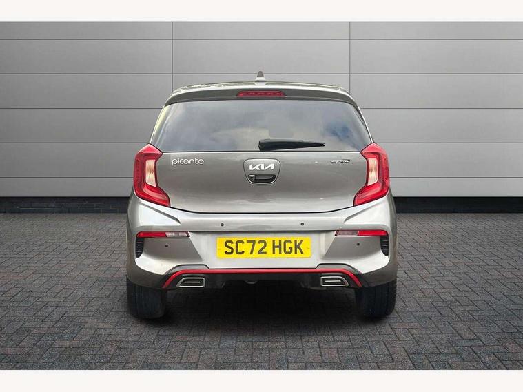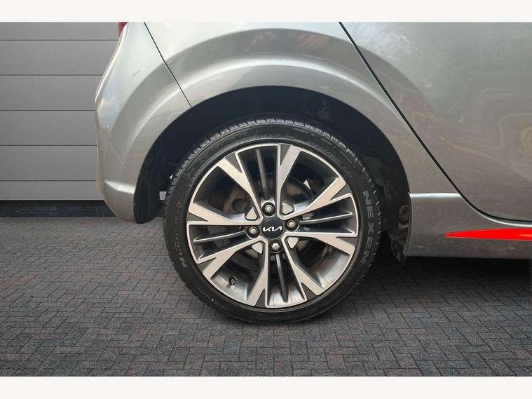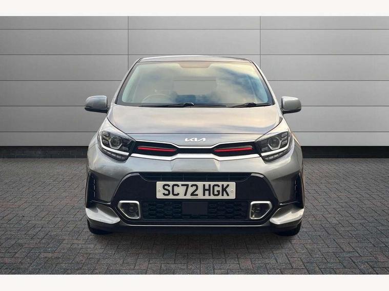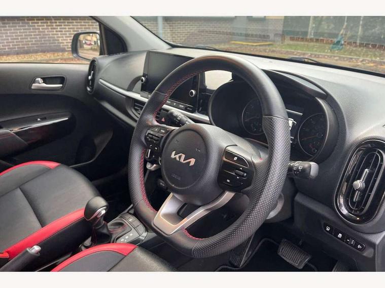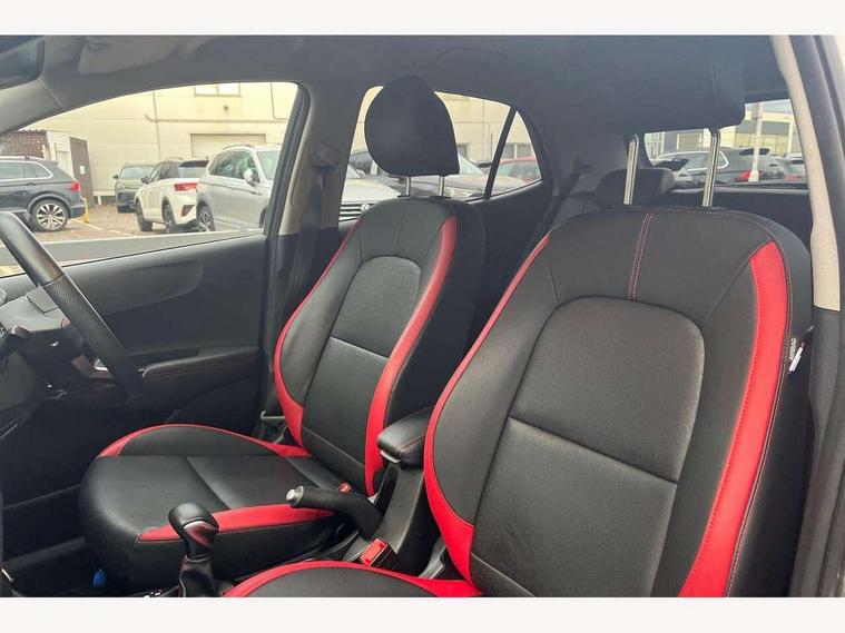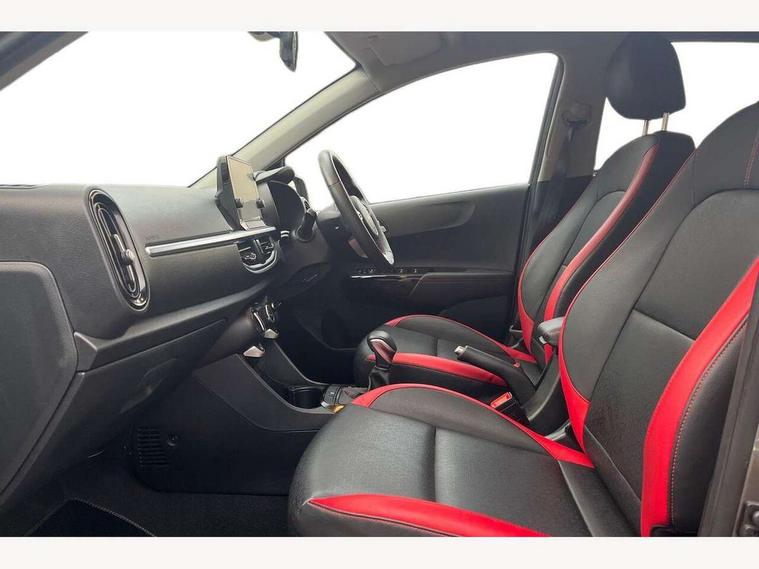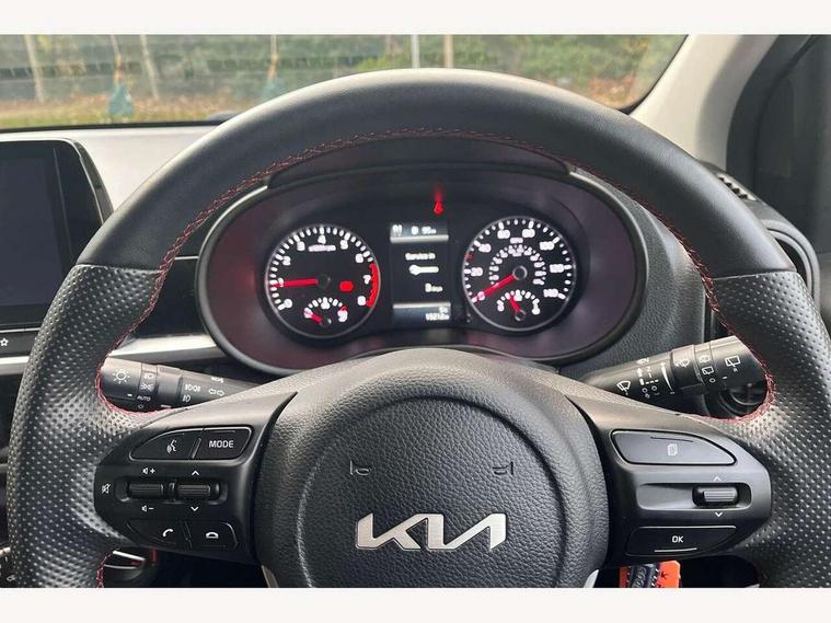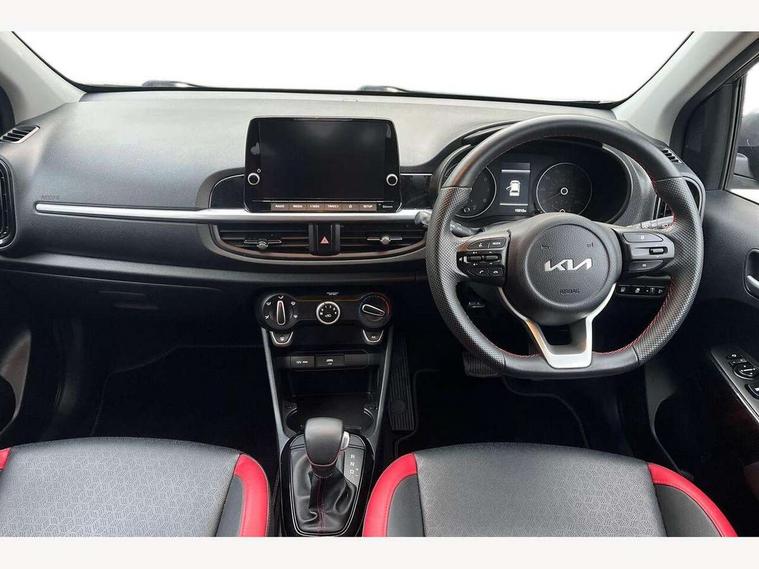 8" touchscreen display with RDS and DAB, Apple car play/Android Auto with voice control, Emergency call service, Emergency stop signalling system, External temperature gauge, Motor driven power steering, Reversing camera system with dynamic guidelines (Integrated into centre fascia screen), Tachometer, Trip computer, 6 speaker audio system, Bluetooth with music streaming, Steering wheel mounted controls, USB ports for connection of a media device, Automatic headlight control system, Bi-function projection headlights, Black beltline mouldings, Black grille with silver surround, Body colour B pillars, Body colour bumpers, Body colour mirrors and door handles, Body colour side sill mouldings, Day/night rear view mirror, Electric adjustable/heated/folding door mirrors with LED indicators lights, Front and rear electric windows with drivers's auto up/down function, Front fog lights, Headlamp levelling, Heated rear window, High mount brake light, LED daytime running lights, LED rear fog lights, Privacy glass - Rear windows and tailgate, Rain sensor, Rear side wing doors, Rear wash/wipe, Speed variable front wipers, Sports front and rear bumpers with gloss black skid plates twin exhaust, Tinted glass, Visible VIN plate, Welcome and follow-me home light functionality, 1 x rear coat hook, 12V power point front, 2 seat bench in 2nd row, 3 x passenger assist grips, 60/40 split/folding 2nd row of seats, All round height adjustable headrests, Black and red accents front door armrest, Centre Console with Storage Box and Sliding Armrest, Cupholders in centre console, D-cut steering wheel with red stitching, Driver and front passenger sunvisor with vanity mirror, Driver seat height adjust, Faux leather upholstery, Front cabin lights, Glovebox, High gloss lower centre fascia trim, door armrest and air vents, ISOFIX Child seat top tethers and anchor fixings, Leather trimmed steering wheel and gearshift, Luggage area light, Luggage area parcel shelf, Manual air conditioning, Passenger front seatback pockets, Satin chrome interior door handles, Single front passenger seat, Slide/reclining front seats, Tilt adjustable steering wheel, Advanced Driver Assistance Pack - Picanto, 2 x 3-point rear seatbelts, ABS/EBD, Automatic unlocking of doors in case of impact, Dual front airbags, ESC + BAS + VSM + HAC, Front passenger airbag cut-off switch, Front seatbelt height adjusters, Front seatbelt pretensioners + load limiters, Hill hold control, Knee airbags, Rear child proof door locks, Seatbelt warning, Side impact protection, Torque vectoring brake based and straight line stability (SLS), Traction control, Twin curtain airbags, Twin front side airbags, Tyre pressure monitoring system, Anti theft alarm, Engine immobiliser, Folding key, Locking wheel nuts, Remote central door locking, 16" alloy GT-Line wheels, Tyre mobility kit,