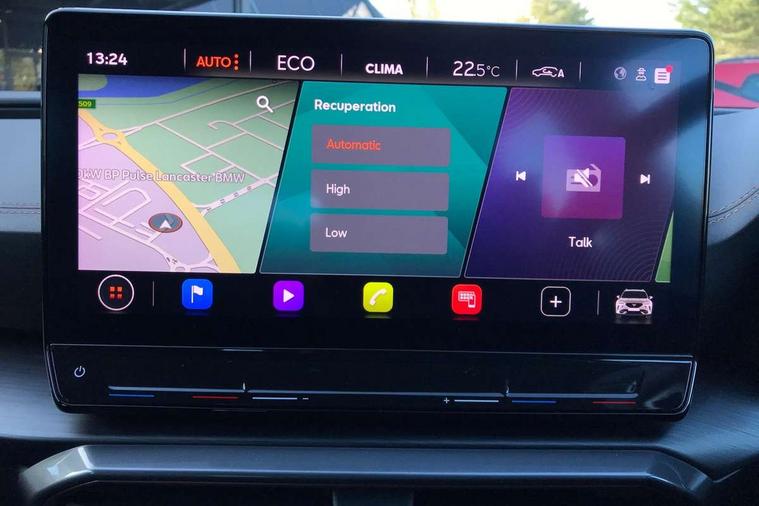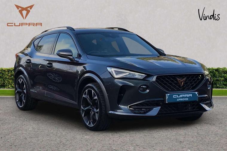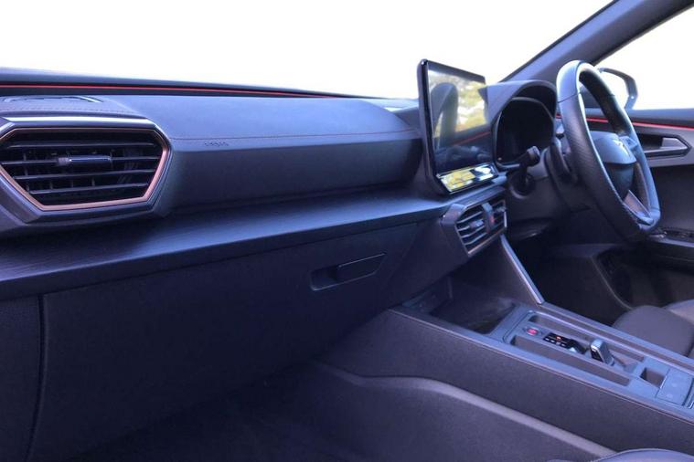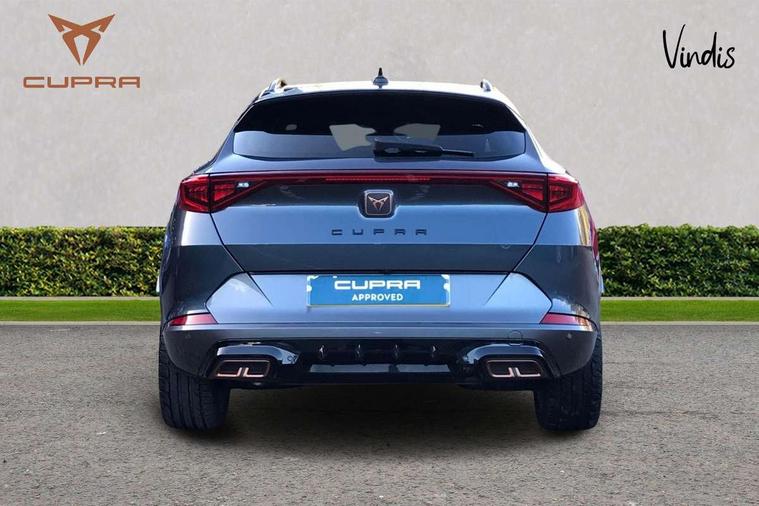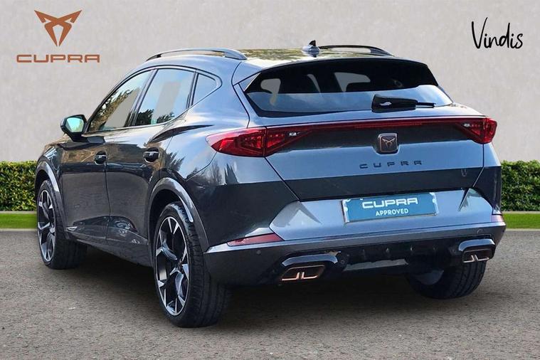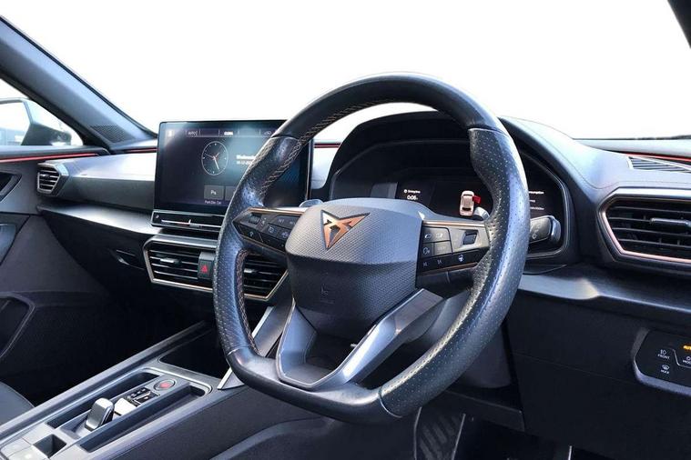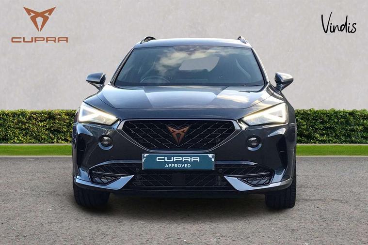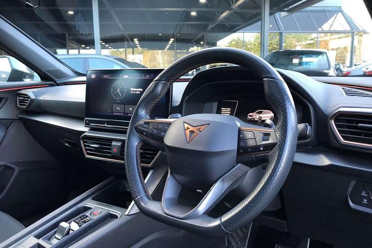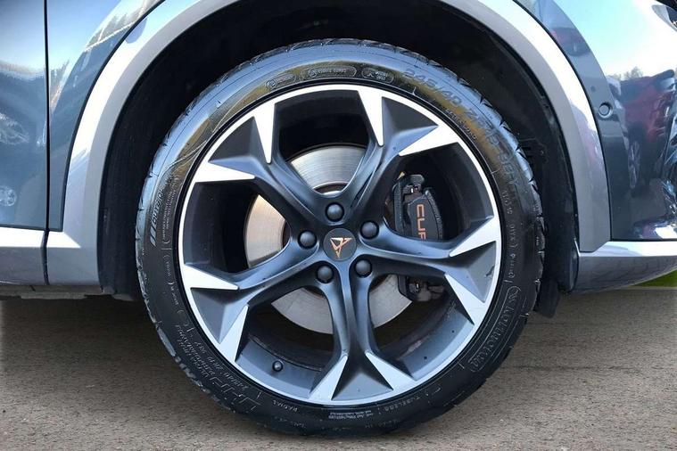 Digital cockpit and configurable dashboard, Driver alert system, Dynamic chassis control with driving profile selection (Comfort, Sport, CUPRA, Individual), Forward collision warning with automatic braking, Lane assist, Park assist (inc front/rear parking sensors), Predictive adaptive cruise control with speed limiter, Rear view camera, RPM, trip computer, outside temp gauge, instrument light brightness, low fuel warning light, lights on reminder, gearshift indicator, Service interval indicator, Speed sensitive power steering, Start/stop system with regenerative braking, Virtual pedal and electric tailgate, Wireless apple carplay, Wireless phone charger, 10 amp mode 2 charging cable, 16 amp mode 3 charging cable, 3.6 kw On-board charger, Electronic locking differential and dynamic traction support, Sports suspension with front shock absoption, 2 front and 2 rear USB type C sockets, 6 speakers, Auxiliary input socket, DAB radio, Auto dimming rear view mirror, Body colour door handles, Body coloured bumpers, Dark grey wing mirror, Daytime running light with automatic headlight control and coming home feature, Dynamic headlight range control, Electric front/rear windows, Electrically adjustable, heated and folding door mirrors, Front fog lamps with cornering function, Gloss black roof rails and window surrounds, LED Headlights, LED Taillights with dynamic indicator, Rain sensing wipers, Rear diffuser with single exhaust pipe on each side with simulated exhaust pipes, Rear wash/wipe, Sports bumpers, Tinted rear windows, Welcome lights, 12v power supply in centre console, 12V socket, 12v socket in loadspace, 2 front and 2 rear reading lights, 230V socket, 60/40 split rear bench seat with armrest and mechanical seat release, Black headlining, Cupra sports pedals, Dust/pollen filter, Front and rear head restraints, Front centre armrest, Height/reach adjust steering wheel, Illuminated interior front door sills, Illuminated sunvisor with mirror, Isofix, Leather multi function heated steering wheel with gear shift paddles, Luggage tie-down hooks, Manually adjustable height and lumbar support for front seats, PVC/Cloth upholstery with copper stitching + bucket seats, Three zone climate control with control panel in rear, Wraparound lighting, Navigation system pack - Formentor, 3 point seatbelts on all rear seats, ABS, Brake control system - ESC and brake booster, Child proof door locks, Driver and front passenger airbags with front passenger airbag de-activation, Electronic parking brake, Front and rear disc brakes, Front side curtain airbags, Hill hold control, Seat belt reminder for front and rear seats, Tyre pressure monitoring system, Anti theft alarm system, Keyless entry and start system (KESSY), Locking wheel bolts, Copper and aluminium interior detailing, 19" 'Exclusive' machined sport matte black and silver alloy wheels, Tyre repair kit,