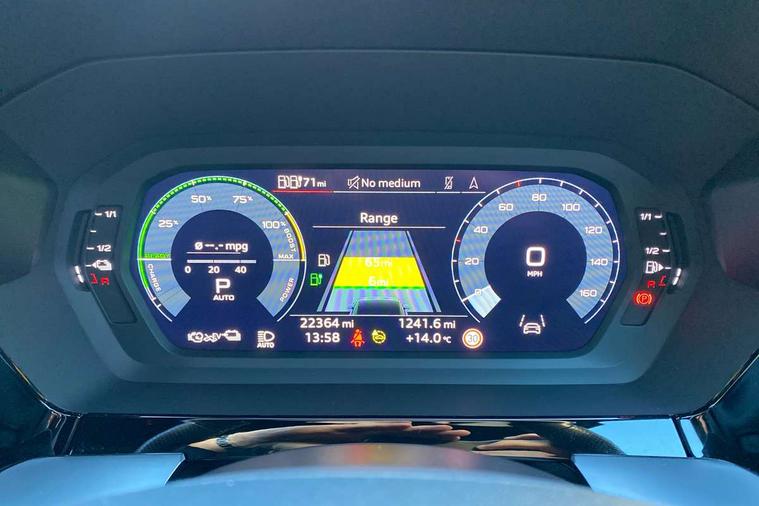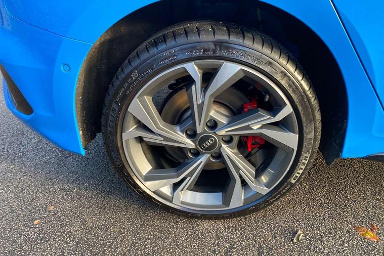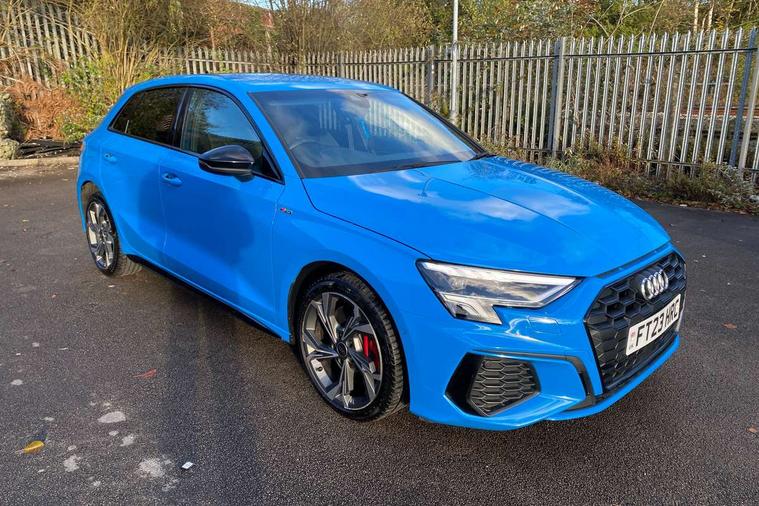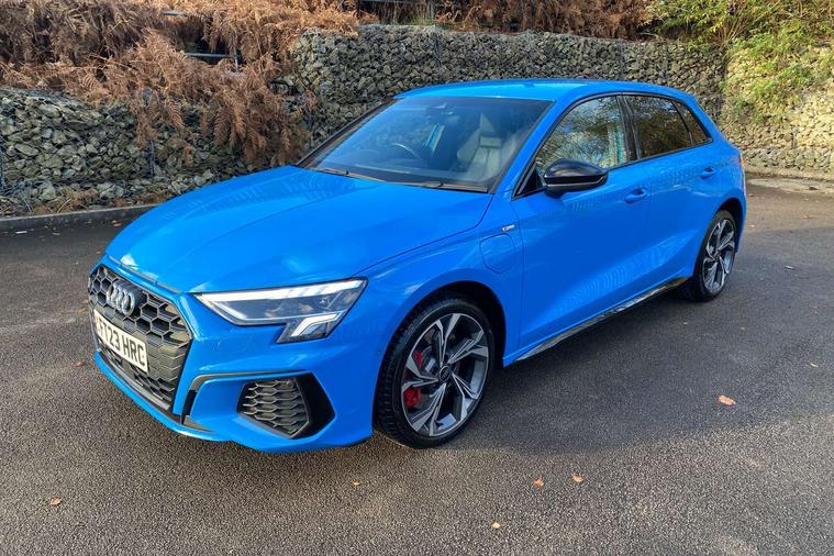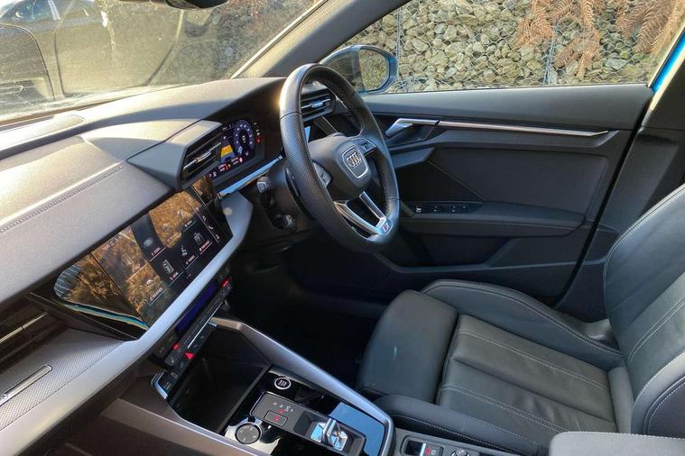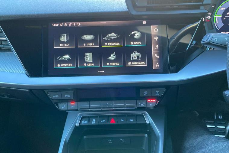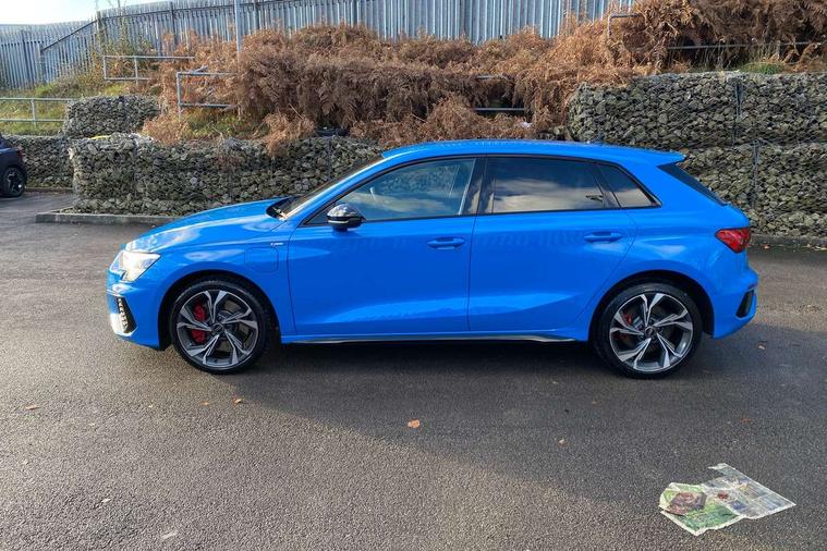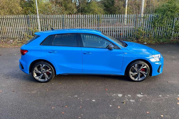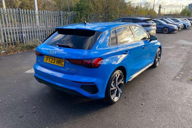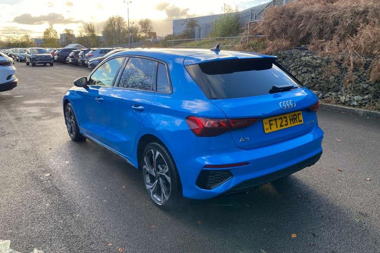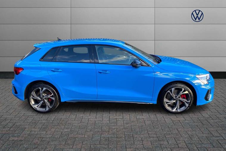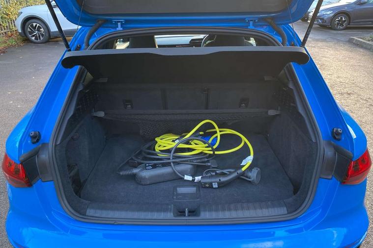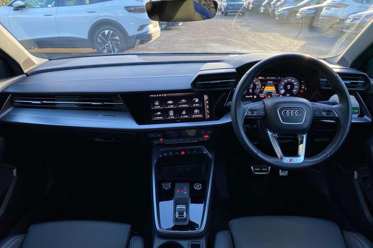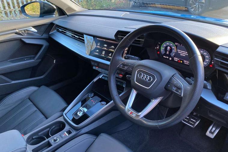 Audi drive select (Auto, Comfort, Dynamic, Efficiency and Individual), Audi smartphone interface, Audi Virtual Cockpit - 10.25" digital and colour instrument cluster, Automatic start/stop system with recuperation, Bluetooth interface, Camera based traffic sign recognition, Collision avoidance assistant, e-Call (emergency call), Electromechanical power speed sensitive steering, Lane departure warning system, MMI Navigation Plus with high resolution 10.1" colour touch screen display, Service indicator, Trip computer, Voice control system with natural language interaction, 2.9 kW On-board charger, 3 pin 10 amp domestic charging cable, Sports suspension, Type 2 mode 3 32 amp charging cable, Type 2 socket for AC charging, 2xUSB-C connection with data and charging functions, 6 passive loudspeakers, DAB Digital radio, 3rd brake light, Acoustic glass windscreen, Aluminium window trim, Auto dimming frameless rear view mirror, Electrically adjustable/heated/folding/auto dimming door mirrors with integrated LED indications + kerb view function for passenger side, Front electric windows, Illuminated aluminium inserts front door sills with S logo, LED daytime running lights, LED headlights with LED rear lights and dynamic rear indicators, Light and rain sensors, Privacy glass - dark tinted rear window, rear door and side windows, Rear electric windows, Rear side air outlets in grained matt black, Rear side wing doors, Rear wiper, S line bumpers, S roof spoiler, 12V socket and storage compartment in front centre console, 3 seat bench in 2nd row, 3 spoke leather multifunction steering wheel with paddle shift, 4 way electrically adjustable lumbar support for driver and front passenger, 60/40 split folding rear seat bench, Black cloth headlining, Dual zone electronic climate control, Front and rear centre armrest in leather, Front and rear headrests, Front/rear floor mats, Height and reach adjustable steering wheel, Interior lighting - glove compartment light and right hand side, Luggage compartment floor covering, Manual boot compartment lid, Manually adjustable front seats, Seat side bolsters, Single front passenger seat, Stainless steel pedals and front footrest in black, Twin leather upholstery with front sports seats S embossed logo, Aluminium interior elements pack - A3 Sportback, Black styling pack - A3 Sportback, LED interior lighting pack - A3 Sportback, S line styling pack - A3 Sportback, 3x3 point rear seat belts, Driver and front passenger airbag with passenger airbag deactivation, Electronic Stabilisation Control (ESC) including ABS, ASR and EDL, First aid kit with warning triangle and 2 safety vests, Front side airbags with head airbags and interaction airbag, Pre-sense front with pedestrian and cyclist detection, Red brake calipers, Seatbelt monitoring, Tyre pressure loss indicator, Anti theft alarm, Anti-theft wheel bolts, Electronically operated child lock, Immobiliser, Remote control central locking, Dark spectrum aluminium inlays, accent surfaces in the dashboard and centre console in platinum grey silk effect paint finish, Tool kit, Tyre repair kit,