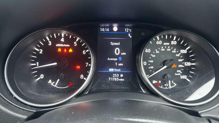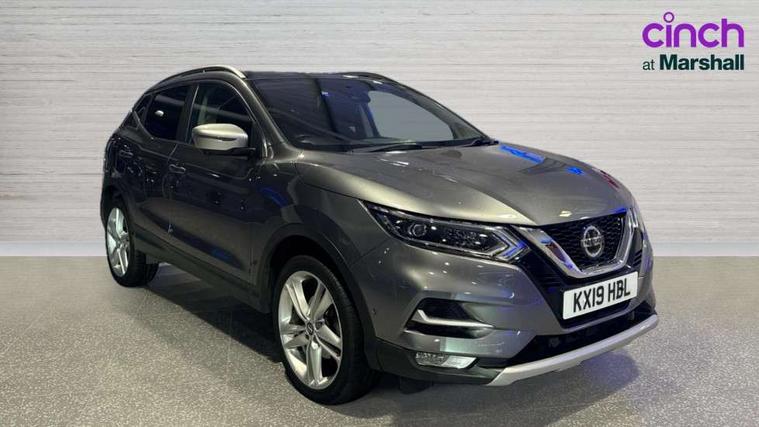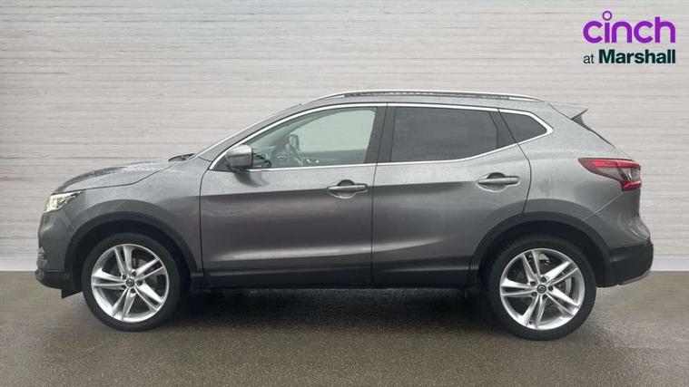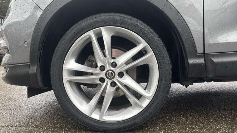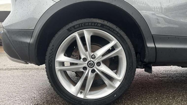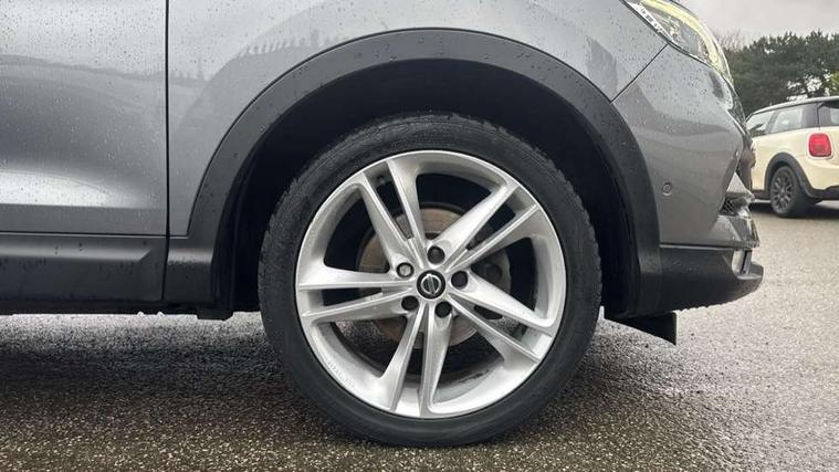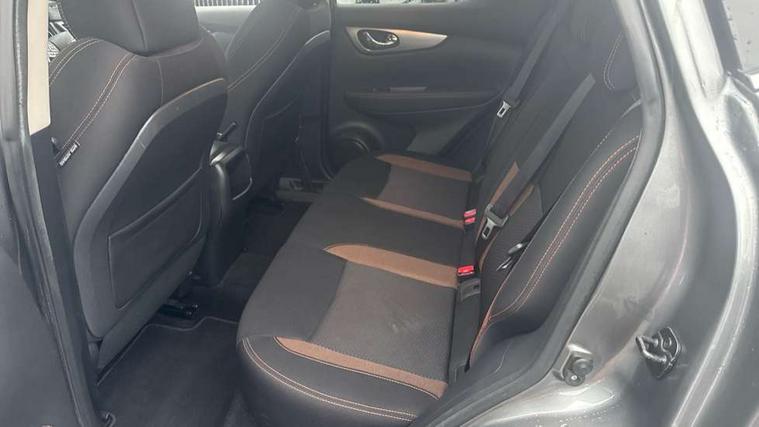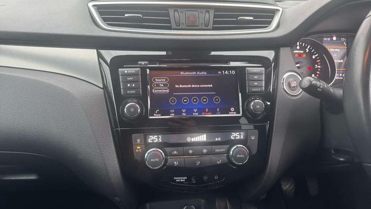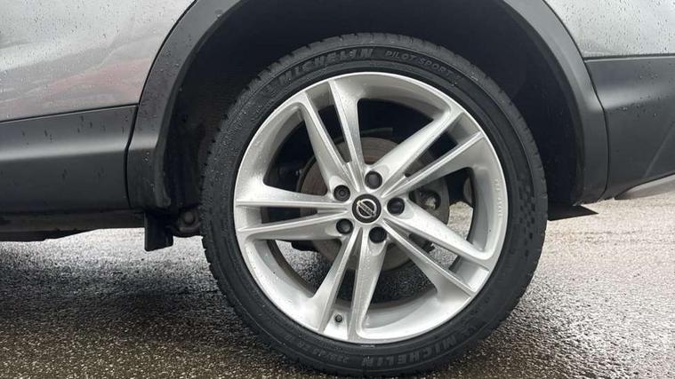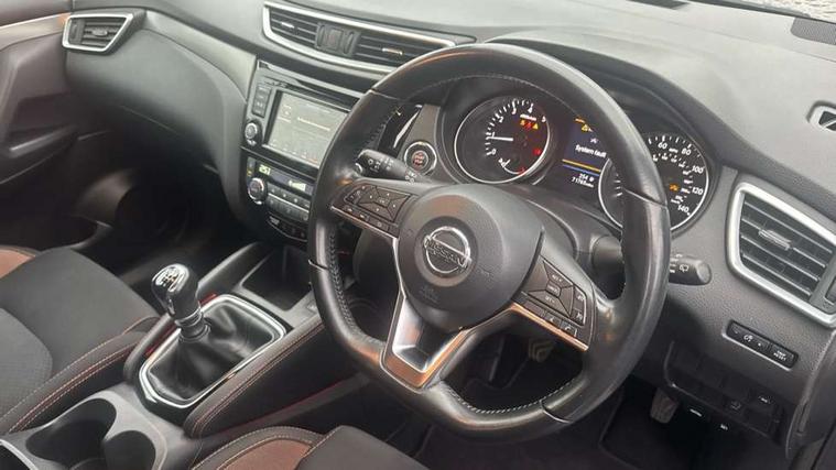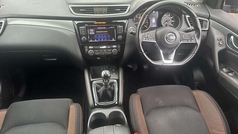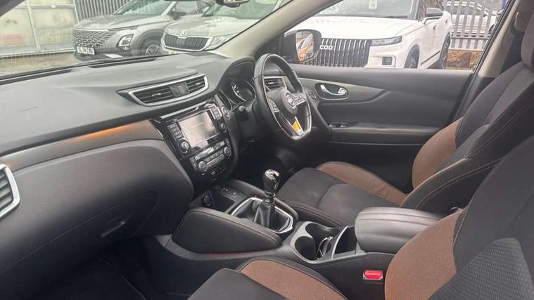 Advanced drive assist display 5'' TFT coloured screen, Android Auto, Apple CarPlay preparation, Bluetooth connectivity, Electric speed sensitive power steering, Front parking sensors, Intelligent around view monitor, Intelligent parking assist, Lane departure warning system, Nissan connect evo 7" touchscreen navigation and entertainment system, Normal or sport selectable steering, Outside temperature sensor, Push button starter, Rear parking sensors, Rear view camera, Service interval indicator, Smartphone integration, Stop/start system, Tomtom connected services, Traffic sign recognition, Trip computer, Voice control system, Nissan chassis control (intelligent ride control, intelligent trace control, intelligent engine brake), 6 speakers, AM/FM radio, CD audio system, Aux-in socket, DAB Digital radio, Steering wheel mounted audio controls, USB port, Anti dazzle rear view mirror, Auto wipers, Body colour bumpers, Body coloured door handles, Chrome window surround, Daytime running lights dip function when turn signal applied, Electric folding door mirrors, Electric front and rear windows with one touch illuminated window controls, Electric front/rear windows, Electrically adjustable door mirrors, Front fog lights, Heated door mirrors, High beam assist, Intelligent auto headlights, LED indicators in door mirrors, Matt silver roof rails, Panoramic opening glass sunroof, Privacy glass, Rear roof spoiler, Rear wiper with reverse link, Shark fin antenna, Underbody vortex generators, 2 X front 12v power sockets, 3 height adjustable rear headrests, 60/40 split folding rear seat, Ambient lighting in centre console, Boot lighting, Centre console storage box/armrest, Chrome interior door handles, Cloth upholstery, Configurable luggage board system, Dual zone climate control, Front and rear door pockets with bottle holders, Front and rear seat belt pre-tensioners with load limiters, Height adjustable front headrests, Individual rear seat reading lights, ISOFIX on outer rear seats, Leather D shaped steering wheel, Leather gear lever, Leather knee pad, Manual height adjustable front passenger seat, Manual lumbar support on passenger seat, Monoform front seats with plastic backboard, One touch electric shade, Parcel shelf stow function under luggage board, Pollen filter, Rear armrest with 2 cupholders, Synthetic leather wrapped door handle with contrasting stitching, Tilt/telescopic adjustable steering wheel, LED pack - Qashqai, Safety shield plus pack - Qashqai, 6 airbags - Driver, front passenger, curtain and side airbags, ABS, ESP, EBD and brake assist, Auto hold function, Child locks on rear doors, Electronic parking brake, Front and rear seat belt warning, Front passenger airbag deactivation, Height adjustable front seatbelts, Hill start assist, Intelligent emergency braking with pedestrian recognition, Three 3 point rear seatbelts, Tyre pressure monitoring system, Anti-theft immobiliser, Intelligent Key, Remote central locking, Thatcham Cat.1 alarm, Carbon graphite dash trim, 19" Ibiscus alloy wheels, Tyre puncture repair kit,