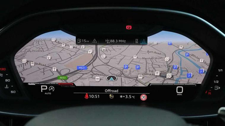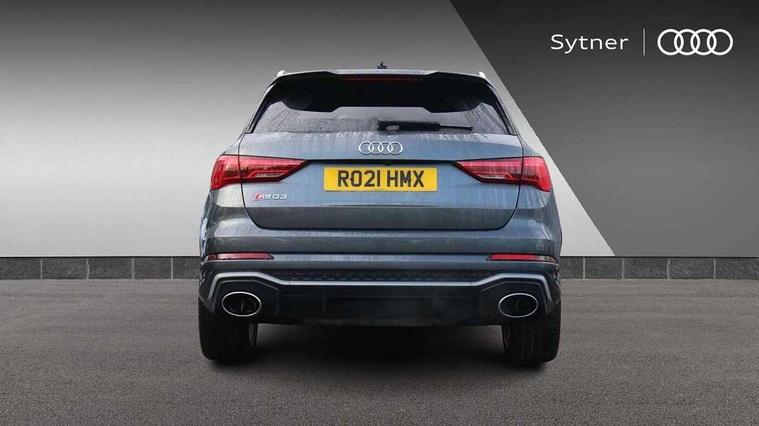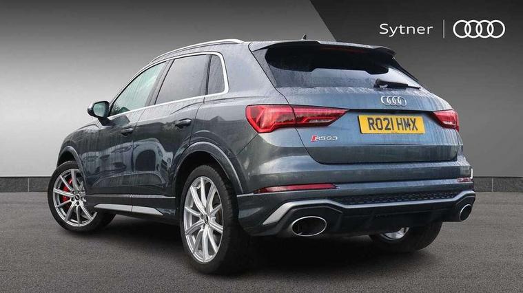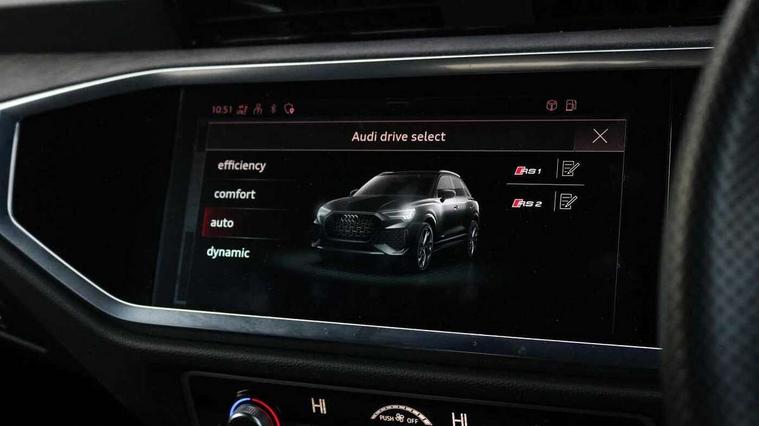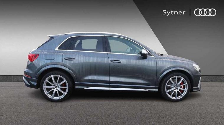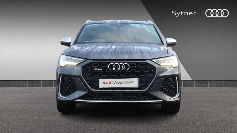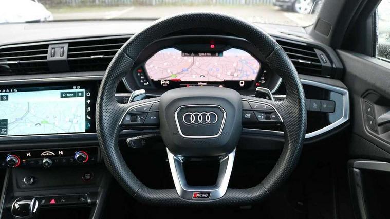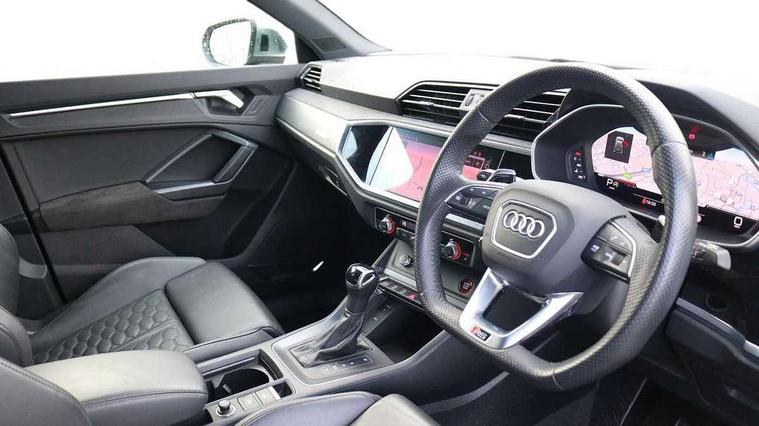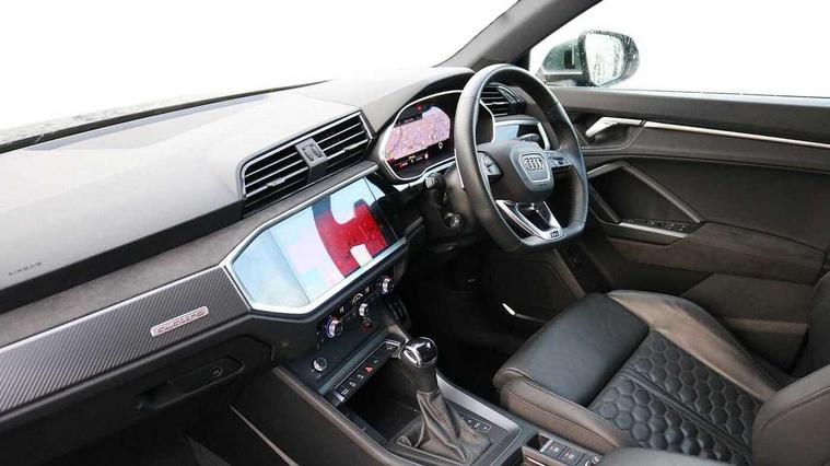 Audi connect safety and service (e-call), Audi drive select with new RS modes, Audi lane departure warning, Audi parking system plus with front and rear sensors, Audi smartphone interface includes wireless Apple carplay/Android Auto, Audi virtual cockpit plus - 12.3 inch display, Bluetooth interface, Camera based traffic sign recognition, MMI Navigation Plus with high resolution 10.1 inch touchscreen colour display, Power operated tailgate, Progressive steering, Start stop system with recuperation, Voice control system with natural language interaction, Quattro all wheel drive, 2 USB-C ports with charge and data functions, Audi sound system, DAB digital radio module, Acoustic windscreen, Aluminium roof rails, Aluminium window trim, Audi Beam uses LEDs to project the Audi Sport logo, Auto dimming frameless rear view mirror, Body colour rear spoiler, Electrically folding, adjustable and heated door mirrors with integrated LED side indicators and kerb view function for passenger side, Flared wheel arches, Flat slits on single frame grille, Front spoiler blade, side blades, inserts on door trim strips and diffuser insert in matt aluminium look, Headlight washers, High gloss black finish B and C pillars, Honeycomb radiator grille in gloss black, Illuminated door sill trims with RS logo, LED headlights with LED daytime running lights and dynamic rear indicator, LED rear lights, Privacy glass dark tinted rear and rear-side windows (from B-pillar backwards), Rain and light sensors, RS specific bumpers with large front air inlets in black, 4 way electric lumbar support for driver and front passenger, Adjustable rear seat bench/backrest with centre armrest and cupholder, Black Alcantara elements - dashboard and the armrests in the front and rear doors, Black cloth headlining, Dual zone electronic climate control, Electrically adjustable front seats, Fine Nappa leather upholstery with front sports seats + honeycomb stitching and RS embossed logo, Front and rear floor mats, Front and rear head restraints, Front centre armrest, Heated front seats, ISOFIX child seat mounting for front passenger with airbag deactivation and outer rear seat including top tether attachment point for outer rear seats, Stainless steel luggage compartment sill finisher, Stainless steel pedals, Tool kit, Ambient lighting pack - RS Q3, Non smoking pack - RS Q3, 3x3 point rear seatbelts, 6 airbags - Driver, front passenger, curtain and side windows, Audi pre-sense front with pedestrain and cyclist recognition, Electrically operated child locks on rear doors, Electromechanical parking brake, Electronic stabilisation control including ABS, ASR and EDL, Hill descent control, Hill hold assist, Pre sense basic, RS brake system, Seatbelt monitoring, Tyre pressure warning, Warning triangle and first aid kit, Advanced key, Anti theft alarm, Anti theft wheel bolts, Aluminium look interior elements, Detail dashboard around MMI touch colour display in glass look, black with surround in aluminium look, Inlays in aluminium race anthracite, Tyre repair kit,