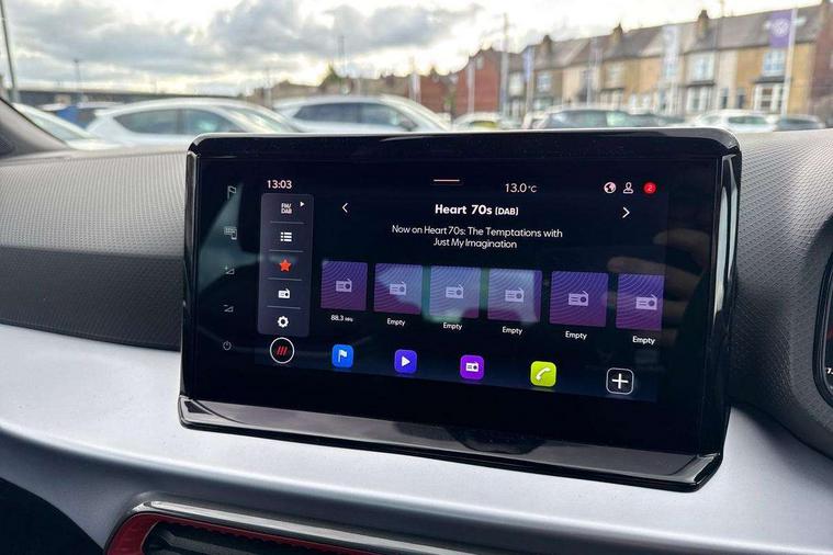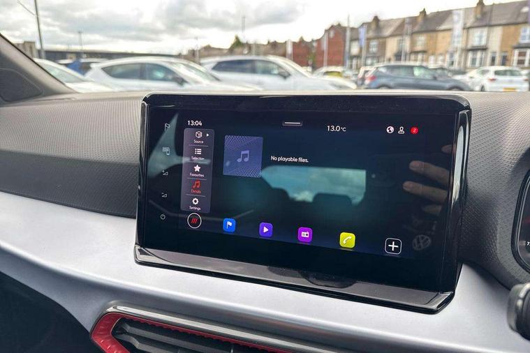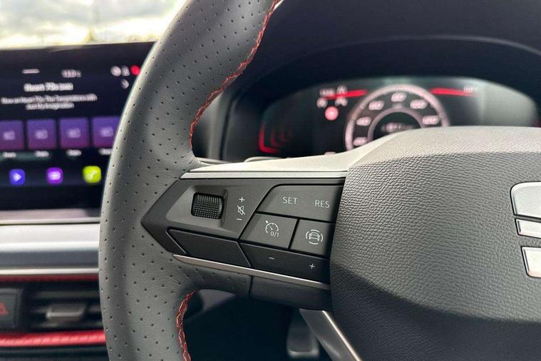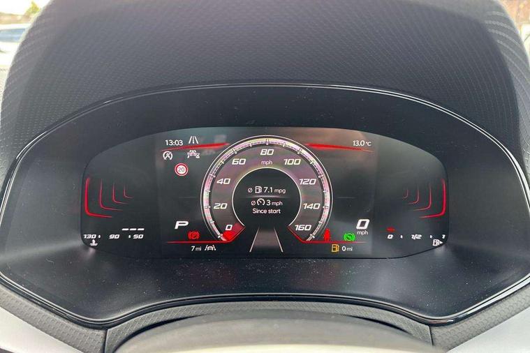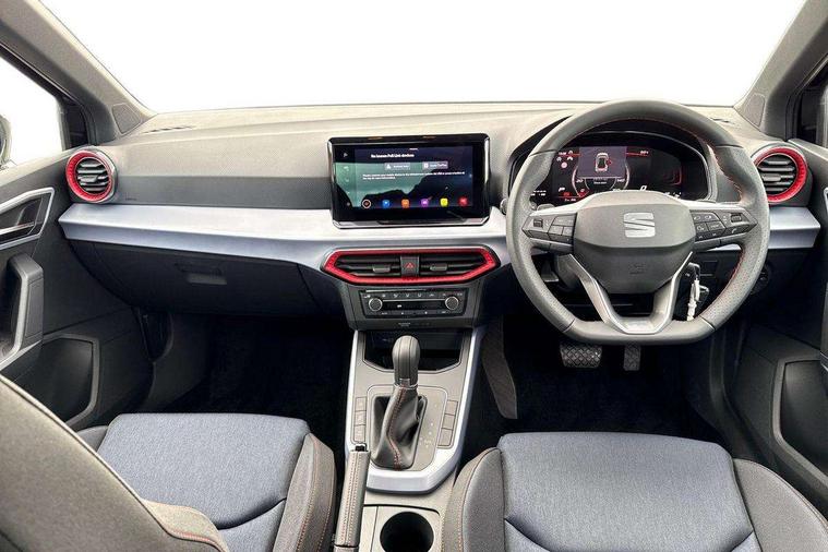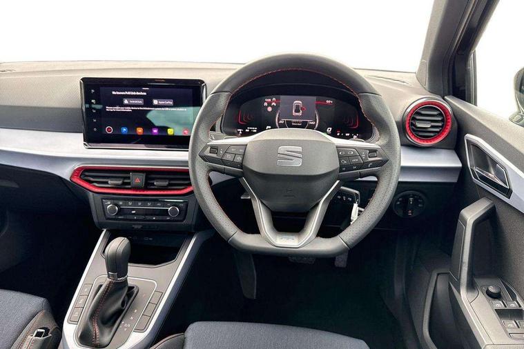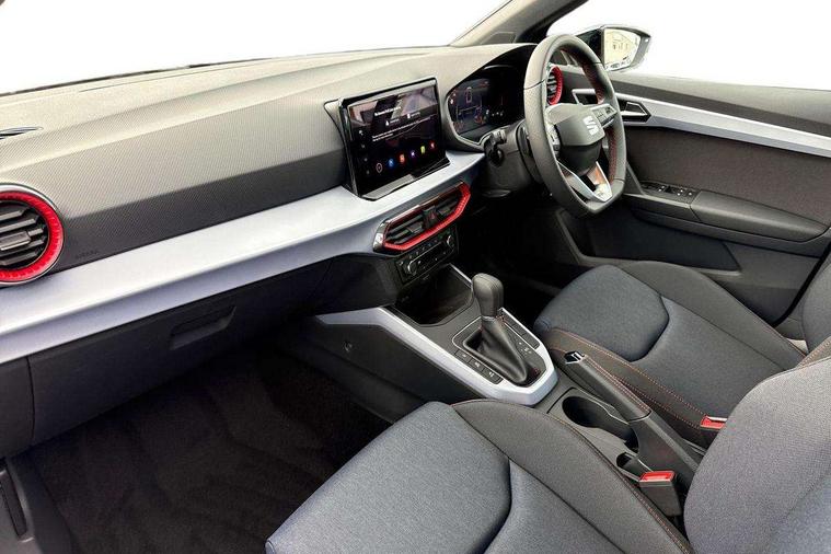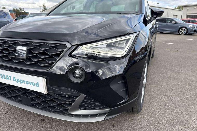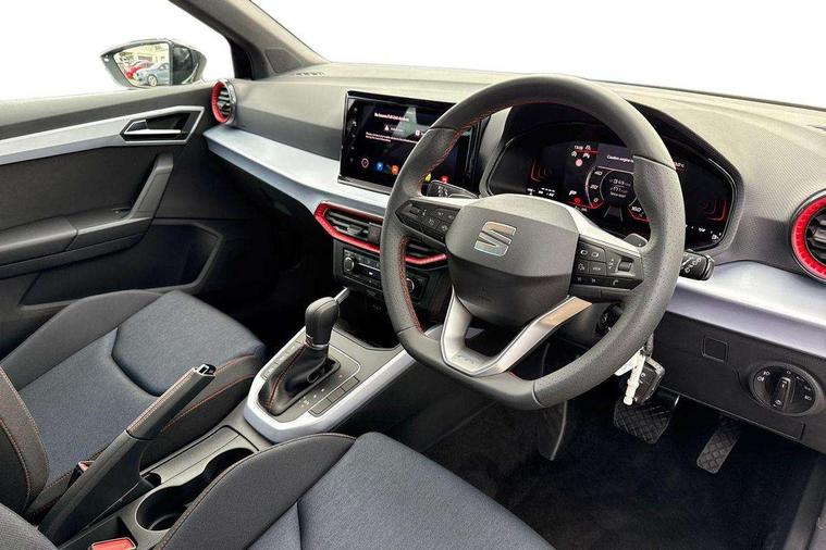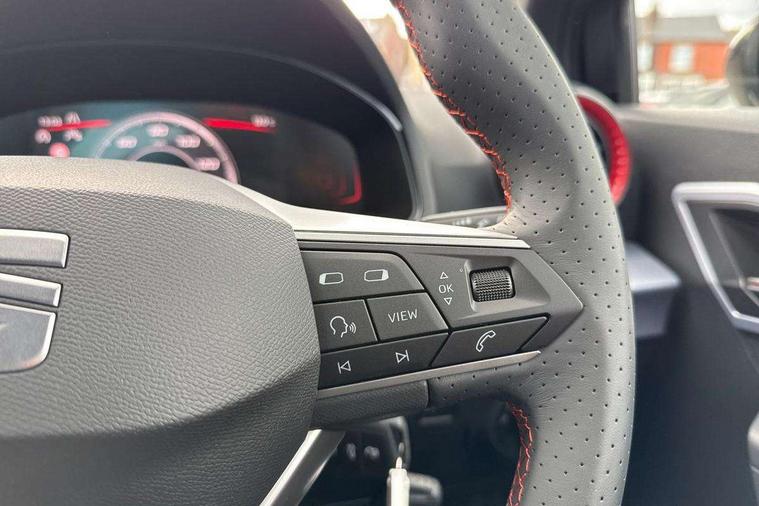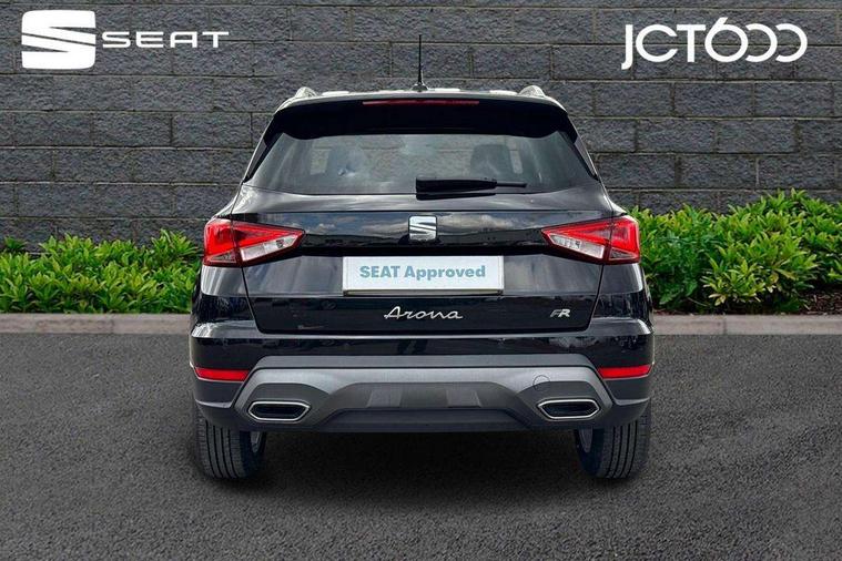 'Lights On' Reminder warning buzzer, 8" Digital cockpit, Digital clock, E-call, Electric speed sensitive power steering, Full link smartphone integration with mirror link, wireless apple carplay, Google android auto + USB Type C cable for apple and android devices, Lane keeping system, Low fuel warning light, Outside temperature display, RPM counter, SEAT Drive profile - Four different models normal-sport-eco-individual, steering response, throttle response and gear shifts mode, Trip computer, Wireless phone charger, 9.2" colour touchscreen with navigation system, voice control and USB port (type c), Bluetooth interface for hands free and audio streaming, DAB digital radio and AM/FM radio, Steering wheel mounted audio controls, Anti theft roof antenna, Auto dimming interior rear view mirror, Automatic activation of hazard warning lights, Body coloured bumpers, Body coloured door handle inserts, Chrome roof rails and window surrounds, Dark tinted rear windows, Electric front/rear windows, Electrically adjustable, heated and folding door mirrors, Front fog lights with cornering function and rear fog light, FULL LED automatic headlights with dynamic headlight range control, coming and leaving home, LED daytime running lights, LED rear tail lights and licence plate lights, Protective side mouldings, Rain sensing wipers, Rear side wing doors, Rear spoiler, Rear window wash/wipe, Roof colour door mirrors, Third brake light, Twin exhaust pipe styling hidden exhaust pipe, Visible VIN plate, 2 cupholders, 3 seat bench in 2nd row, 60/40 split folding rear seat, Aircare filter, Black interior roof, Cloth upholstery, Double boot floor, Driver sunvisor with covered mirror + card holder, Dual zone climate control, Front courtesy light with front reading lights, Gear shift indicator, Height adjustable front seats, Height/reach adjustable steering column, Illuminated air vent surrounds, Illuminated boot, Instrument lighting with brightness control, Interior ambient lighting, Interior light in footwell, central console and door panel, ISOFIX points in outer rear seats with top tether anchorage points, Passenger sunvisor with vanity mirror, Perforated flat bottomed leather steering wheel/gear knob/handbrake with red stitching and FR logo, Potentiometer, Single front passenger seat, Steering wheel mounted gearshift paddles, Two front and three rear height adjustable headrests, Interior chrome pack - Arona, Safe and driving pack (S) - Arona, 3 point seatbelts on all rear seats, ABS, Active front headrests, Child locks on rear doors, Driver and front passenger airbags with front passenger airbag de activation, front side and curtain airbags, Emergency Brake Assist (EBA) and front assist, Front and rear seatbelt reminder, Hill hold control, Multi-Collision braking, Tiredness recognition system, Traction control, Tyre pressure monitoring system, Alarm with back up horn with tow away protection, Deadlock, Electronic engine immobiliser, Locking wheel bolts, Remote central locking, Titan black dashboard, 17" Dynamic alloy wheels,