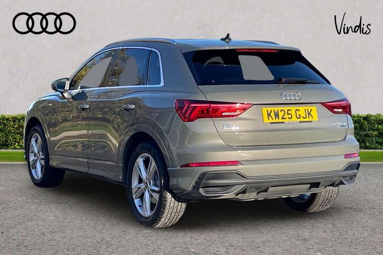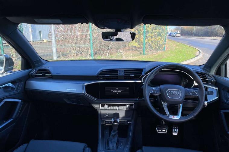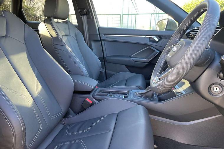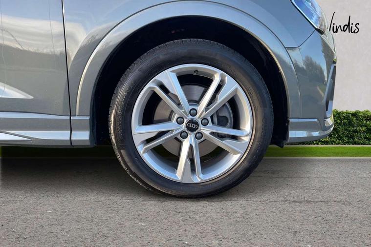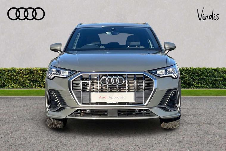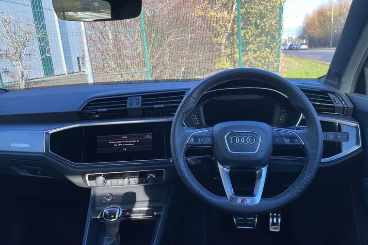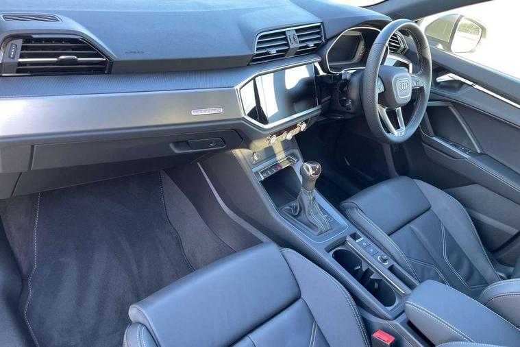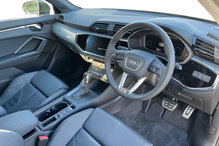 Amazon alexa Integration, Audi connect safety and service, Audi drive select, Audi lane departure warning, Audi Virtual Cockpit - 10.25" display, Bluetooth interface, Camera based traffic sign recognition, Distraction and Fatigue warning, Legal emergency call, MMI Navigation Plus with high resolution 10.1 inch touchscreen colour display, Power operated tailgate, Progressive steering, Service interval indicator, Smartphone interface includes wireless Apple carplay/Android Auto, Start stop system with recuperation, Voice control system with natural language interaction, Sports suspension, 2 USB-C ports with charge and data functions, 6 passive loudspeakers, DAB digital radio module, Acoustic windscreen, Aluminium roof rails, Aluminium window trim, Anthracite black radiator grille, Auto dimming door mirrors, Auto dimming frameless rear view mirror, Body colour front spoiler blade, Electrically folding, adjustable and heated door mirrors with integrated LED side indicators and kerb view function for passenger side, Front and rear electric windows, Front fog lights, Front side air inlets in matt platinum grey, Grille vertical bars in aluminium silver/Matt, High gloss black finish B and C pillars, LED Dynamic rear indicators, LED headlights with LED daytime running lights, LED rear lights, LED third brake light, Privacy glass dark tinted rear and rear-side windows (from B-pillar backwards), Rain and light sensors, Rear diffuser grille in grained matt black, Rear diffuser strip in matt anthracite black, Rear side wing doors, Rear wiper, S line badges on front wings, S line front and rear bumpers and side skirts in contrasting Manhattan grey paint finish, Side skirt insert in matt Platinium grey, Variable front intermittent wipers, 12V socket in rear centre console, 3 seat bench in 2nd row, 3 spoke leather multifunction steering wheel features S badging and grips in perforated leather with contrast stitching, 40:20:40 folding with manual adjustment for 60:40 forwards/backwards position and backrest angle, Adjustable rear seat bench/backrest with centre armrest and cupholder, Black cloth headlining, Dual zone electronic climate control, Electric lumbar support, Front and rear black floor mats with contrast stitching in rock grey, Front and rear headrests, Front centre armrest, Height and reach adjustable steering wheel, Illuminated door sill trims with S logo, ISOFIX child seat mounting for front passenger with airbag deactivation and outer rear seat including top tether attachment point for outer rear seats, Manual front seats with height adjustment, Perforated leather gearknob, Single front passenger seat, Stainless steel luggage compartment sill finisher, Stainless steel pedals, Twin leather upholstery with front sport seats + S embossing, Non smoking pack - Q3, 3x3 point rear seatbelts, 6 airbags - Driver, front passenger, curtain and side windows, Audi pre-sense front with pedestrain and cyclist recognition, Electrically operated child locks on rear doors, Electromechanical parking brake, Electronic stabilisation control including ABS, ASR and EDL, Front seatbelt reminder, Hill descent control, Hill hold assist, Pre sense basic, Seatbelt monitoring, Tyre pressure warning, Warning triangle and first aid kit, Anti theft wheel bolts, Immobiliser, Remote central locking, Thatcham approved category 1 anti theft alarm, Aluminium look interior elements, Dark matt brushed aluminium inlay, Detail dashboard around MMI touch colour display in glass look, black with surround in aluminium look, Leatherette door armrest,