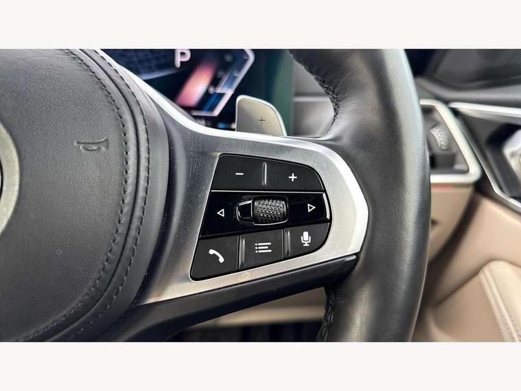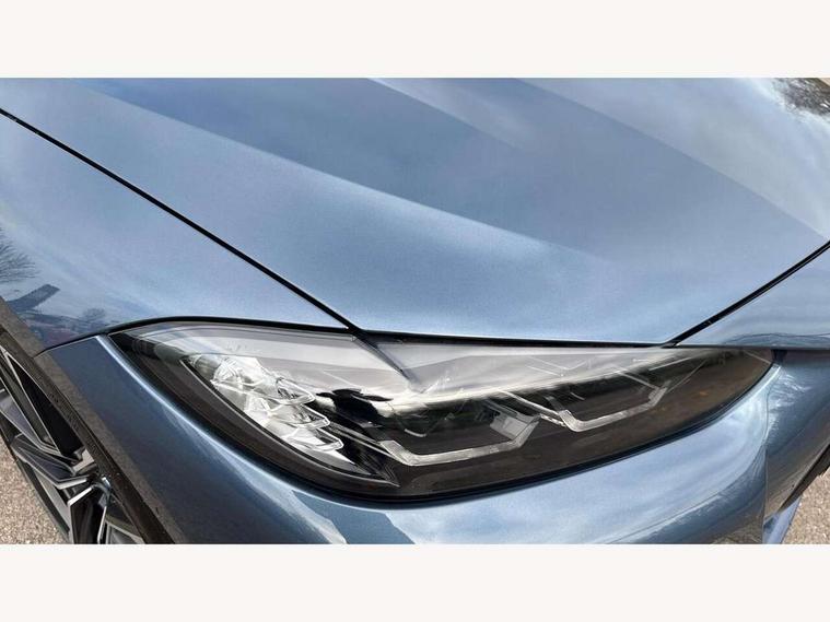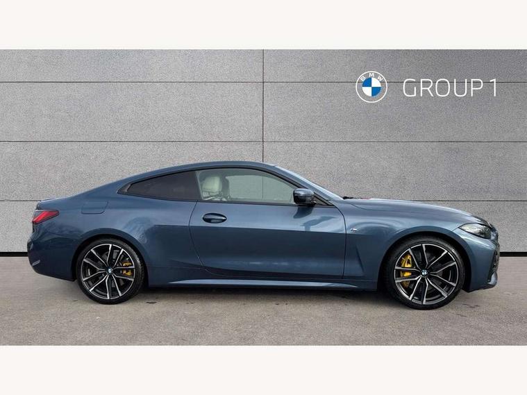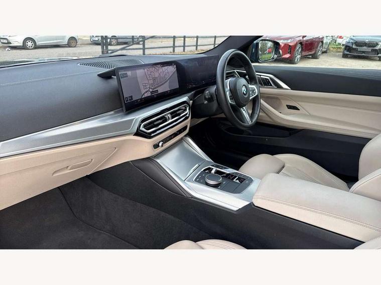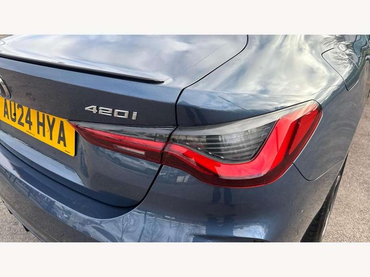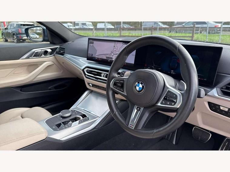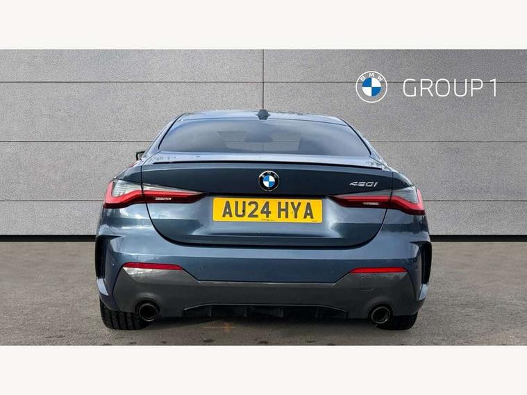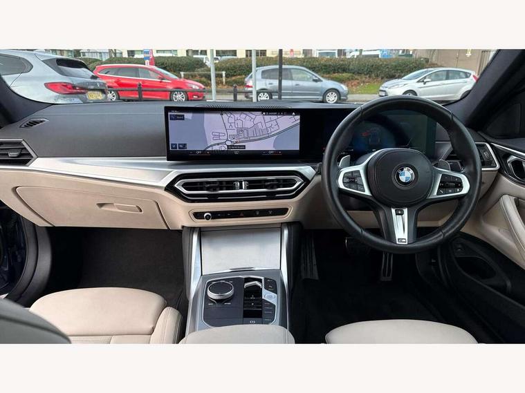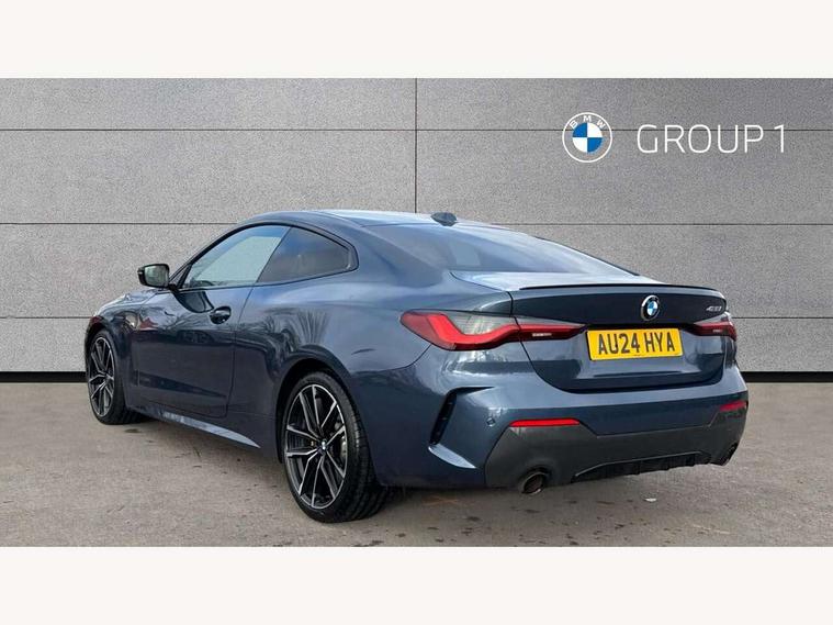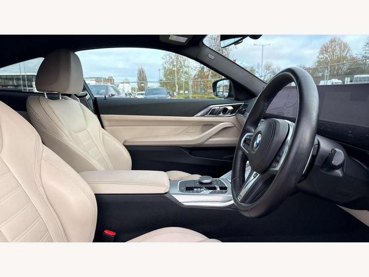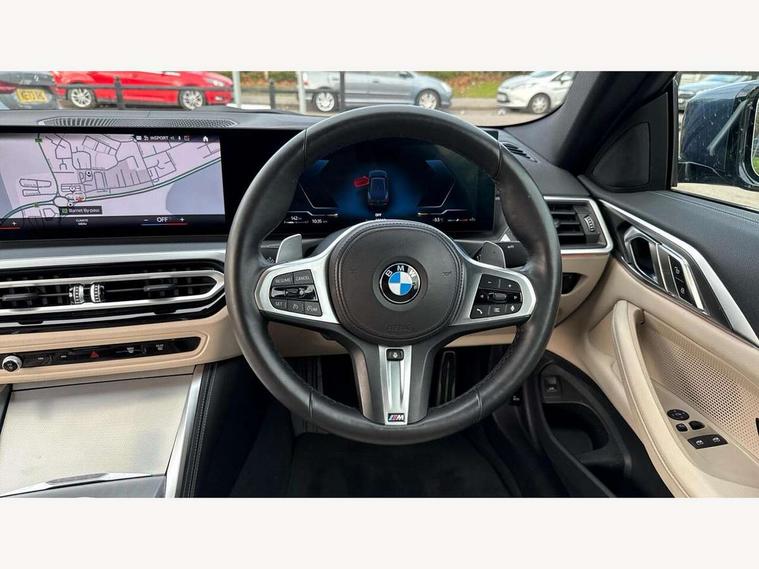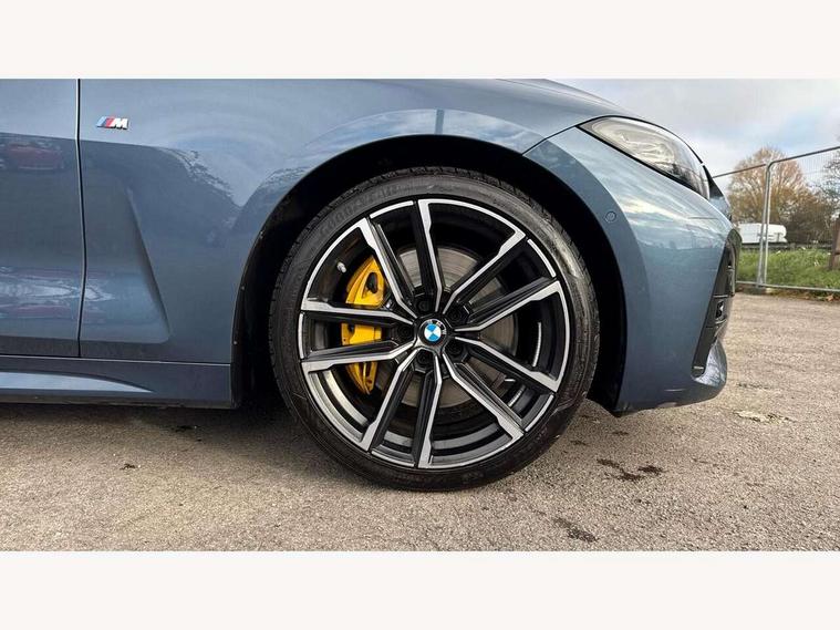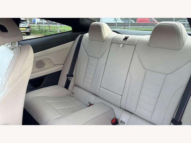 Active guard plus, Attentiveness assist, Auto start-stop, Bluetooth hands free facility with USB audio interface with audio streaming, BMW ConnectedDrive online services, BMW iDrive controller on centre console, BMW Live Cockpit Plus Nav-12.3" instrument&14.9" control Widescreen curved display/Intelligent Voice Assist/iDrive touch/Access 3rd party app/4G LTE, BMW service history, BMW Teleservices, Brake pad wear indicator in front and rear, Check Control warning system for monitoring of lights and door/luggage compartment open warning, Condition based service, Electric power steering with Servotronic steering optimised at all speed ranges, Gearshift time display in manual mode, Instrument cluster with speedometer with mph readout, tachometer, fuel gauge and oil temperature gauge, Integrated owners handbook, Oil sensor for level and grade, warning by check control system, On board computer - average speed, fuel consumption, outside temp display with acoustic warning, clock/date, service interval, odometer/trip meter, Optimum shift indicator, Run flat indicator, Shifting point display, Smartphone integration compatible with Apple CarPlay and Android Auto, Variable sport steering, 8 speed automatic steptronic transmission with gearshift paddles, Balanced 50/50 weight distribution, Double joint spring strut front axle, Double VANOS, Drive performance control - ECO PRO, comfort and sport modes, High precision injection, Low centre of gravity, Petrol Particulate Filter, Stroke dependent dampers, VALVETRONIC engine management, 1x USB type A with data transfer and 1.5 Amp charging function in the centre console, 1x USB type C with 3 Amp charging function in the front centre armrest, DAB tuner, Electronic service booklet, Acoustic glazing, Automatic headlight beam throw control with load dependent regulating reaction, dynamic compensation of braking dive and acceleration squat, Automatic windscreen wipers and automatic headlight, Automatically dimming electrochromatic rear view mirror, BMW emblem on engine compartment lid and tailgate, BMW kidney grille with mesh grille front side of the nuggets in matt aluminium and frame in chrome high gloss, Body colour fuel filler flap, Body colour roof fin, Brushed aluminium inserts in the front door sill finishers with BMW designation, Door sill strips, Dynamic brake lights, Electric windows - front and rear, with open/close fingertip control, anti trap facility and comfort closing function all round, Exterior mirrors - electrically folding with anti-dazzle, Fading support, Follow me home headlights, Front and rear bumper system, Front apron plastic in body colour, Green tinted heat protection glazing, High gloss shadow line exterior trim, Illuminated bow type door handles in body colour drivers side with door lock, Interior rear view electrochromatic mirror with automatic anti dazzle function, LED 3rd brake light, LED daytime running lights, LED front fog lights, LED front indicators, Licence plate panel integrated into front bumper and tailgate, Lightweight engineering, M designation on front side panels, left and right, M rear boot spoiler, One piece front bumper cover including towing eye cover in body colour, Preparation for high beam assistant, Rear boot, Reversing light, Side frame decorative moulding black matt, Two part LED tailights in L-shape with components in smoked glass, brake light, LED turn indicator and rear fog light, Visible exhaust tailpipe finisher, Visible VIN plate, Welcome lights in interior and door handle area, Widened track and increased camber values for max transverse dynamics, agility and steering precision, Window recess finisher strip in matt black, Windscreen wipers with integrated heated washing jets, 12V power socket in front centre console, 2 front cupholder in centre console with clamping elements and matt black inlay, 2 Rear seat headrests, 2 seat bench in second row, 3 spoke flat bottom M sport leather multifunction steering wheel, 3 zone automatic air conditioning, 4 pieces lashing eyelets in luggage compartment, 40:20:40 split folding rear seat and rear centre armrest with two cupholders, Anthracite headlining, Armrest integrated in front and rear door trim + front centre console armrest, Battery in luggage compartment, BMW ID, Extended storage - Luggage compartment partition net on left side trim panel, Bag hook on both sides of the luggage compartment, Four grab handles integrated in roof lining, Front and rear door pockets, Front and rear reading lights, Heated driver and front passenger seats, Height adjustable front headrests, Height adjustable mechanically and infinitely variable steering column, Illuminated armrest storage compartment, Illuminated glove compartment with separate small compartment, Luggage compartment light, Make-up mirror lights, Single front passenger seat, Storage compartment in rear centre console, Sunvisors with illuminated vanity mirrors and ticket pocket, Through load system, Toolkit located in luggage compartment, Velour front floor mats, Ambient lighting pack - 4 Series, Connected professional package - 4 Series, M sport exterior styling pack - 4 Series, 2 x 3-point rear seatbelts, Battery safety cut-off, BMW emergency call, Brake energy regeneration, Braking pre-tensioning, Child seat ISOFIX attachment for the two outer rear seats, Coasting in idle in ECO PRO mode, Cornering brake control (CBC), Crash sensor activating of airbags, Unlocking doors, hazard warning lights, interior light, safety battery terminal, Driver and front passenger side airbags, integrated in the door side seat backrest bolsters for all seat variants, Driver/Front Passenger airbags, Dry braking, Dynamic brake control, Dynamic stability control + (DSC+) - Anti-lock Braking System (ABS) with brake assist and cornering brake control + Automatic Stability Control (ASC), Dynamic Traction Control - DTC, Electric parking brake including automatic hold function and automatic release of the parking brake when driving off