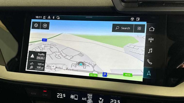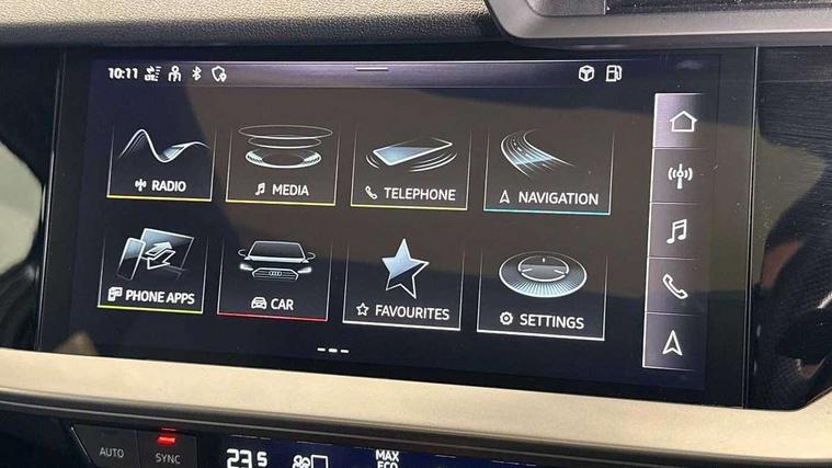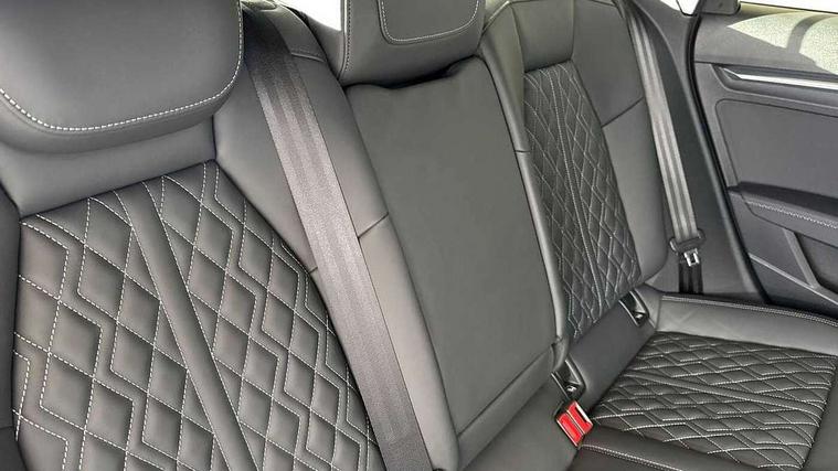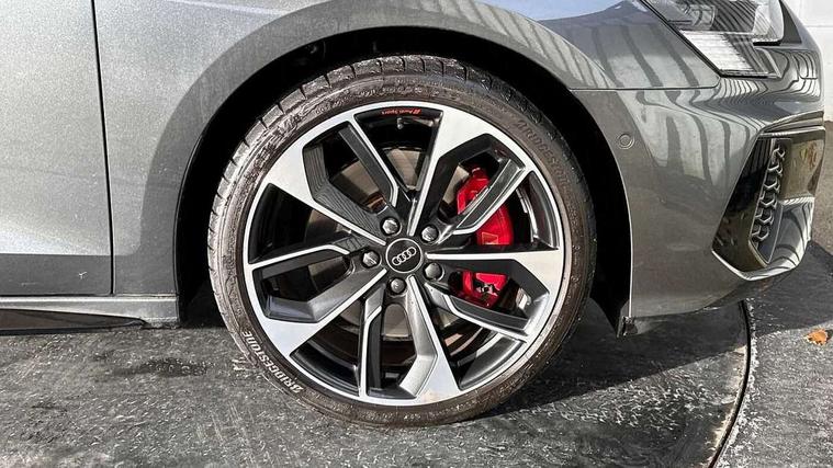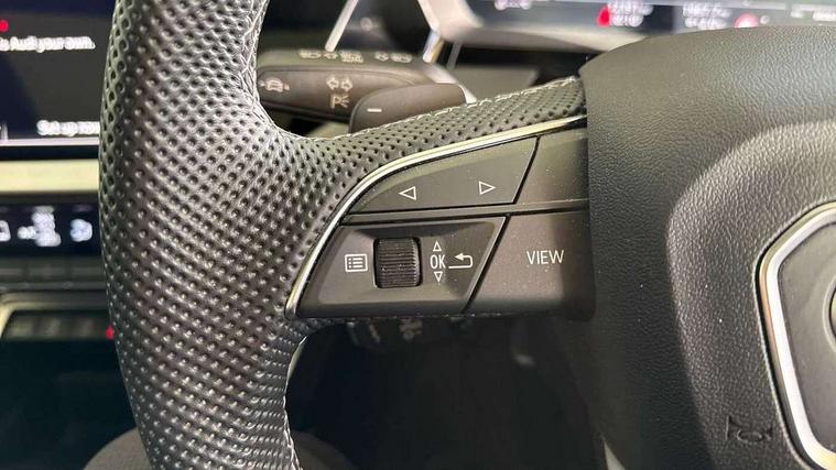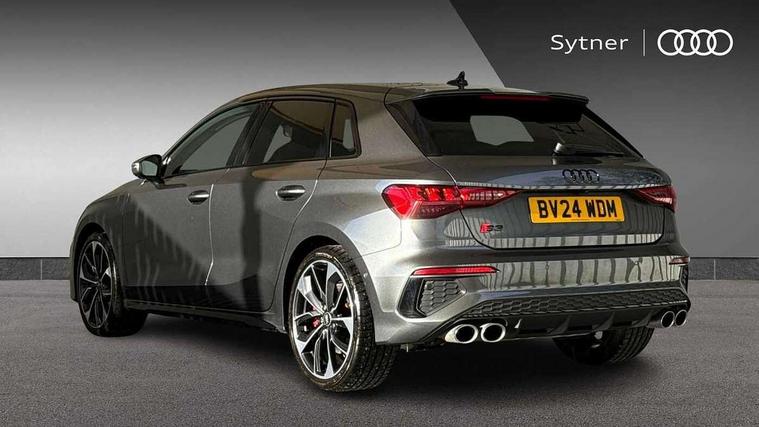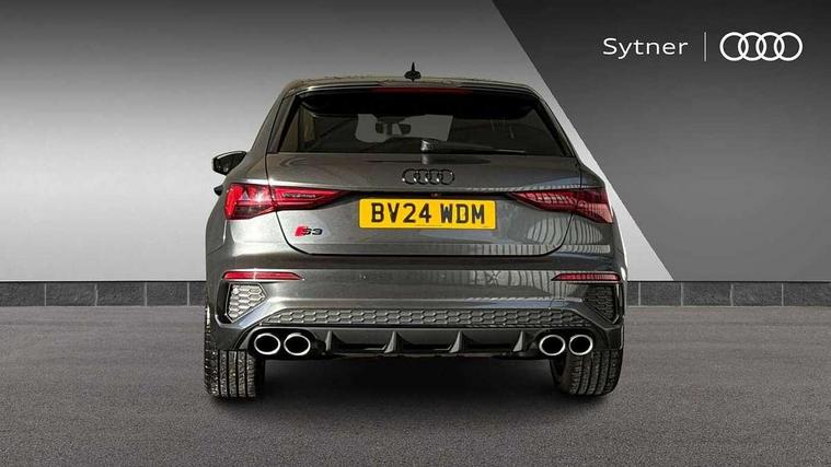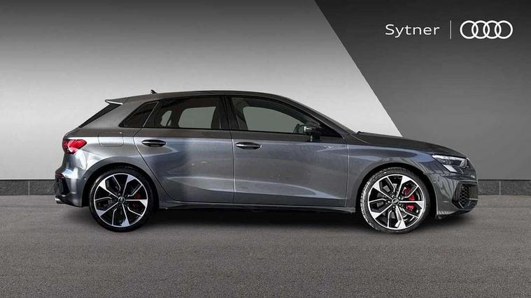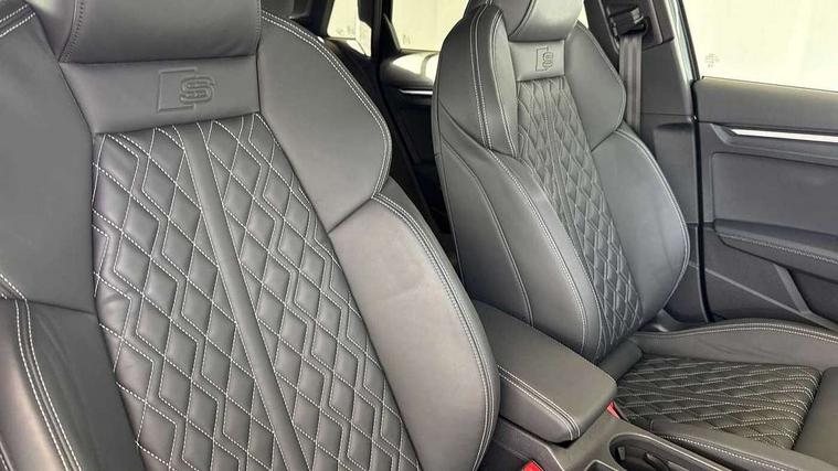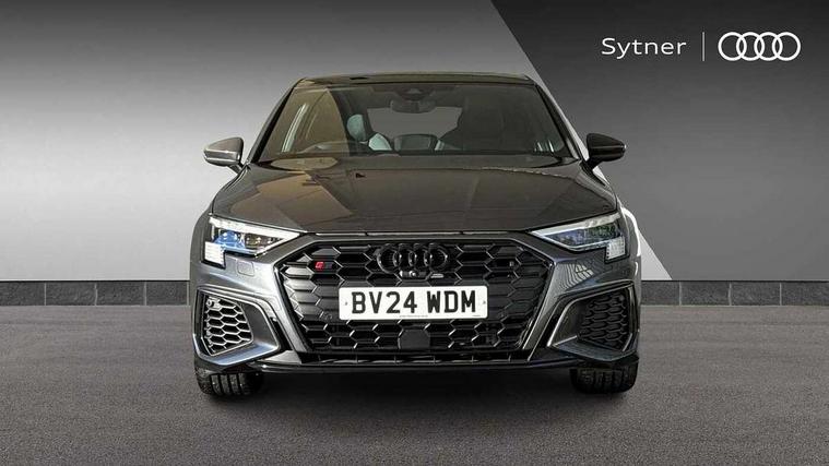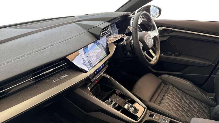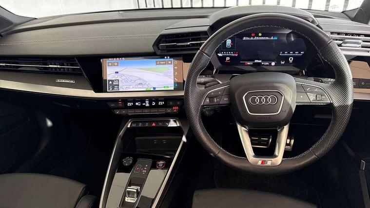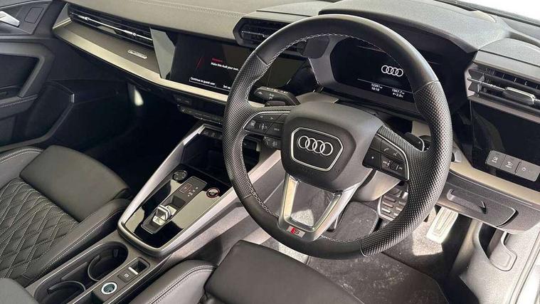 Adaptive cruise assist, Audi drive select (Auto, Comfort, Dynamic, Efficiency and Individual), Audi smartphone interface, Audi virtual cockpit plus - 12.3" full HD resolution dynamic digital instrument cluster, Automatic start/stop system with recuperation, Bluetooth interface, Collision avoidance assistant, e-Call (emergency call), Head up Display, Lane change assistant with exit warning system and rear cross traffic alert, Lane departure warning system, MMI Navigation Plus with high resolution 10.1" colour touch screen display, Power operated tailgate - Luggage compartment lid opens/closes electrically, Progressive steering, Service indicator, Trip computer, Voice control system with natural language interaction, Quattro permanent all wheel drive, S suspension with damper control, 2xUSB-C connection with data and charging functions, DAB Digital radio, 3rd brake light, Acoustic glass windscreen, Audi Beam uses LEDs to project Vorsprung onto the ground as you exit your S3, Auto dimming frameless rear view mirror, Carbon door mirror housings, Dual branch oval twin tailpipes in chrome plated finish, Electrically adj heated/folding + automatically dimming exterior mirrors with memory + automatic kerb side function for passenger side exterior mirror, Front electric windows, Headlight washers, Heat insulating glass windscreen, Illuminated door sills with aluminium inserts at the front with S logo, Integrated LED indicators in door mirrors, LED daytime running lights, Light and rain sensors, Privacy glass - dark tinted rear window, rear door and side windows, Rear electric windows, Rear side air outlets in grained matt black, Rear side wing doors, Rear wiper, 12V socket and storage compartment in front centre console, 3 seat bench in 2nd row, 3 spoke leather multifunction steering wheel with gear shift paddles, 4 way electrically adjustable lumbar support for driver and front passenger, 60/40 split folding rear seat bench, Black cloth headlining, Dual zone electronic climate control, Fine Nappa leather upholstery with front sports seats S embossed logo, Front and rear centre armrest in artificial leather, Front and rear headrests, Front/rear floor mats, Height and reach adjustable steering wheel, Interior lighting - glove compartment light and right hand side, Luggage compartment floor covering, Seat side bolsters, Single front passenger seat, Stainless steel pedals and front footrest in black, Aluminium interior elements pack - A3 Sportback, Black styling pack - A3 Sportback/S3, Body styling design pack - S3, Extended ambient lighting pack - A3 Sportback, Storage pack - A3 Sportback, Technology pack pro with 360 camera - A3 Sportback/Voursprung, 3x3 point rear seat belts, Driver and front passenger airbag with passenger airbag deactivation, Electronic Stabilisation Control (ESC) including ABS, ASR and EDL, First aid kit with warning triangle and 2 safety vests, Front side airbags with head airbags and interaction airbag, Pre-sense front with pedestrian and cyclist detection, Seatbelt monitoring, Tyre pressure loss indicator, Anti theft alarm, Anti-theft wheel bolts, Electronically operated child locks, Immobiliser, Remote control central locking, Carbon inlays, accent surfaces in the dashboard and centre console in platinum grey silk effect paint finish,
