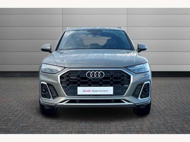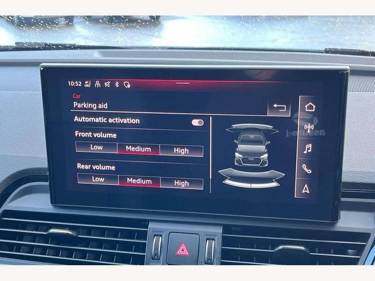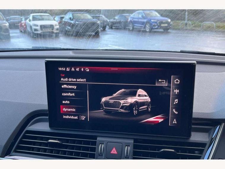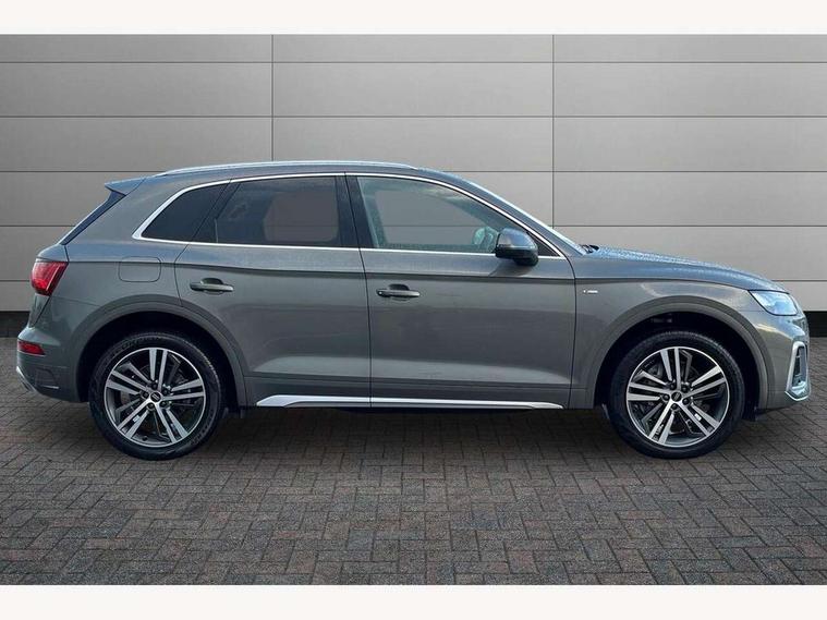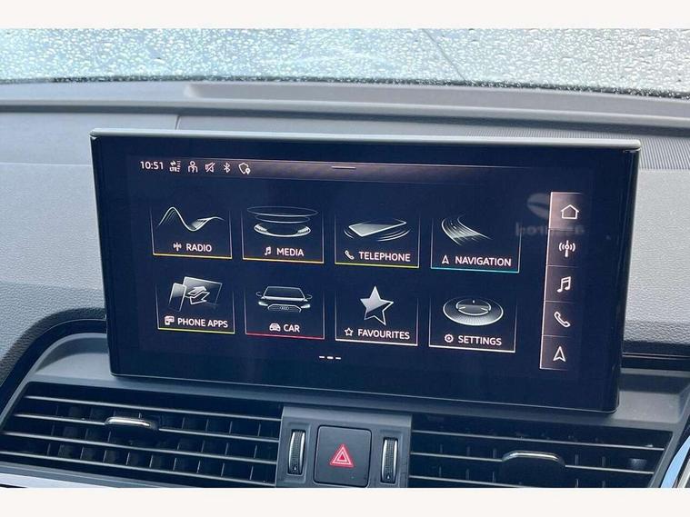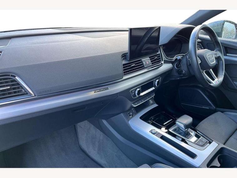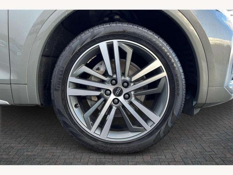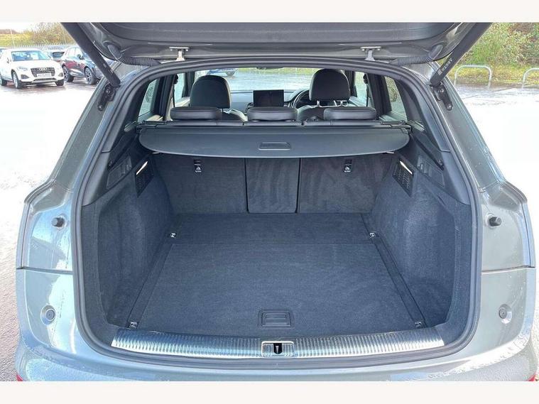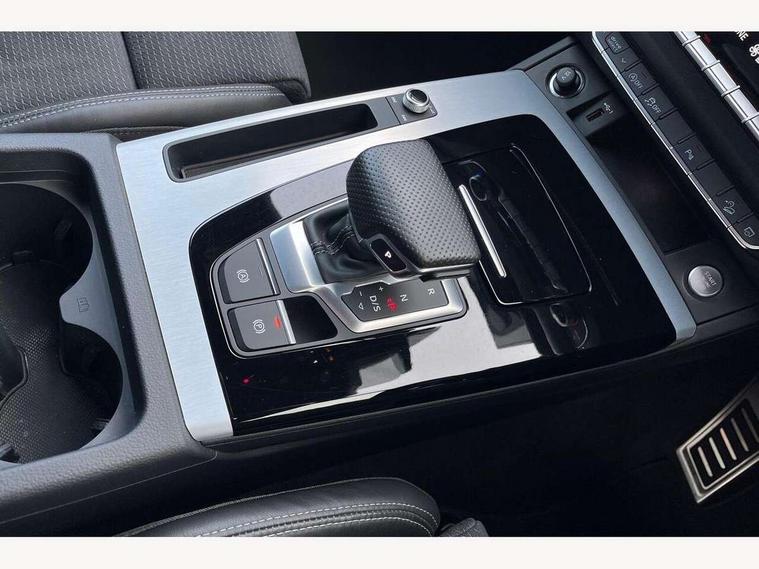 Audi connect safety and service (e-call), Audi connect with Amazon Alexa Integration, Audi drive select, Audi virtual cockpit plus with 12.3" screen and three different layout designs, Audi wireless smartphone interface, Automatic start-stop system with coasting functionality and efficiency programme, Bluetooth interface, Electro - mechanical power assisted steering, MMI navigation plus with 10.1" touch screen, Power tailgate, Reversing camera, Service interval indicator, Voice control system with Audi hotword activation "Hey Audi", Diesel particulate filter, Quattro on demand, S line sports suspension, DAB Digital radio, Acoustic windscreen, Aluminium roof rails, Audi matrix LED headlights with dynamic front and rear indicators, Auto dimming door mirrors, Auto dimming rear view mirror, Automatic headlight adjustment, Automatic headlights and windscreen wipers, Body colour bumpers, Body colour door mirrors, Body colour rear diffuser with matt aluminium silver surrounds, Body colour underbody protection, Chrome plated exhaust trims, Daytime running lights, Door sills in Selenite silver, Electric adjustable/heated/folding door mirrors, Front air inlet surrounds in aluminium, Front and rear electric windows, Front radiator grille in honeycomb design, Headlight washers, High level LED brake light, Lower bumpers painted in contrast Manhattan grey, Rear chrome trim strip below lights, Rear privacy glass and rear side windows, Rear side wing doors, Rear wiper, Roof bars, S Line badges on the front wings, S Line front and rear bumpers, S Line rear spoiler, S Line side skirts, 2 x USB charging port with aux input socket, 3 rear headrests, 40:20:40 split folding 3 rear bench seat in 2nd row with rear centre armrest, Black cloth headlining, Comfort front centre armrest, Contrast stitching on seats, steering wheel and gear lever gaiter, Deluxe 3 zone electronic climate control, Front/rear floor mats, Gear lever in black leather, Heated front seats, Height adjustable front head restraints, Height/reach adjustable steering column, Illuminated door sill trims with S logo, ISOFIX child seat mounting and top tether, Luggage compartment cover, Manual seat adjustment with 4-way electric lumbar support, Removable luggage compartment floor, Single front passenger seat, Stainless steel pedals, Sunvisors with vanity mirrors, High gloss pack - Q5, LED interior light pack - Q5, 3 point seatbelts on all seats, 6 airbags - Driver, front passenger, curtain and side airbags, Electrically operated child locks on rear doors, Electromechanical parking brake, Electronic stabilisation control including ABS, ASR and EDL, Front passenger airbag deactivation, Hill descent control, Hill hold assist, Multi collision brake assist, Pop-up bonnet for pedestrian protection, Pre sense city, Seat belt force limiter, Seatbelt monitoring, Tyre pressure warning, Warning triangle and first aid kit, Anti theft alarm, Anti-theft wheel bolts, Keyless Go access/ignition system, Remote central locking, Matt brushed aluminium inlays,