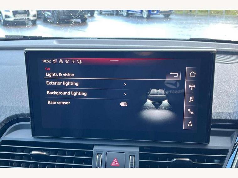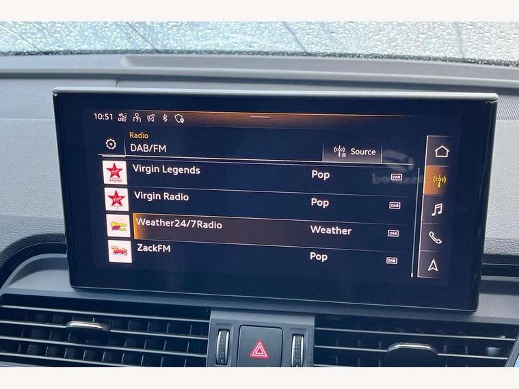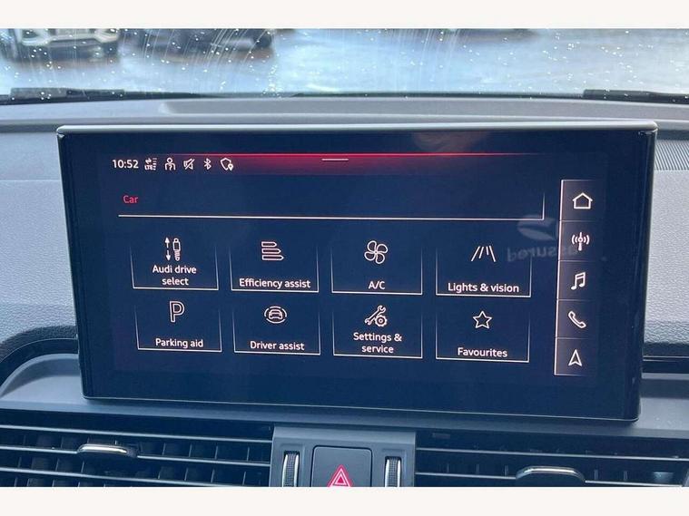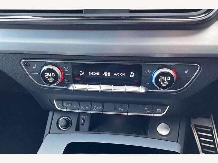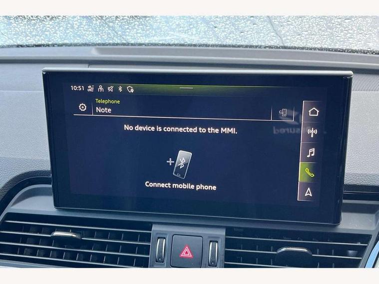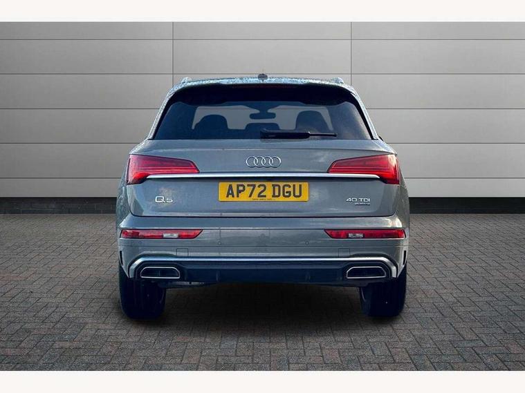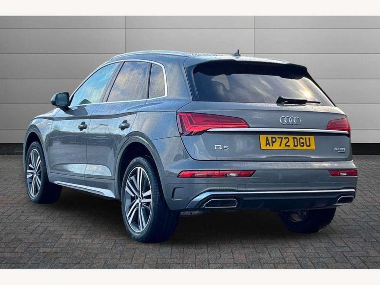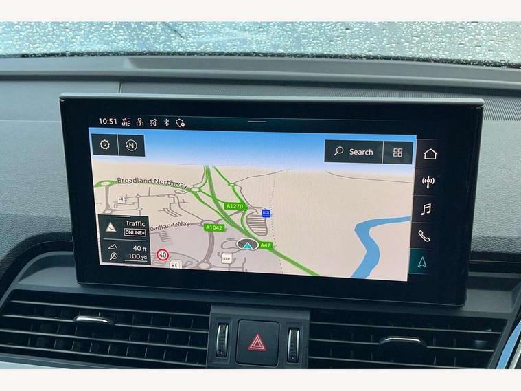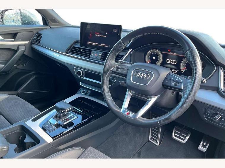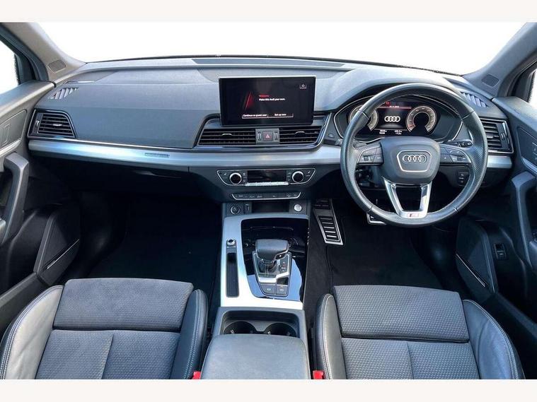 Audi connect safety and service (e-call), Audi connect with Amazon Alexa Integration, Audi drive select, Audi virtual cockpit plus with 12.3" screen and three different layout designs, Audi wireless smartphone interface, Automatic start-stop system with coasting functionality and efficiency programme, Bluetooth interface, Electro - mechanical power assisted steering, MMI navigation plus with 10.1" touch screen, Power tailgate, Reversing camera, Service interval indicator, Voice control system with Audi hotword activation "Hey Audi", Diesel particulate filter, Quattro on demand, S line sports suspension, DAB Digital radio, Acoustic windscreen, Aluminium roof rails, Audi matrix LED headlights with dynamic front and rear indicators, Auto dimming door mirrors, Auto dimming rear view mirror, Automatic headlight adjustment, Automatic headlights and windscreen wipers, Body colour bumpers, Body colour door mirrors, Body colour rear diffuser with matt aluminium silver surrounds, Body colour underbody protection, Chrome plated exhaust trims, Daytime running lights, Door sills in Selenite silver, Electric adjustable/heated/folding door mirrors, Front air inlet surrounds in aluminium, Front and rear electric windows, Front radiator grille in honeycomb design, Headlight washers, High level LED brake light, Lower bumpers painted in contrast Manhattan grey, Rear chrome trim strip below lights, Rear privacy glass and rear side windows, Rear side wing doors, Rear wiper, Roof bars, S Line badges on the front wings, S Line front and rear bumpers, S Line rear spoiler, S Line side skirts, 2 x USB charging port with aux input socket, 3 rear headrests, 40:20:40 split folding 3 rear bench seat in 2nd row with rear centre armrest, Black cloth headlining, Comfort front centre armrest, Contrast stitching on seats, steering wheel and gear lever gaiter, Deluxe 3 zone electronic climate control, Front/rear floor mats, Gear lever in black leather, Heated front seats, Height adjustable front head restraints, Height/reach adjustable steering column, Illuminated door sill trims with S logo, ISOFIX child seat mounting and top tether, Luggage compartment cover, Manual seat adjustment with 4-way electric lumbar support, Removable luggage compartment floor, Single front passenger seat, Stainless steel pedals, Sunvisors with vanity mirrors, High gloss pack - Q5, LED interior light pack - Q5, 3 point seatbelts on all seats, 6 airbags - Driver, front passenger, curtain and side airbags, Electrically operated child locks on rear doors, Electromechanical parking brake, Electronic stabilisation control including ABS, ASR and EDL, Front passenger airbag deactivation, Hill descent control, Hill hold assist, Multi collision brake assist, Pop-up bonnet for pedestrian protection, Pre sense city, Seat belt force limiter, Seatbelt monitoring, Tyre pressure warning, Warning triangle and first aid kit, Anti theft alarm, Anti-theft wheel bolts, Keyless Go access/ignition system, Remote central locking, Matt brushed aluminium inlays,