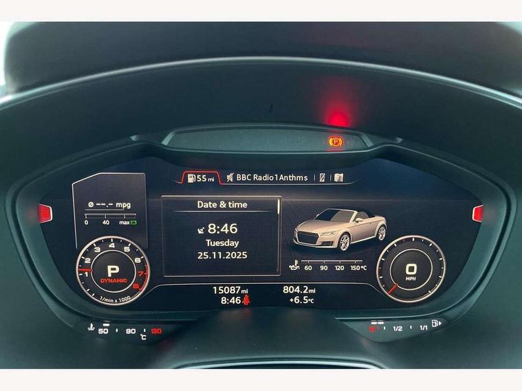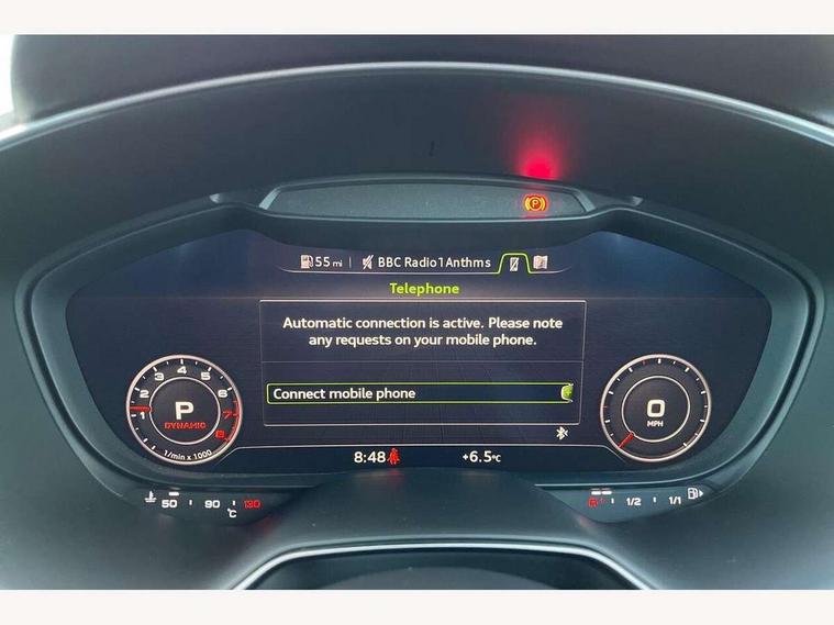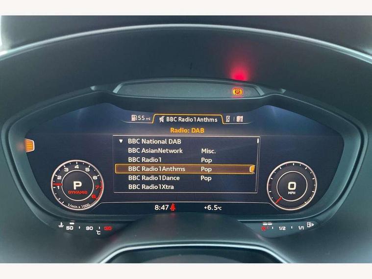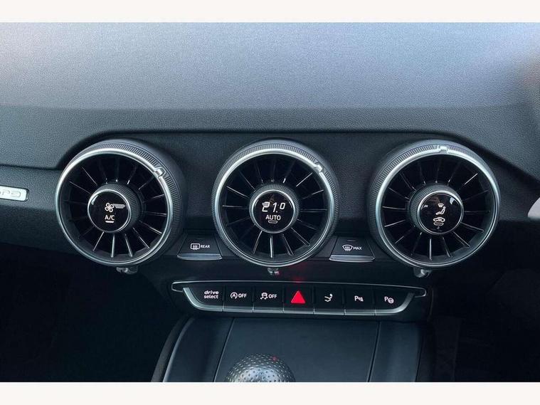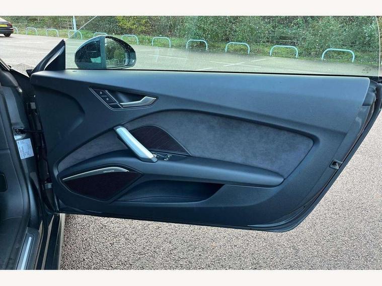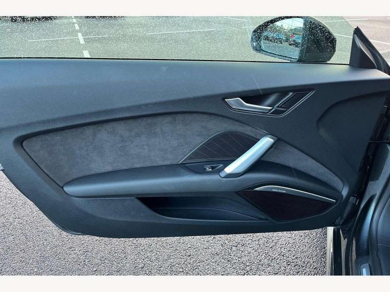 Audi drive select with 4 Pre configured modes, Audi Phone Box with wireless charging - Qi enabled compatible phone and additional bluetooth interface, Audi side assist, Audi smartphone interface, Camera based traffic sign recognition, Cruise control + speed limiter, Emergency call service, Mobile phone preparation with bluetooth interface, Progressive power assisted steering, Seat belt microphone, Service interval indicator, Start/Stop system with energy recuperation, TP memo, Sports suspension, AM/FM radio, Bluetooth audio streaming, DAB Digital radio, MMI Radio with CD player and SD/XC card slot, Audi Beam uses LEDs to project the Audi Sport logo, Auto dimming rear view mirror, Black chrome tailpipe, Electric front windows, Electrically adjustable, foldable and heated auto dimming on driver side and automatic kerb view dipping function on the passenger side, Electrically operated wind deflector, Front fog lights, Fully automatic acoustic hood, Green tinted heat insulating glass, High beam assist, LED 3rd brake light, LED Dynamic rear indicators, Light and rain sensors, Matrix LED light+LED daytime running light, LED Indicator, Headlightclean, auto dynm headlight range+dynamic cornering light, Motorwaybeam/Manoeuvre light, Rear boot, Sunband for windscreen, 12V socket, 3 spoke flat bottomed high multi-function leather sport steering wheel with gearshift paddles, 4 way electric lumbar support for driver and front passenger, Black headlining, Black roll bar, Deluxe auto air conditioning with integrated digital display, Door sill trims, Extended aluminium look with stainless steel pedals, Fine Nappa leather with electrically adjustable 4 way lumbar/Super Sport front seats + "S" embossing, Front centre armrest, Front passenger seat, Front super sports seats, Headroom heating, Heated front seats, Height/reach adjust steering wheel, Integrated head restraints, ISOFIX child seat mounting for front passenger seat with airbag deactivation, Manual adjustment of seat height, fore/aft position, seat angle, seat depth and backrest angle, Perforated leather gearknob in black, Black styling pack - TT, Comfort and sound pack - TT with park assist, LED interior light pack - TT/TT RS roadster, Non smoking pack - TT/TT RS, Technology pack without Audi phone box - TT, 3 point front seat belts, ABS, ASR traction control, Curtain airbags, Driver and front passenger airbag with front passenger airbag deactivation, EDL traction control, Electromechanical parking brake, ESP, First aid kit, Front side airbags, Hill hold assist, Seatbelt warning, Tyre pressure loss indicator, Warning triangle, Anti theft alarm, Anti theft wheel bolts, Immobiliser, Keyless Go, Remote central locking, Matt brushed aluminium inlays, 20" 5 arm cutter style Audi sport in anthracite black diamond cut alloy wheels, Tool kit, Tyre repair kit,