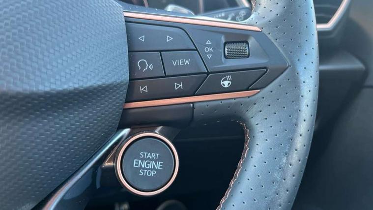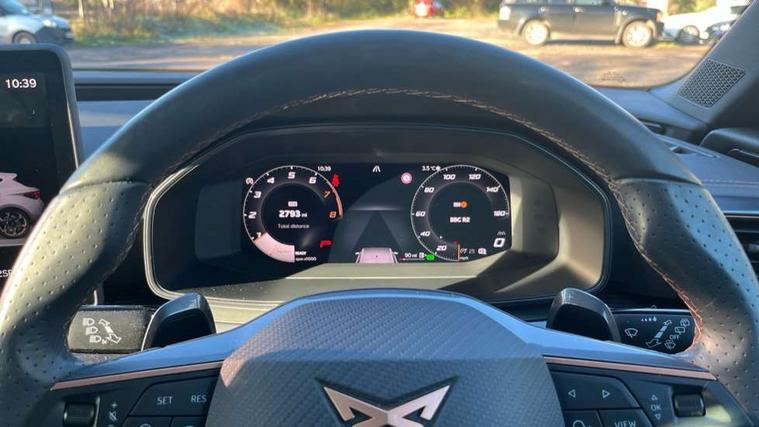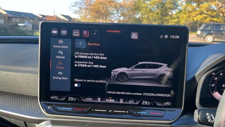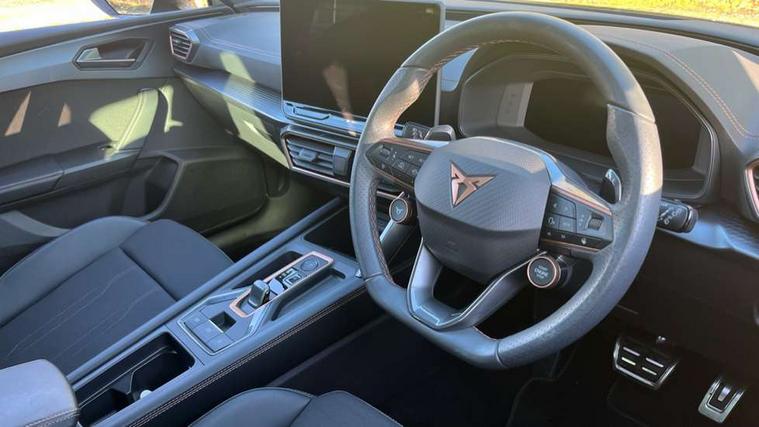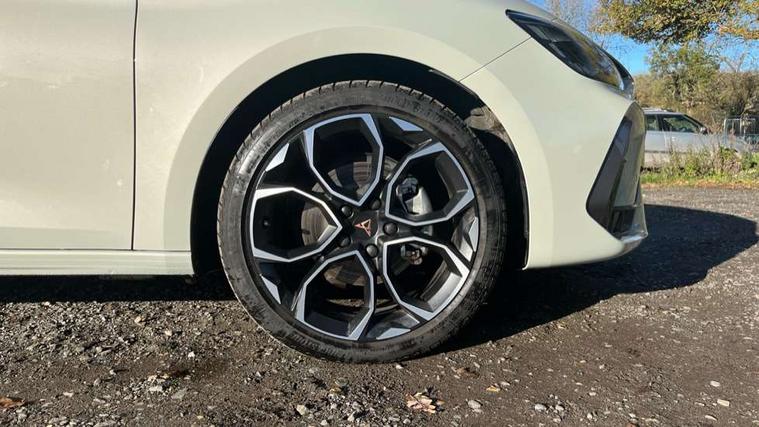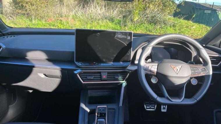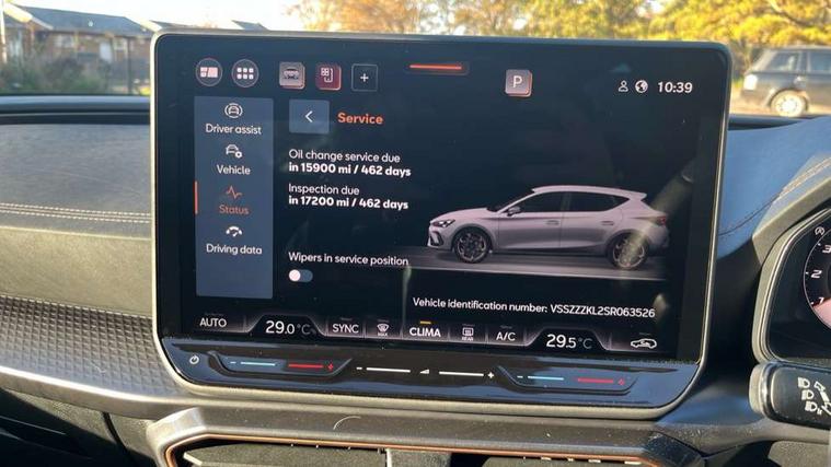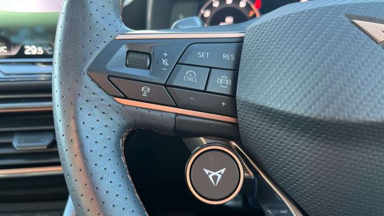 Adaptive cruise control with follow-to-stop and speed limiter, CUPRA drive profile selection with (Comfort/Sport/Individual), throttle response and gearshift mode, Digital cockpit, Dynamic road sign display, E-call, Four x USB Type C ports (2 in front and 2 in rear), Front and rear parking sensors, Front assist with forward collision warning braking reaction to vehicles, pedestrians and cyclists, Full link smartphone integration with Mirror Link, wireless Apple CarPlay and wired Google Android Auto, Lane assist, Lockable tailgate, PAS, RPM, trip computer, outside temp gauge, instrument light brightness, low fuel warning light, lights on reminder, gearshift indicator, Service interval indicator, Start/stop system with regenerative braking, Wireless phone charger, 7 speakers, Auxiliary input socket, Auto dimming rear view mirror, Body colour door handles, Body coloured bumpers, Cupra sports bumpers, Dark tinted rear windows, Electric front/rear windows, Electrically adjustable, heated and folding door mirrors, High beam assist, LED front fog lamps with cornering function, LED headlights with dynamic turn signals, tail lights, rear fog lights with rear coast to coast lighting, LED rear fog lamp, Rain sensing wipers, Rear side wing doors, Rear wash/wipe, Separate daytime running light with automatic headlight control and coming home feature, Third brake light, Welcome light with logo projector in door mirrors, 12v power supply in centre console, 3 seat bench in 2nd row, 5 headrests, 60/40 split rear bench seat with armrest, Ambient lighting with glovebox, footwell and single monocolour, Black headlining, Cloth/PVC upholstery, Cupra sports pedals, CUPRA Supersports, heated steering wheel with satellite buttons, Driver and passenger seat with manual height and lumbar adjustment, Folding boot cover, Front and rear reading lights X 4, Front centre armrest, Height/reach adjust steering wheel, Illuminated interior front door sills, ISOFIX points in outer rear seats with top tether anchorage points, Single front passenger seat, Storage pockets on rear of front seats, Sunvisors with illuminated mirror, Three zone climate control, Media system plus with 12.9" display + navigation pack - Leon Cupra, 3 point seatbelts on all rear seats, ABS, Brake control system - ESC and brake booster, Child proof door locks, Cupra black brake calipers, Driver and front passenger airbags with front passenger airbag de-activation, front side and curtain airbags, Electronic parking brake, Hill hold control, Rear disc brakes, Seat belt reminder for front and rear seats, Tiredness recognition system, Tyre pressure monitoring system, Anti theft alarm system with interior monitoring in cab, backup horn and towing protection, Central locking system Keyless Go, Locking wheel bolts, Chrome and copper interior detailing, 18" Windstorm machined sport black matt and silver alloy wheel with 92Y XL tyres, Tool kit,