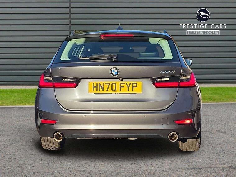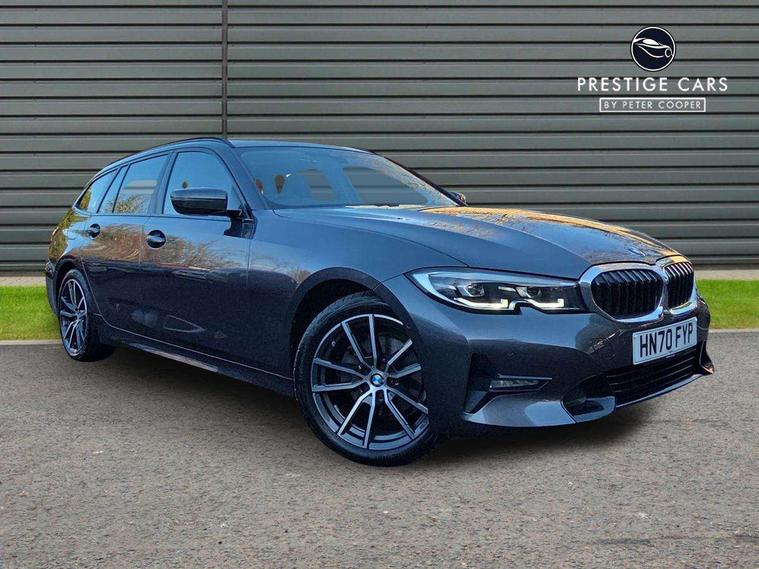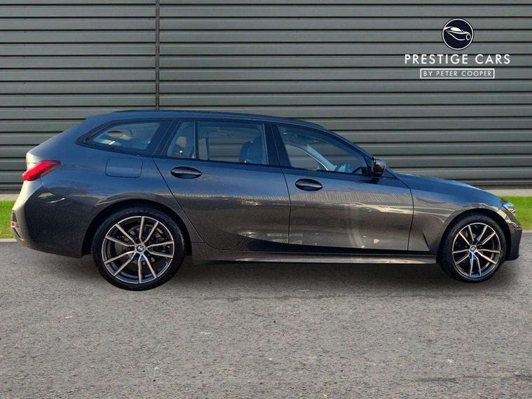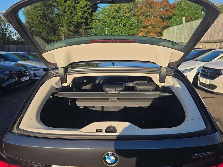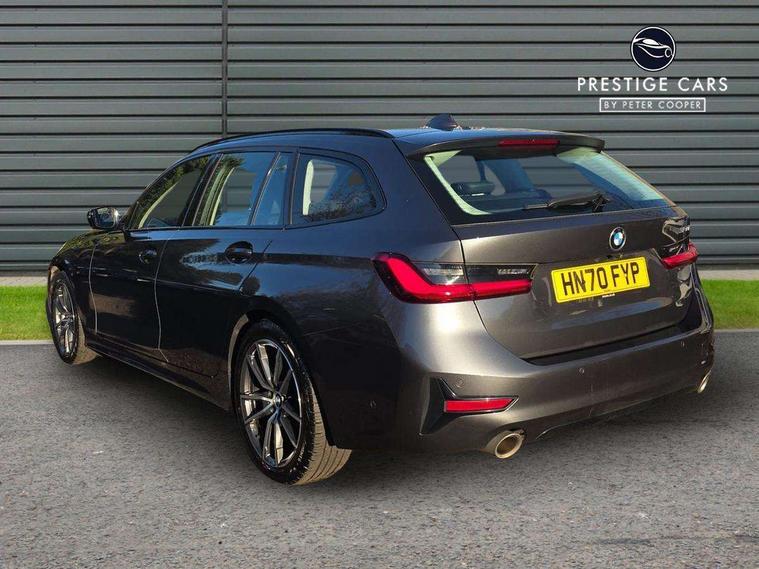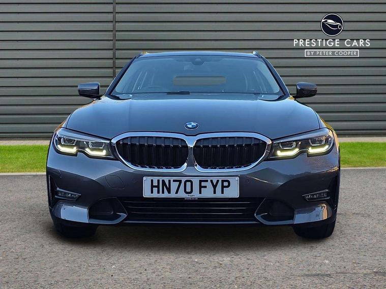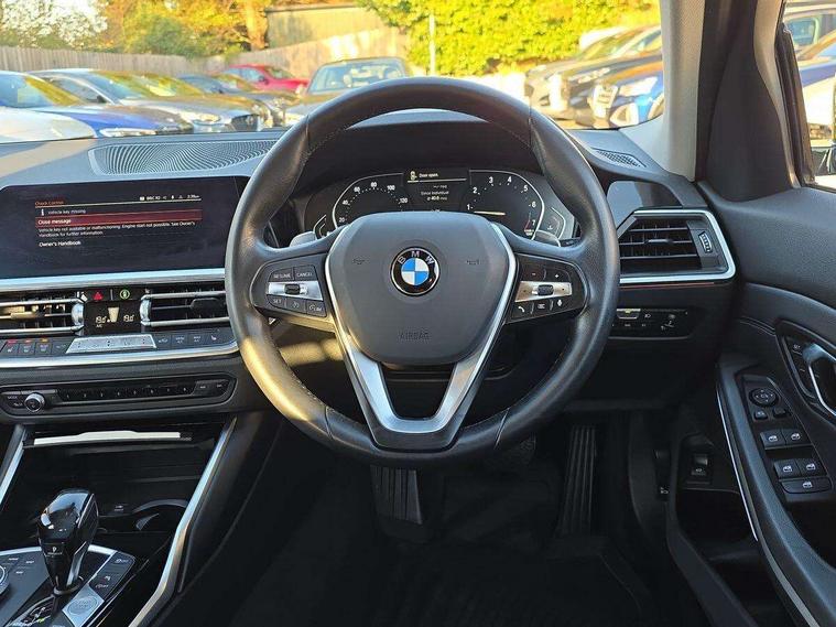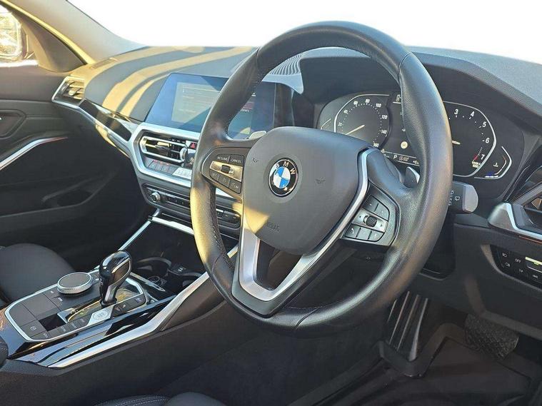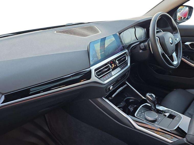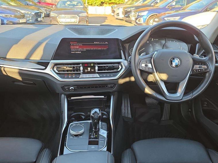 Active guard plus, Attentiveness assist, Auto start-stop, BMW iDrive controller on centre console, BMW Live Cockpit Plus with 8.8" central information display + 5.1" instrument display, Navigation, Intelligent voice control, 4G LTE connect, BMW service history, BMW Teleservices, Brake pad wear indicator in front and rear, Check Control warning system for monitoring of lights and door/luggage compartment open warning, Condition based service, Cruise control with brake function + speed limiter, Electric power steering, Electric power steering with Servotronic steering optimised at all speed ranges, Instrument cluster with speedometer with mph readout, tachometer, fuel gauge and oil temperature gauge, Integrated owners handbook, Oil sensor for level and grade, warning by check control system, On board computer - average speed+fuel consumption, service interval, clock/date, odometer/trip meter, outside temperature display and ice warning, Optimum shift indicator, Personal Profile - automatic lock when driving away selectable, Balanced 50/50 weight distribution, Battery cut-out switch, Drive performance control - ECO PRO, comfort and sport modes, Larger capacity fuel tank, Petrol Particulate Filter, Sport automatic transmission with steering-wheel mounted gearshift paddles and launch control, Stroke dependent dampers, DAB tuner, Electronic service booklet, Acoustic glazing, Active airstream chrome frame kidney grille with 8 high gloss black vertical slats, Automatic headlight beam throw control with load dependent regulating reaction, dynamic compensation of braking dive and acceleration squat, Body colour door handles, Body colour fuel filler flap, Body colour mirror caps, Body colour roof mouldings, Brushed aluminium inserts in the front door sill finishers with BMW designation, Dynamic brake lights, Electric windows - front and rear, with open/close fingertip control, anti-trap facility and comfort closing, Exhaust tailpipe - split left and right, Exterior mirrors - electrically folding with anti-dazzle, Fading support, Green tinted heat protection glazing, High gloss black front bumper with specific design elements, High gloss black rear bumper with specific design elements, Interior rear view electrochromatic mirror with automatic anti dazzle function, LED daytime running lights, LED front fog lights, Lightweight engineering, Matt black exterior B pillar, Model designation on right side of tailgate, Rain sensor with automatic headlight activation, Rear wiper, Shark fin antenna, T-shaped design element right and left in black high gloss, Two part LED tailights in L-shape with components in smoked glass, brake light, LED turn indicator and rear fog light, Visible VIN plate, Welcome lights in interior and door handle area, Windscreen wipers with integrated washing jets, 12V power socket in front storage compartment, 2 front cupholder in centre console with clamping elements and matt black inlay, 3 rear seats with non folding headrests with 3 point seat belts, 3 zone automatic air conditioning, 4 pieces lashing eyelets in luggage compartment, 40:20:40 split folding rear seat with loading system, Ambient lighting with welcome carpet light, Armrest integrated in front and rear door trim + front centre console armrest, Centred top Luggage compartment lights, Four grab handles integrated in roof lining, Front and rear door exit lighting (left / right), Front and rear door pockets, Front and rear reading lights, Front and rear velour floor mats, Front head restraints, Front sport seats, Heated driver and front passenger seats, Height adjustable mechanically and infinitely variable steering column, Illuminated armrest storage compartment, Illuminated glove compartment with separate small compartment, Interior lighting - front centre over interior mirror with soft light, rear centre and front and rear footwell lighting, Make-up mirror lights, Rear centre armrest with 2 cupholders, Rear centre console with storage compartment and ventilation grille, Sunvisors with vanity mirrors and ticket pocket, Three spoke multifunction sport leather steering wheel, Toolkit located in luggage compartment, Vernasca leather upholstery, Connected pack professional - 3 Series Saloon/Touring, 2 tone horn, BMW emergency call, Brake energy regeneration, Braking pre-tensioning, Child proof locking system in rear door, Child seat ISOFIX attachment rear outer seats, Coasting in idle in ECO PRO mode, Crash sensor activating of airbags, Unlocking doors, hazard warning lights, interior light, safety battery terminal, Driver and front passenger side airbags, integrated in the door side seat backrest bolsters for all seat variants, Driver/Front Passenger airbags, Dry braking, Dynamic brake control, Dynamic stability control + (DSC+) - Anti-lock Braking System (ABS) with brake assist and cornering brake control + Automatic Stability Control (ASC), Dynamic Traction Control - DTC, Electric parking brake including automatic hold function and automatic release of the parking brake when driving off, Electronic differential lock control (EDLC), Front passenger manual airbag deactivation, Head airbags for all 4 outer seats, Hill start assist, Seat belt security check for driver and front passenger, Side impact protection, Three 3 point seat belts on all seats including front belt stopper, pyrotechnic belt tensioners and belt force limiters, Tyre pressure monitoring with three level warning strategy, Ventilated front and rear disc brakes, Warning triangle and first aid kit, Alarm system (Thatcham 1) with remote control and electronic engine immobiliser, Central locking switch for all doors, fuel filler cap and luggage compartment, Remote control with integrated key one button open/close vehicle and windows, sole opening of the luggage compartment lid and panic mode, Start/stop button with Comfort Go keyless engine start and auto Start/stop deactivation button, Reduced rolling resistance tyres,