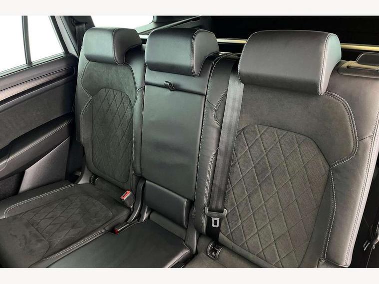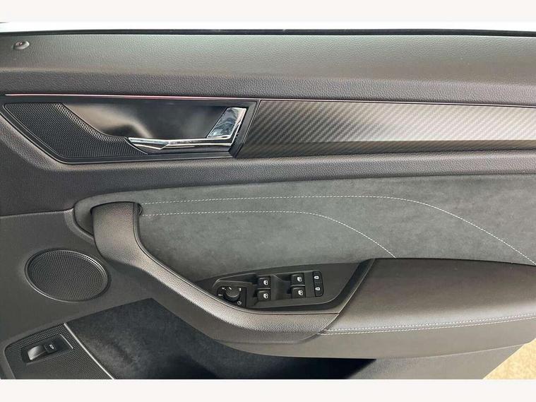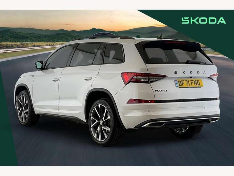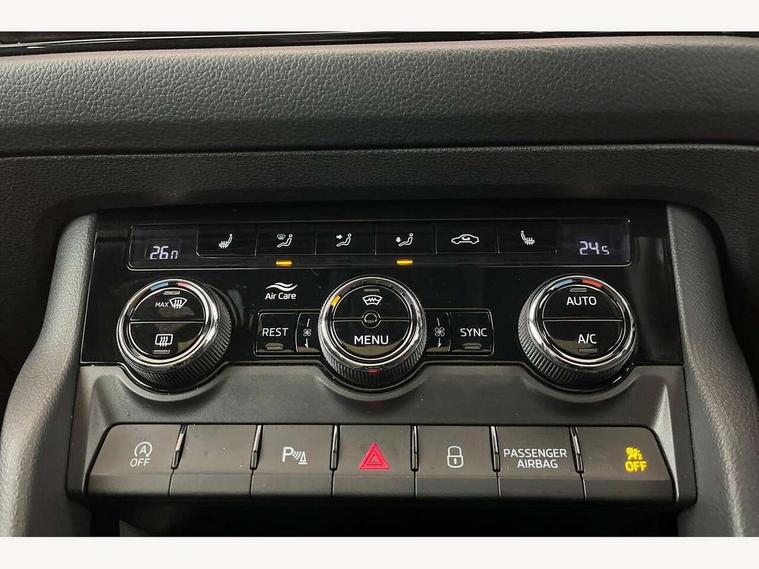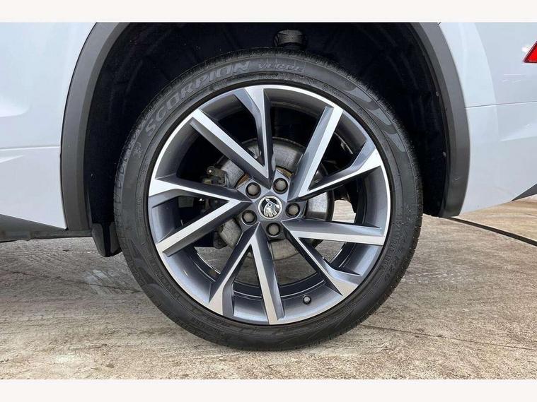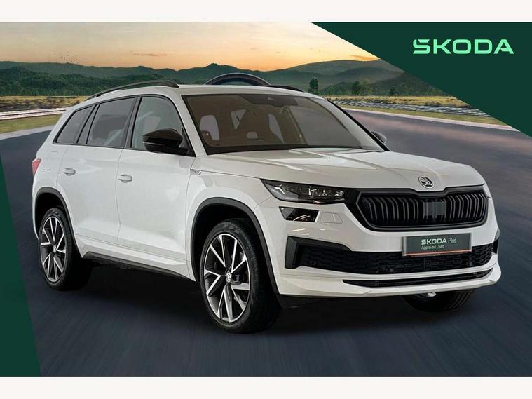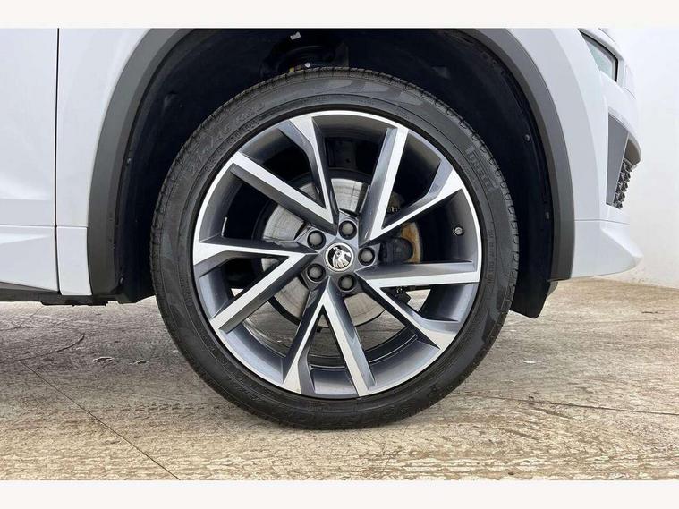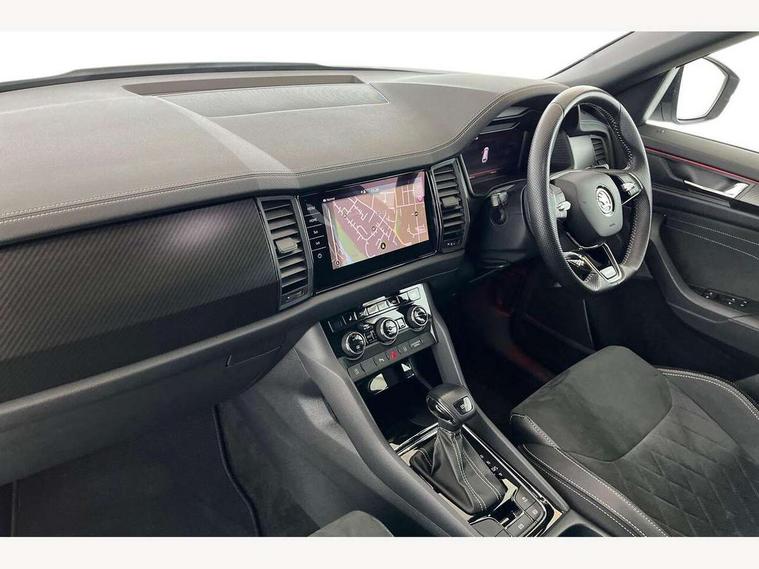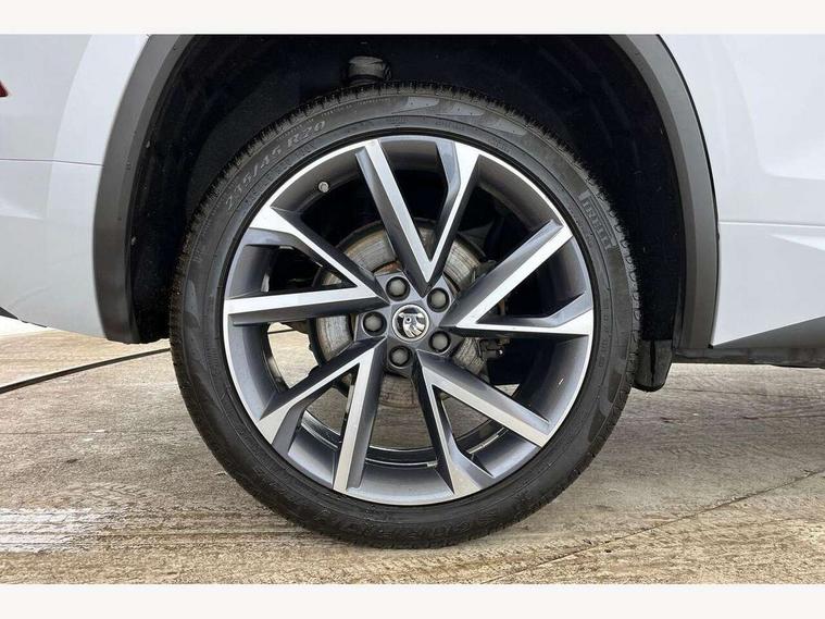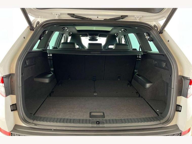 Bluetooth system, Columbus satellite navigation with 9.2" touchscreen, integrated Wi-Fi, web radio, E-call, ECO Stop/start function, Exterior temperature indicator, Progressive steering, Rear view camera, Smartlink wireless for apple carplay and wired for android auto, Speed limiter, USB C Port x 2 in front centre console, Wireless charging, 8 speakers, DAB Digital radio, Aero front windscreen wipers with intermittent function, Aero rear window wiper, Auto dimming rear view mirror, Black roof rails, Black sports styling including front grille and window surrounds, Black wheel arch surrounds, Body colour bumpers, Body colour door handles, Electric adjustable/heated/folding door mirrors, driver side auto dimming with boarding sports and memory function, Electric front and rear windows, Extended rear spoiler with finlets in gloss black, Front fog lights, Full LED matrix headlights with AFS (adaptive front light system), cornering function and AWL (all weather lighting system), Gloss black door mirrors, Headlight washers, Heated rear window, Invisible tailpipe, LED daytime running lights, LED rear fog light, LED third brake light in rear spoiler, Light assistant (coming/leaving home/tunnel light), Off-road style lower front bumper element, Privacy glass, Rain and light sensors, Rear diffuser, Rear LED lights (high functionality) with welcome effect and dynamic indicators, Rear side wing doors, Safety reflectors on front and rear doors, Sportline badge on front fender, Sports front and rear bumpers including lower rear chrome strip, Tailgate lettering in Black, Window control switches with black trim, 12V socket in boot, 2 rails with 2 hooks, 2 seat bench in 3rd row, 3 seat bench in 2nd row, 4 foldable roof handles with rear coat hooks, 60:40 foldable rear seat with sliding adjustment and backrest angle adjustment, Aluminium pedals, Black roof headlining, Bottle holders in door panel in the 1.5 litre front and 1 litre rear, Cargo storage compartments, Chrome headlight control button, Chrome interior door handles, Coat hooks on B pillar, Covered storage compartment on driver side, Decorative door sills in the front and rear, Front centre armrest with storage compartment, cup holder and 12V socket, Front courtesy lights, Gear shift lever with chrome frame and black gloss insert, Grey stitching in front and rear armrests and door armrests + door inserts, Height adjustable front headrests, Illuminated and cooled glovebox, Illuminated luggage compartment, Isofix child seat fittings in outer rear seats with top tether, Manually adjustable steering column, Microsuede door panels, Net programme in boot (1x horizontal Net, 2x vertical Nets), Overhead glasses storage compartment, Pollen filter, Rear centre armrest with cupholders, Single front passenger seat, Sliding trunk cover, Small Bags on the inner sides of the front backrests, Sports seats, Sunvisors with illuminated vanity mirrors, Three rear height adjustable headrests, Ticket holder on A Pillar, Umbrella in door panel, Variable boot floor, LED Interior light pack - Kodiaq, Auto door release and activation of warning lights, Child locks on rear doors, Driver and front passenger airbag with knee airbag and front passenger airbag deactivation, Electronic parking brake with hill start assist, Emergency rear braking signal, ESC (incl. ABS+MSR+ASR+EDS+HBA+DSR+RBS+MKB), Front assist with autonomous emergency braking, Front side airbags with curtain airbags, Fuel cut off safety device, Height adjustable front 3 point seatbelts + pretensioners, Hill hold control, Rear disc brakes, Safety vest holder in door, Seat belt reminder for all seats, Tailgate unlocking from outside, Three point rear seat belts, Two tone horn, Tyre pressure monitor, Alarm with interior monitoring and tilt sensor with safe function, Anti-theft wheel bolts, Immobiliser, Keyless entry and start system (KESSY), Remote central locking with 2 keys, Black air vent surround, Carbon finish dashboard and door inserts, Grey stitching in dashboard, 20" Vega Anthracite alloy wheels, Temporary spare wheel (space saver),