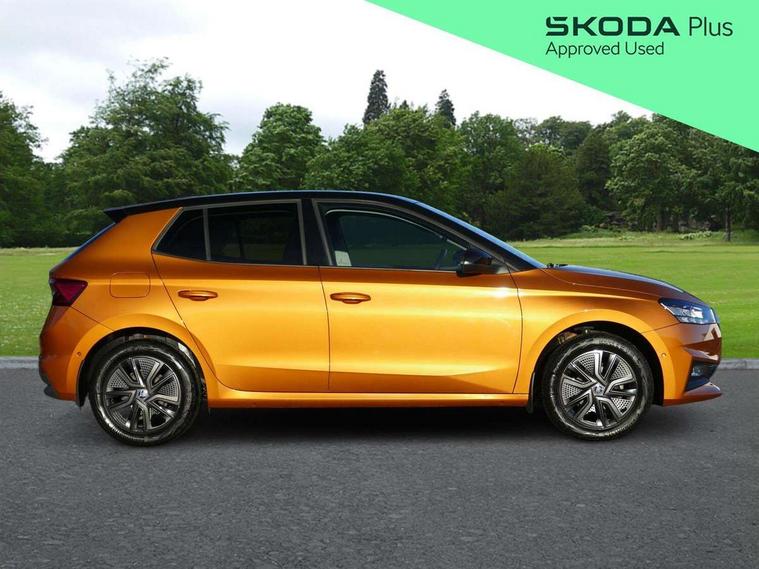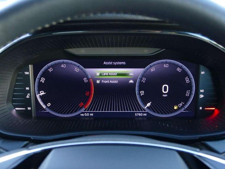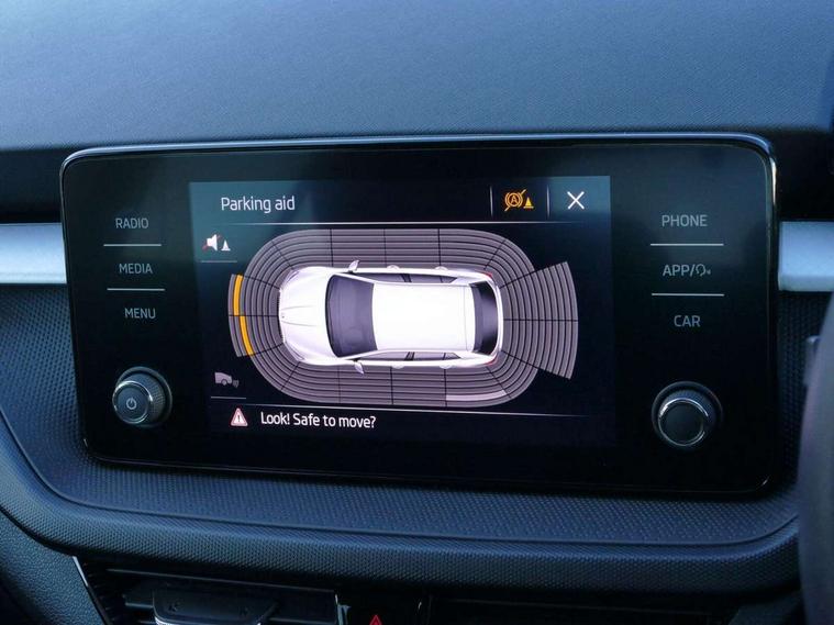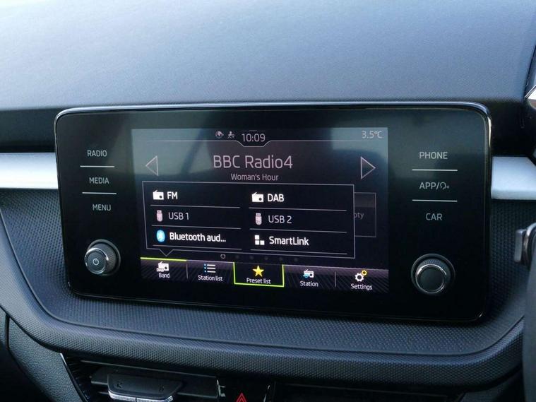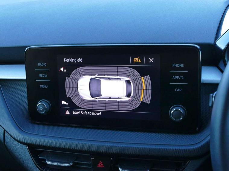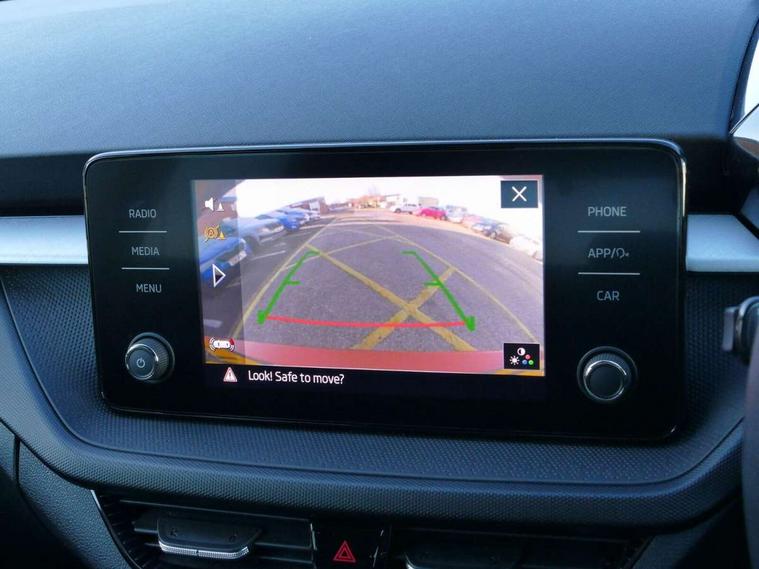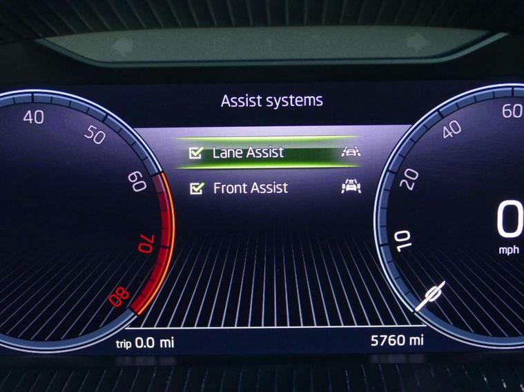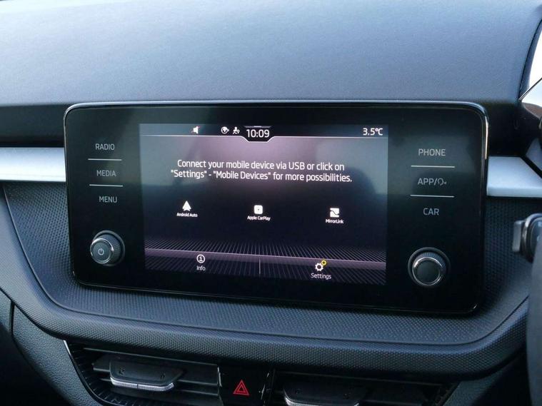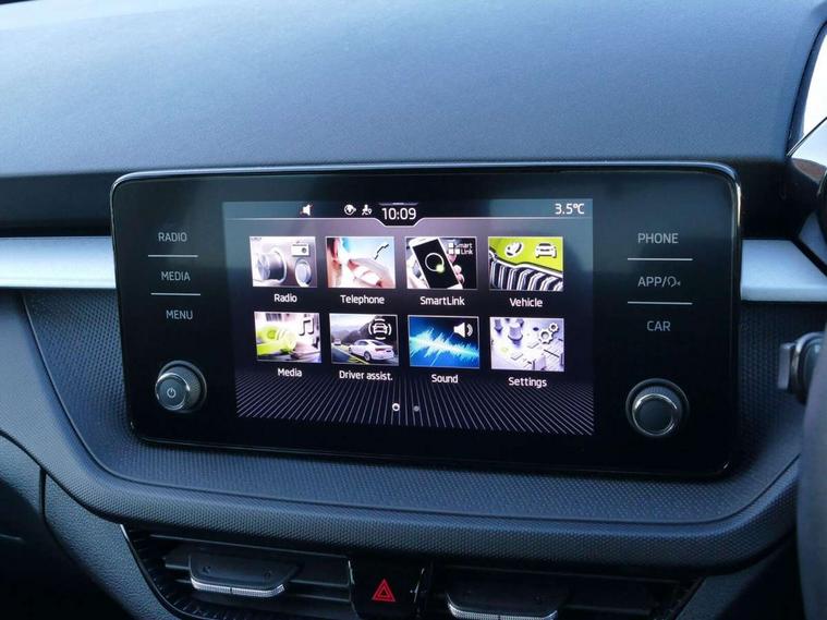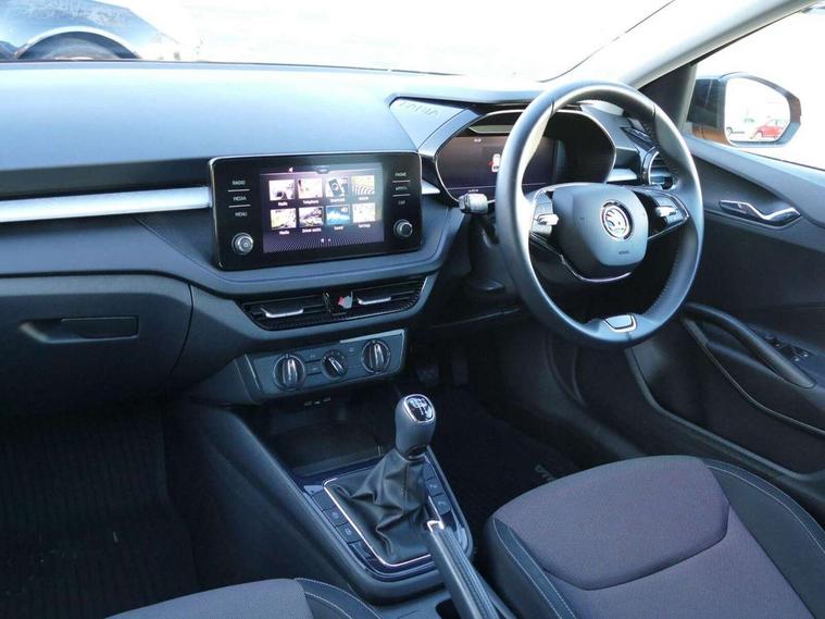 Anodized cross line upper decorative trim, Colour Edition air vents, Grain satin black central console cover, Grain satin black lower decorative trim, Satin black door and side trim panel in front, Anti-theft wheel bolts protection, Super-low rolling resistance tyres, Anti-theft alarm system including immobiliser, interior monitoring, backup horn, and towing protection, 2x USB-C in the front (for data transmission and charging), 6 Speakers (4 in front and 2 in rear), Auxiliary socket for external MP3 player, Bolero radio with 8" colour display, DAB digital radio reception, 3-point height adjustable front seats belts with pretensioner and force limiter, Automatic warning lights in case of crash, Driver and passengers airbag with switch off function, e-Call+, ESC including ABS, MSR, ASR, EDS, HBA and XDS, Front and rear seat belt warning, FRONT ASSIST (AEB City and AEB Inter Urban), Front side airbags, Head airbags, One tone horn, Pedestrian protection, Three rear 3-points safety seat belts with pretensioner and force limiter including stop function for outer rear seat belts, Tyre pressure monitoring system, Basic rear light, Body coloured bumpers, Dimming rear view mirror with black frame, Door mirror integrated indicators, Electrically adjustable and heated door mirrors, Electrically adjustable front windows with function auto up/down, Front window wiper intermittent control, Headlight range control - Automatic, Ice scraper in fuel cap, LED daytime running lights with coming and leaving home feature, Mechanical adjustable rear windows, Privacy glass, Rear LED fog light, Rear side wing doors, Rear window wiper with washing nozzles, Roof mounted spoiler, SKODA tailgate lettering in chrome, Third brake light, 3 rear headrests, Backrest split and folding, Central console with fixed cup holder and storage box, Chrome handbrake release button, Fabric upholstery, Gearshift knob/handle in leather, Grain satin black interior door handles, Hand brake lever handle in leather, Height adjustable front headrests, Height adjustable steering wheel, ISOFIX and TopTether anchorage points to the outer rear seats, ISOFIX and TopTether on the front passenger seat, Luggage compartment lighting, Pollen filter, Rear seat bench unsplit, Single front passenger seat, Storm grey headlining, Sun visors with mirror and airbag label on passenger side, Ticket holder, Umbrella in drivers door, Bluetooth connection, Driver alert system - DAS, Electromechanical power steering, Exterior temperature gauge, Lane assist including road edge detection, Service interval indicator, Virtual cockpit with 10.25" colour display,